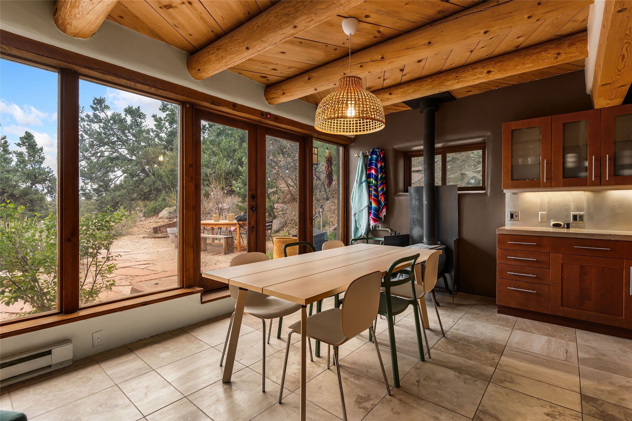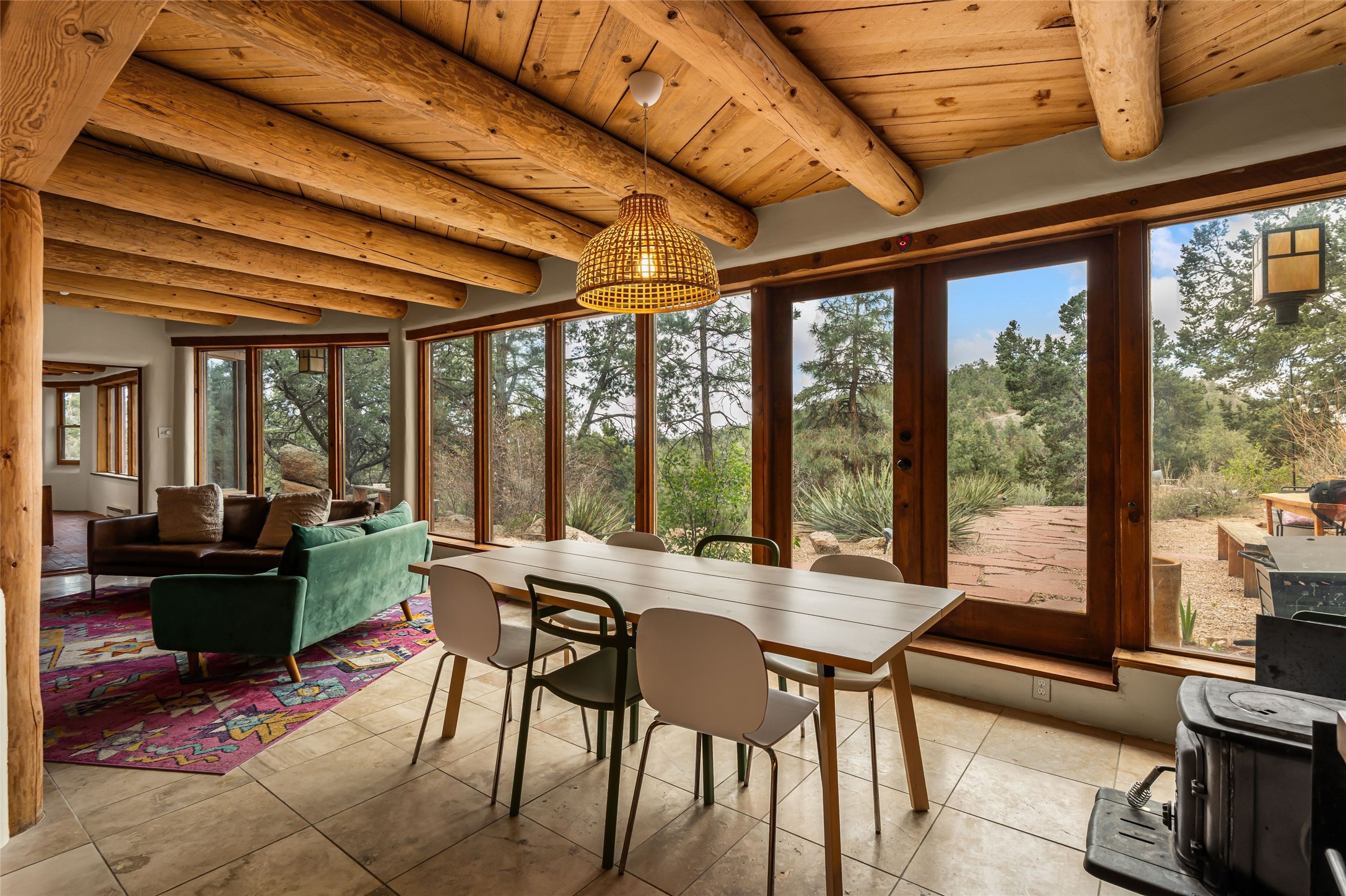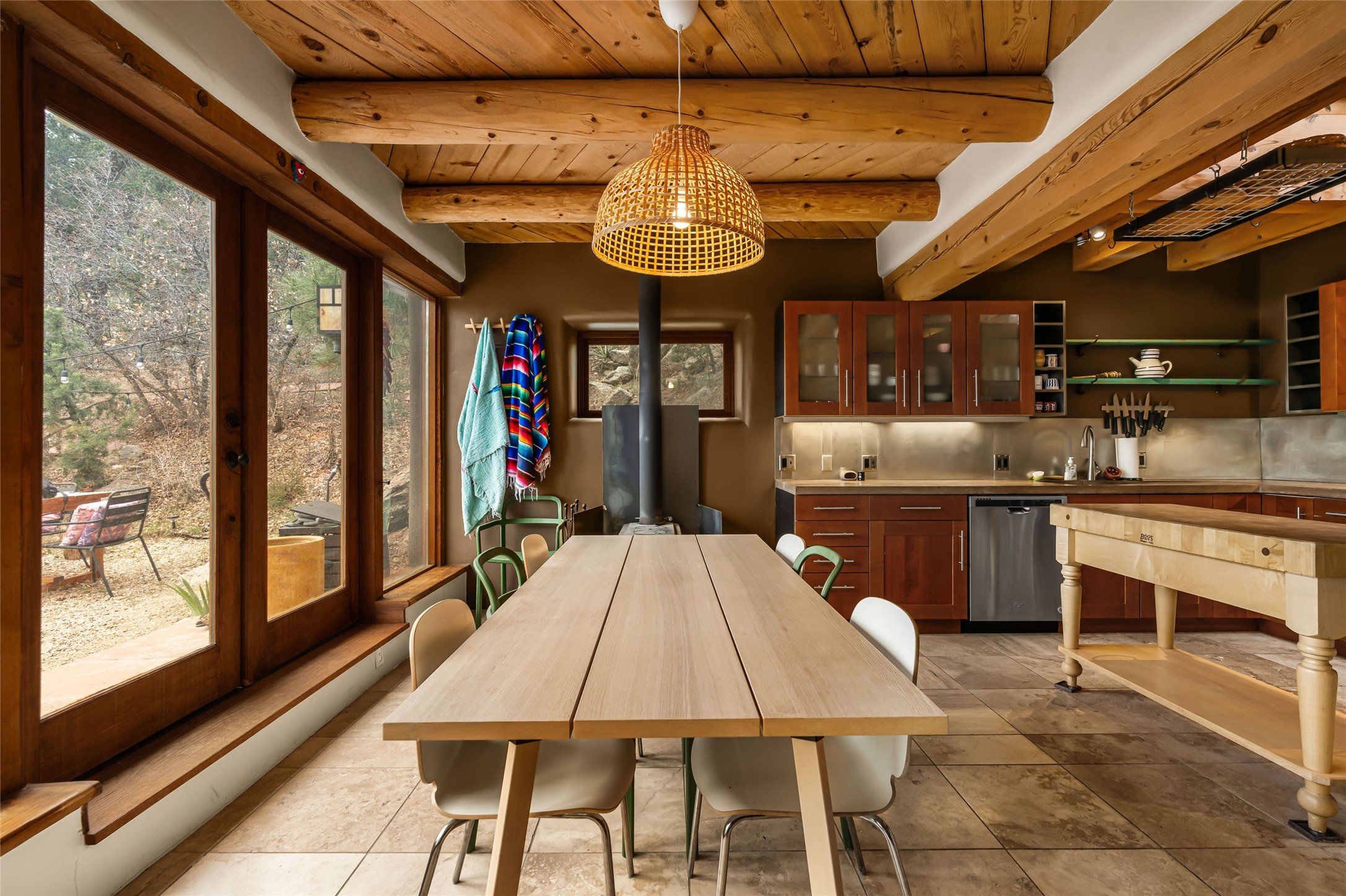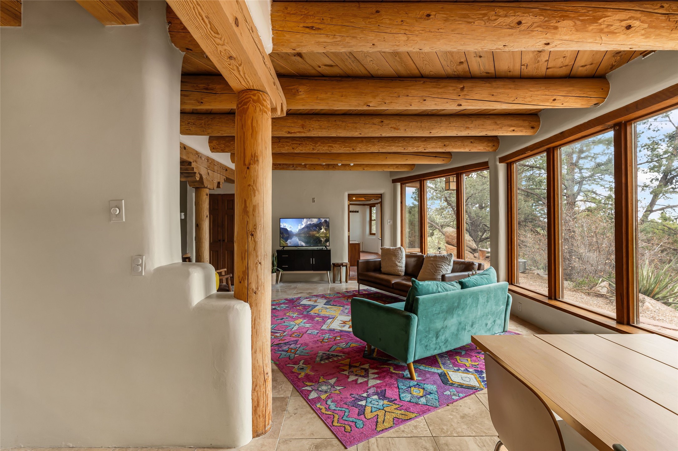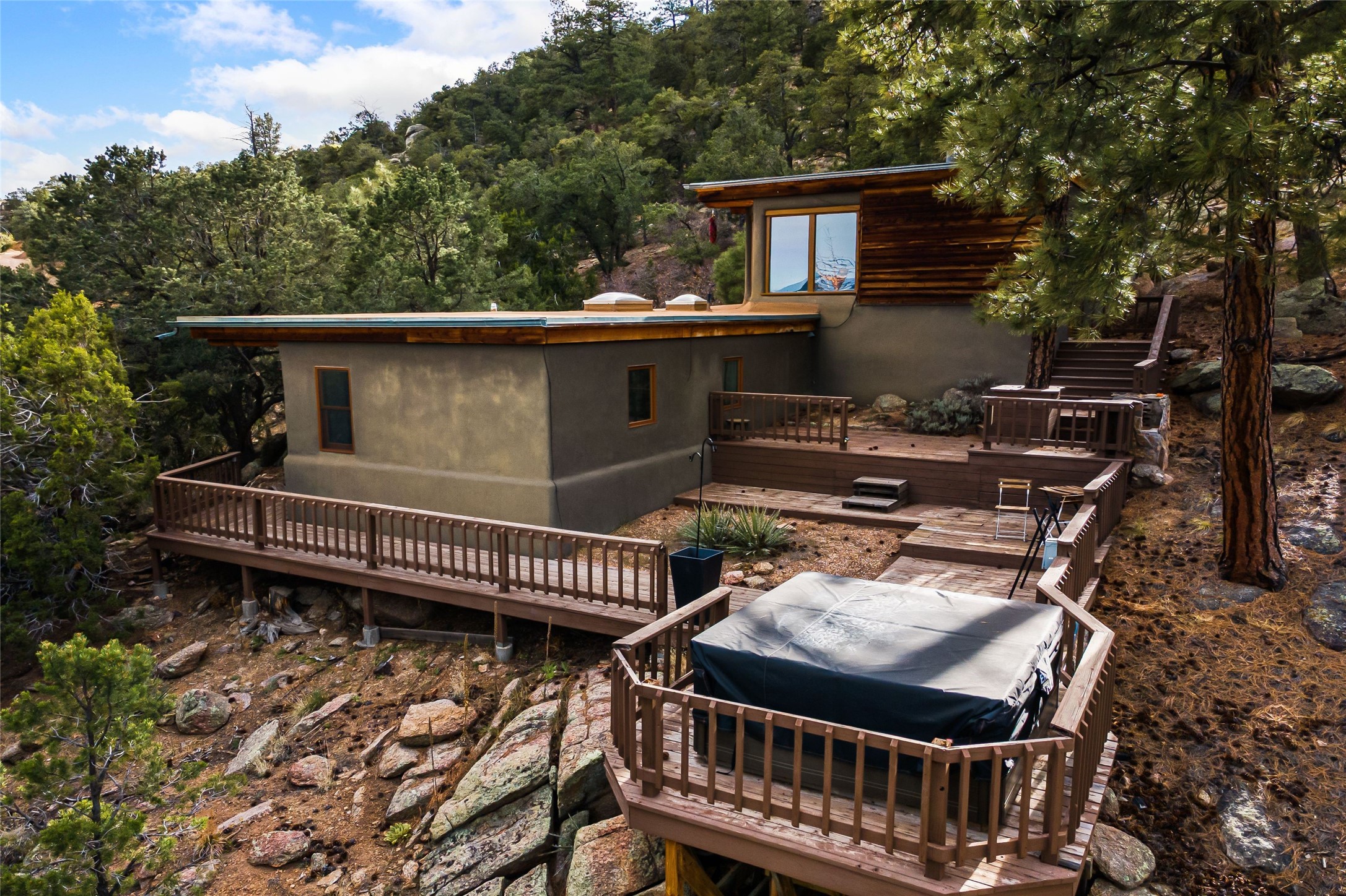 Tucked into the quiet beauty of the Santa Fe woods, this inviting property blends privacy, nature, and classic Southwest character—all within an easy 15 minute drive to the Plaza. The passive solar design fills the home with natural light, highlighting timeless regional touches including vigas, tile and wood floors, and a traditional kiva fireplace. The main house features an updated kitchen and 3 bedrooms plus a den—a flexible space that could easily serve as a fourth bedroom. One wall is a striking natural living stone feature, adding texture and a sense of place you won’t find anywhere else. Large windows frame views of the surrounding hills and forest, creating a peaceful backdrop throughout the home. Step outside to a fabulous elevated deck, where a hot tub sits beneath the stars—an unforgettable spot for quiet evenings or relaxed gatherings. The gated community offers direct access to hiking trails, making it easy to enjoy the landscape right from your doorstep. The detached guest house is a gem of its own, with two levels, a separate bedroom, and a private patio—perfect for visitors, extended stays, or creative studio space. This is a rare opportunity to enjoy the tranquility of the woods with the convenience of Santa Fe living, wrapped in authentic Southwestern charm.