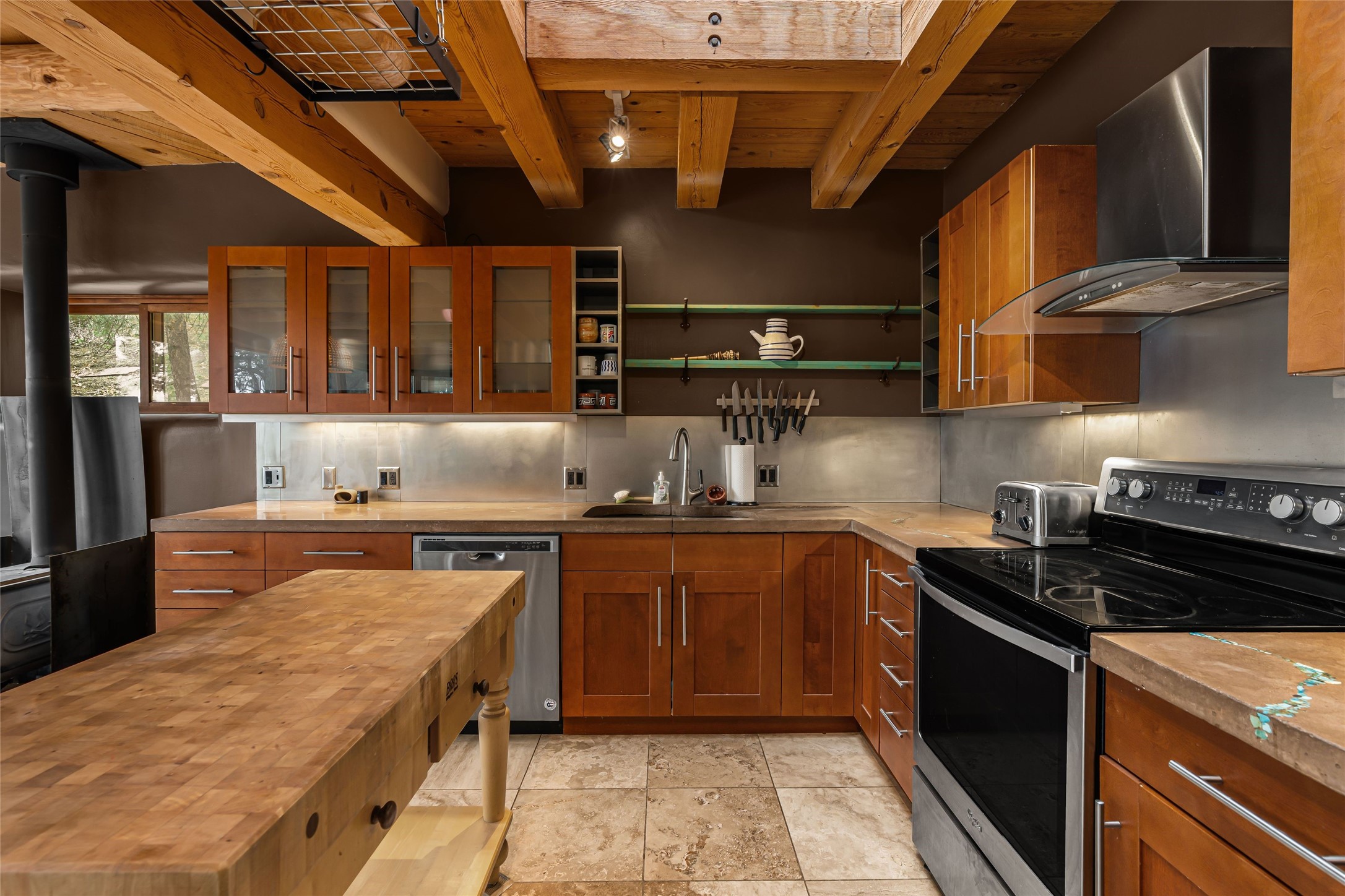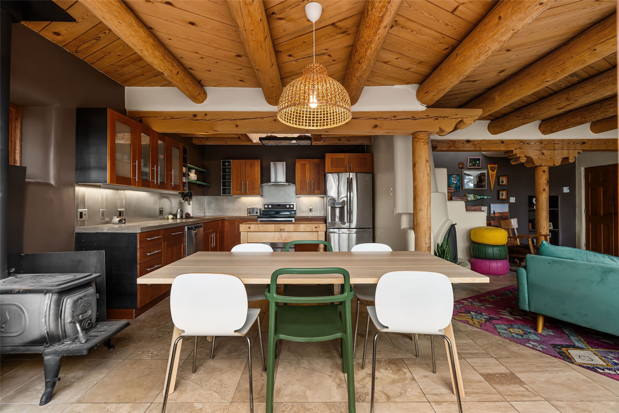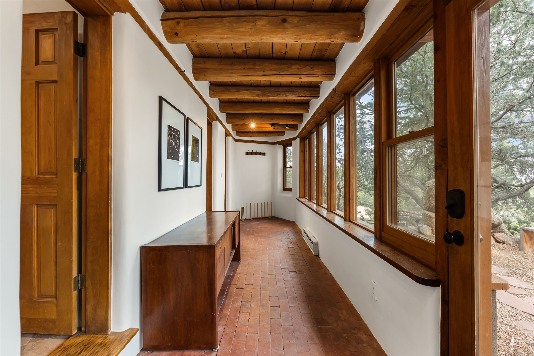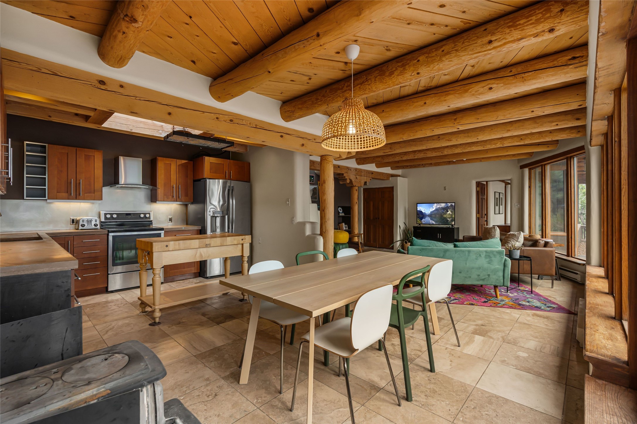 Tucked into the quiet beauty of the Santa Fe woods, this inviting property blends privacy, nature, and classic Southwest character—all within an easy 15 minute drive to the Plaza. The passive solar design fills the home with natural light, highlighting timeless regional touches including vigas, tile and wood floors, and a traditional kiva fireplace. The main house features an updated kitchen and 3 bedrooms plus a den—a flexible space that could easily serve as a fourth bedroom. One wall is a striking natural living stone feature, adding texture and a sense of place you won’t find anywhere else. Large windows frame views of the surrounding hills and forest, creating a peaceful backdrop throughout the home. Step outside to a fabulous elevated deck, where a hot tub sits beneath the stars—an unforgettable spot for quiet evenings or relaxed gatherings. The gated community offers direct access to hiking trails, making it easy to enjoy the landscape right from your doorstep. The detached guest house is a gem of its own, with two levels, a separate bedroom, and a private patio—perfect for visitors, extended stays, or creative studio space. This is a rare opportunity to enjoy the tranquility of the woods with the convenience of Santa Fe living, wrapped in authentic Southwestern charm.