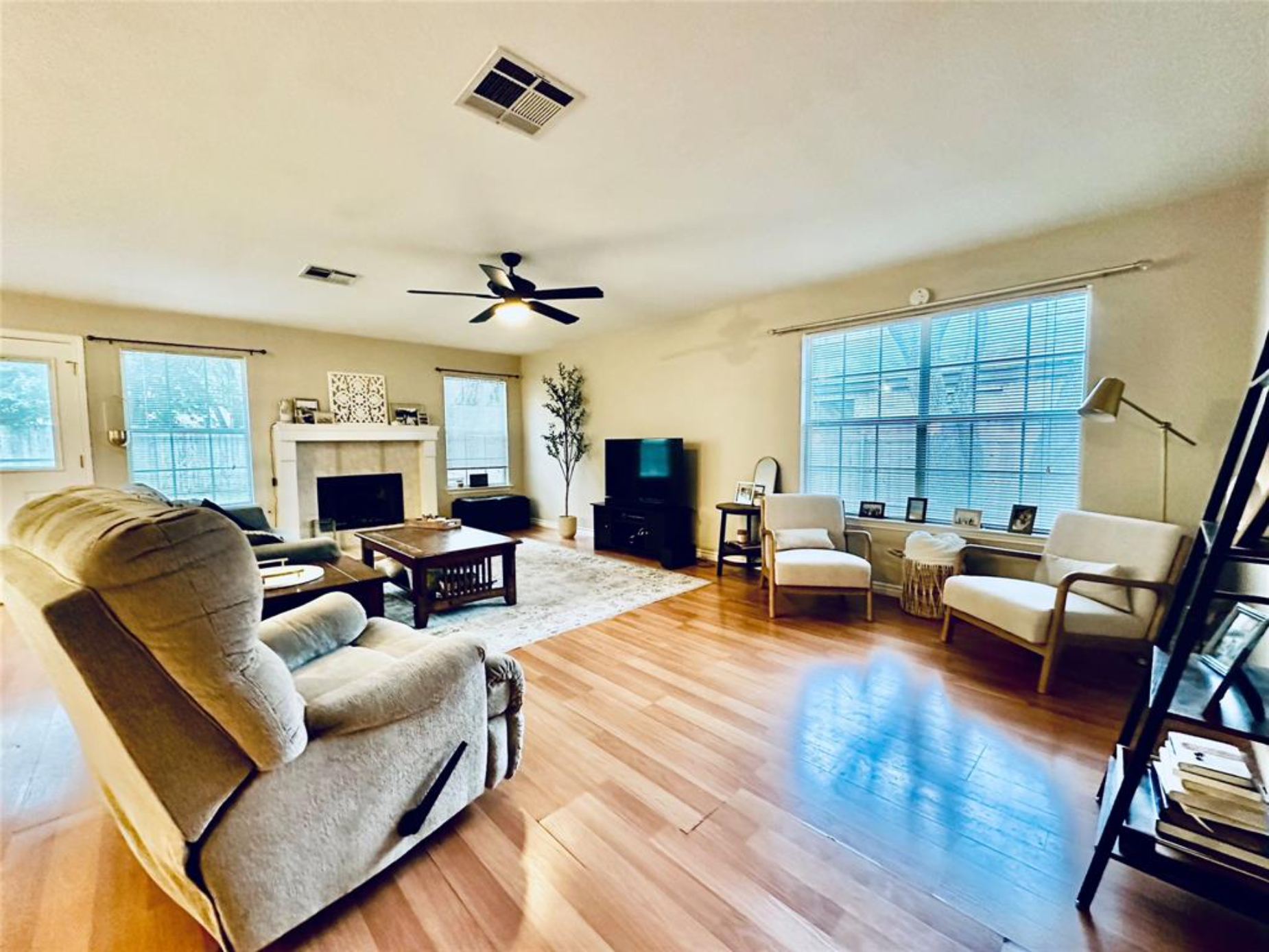 Beautiful, spacious, and well-maintained 3-bedroom, 2-bathroom home. One story with an open floor plan and no carpet anywhere. The large living room comes with a fireplace, and it has enough space for a small office/desk. The kitchen opens up to the living room and breakfast area and has stainless steel appliances. The backyard is fully fenced and private with large mature trees. Refrigerator, washer, and dryer included. Must See!