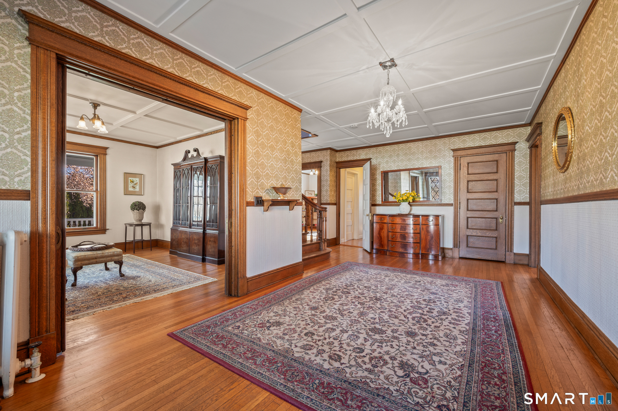Once in a lifetime opportunity to own one of Glastonbury's most iconic residences. This magnificent Colonial Revival, commissioned in 1908 as a custom home for Louis Howe, is beautifully sited on over 3.8 PICTURESQUE, LEVEL ACRES as part of an ESTATE that includes the MAIN HOUSE, FULLY EQUIPPED GUEST HOUSE AND A 2-STORY BARN/WORKSHOP. With its sweeping front porch and elegant symmetry of design, it occupies a grand and gracious presence on Main Street, just a short sidewalk stroll to the village of South Glastonbury. The entire interior of this 3548+ sq ft, 5- bedroom masterpiece showcases the artistry and craftsmanship of a bygone era, thoughtfully preserved by its most recent owner of 51 years. Coffered ceilings set the tone throughout, while the living room, dining room, and den unfold through a series of striking pocket doors, each framed in substantial 10-inch casings of quarter-sawn oak and chestnut. In the living room, a Revival-style fireplace commands attention with its sculpted mantel, dentil molding, and tiled surround of richly colored granite. The dining room is unforgettable -- sunlight pours in through bay windows, illuminating beautifully integrated cabinetry and moulding. Rare for a home of its vintage, functionality was clearly a priority, as seen in the kitchen's walk-in pantry, built-ins in the den and first-floor office, and an exceptional number of closets on the main and second floors. Up the main staircase is a landing of significant proportion