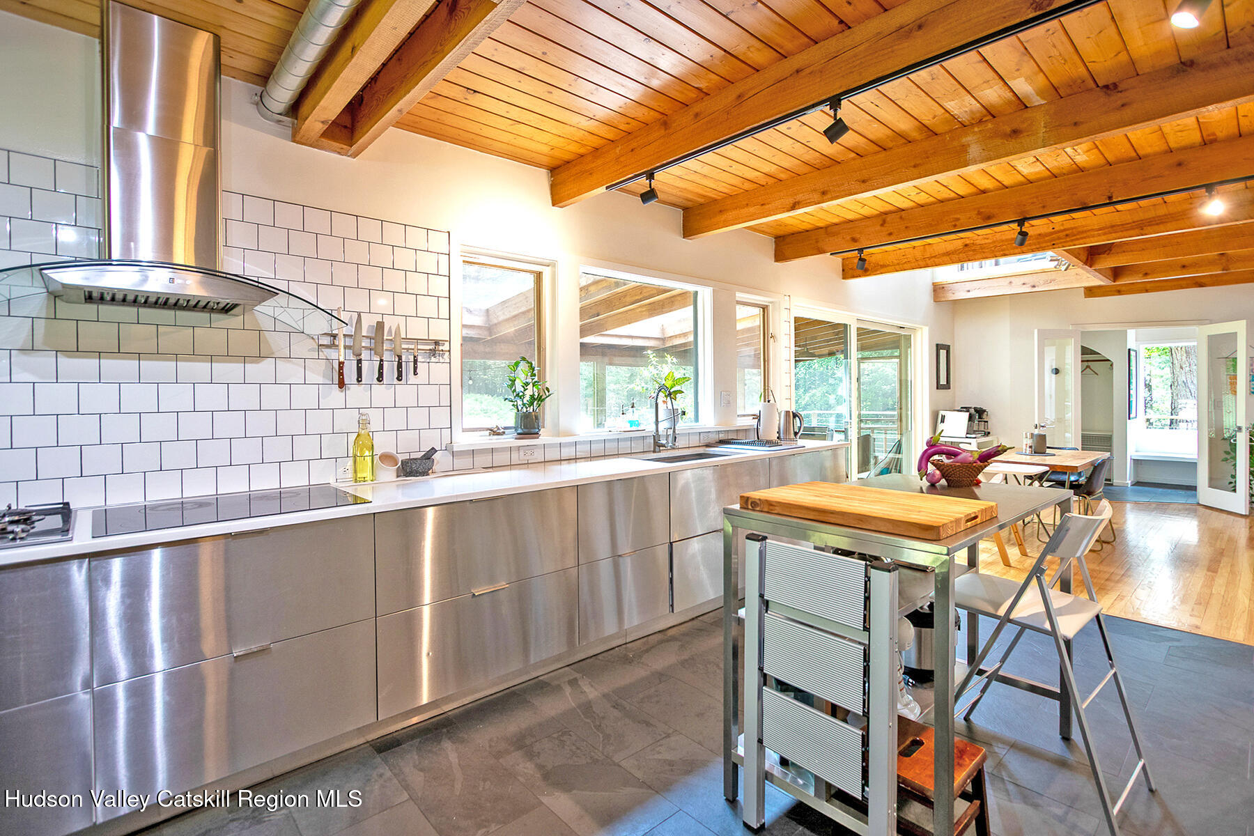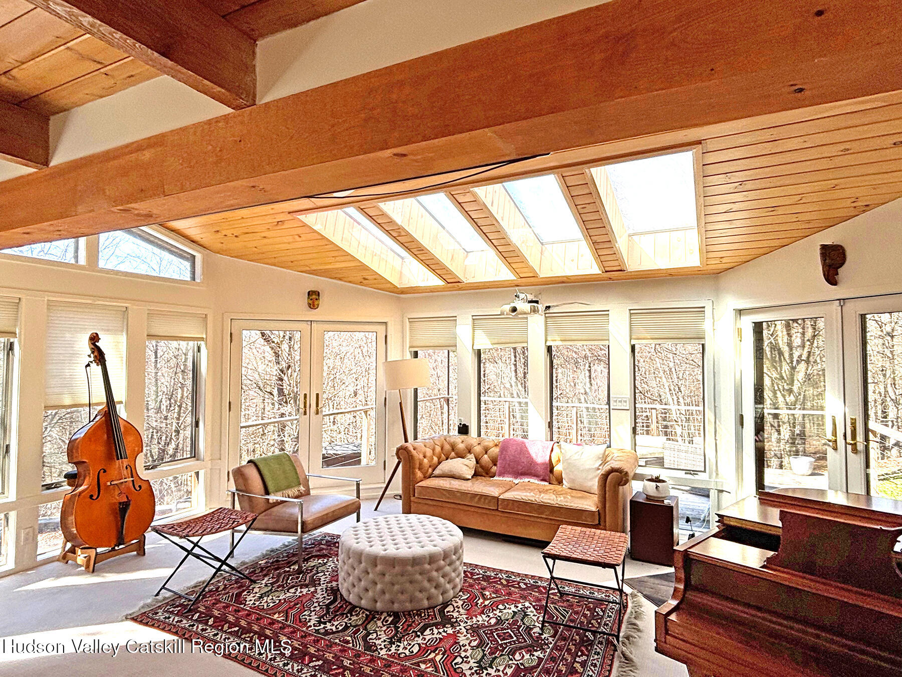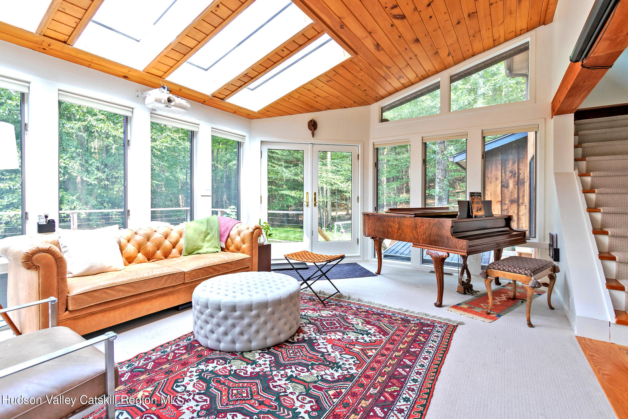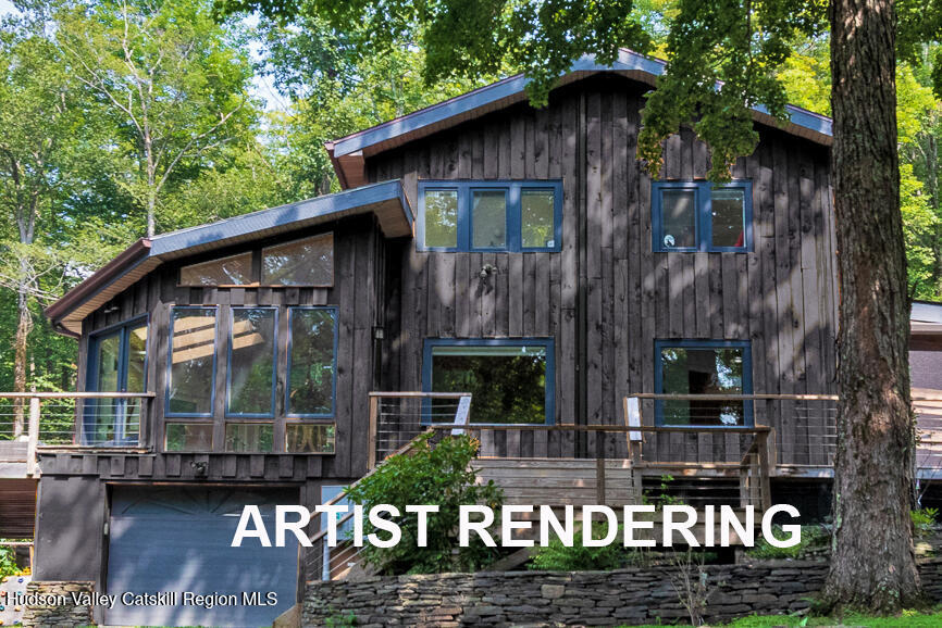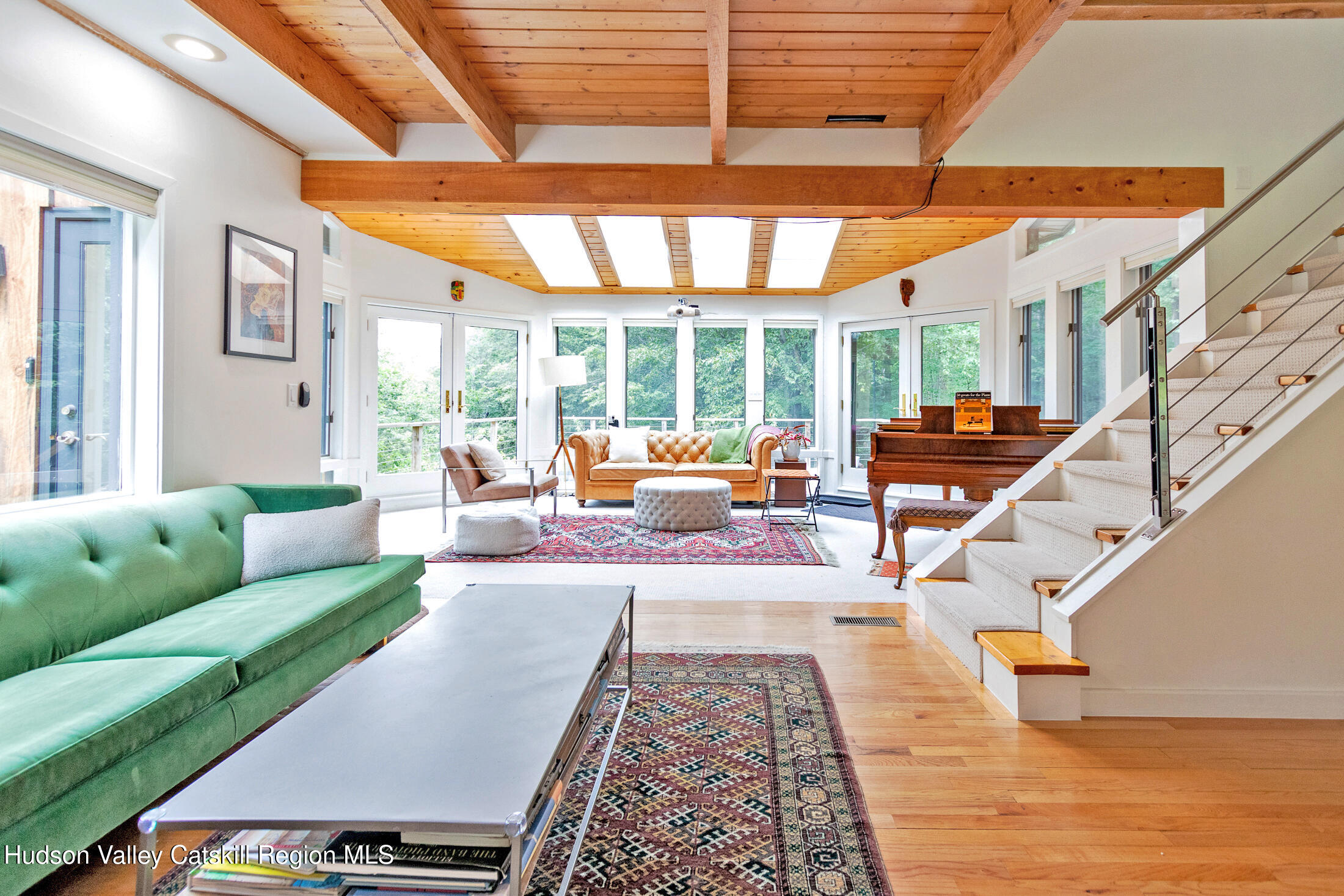 Wend up a pristine country road to this 2,300 sq ft Woodstock contemporary--arriving to total seclusion and picturesque views, yet only minutes to the Village Green. This domain is set on 4+ private acres with an additional almost 4 acre, separately-deeded, contiguous parcel that makes it an ideal property for a compound, or to use with it's maximum natural buffer for ultimate privacy. Close proximity to State land and trails from your own private road (above the house) further adds to the splendor of the premises. Step into an open, flowing layout connecting the stunning, sleek and seductive kitchen with the dining and living areas. The kitchen provides easy access to an outdoor herb garden and BBQ space out back. All this is married together by vaulted and beamed ceilings, expansive windows throughout, and doors out of every first-level room--seamlessly connecting indoor spaces with outdoor living and creating a truly natural retreat. The living room basks in sunlight and boasts walls of windows and skylights, and flows out to a peaceful deck overlooking ''those famous Catskill Mountain views''. Although the town shows this home as a 2-bedroom, the current owner is using a first floor den as an additional guest-sleeping-area. This room is joined to the main living space through a charming office/sitting area, and is surrounded by sliding glass doors with walkways to the lovely outdoors. Cozy up to a massive wood stove after enjoying outdoor activities, or just to read a novel on cold winter nights. Upstairs, you're greeted by an open loge that leads to two large bedrooms--including a primary with a NYC loft-like feel--and a luxurious shared bath. Wood floors and rich natural details add warmth and character throughout the house. Multiple decks and walkways lead to the surrounding grounds that feature a broad landscaped lawn, a fern meadow, forest, gardens with perennial plantings, and a small fruit tree orchard--perfect for outdoor enjoyment and entertaining for everyone. Dine al fresco just outside the kitchen, host gatherings, or simply relax in this tranquil setting. Electric service to the property is underground so there are no ungainly wires cluttering your views. Energy-efficient systems include: a massive rooftop solar array with backup battery, geothermal wells, and an electric car charging station that provide near off-the-grid living with minimal utility bills. All this, just minutes from Woodstock's curated shops, chef-owned restaurants, cultural attractions and recreational options, and live music events at the Bearsville Theatre. Enjoy Belleayre or Hunter Mountain and all the Catskills have to offer. A rare offering combining privacy, sustainability, and style. A pleasure to see and show!