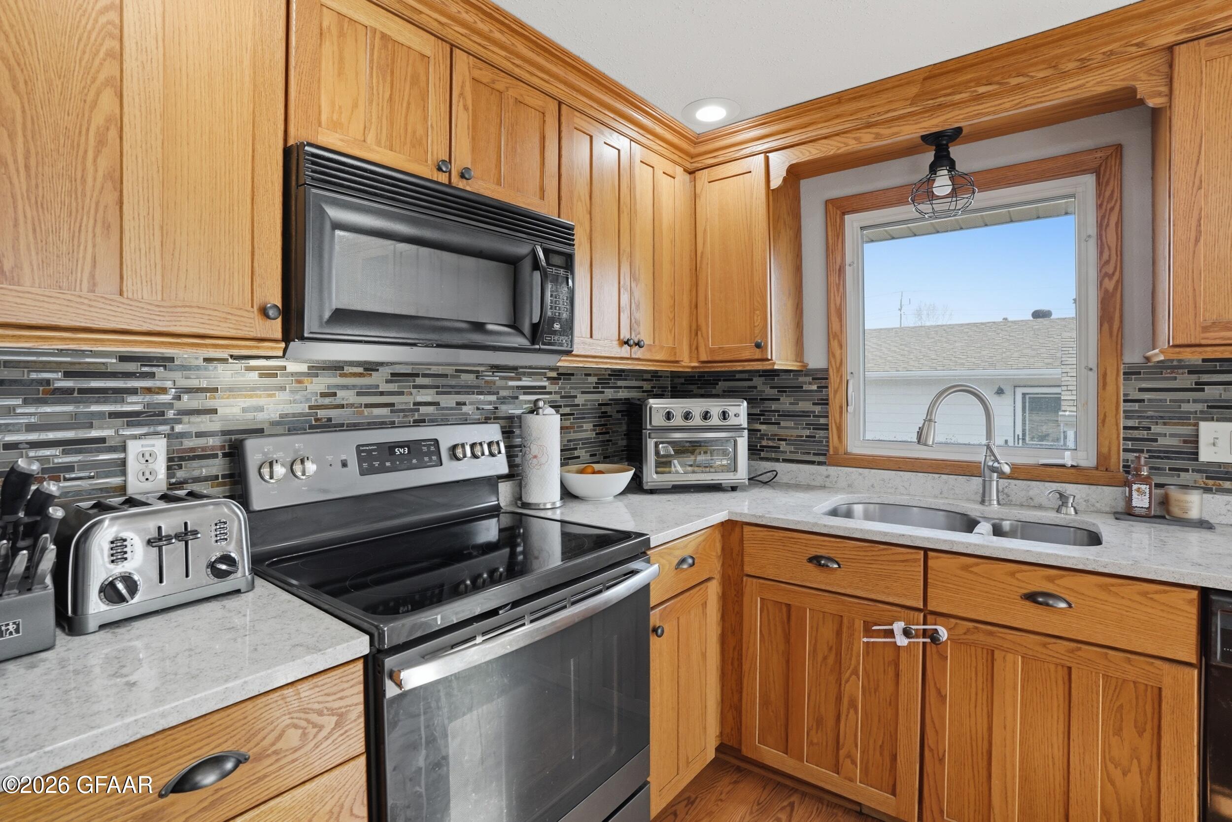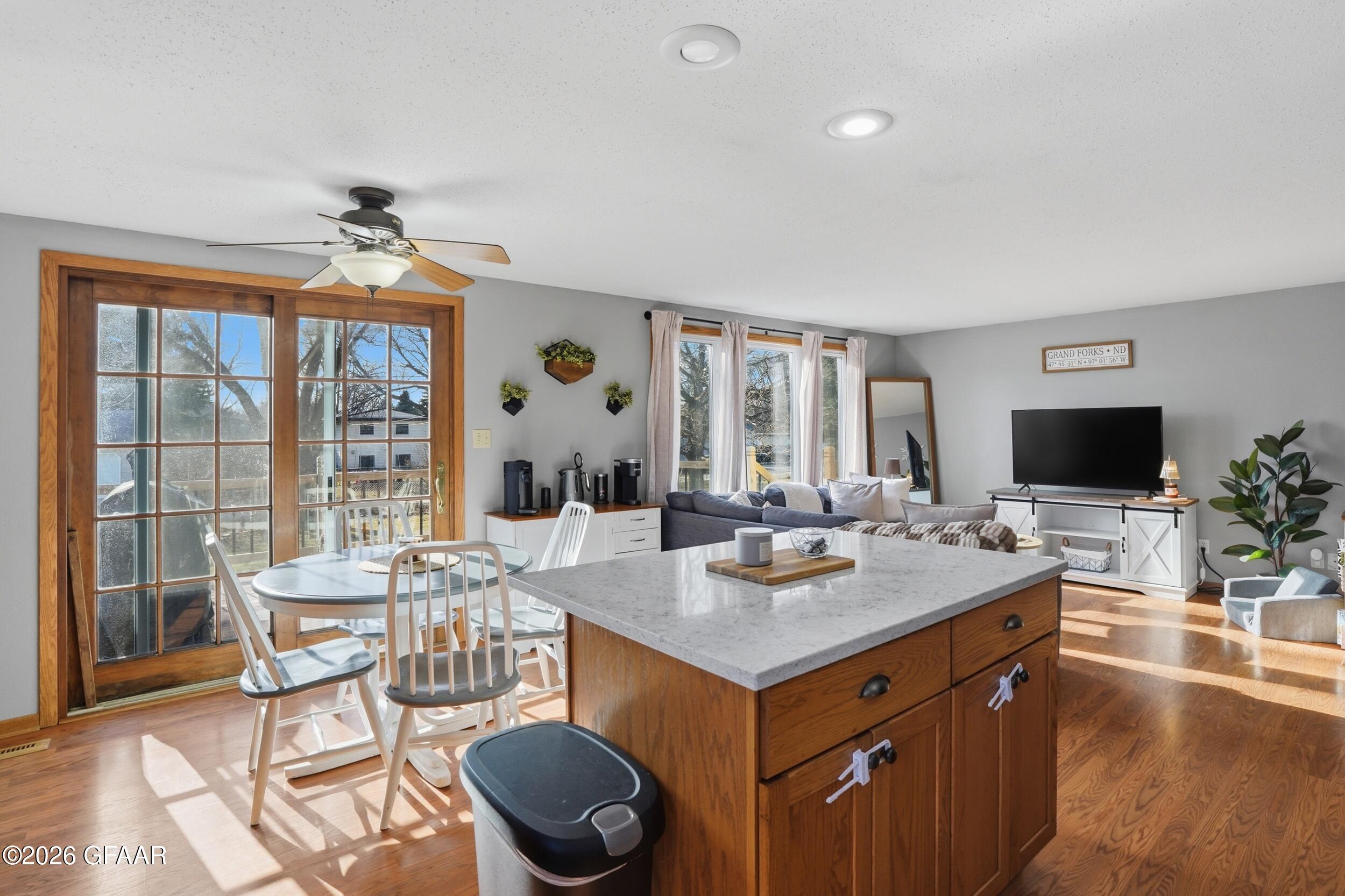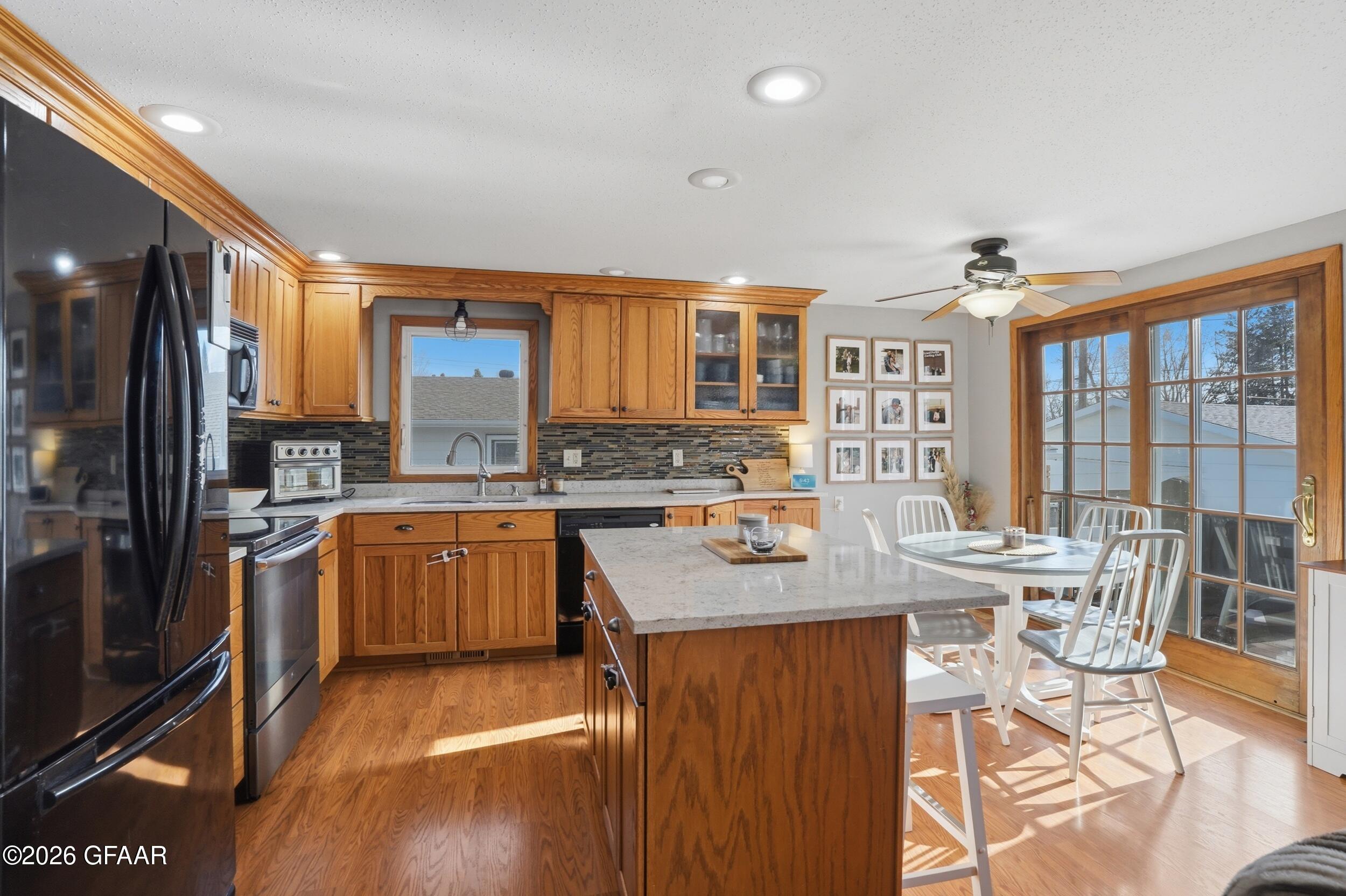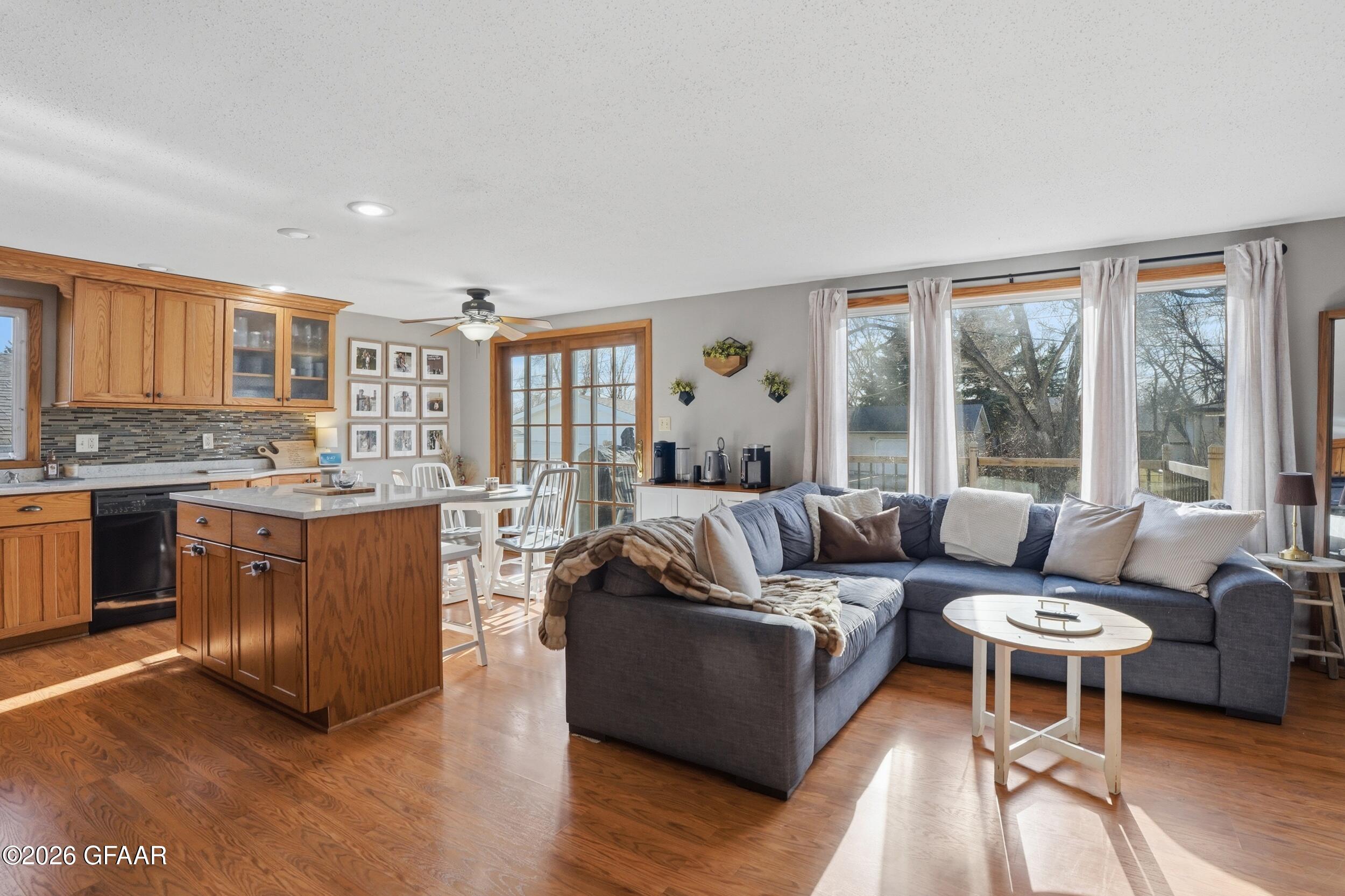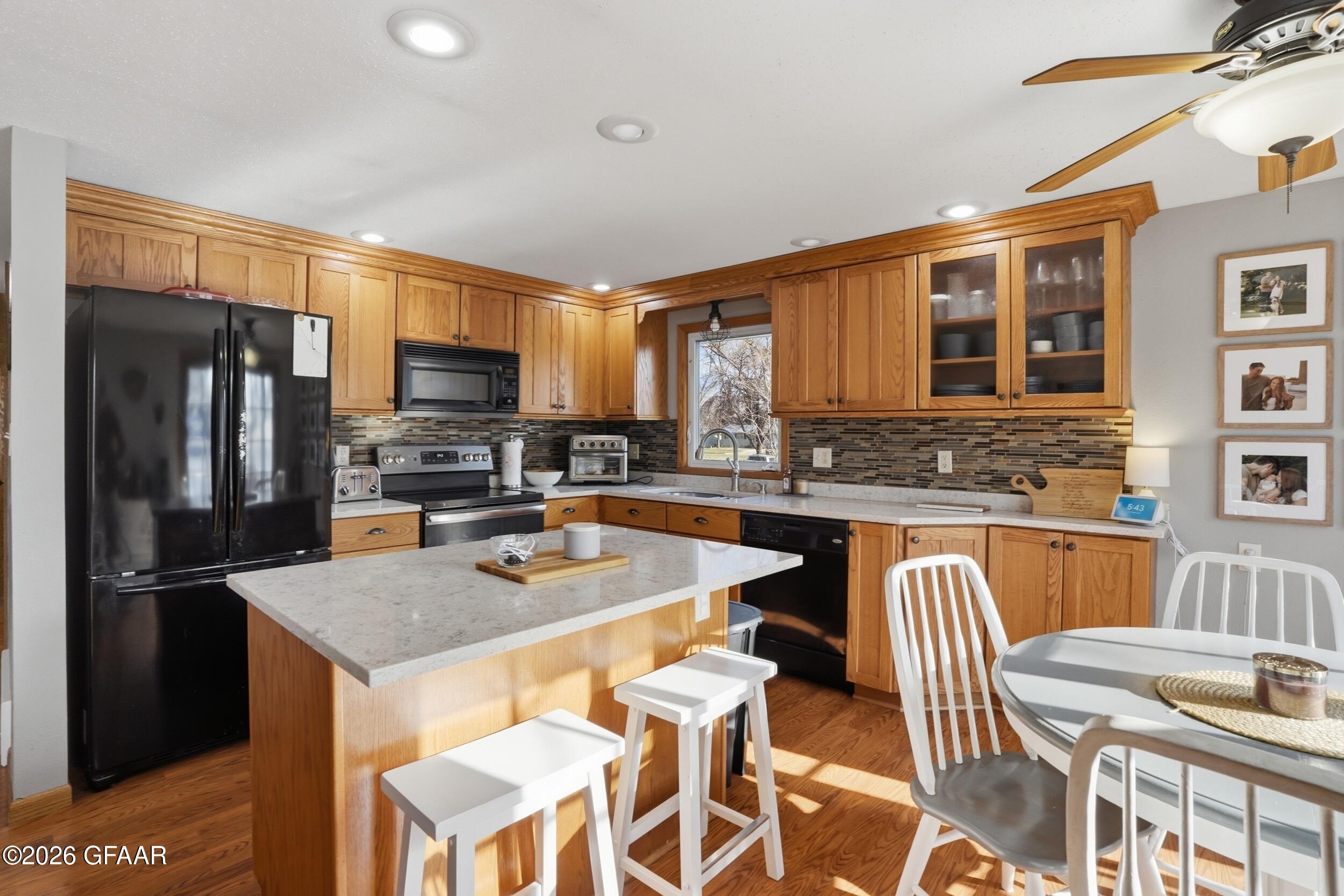 Updated and move-in ready, this 4-bedroom, 2-bathroom home combines modern style with practical living space. The kitchen stands out with solid oak cabinetry, high-end quartz countertops, and a large center island that makes for a natural gathering spot. You'll especially love the upstairs bathroom, which features a custom tile shower and quality finishes. The layout offers plenty of flexibility, whether you need four full bedrooms or a dedicated home office. Outside, the large deck overlooks a massive, fully fenced backyard, perfect for entertaining or keeping pets and kids secure. Complete with a spacious two-stall attached garage and plenty of curb appeal, this home is clean, refreshed, and ready for its next owners.