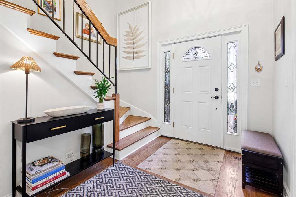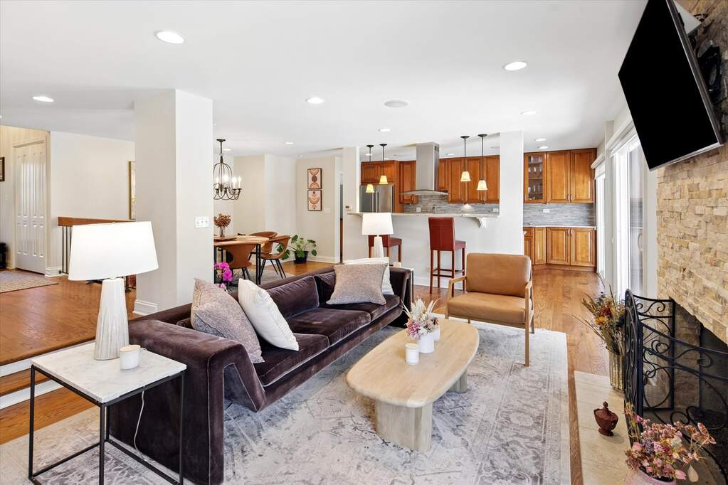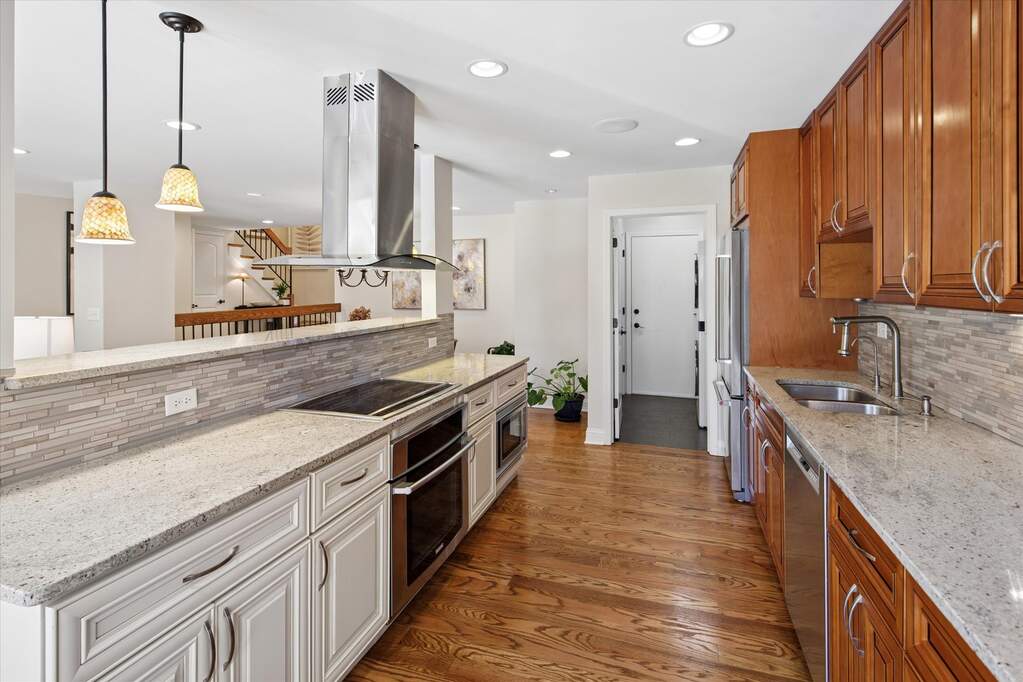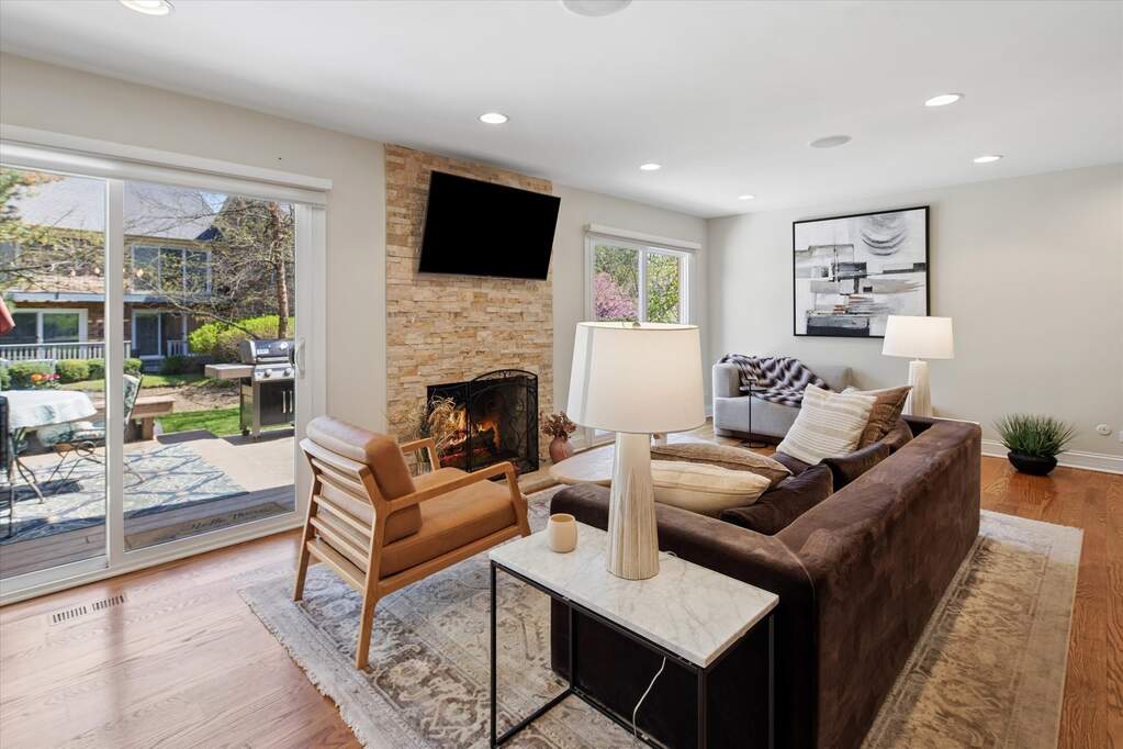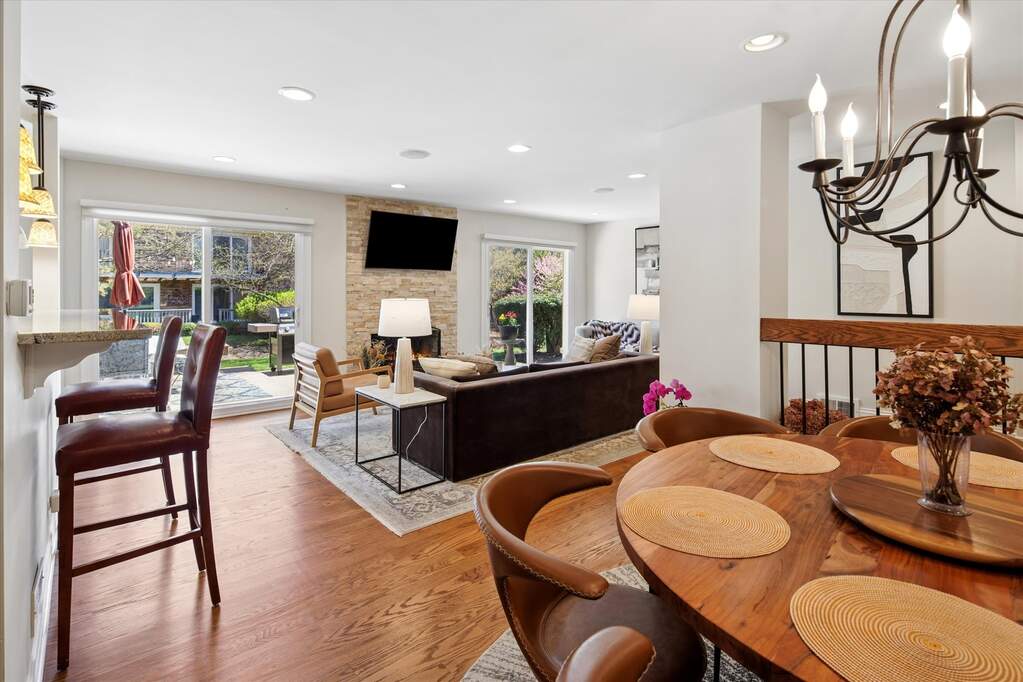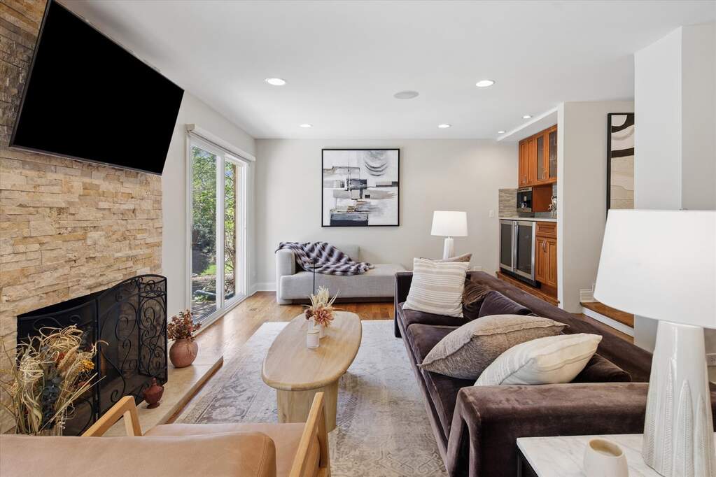 Sensational, fully renovated and move in ready 3 bedroom, 3.5 bath townhome in Ancient Tree with creek views! The home draws you in the moment you step through the door with great flow through an open floor plan design, generous room sizes and wonderful natural light creating a warm and comfortable space. Beautifully refinished hardwoods (2023) run throughout the first and second levels, while designer finishes and recent major upgrades including a new tear-off roof (2022) make this home feel as solid as it is stylish. The light-filled foyer makes a strong first impression with decorative inlay tile and a hanging chandelier. A powder room just off the entry features a copper vessel sink and rich dark wood vanity. Two steps down, the main living area opens to a floor-to-ceiling natural stone surround framing a cozy gas fireplace. A built-in bar just off the living room is outfitted for entertaining with granite countertop, built-in Miele Nespresso machine, and dual temperature-controlled wine and beverage fridges. Sprawling granite countertops anchor the kitchen with a warm, two-toned cabinetry scheme: natural maple uppers and cream-painted lowers at the breakfast bar. Appliances include a part induction cooktop with Electrolux oven, Bosch dishwasher, KitchenAid refrigerator and microwave, a sleek steel and glass hood, and a Simpure reverse osmosis water filtration system. Two sliders off the kitchen and living room lead to a multilevel east-facing deck that catches the morning light beautifully and provides views of the creek. A well-organized laundry room off the kitchen features a stackable LG washer and dryer and laundry sink, while the attached 2-car garage with epoxy floors and a dedicated EV charger rounds out the main level. Upstairs, hardwood floors continue throughout, with a generously sized primary suite with sliding glass door opening to a private balcony overlooking the creek, abundant closets with professional organizers, and a beautifully finished ensuite bath with decorative tile and mosaic glass accents, dual vanities, and a generous step-in multi-spray shower with rain head. The second bedroom is well proportioned with a walk-in closet and its own ensuite bath featuring quartz countertops and a striking dark striated tile tub surround. The completely updated and finished basement (2023) features plush carpeting, a large third bedroom and full bath with bold tile accents, a deep storage closet, and a family room flexible enough for a home theater, game room, or additional sleeping quarters. Adjacent to Heritage Oaks Golf Club, the location is hard to beat and provides full amenities within the complex, including a fitness center, tennis and pickleball courts, outdoor pool and clubhouse. Downtown Northbrook is just minutes away, with an excellent dining scene, boutique shopping at Village Green, summer farmers market, and easy Metra access to the city.