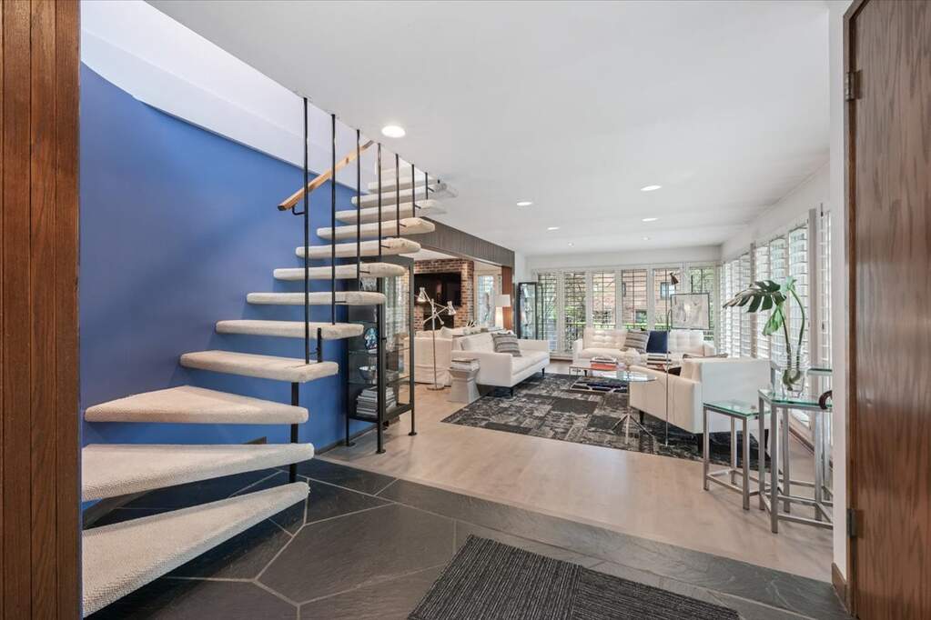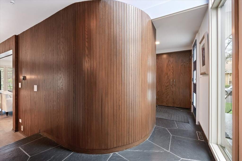 Three-bedroom, 2.2-bath mid-century modern home with full basement has been transformed into open contemporary space that showcases exciting architectural details, including a gorgeous curved wood wall and dramatic 2-story floor-to-ceiling window. No detail was overlooked in the magazine-worthy 2019 kitchen with endless storage, quartz counters and Sub-Zero, Wolf, and Fisher & Pykel appliances. The upstairs primary suite with attached private sitting room and large bath provides a personal retreat; the rec room in the walk-out lower level adds additional exceptionally appointed space; and the lovely low-maintenance yard with deck, patio, and tree-filled garden was a highlight of the 2018 Evanston garden walk. The home shares a small portion of the dining room wall with its neighbor; it is a single family home in all other respects. Attached extra deep one-car garage. Special!