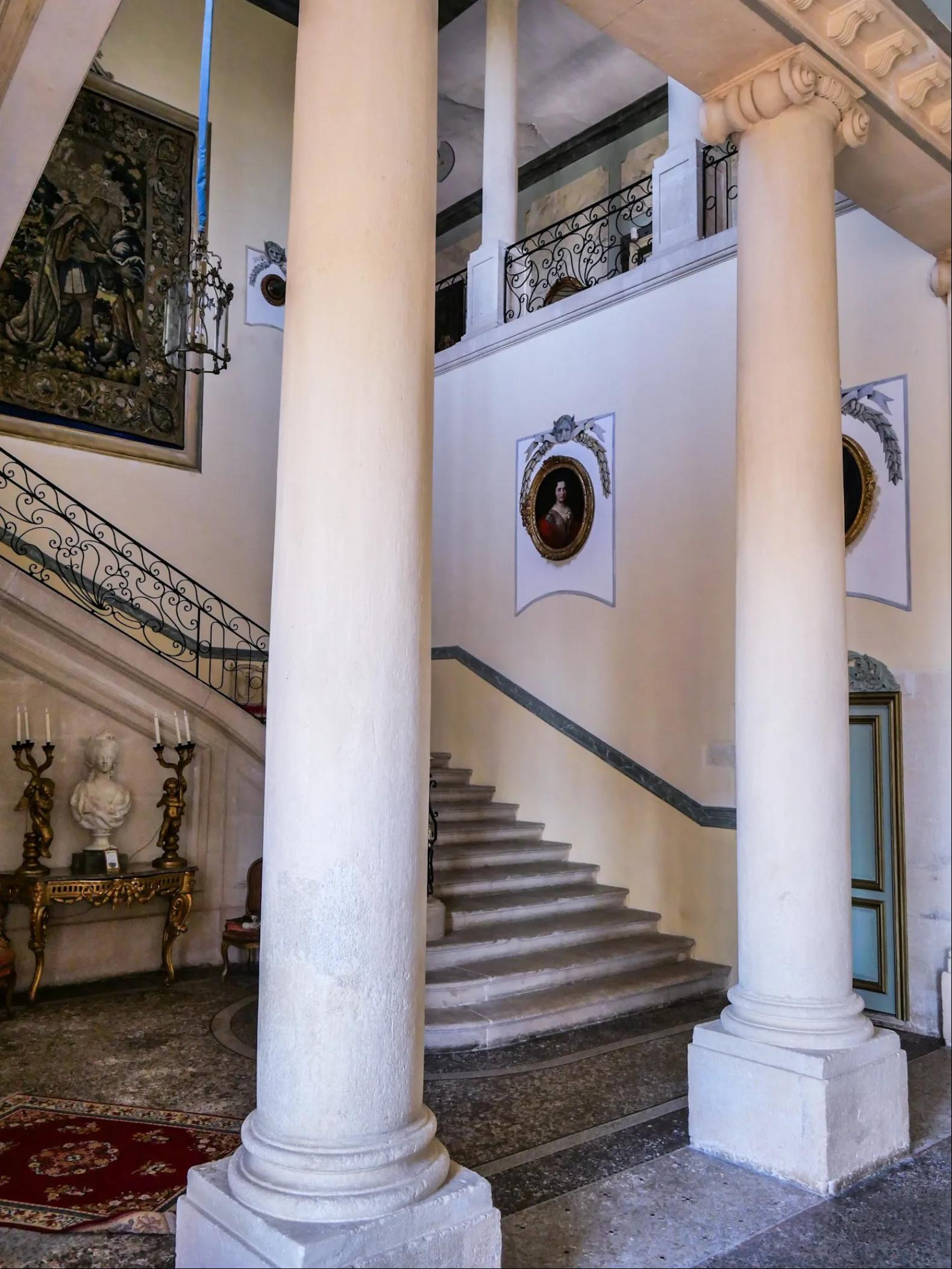 Inside, beneath ceilings rising 5.3 metres high and bathed in light from all sides, the through-hall opens onto the 80 m² grand salon. It is adorned with pilasters topped with Ionic capitals, mirroring the monumental free-standing columns that open onto the majestic staircase-completely open, with its grand flight of steps leading to the upper floor, where columns form balconies dramatically overlooking the hall. It is undoubtedly one of the most beautiful private 18th-century staircases in France.