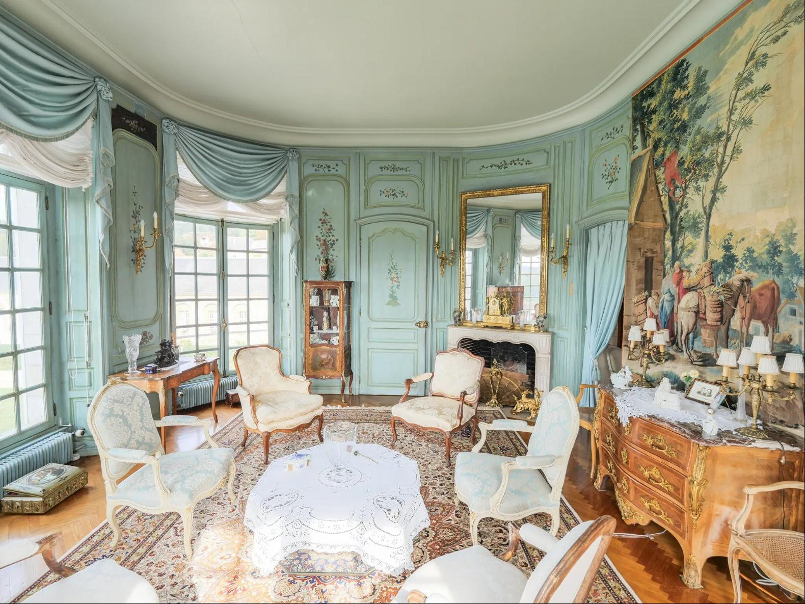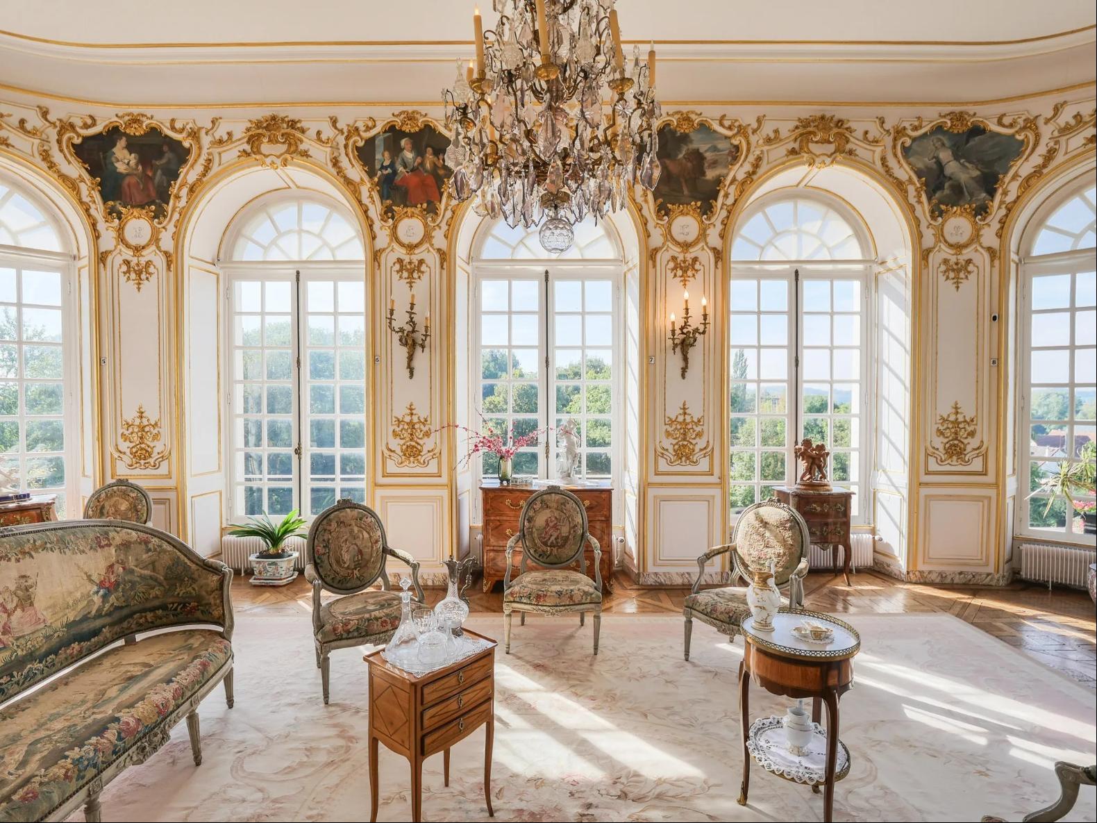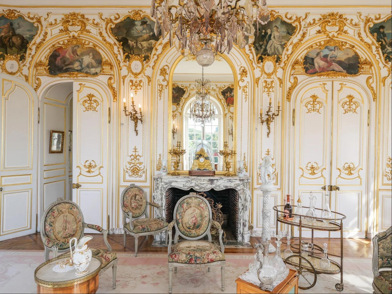 Upon entering through the grand central perron, one finds a ground floor flooded with light throughout the day and arranged around an oval stone hall with antique-style pilasters and a black-and-white cabochon floor. It opens onto an exceptional dining room with 18th-century painted wood paneling decorated with vegetal motifs and two oil paintings on the theme of Love by Jean-Baptiste Huet (1745-1811), whose works are today in the world’s greatest museums, including the Louvre, the Met in New York, and the Victoria and Albert Museum in London. The ground floor continues with the gilded salon, with its white-and-gold paneling and fine marble fireplace, followed by the very spectacular Zodiac Salon, bathed in light thanks to its triple exposure to the east, south and west, and offering a sumptuous view of the valley. This room is adorned with twelve paintings of the signs of the Zodiac, a marble fireplace, large double interior doors, and Versailles parquet flooring.