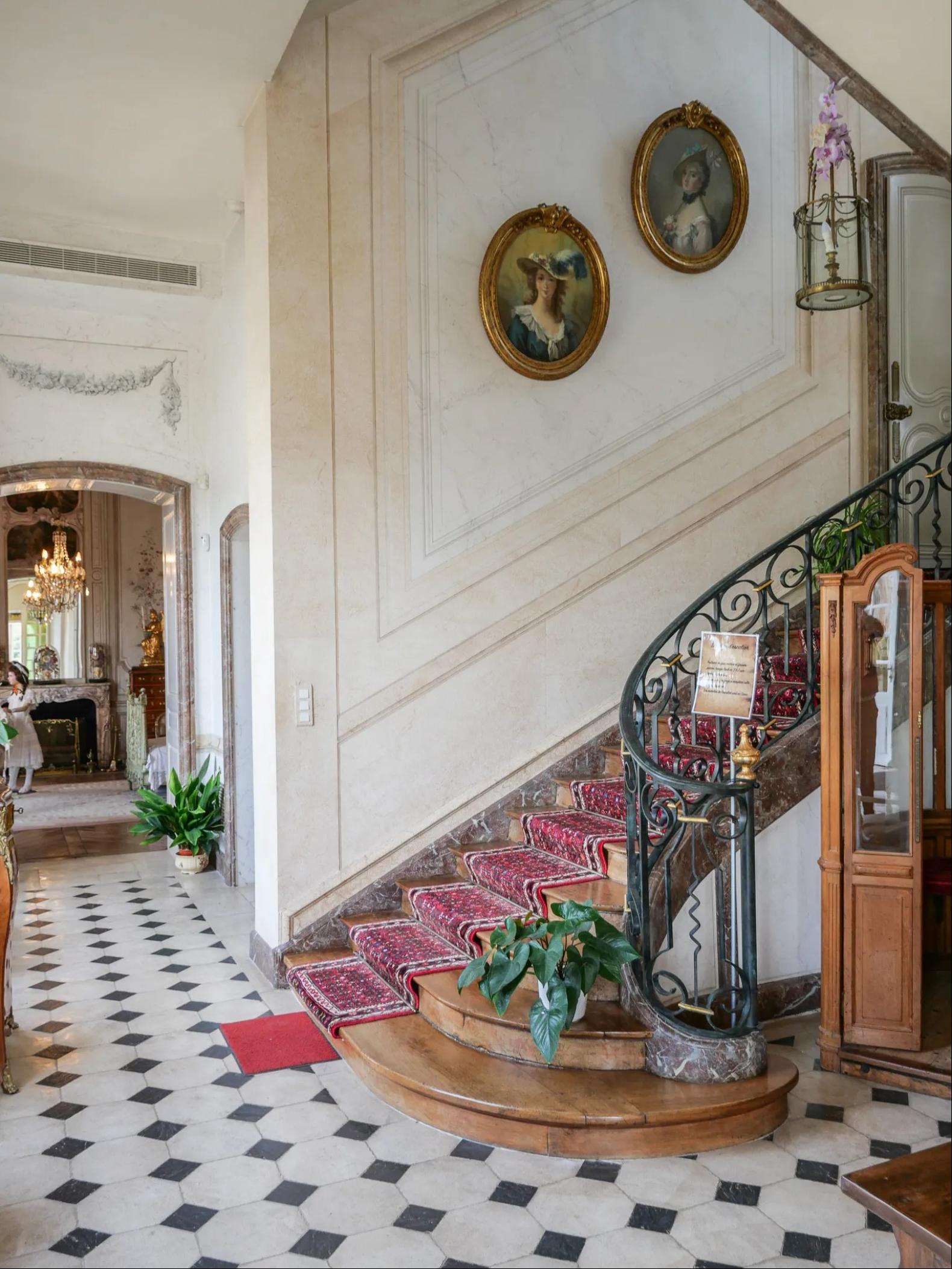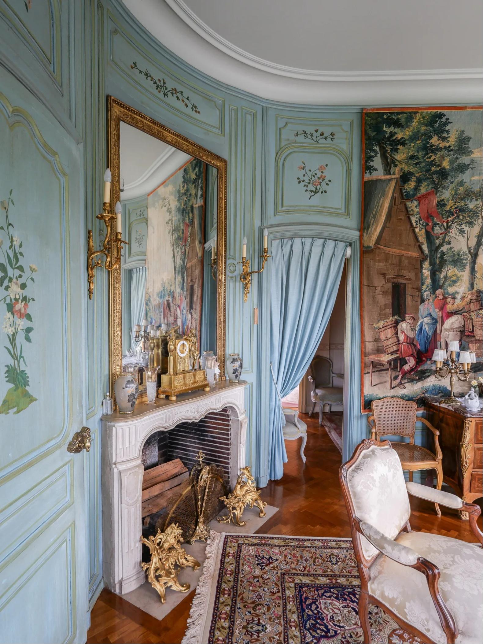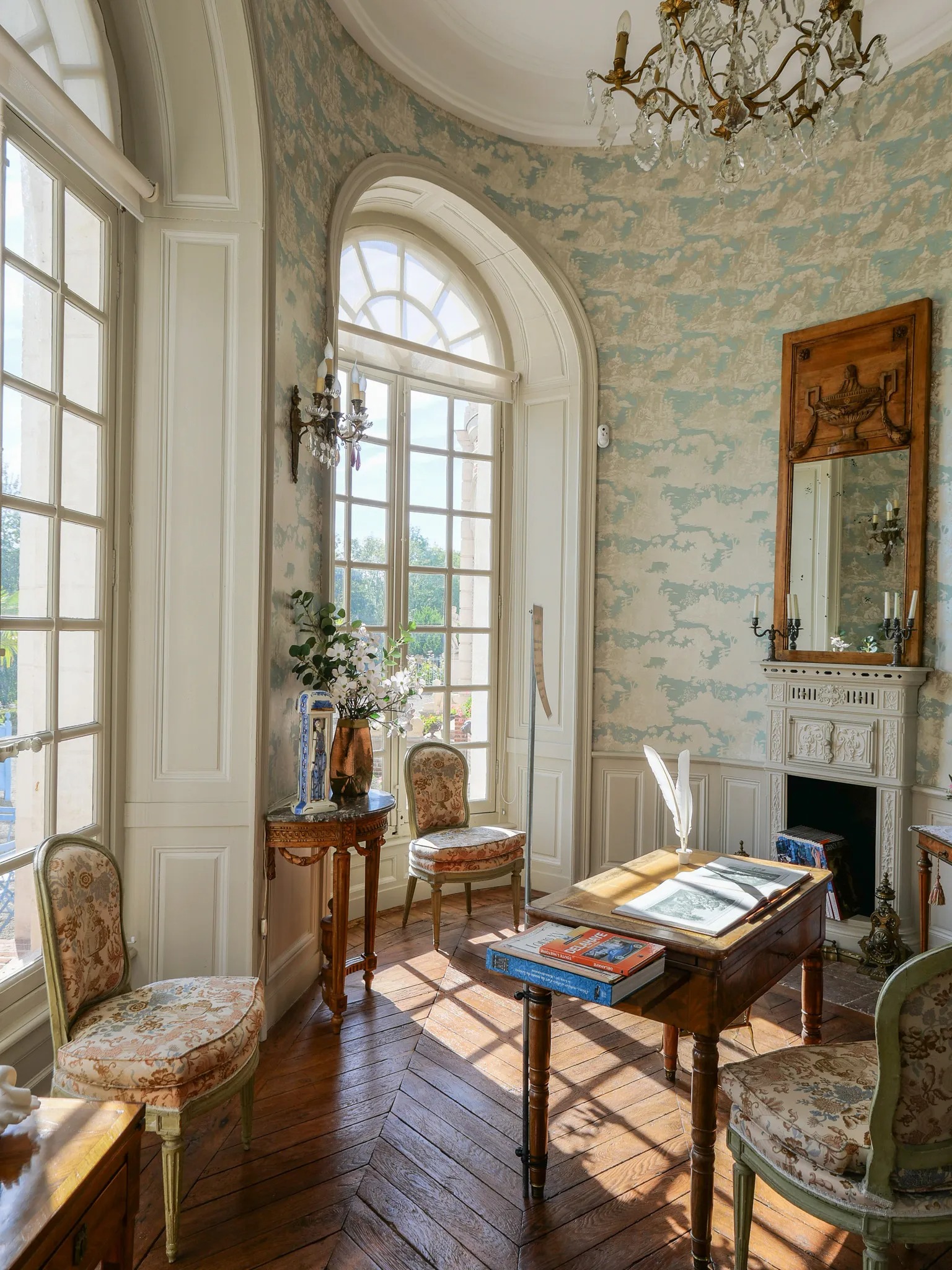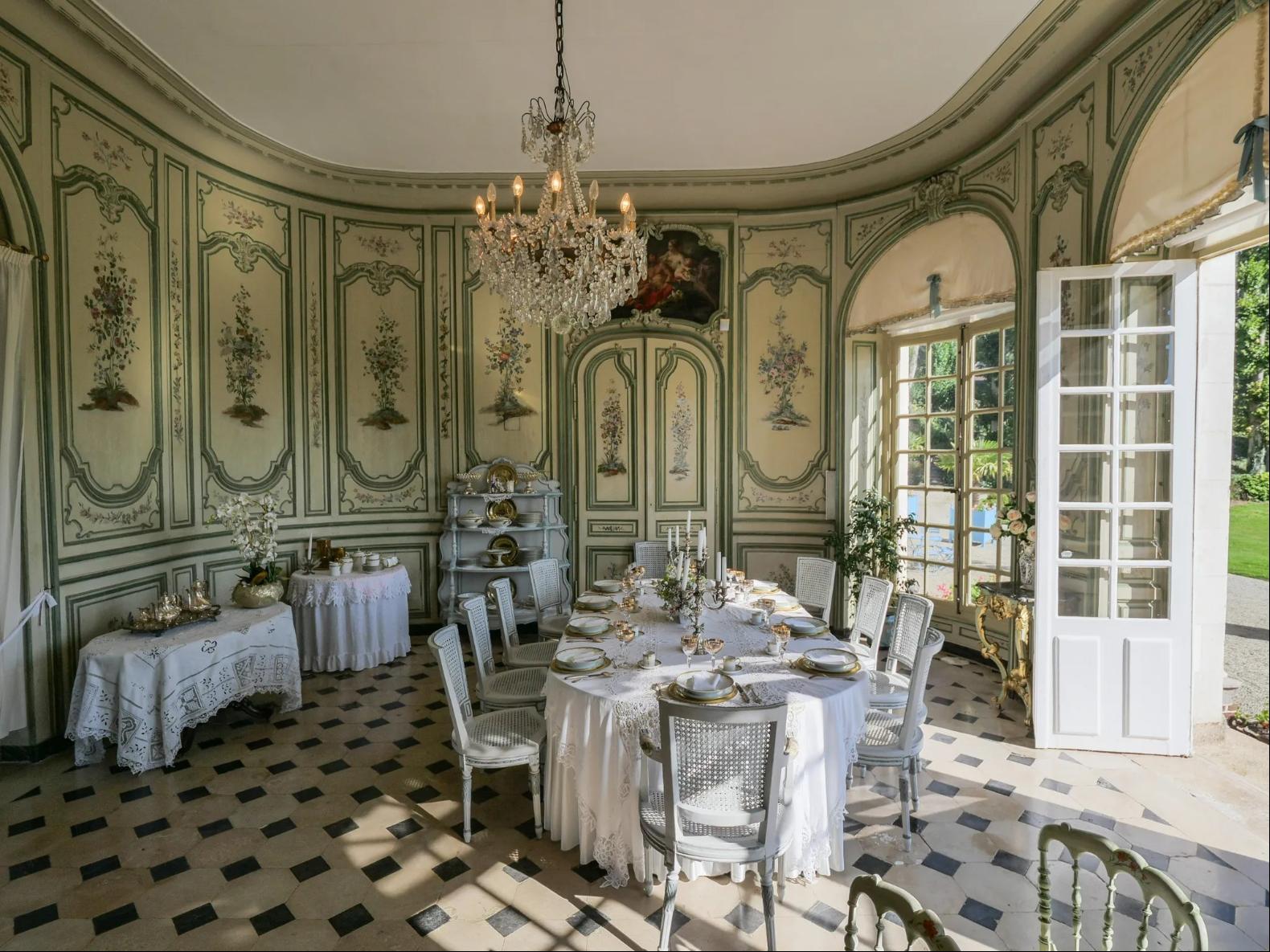 Upon entering through the grand central perron, one finds a ground floor flooded with light throughout the day and arranged around an oval stone hall with antique-style pilasters and a black-and-white cabochon floor. It opens onto an exceptional dining room with 18th-century painted wood paneling decorated with vegetal motifs and two oil paintings on the theme of Love by Jean-Baptiste Huet (1745-1811), whose works are today in the world’s greatest museums, including the Louvre, the Met in New York, and the Victoria and Albert Museum in London. The ground floor continues with the gilded salon, with its white-and-gold paneling and fine marble fireplace, followed by the very spectacular Zodiac Salon, bathed in light thanks to its triple exposure to the east, south and west, and offering a sumptuous view of the valley. This room is adorned with twelve paintings of the signs of the Zodiac, a marble fireplace, large double interior doors, and Versailles parquet flooring.