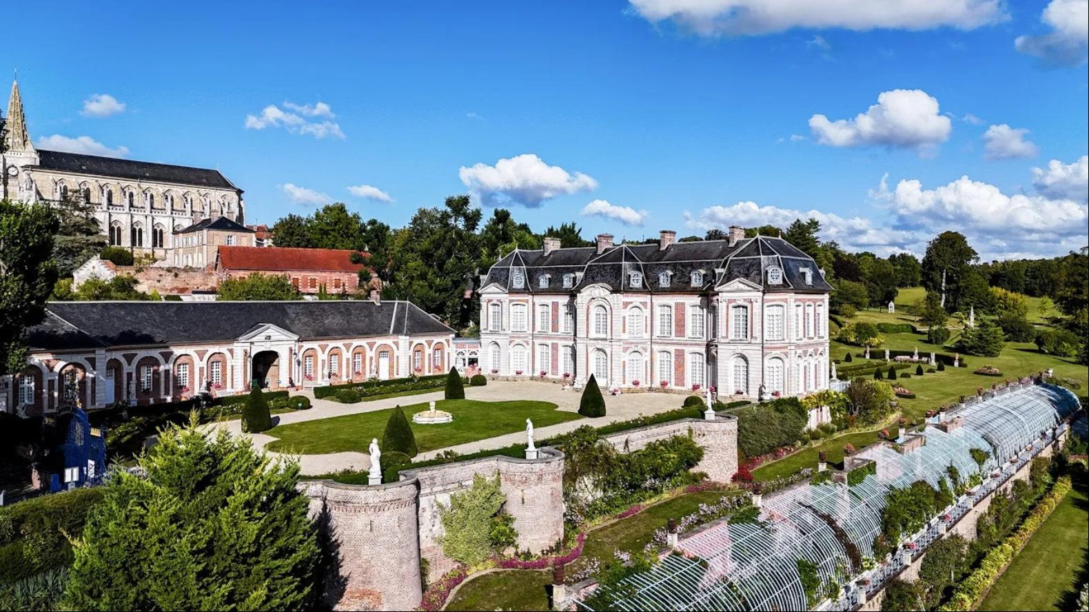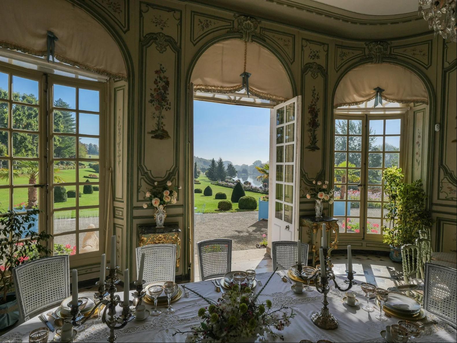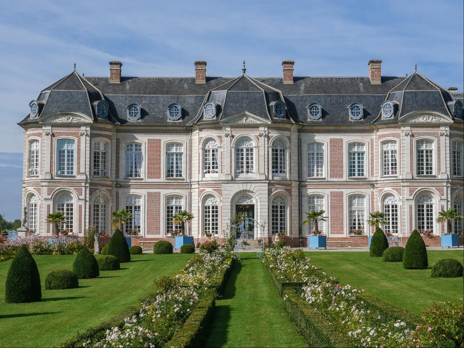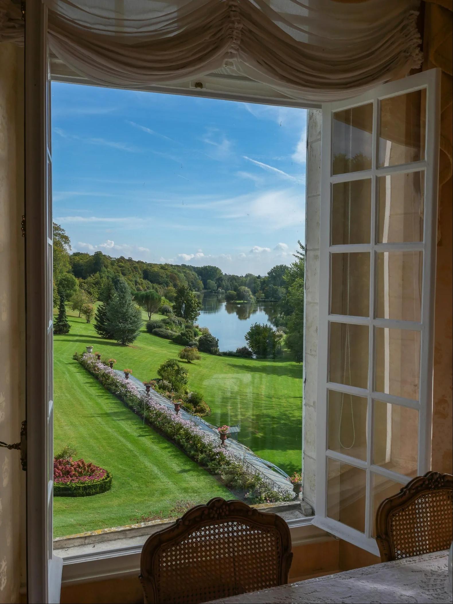 Dominating the splendid natural setting of the Somme Valley, this 18th-century masterpiece, built in refined symmetrical brick-and-stone architecture inspired by an 18th-century architectural treatise, rises on a series of monumental south-facing terraces that shelter some of the largest private greenhouses in France, each one hundred meters long. The landscaped park, both classical and romantic in style, extends over 18 hectares and is bordered for one kilometer by the river, enclosing a five-hectare pond dotted with small peninsulas. Thanks to its east-west orientation, the château is bathed in light throughout the day, offering grand enfilades of salons and bedrooms with painted and gilded Rocaille woodwork, framing original paintings by Jean-Baptiste Huet. Together, these create a magical décor that combines with the magnificent south-facing view from the salons across the valley.