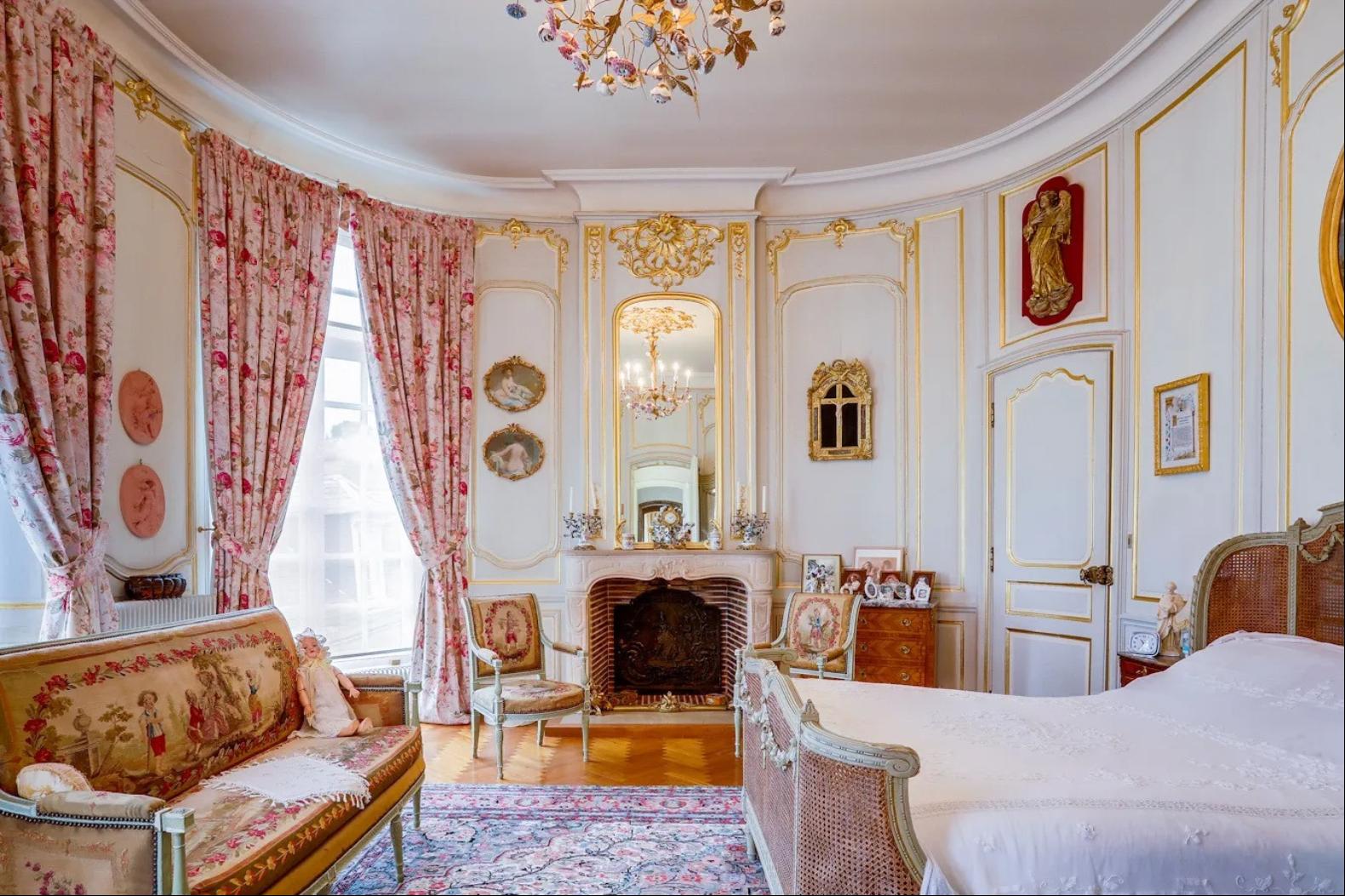 A beautiful staircase with faux-marble painted walls and a wrought-iron banister leads to the upper floors. Among the highlights are a sumptuous oval bedroom decorated with painted floral woodwork and paintings by Jean-Baptiste Huet and a marble fireplace, as well as a library with magnificent decoration. A small hall, lavatory, and winter garden connect to the service wing. On the first floor there are four bedrooms with bathrooms, some decorated with white-and-gold woodwork, two salons including a particularly fine rotunda, a small dining room, a kitchen, and an office with dumbwaiter. The second floor includes five bedrooms, two bathrooms, a workshop or laundry, and a large room to be renovated. A vast cellar completes the main building.