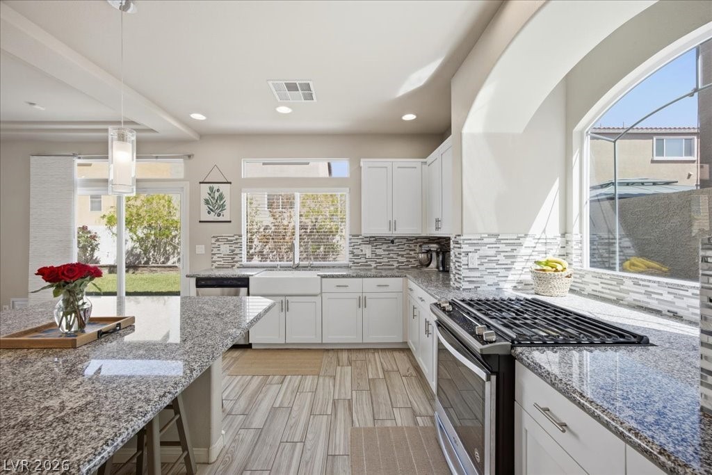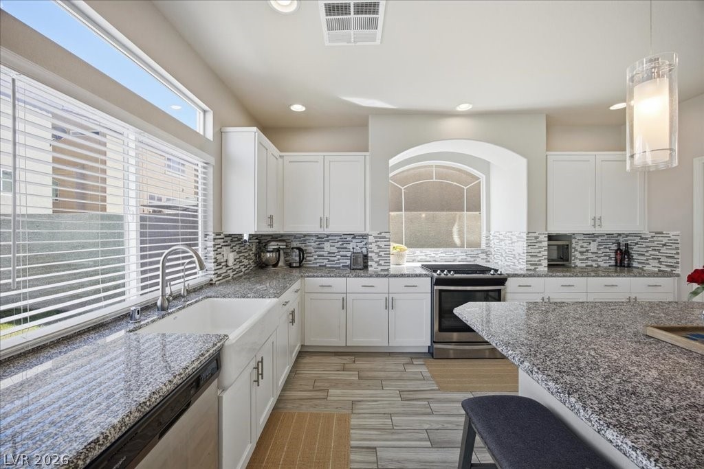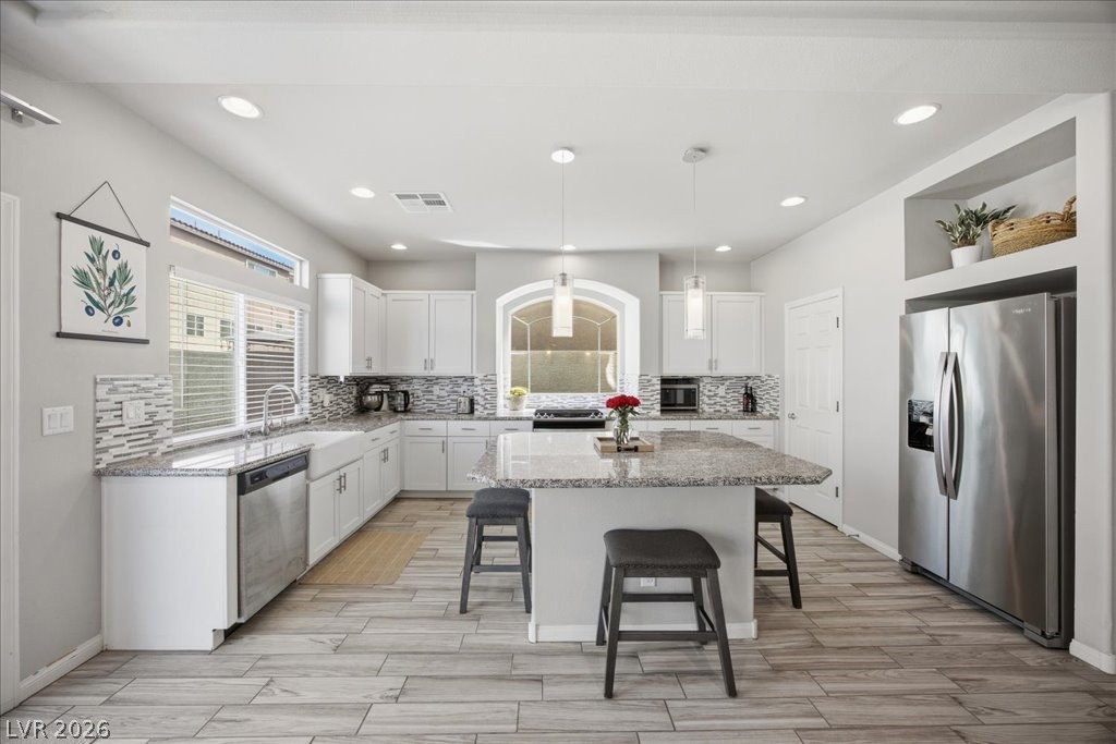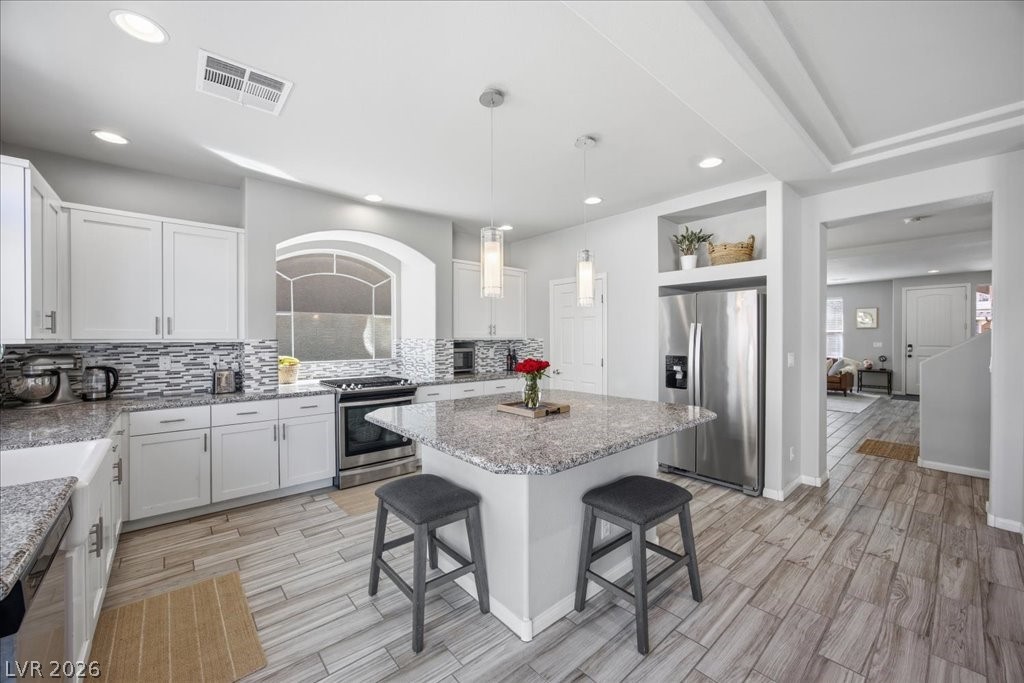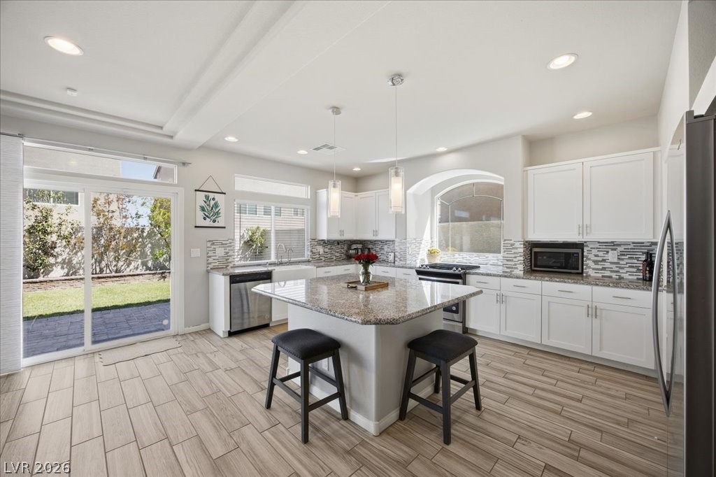 WELCOME TO SPRAWLING 2-STORY HOME! FLAWLESS CURB APPEAL WITH PAVERS, EASY TO MAINTAIN LANDSCAPING, & UPGRADED STONE EXTERIOR! ENTERING THE HOME FAMILY/ DINING ROOM COMBO GREETS YOU! GREAT ROOM COMBINE GORGEOUS KITCHEN, BREAKFAST NOOK, & LIVING ROOM WITH FIREPLACE! KITCHEN LOOKS TOWARD BACKYARD & FEATURES STAINLESS APPLIANCES, GRANITE COUNTERTOPS, TILE BACKSPLASH, LARGE WINDOWS ALLOWING FOR NATURAL LIGHT, ISLAND WITH SEATING, RECESSED & PENDANT LIGHTING, PLUS WALK-IN PANTRY! SECOND STORY PRIMARY SUITE SEPARATE FROM ADDITIONAL BEDROOMS! PRIMARY SUITE FEATURES DOUBLE DOORS, TWO CEILING FANS, WALK IN CLOSET, & PRIMARY BATH FEATURES OVERSIZED GLASS ENCLOSED SHOWER + DUAL SINKS EACH ON IT'S OWN WALL! EACH BEDROOM HAS CEILING FANS! SECOND PRIMARY SUITE FEATURES OVERSIZED BEDROOM WITH BATH FEATURING SHOWER/ TUB COMBO! NEAR GREAT SCHOOLS, NEWLY BUILT "BATTLE BORN PARK", & SHOPPING NEARBY! WELCOME HOME!