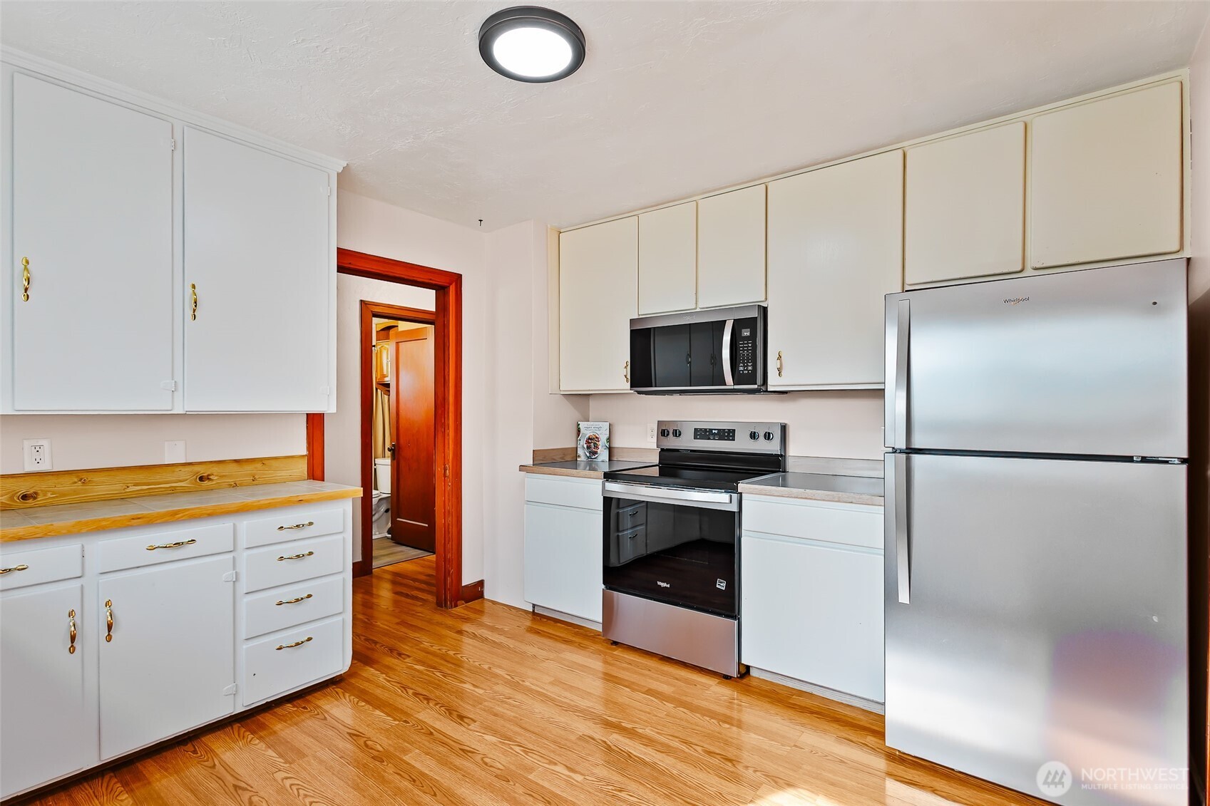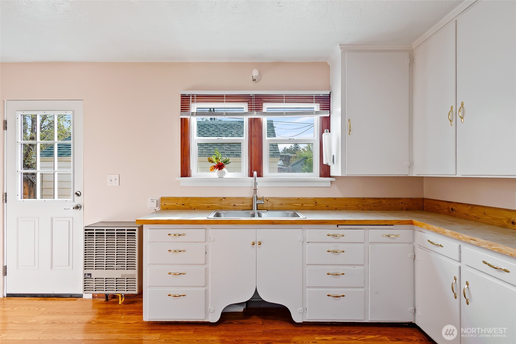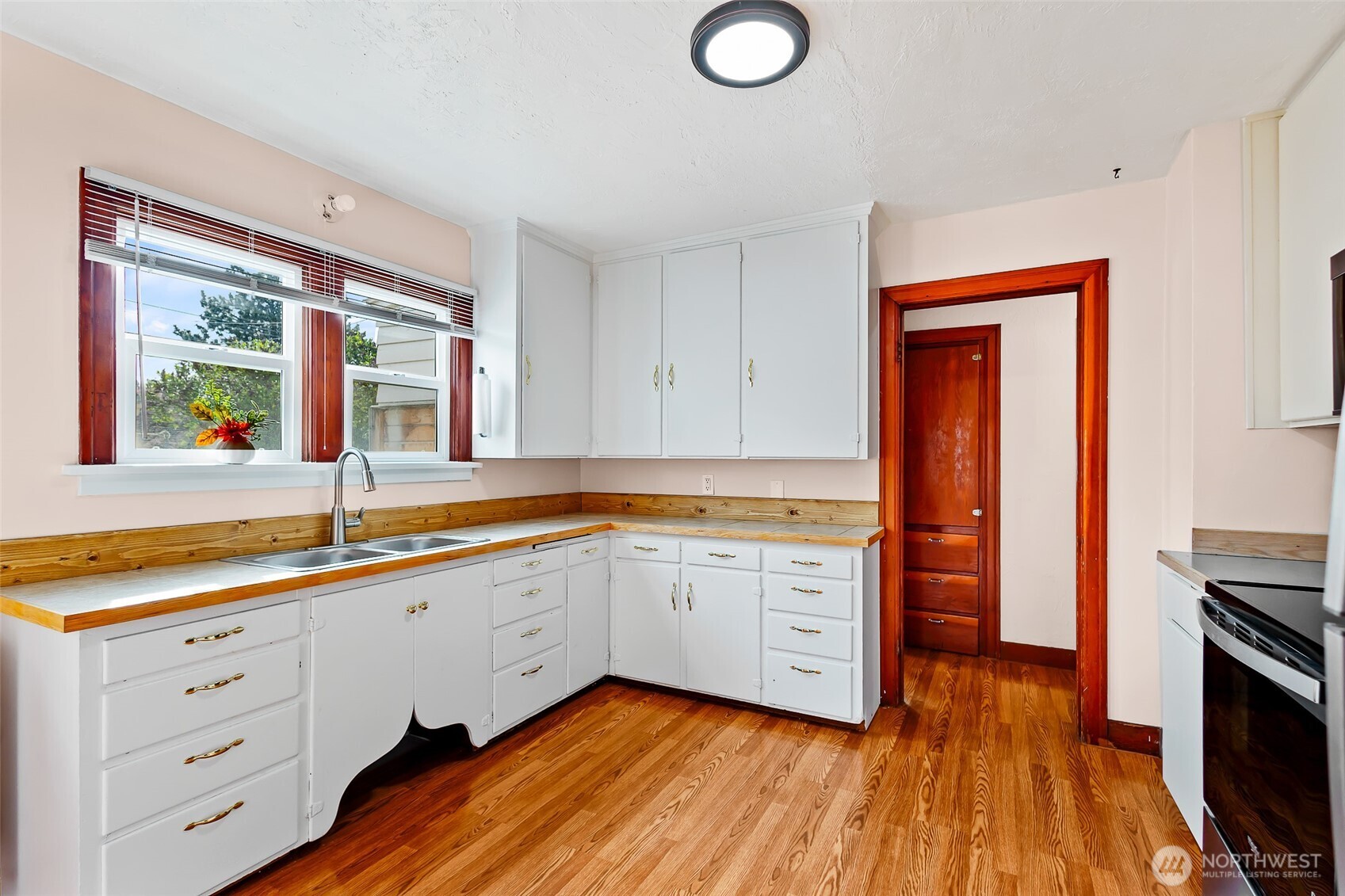 Meticulously kept 1940s home in the heart of Ellensburg! First time on the market in over 30 years, this corner lot property offers exceptional potential. Situated on a large city lot with alley access and detached garage, it provides flexibility for future improvements such as an ADU or larger garage. The detached garage has a 40s style canned fruit cellar and a closet- perfect for additional storage. The garden space is ready for your personal touch. The home features an updated bathroom, updated kitchen counters and sink, new stainless steel appliances, and fresh interior paint. The well-maintained interior reflects pride of ownership throughout. Original 1940s trim and interior doors add timeless character, while the living room, dining room, and primary bedroom showcase original hardwood floors. The exterior was painted in 2023, and the home includes a newer hot water tank for added peace of mind. Ideal for investors or those searching for the perfect starter home, this property is conveniently located near downtown Ellensburg and Central Washington University, offering easy access to local amenities. Close proximity to local schools adds everyday convenience.