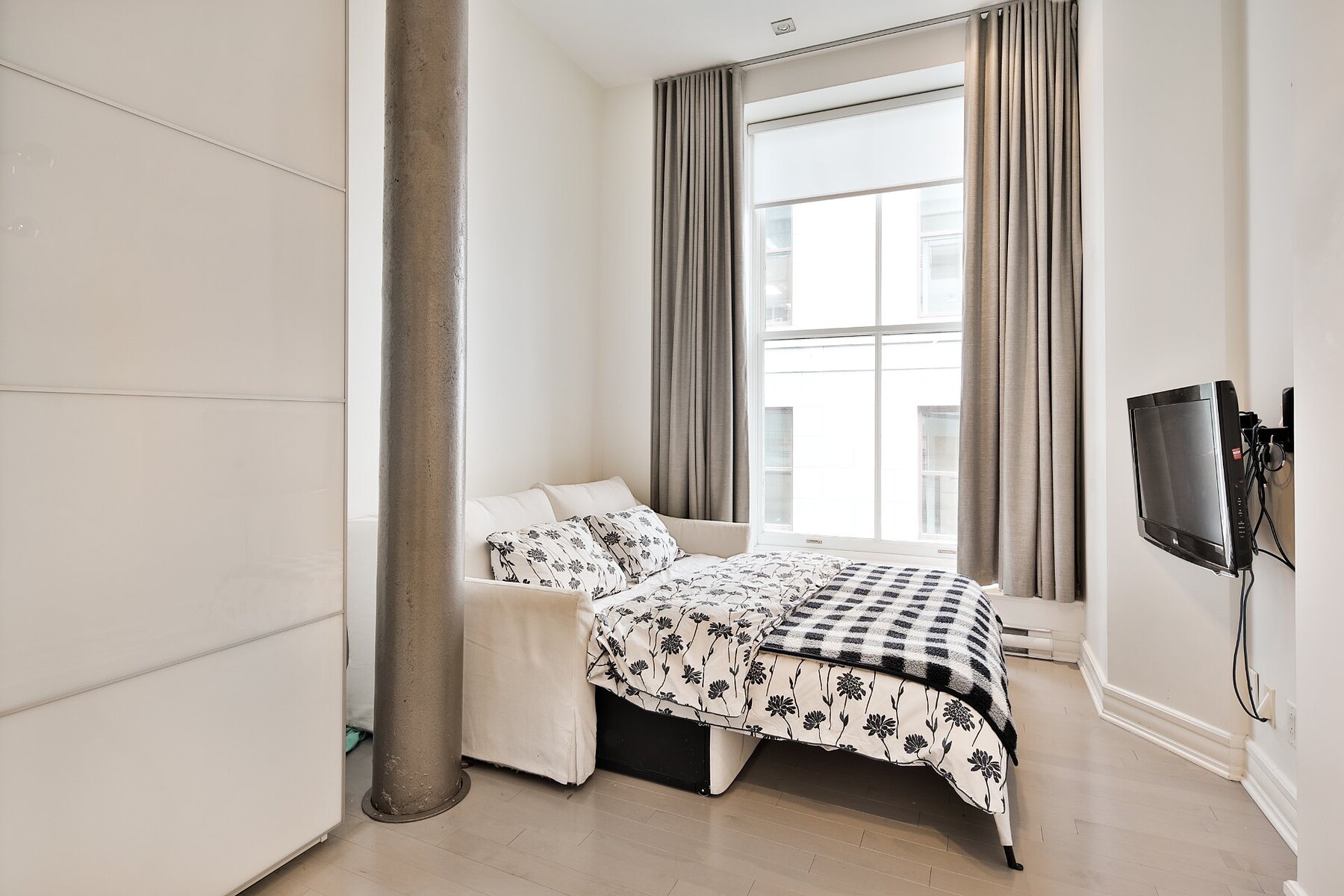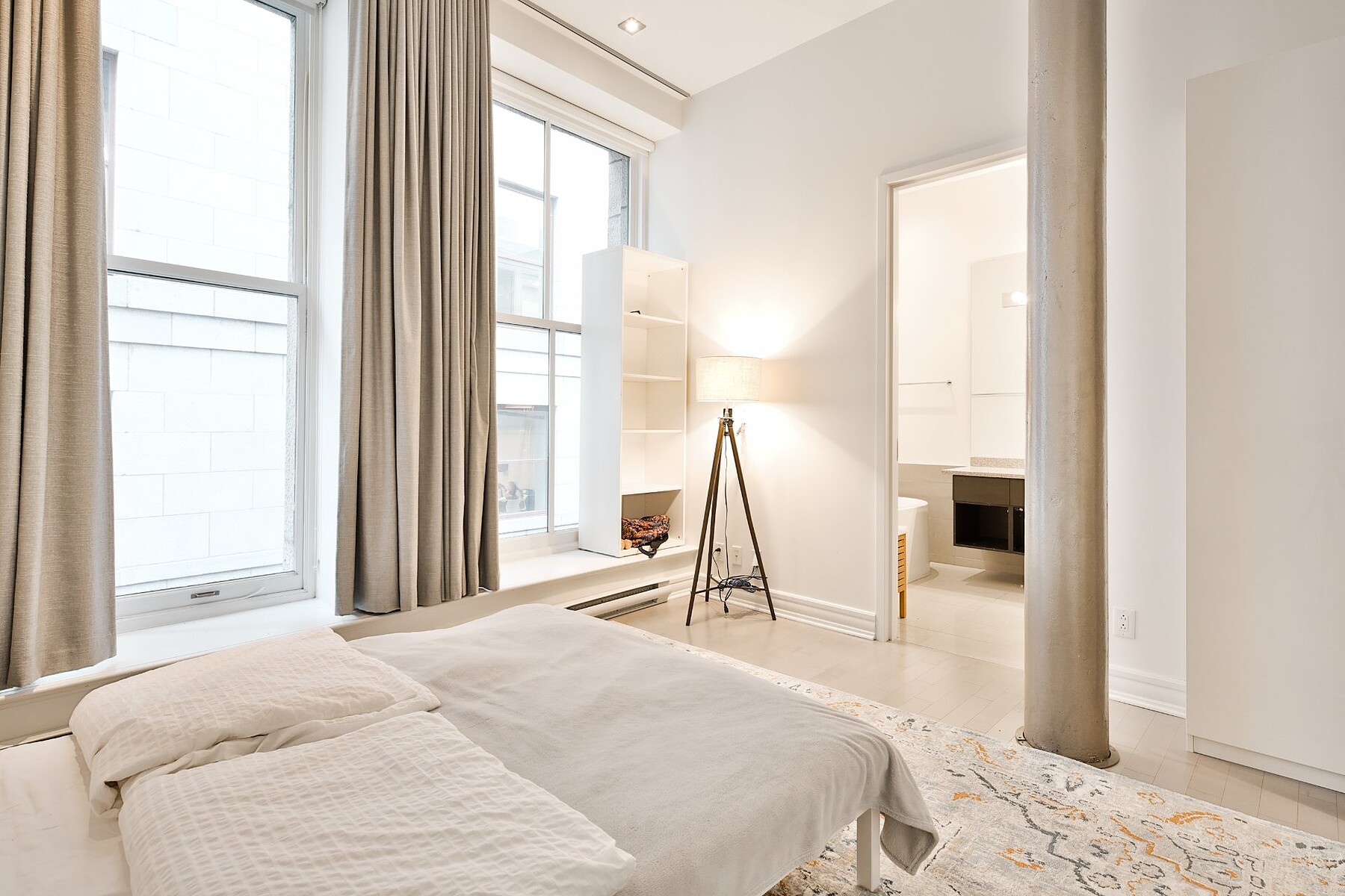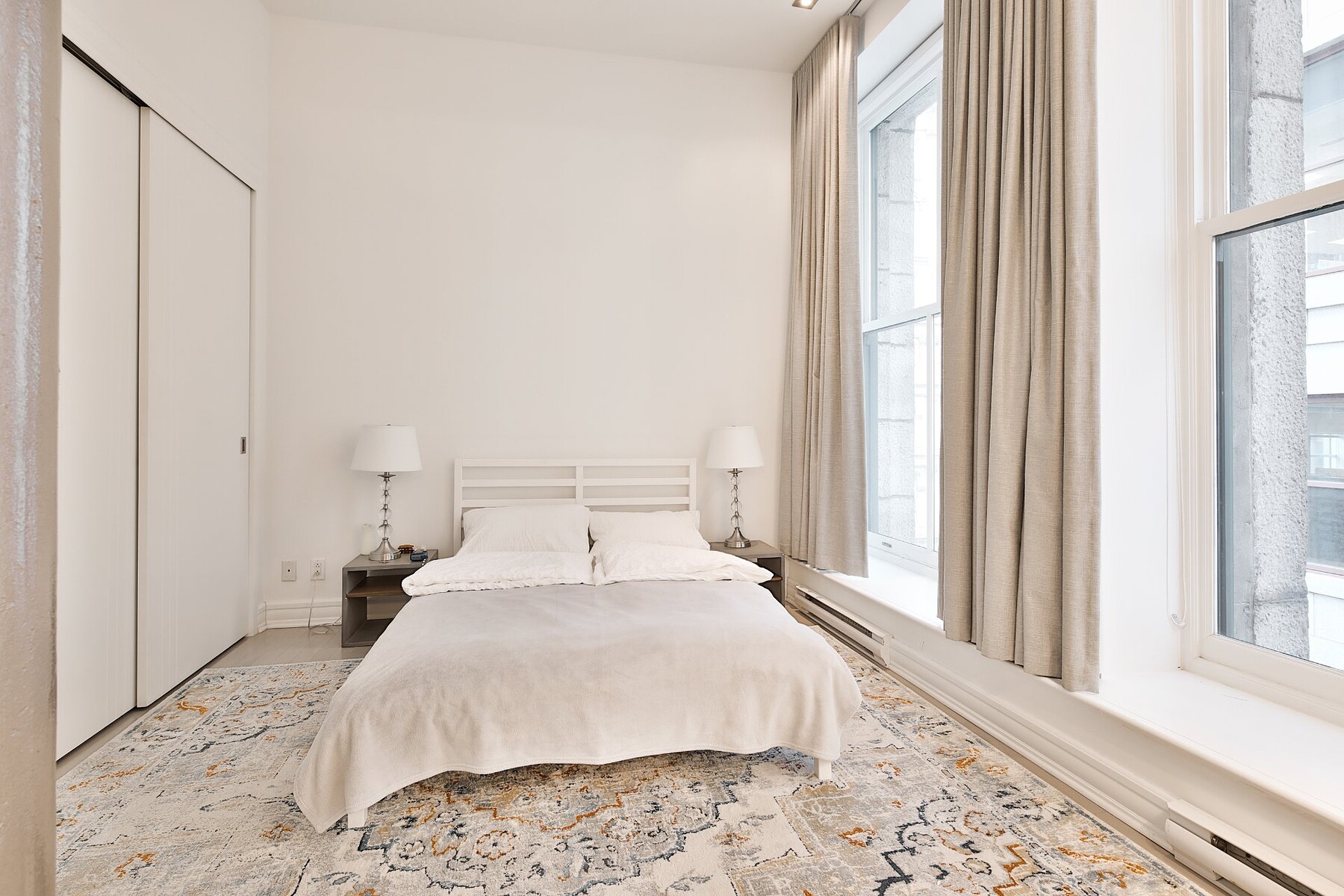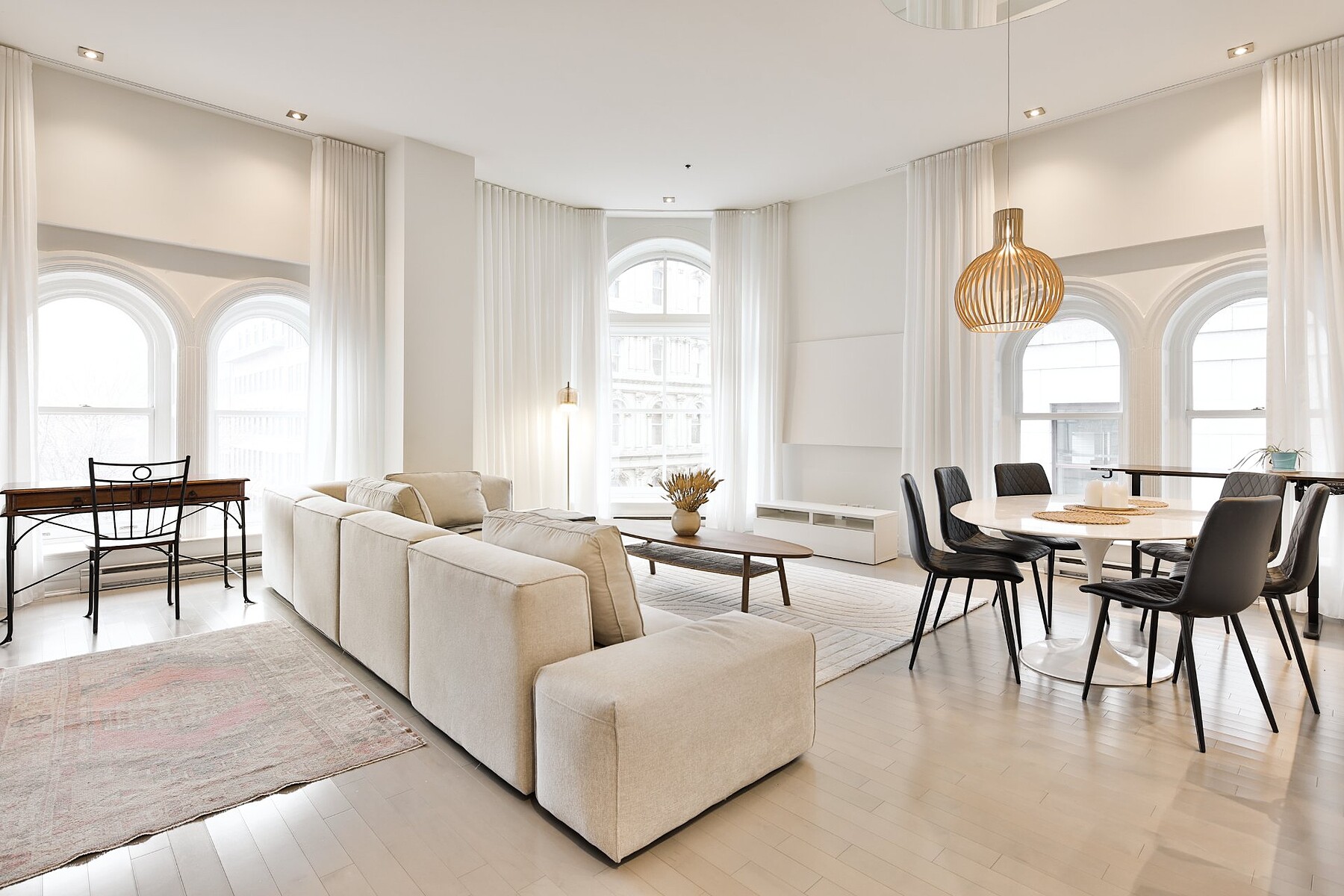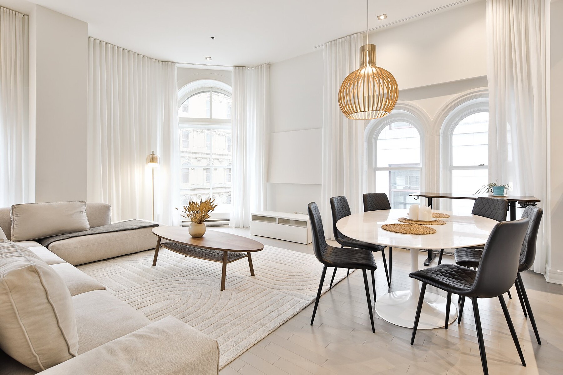 Stunning corner unit with impressive ceiling height. This fully furnished apartment, located in the heart of Old Montreal, offers two bedrooms and two full bathrooms. Features include light engineered hardwood floors, arched windows, a large black quartz countertop, and luxurious design. The unit also offers ample storage, including a private storage space in the basement. A clinic and pharmacy are located on the building's ground floor.