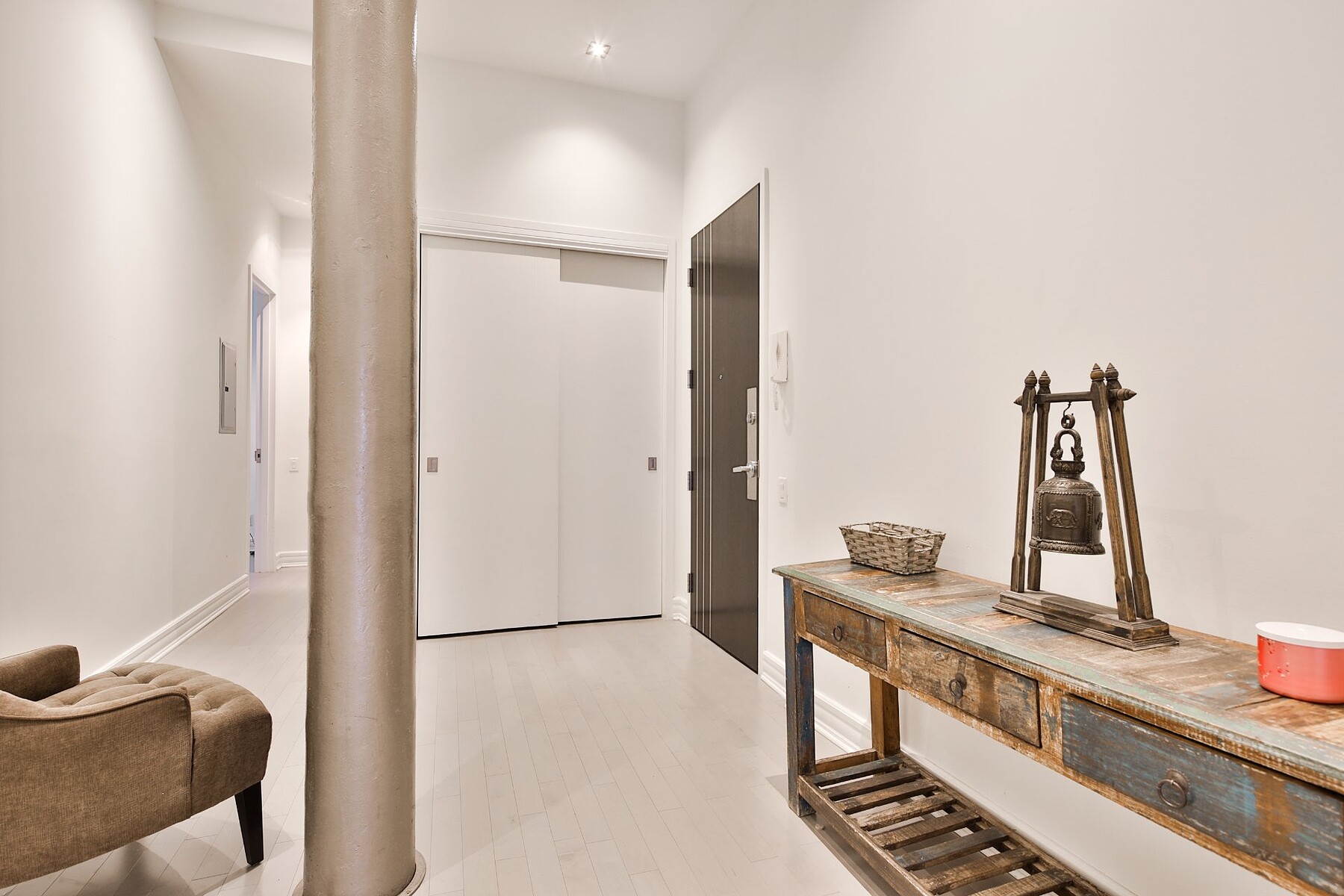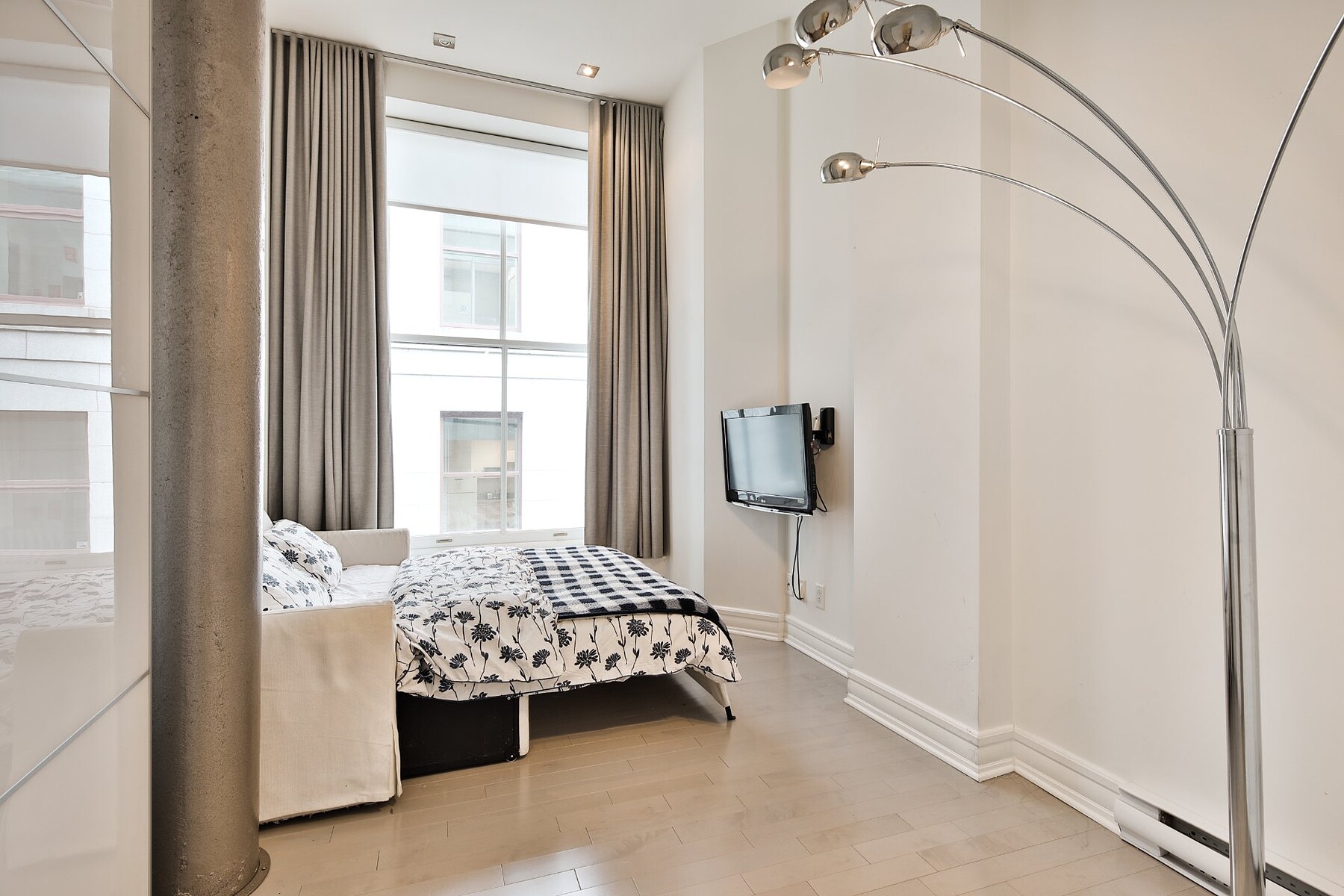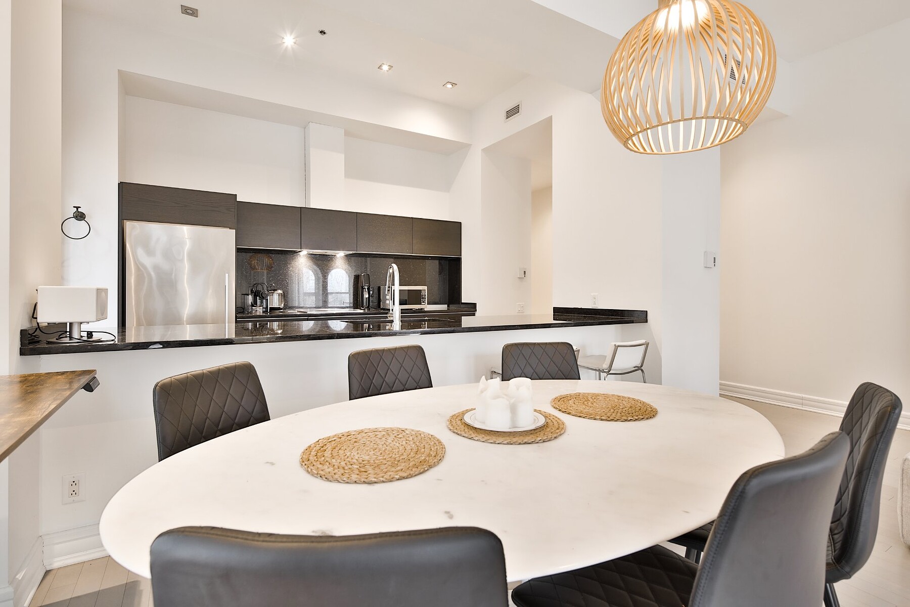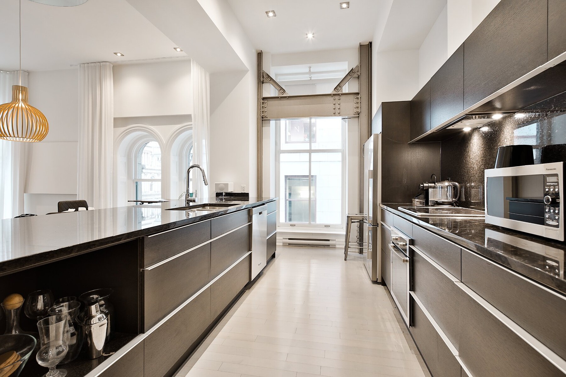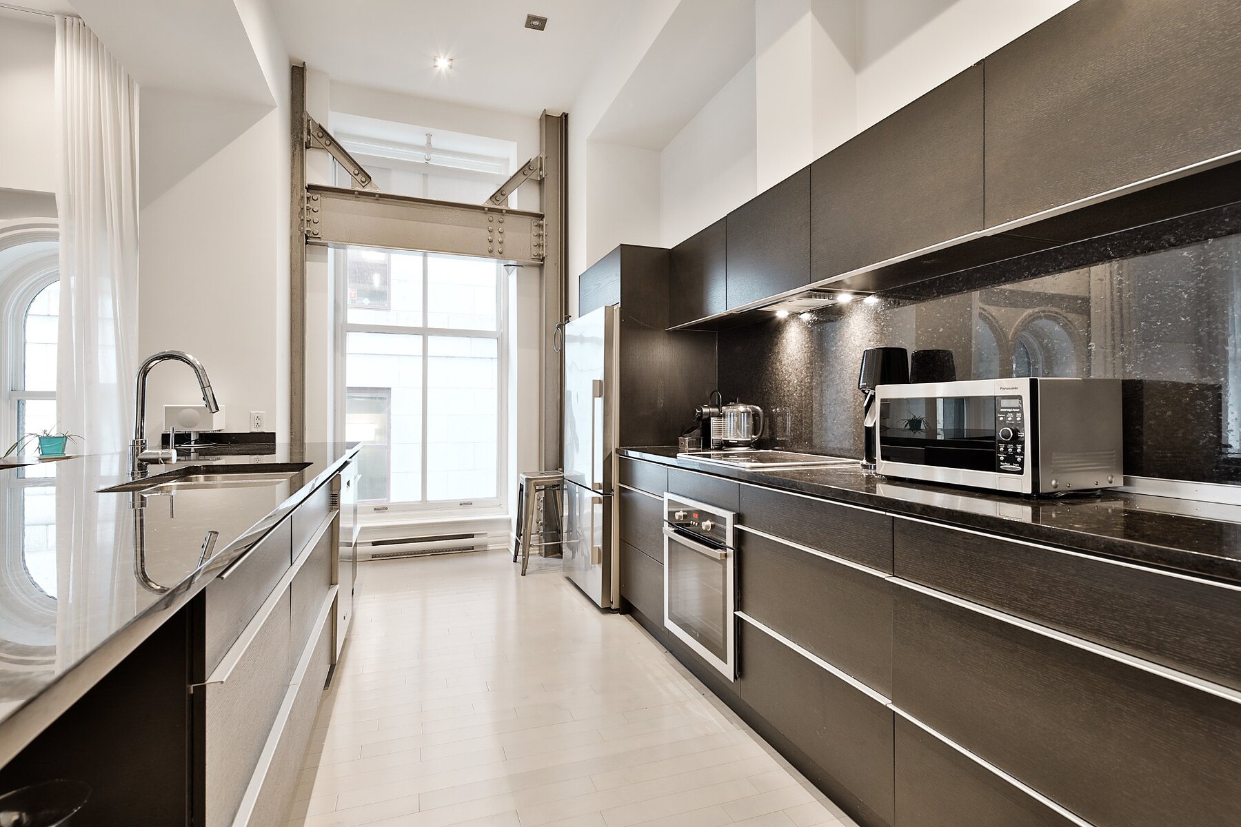 Stunning corner unit with impressive ceiling height. This fully furnished apartment, located in the heart of Old Montreal, offers two bedrooms and two full bathrooms. Features include light engineered hardwood floors, arched windows, a large black quartz countertop, and luxurious design. The unit also offers ample storage, including a private storage space in the basement. A clinic and pharmacy are located on the building's ground floor.