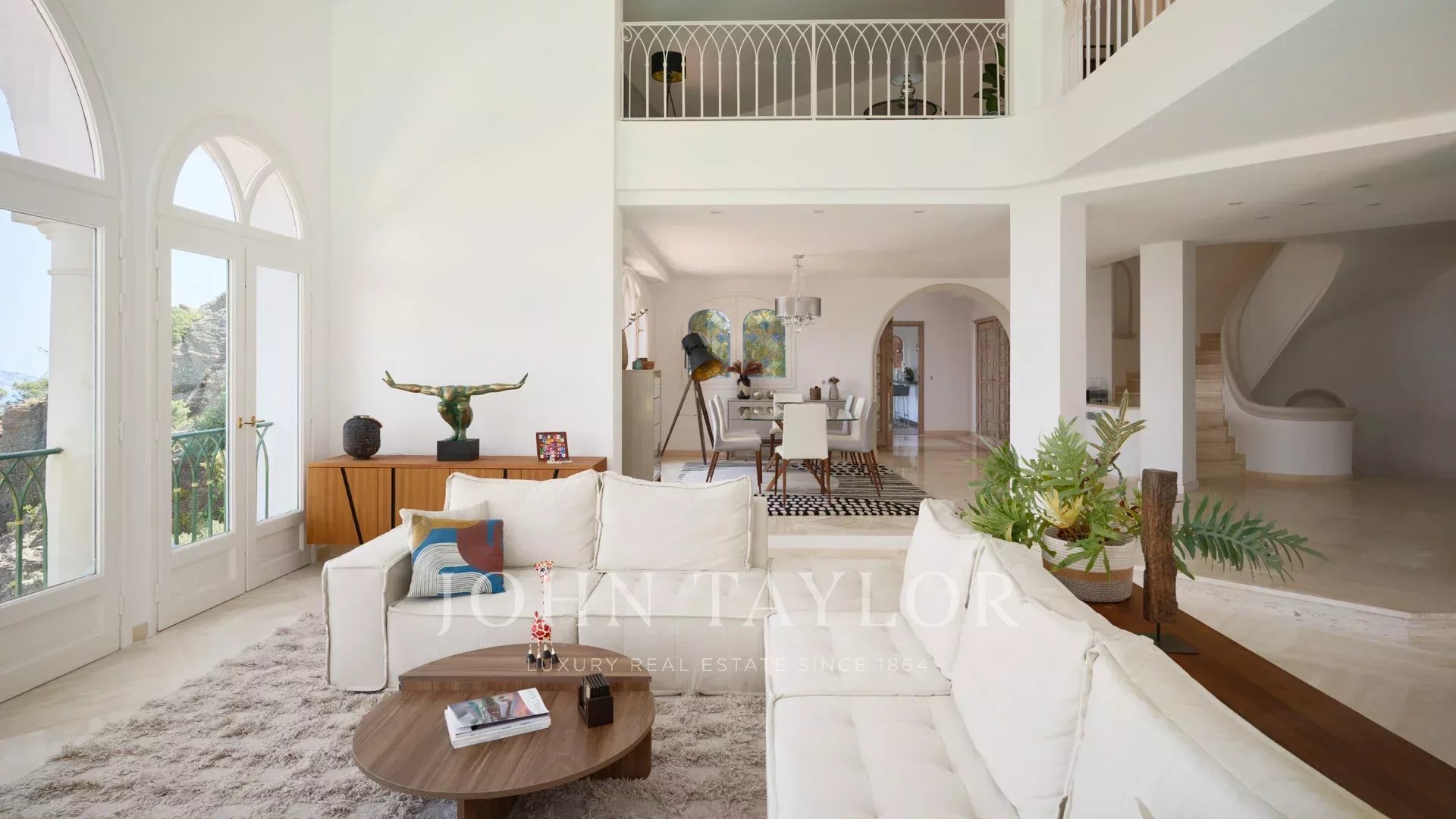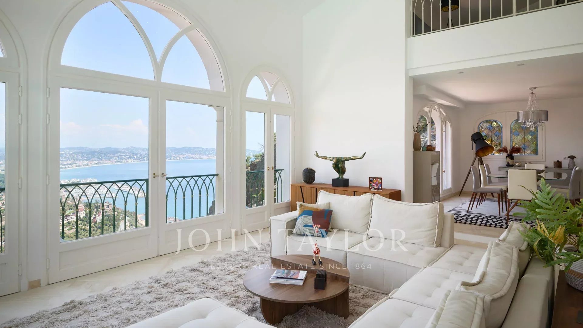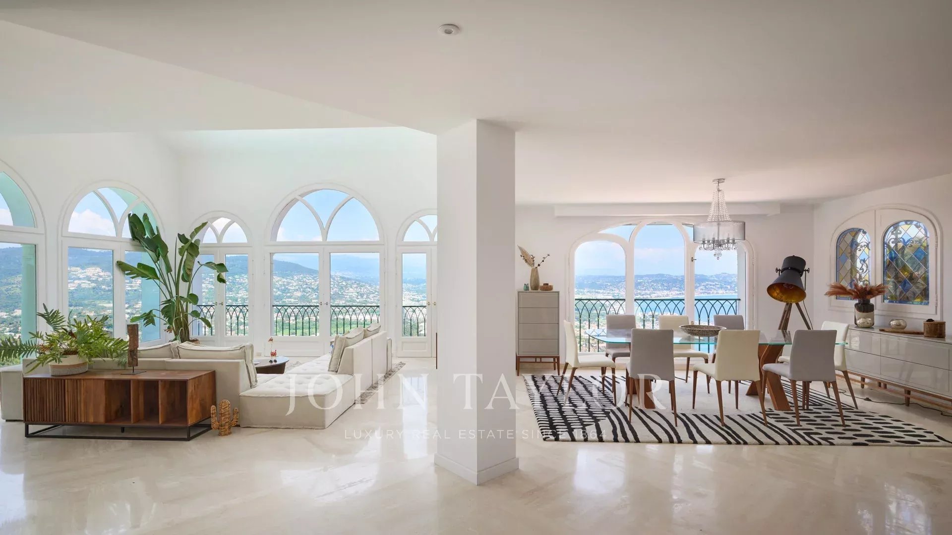 Splendid architect-designed villa set in a dominant position on a listed site, 5 minutes from the village and 15 minutes from Cannes, offering panoramic views of the sea and Cannes hinterland. With approx. 407 sqm of living space, set in 2080 sqm of wooded plot, the villa comprises : - A spacious living room opening onto the terrace and pool;- A dining room ;- A kitchen ;- Laundry room;- Four en-suite bedrooms;- An office ; - A game room.Additional features include a magnificent swimming pool, a summer kitchen and a two-car garage.