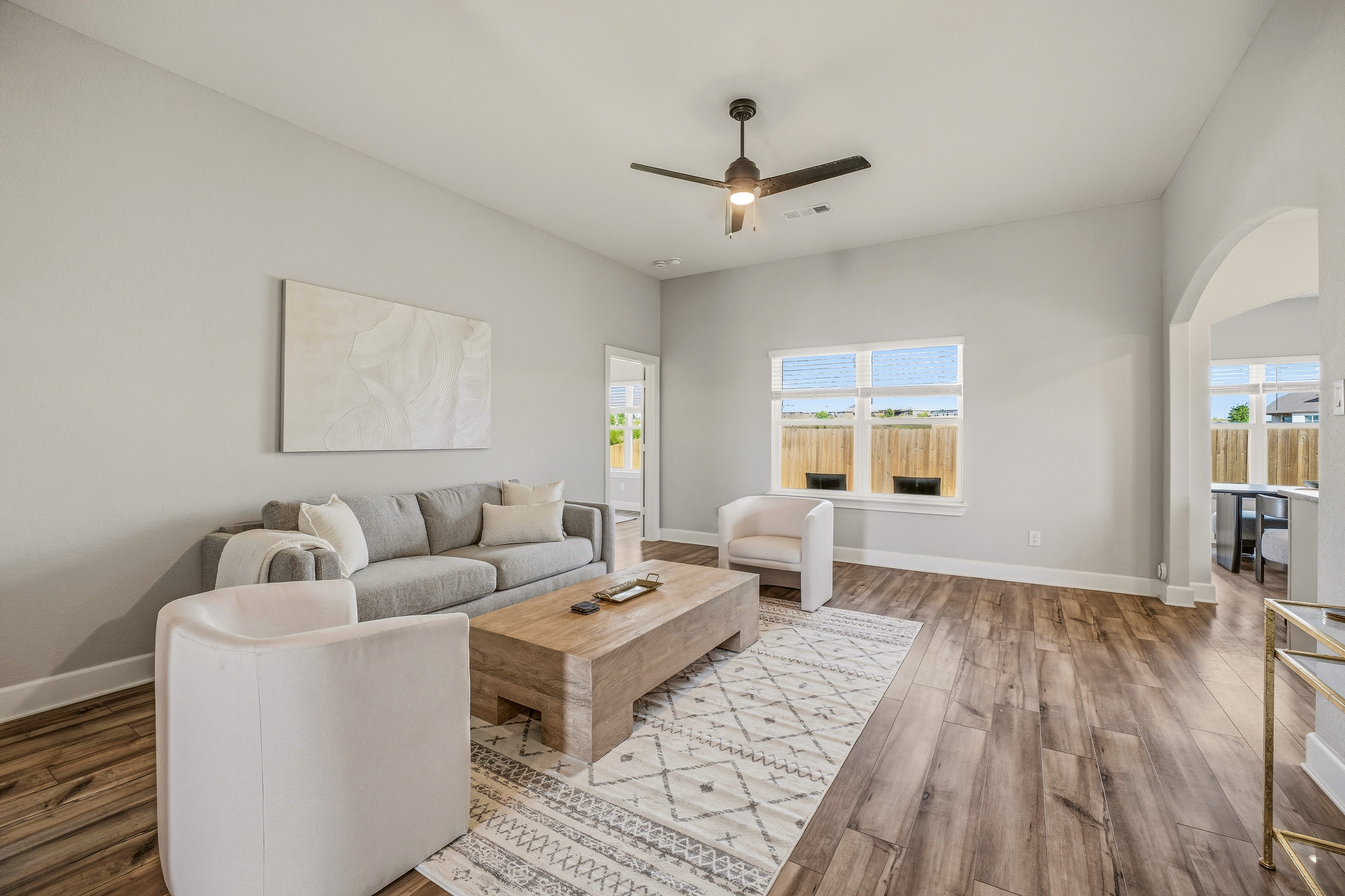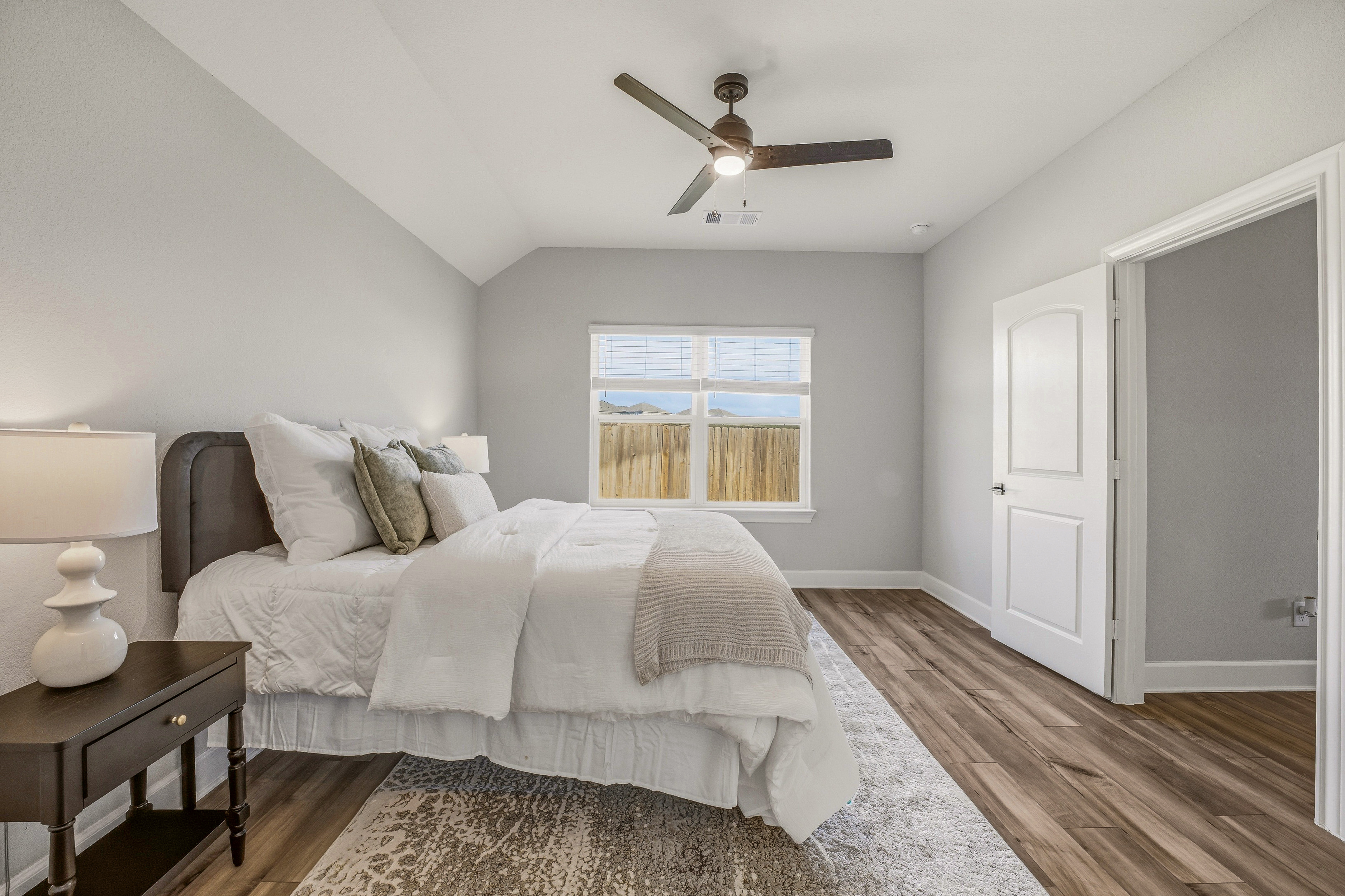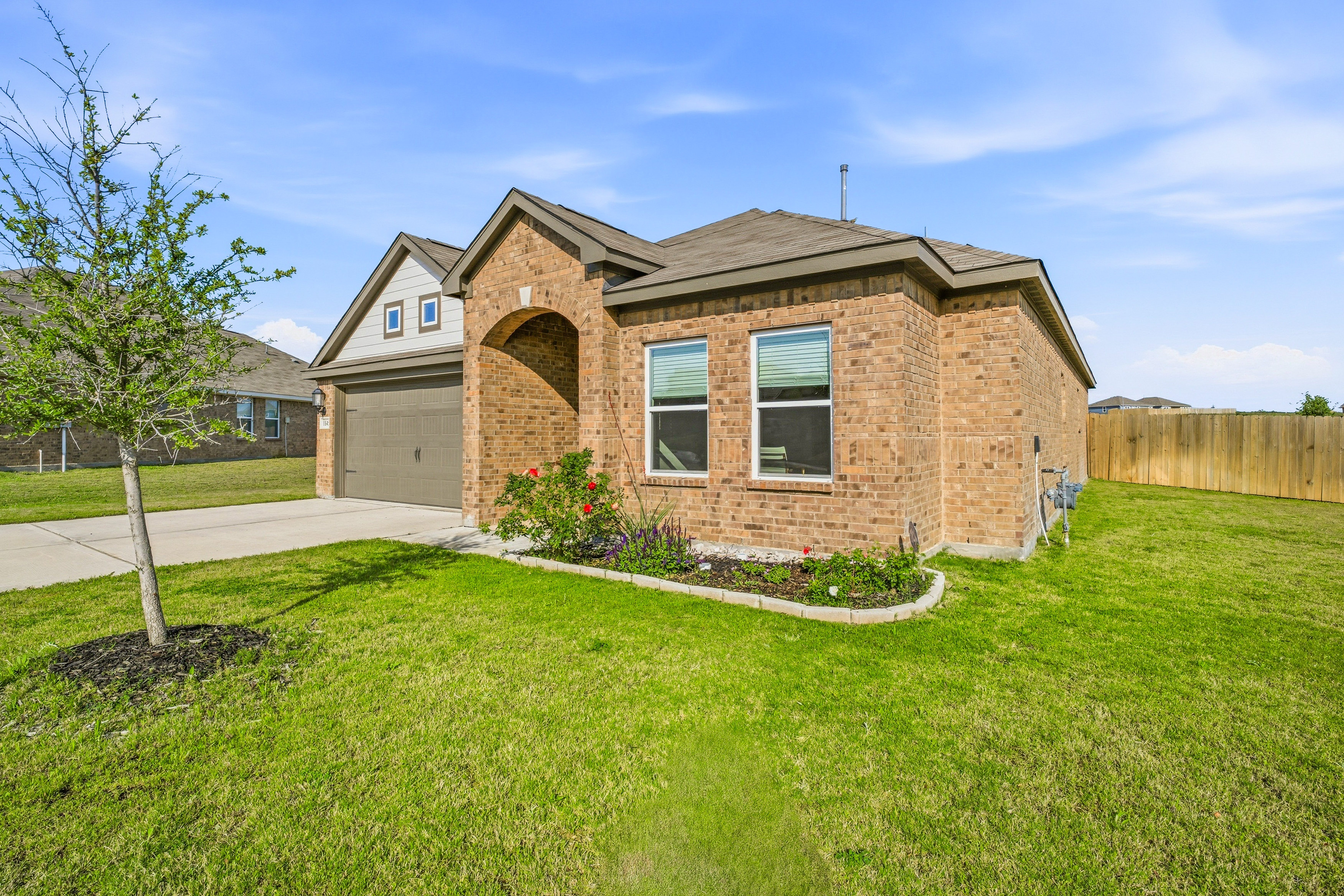 Built in 2023 and truly better than new, this beautifully maintained home offers thoughtful upgrades, energy efficiency, and one of the best lots in the neighborhood. Located on a rare oversized lot within a quiet half cul de sac, this home backs to green space with no direct rear neighbors and features a much larger yard than most nearby homes, creating privacy and room to enjoy outdoor living. A major standout is the fully paid solar panel system, to be paid off at closing, providing extremely low electric bills even during peak summer months. A Tesla charger is already installed in the garage for added convenience. Unlike nearby new construction, this home is completely move in ready with blinds on every window, upgraded ceiling fans throughout, fenced backyard, and no construction noise or traffic. Inside, natural light fills the home, complemented by high ceilings, quality carpet, luxury vinyl plank flooring, and an open concept layout. The kitchen features granite countertops, a large island, abundant cabinetry, and tons of storage. The oversized dining area and spacious living room make entertaining easy while still feeling warm and functional. The private primary suite includes a large walk in closet and upgraded stand up shower. Covered front and back patios provide great outdoor living space, while the oversized fenced backyard offers plenty of room for pets, play, or future plans. Located in one of the best parts of the neighborhood, you can walk to the community pool, parks, and amenities while enjoying quick access to major highways, shopping, dining, and Lockheed Martin. Lightly lived in by the original owner and exceptionally well maintained, this home offers more value, privacy, and savings than nearby new construction.