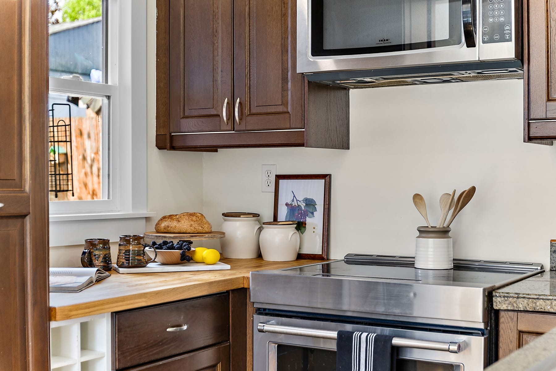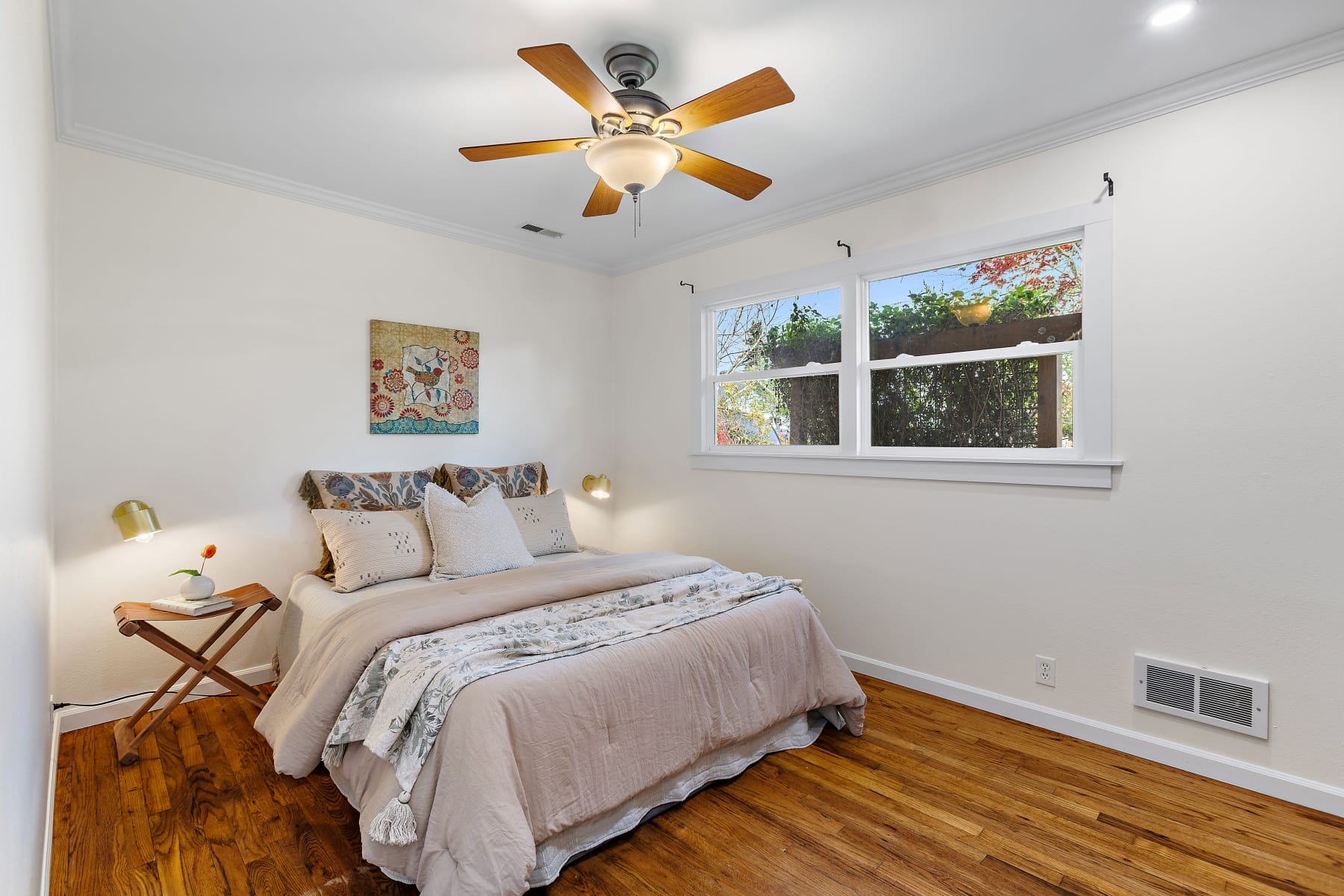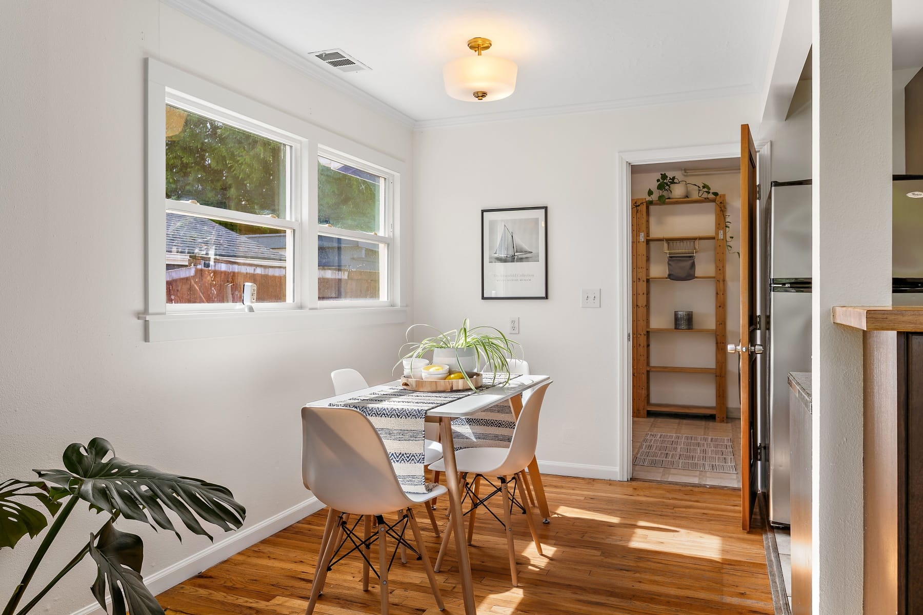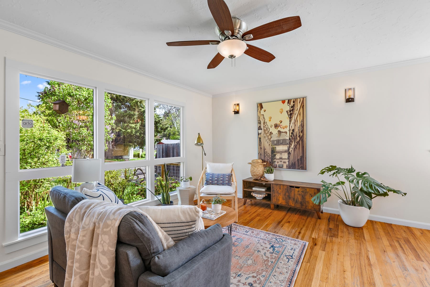 Finding the home that fits your dreams takes a bit of magic. This one's been quietly waiting, tucked in one of North Portland's beloved historical neighborhoods. Conjured, lavender-hued and garden-wrapped, an evergreen door waits at the end of a gate-framed path, eager to welcome you. This cottagecore midcentury home is surrounded by well-established, low-tend plantings from blueberry bushes, to fruit-bearing kiwi & grape vines. This kind of garden doesn't ask much of you, just your presence, a morning coffee, & your willingness to pick when ripened. Built in the 1950s & updated w/the care & intention of an artist, this midcentury dream features hardwood floors throughout, freshly painted interiors, & updated kitchen built to invoke all the bounty the gardens have to offer. Modern comforts align w/nature in this 10/10 HES home featuring tankless water heater (offering ample shower capacity ' unlimited & guilt-free), while a 3-yr-old furnace warms your winters, & solar panels deliver savings in summer (even when running the AC). With 200-amps, full home re-insulation, & EV charger at the driveway gate, this house is prepped for a life in harmony. Relaxing in the secluded & lush backyard enchants, w/ a ground-level brick patio, elevated lawn for lounging, covered patio area, & raised beds, ready for tomatoes, herbs, & other cultivations to take root. Plus, a new storage shed to keep it all tidy. Inspired? Let whimsy lead you to the professional onsite studio where a soundproof creative space awaits. Ideal to cast your creative fortunes in: a recording studio, podcast booth, film/video production, dance or art studio, or home theater. Just outside the studio ' a climbing wall lures you to expel the days' tensions.The highly walkable neighborhood includes Pier & Chimney parks, Saturday farmers' market, & an actual corner store (& 4 other major grocers) all in easy reach. It's a cozy cottage built for making magic, for creating, growing, & exploring ' & it's calling you. Home Energy Score = 10. HES Report at https://rpt.greenbuildingregistry.com/hes/OR10247613
