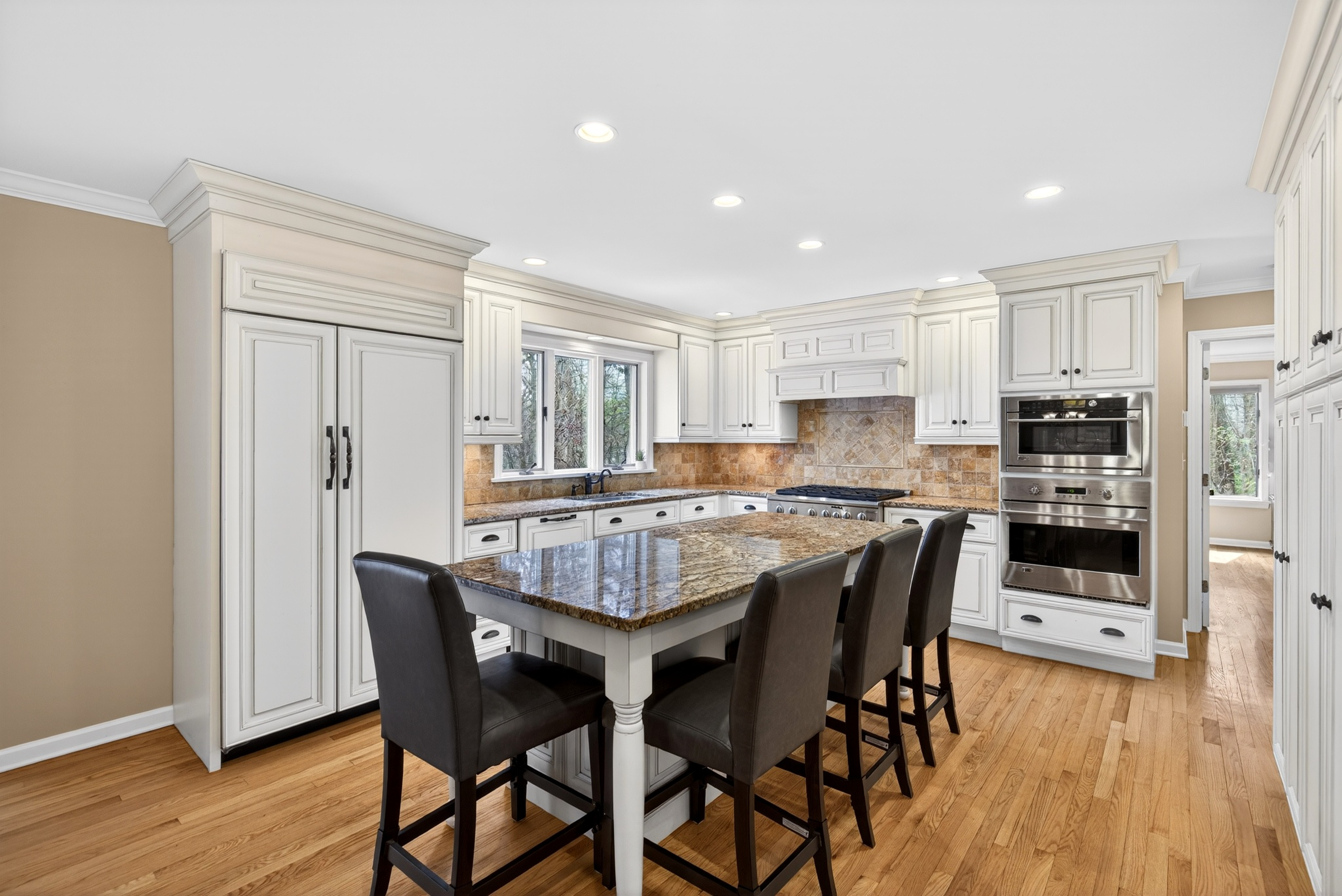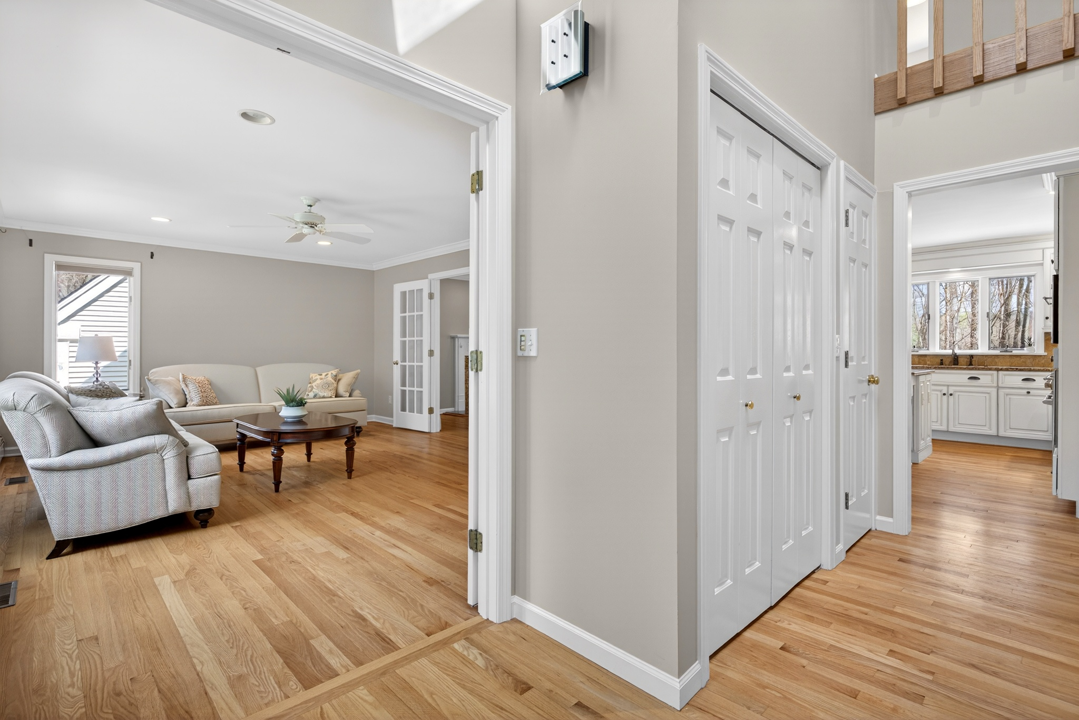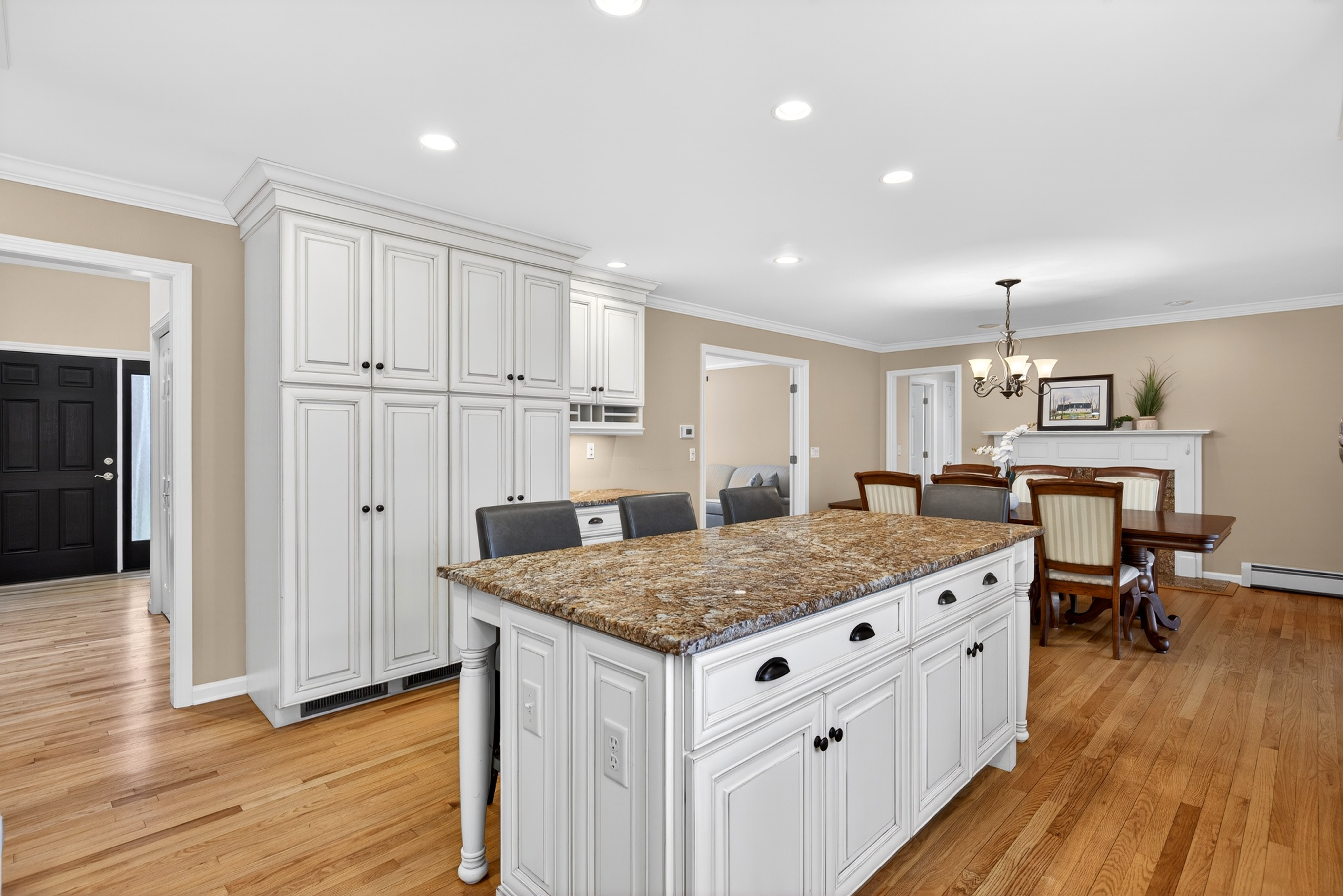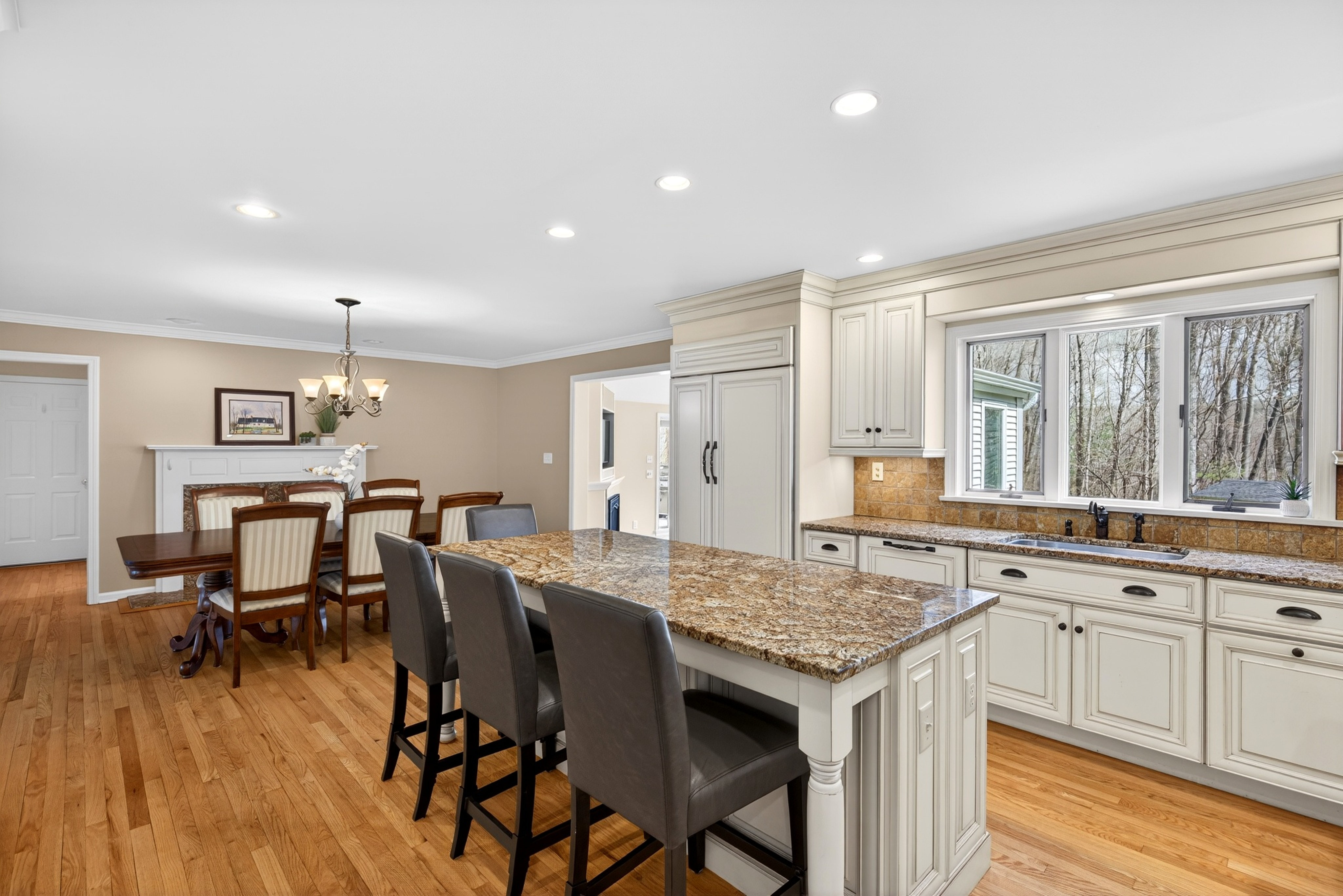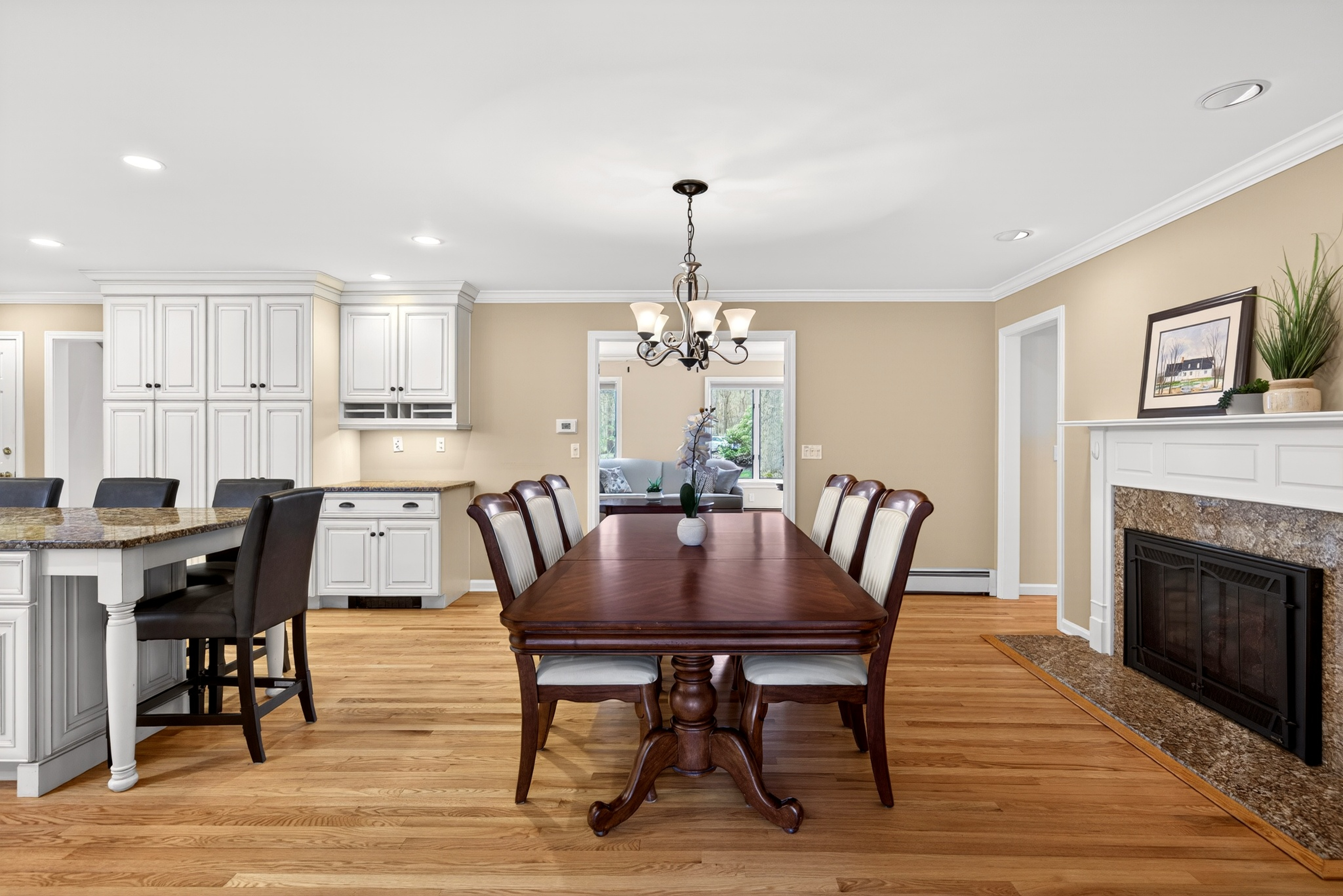 Welcome to a beautiful Cape Cod-Contemporary retreat that perfectly blends modern updates with a comfortable, inviting atmosphere. The heart of this home is the stunning chef's kitchen, featuring a large center island with seating for 4, professional gas cooking, high-end appliances, and an incredible amount of pantry and storage space. It flows naturally into the dining room, where a cozy gas fireplace makes the space perfect for hosting everything from holiday dinners to casual weeknight meals. Relax in the living room or head to the family room to enjoy a second gas fireplace and walls of windows that bring the beauty of the private backyard inside. Walk in from your 2 car garage to a mudroom space complete with half bath and dedicated laundry room. The floor plan is designed for easy living, highlighted by a main-level primary suite complete with two walk-in closets with great organization systems and a spacious bathroom featuring double sinks and a beautifully tiled shower. Upstairs, you'll find two oversized bedrooms, both with their own walk-in closets, and a full guest bath. The finished lower level offers additional living space with a bonus room, private office and half bath. There is an abundance of storage in the lower level and throughout the home. Outside, the large AZEK deck leads to a heated in-ground pool, creating a private summer oasis.