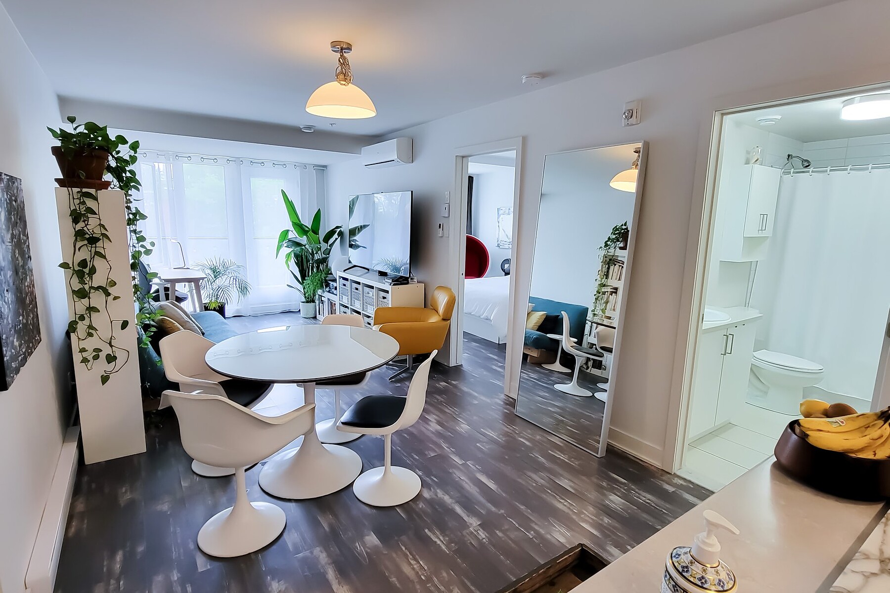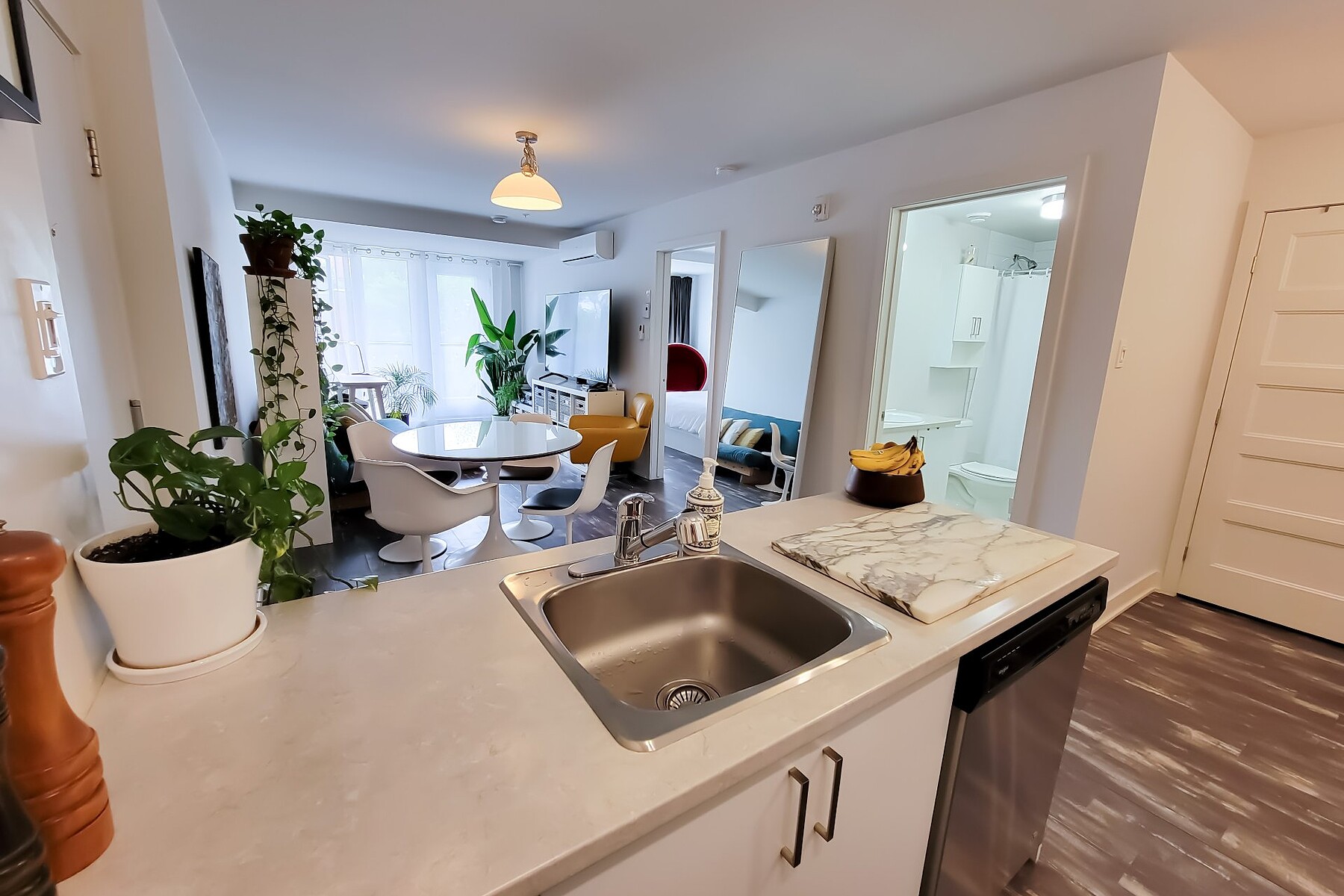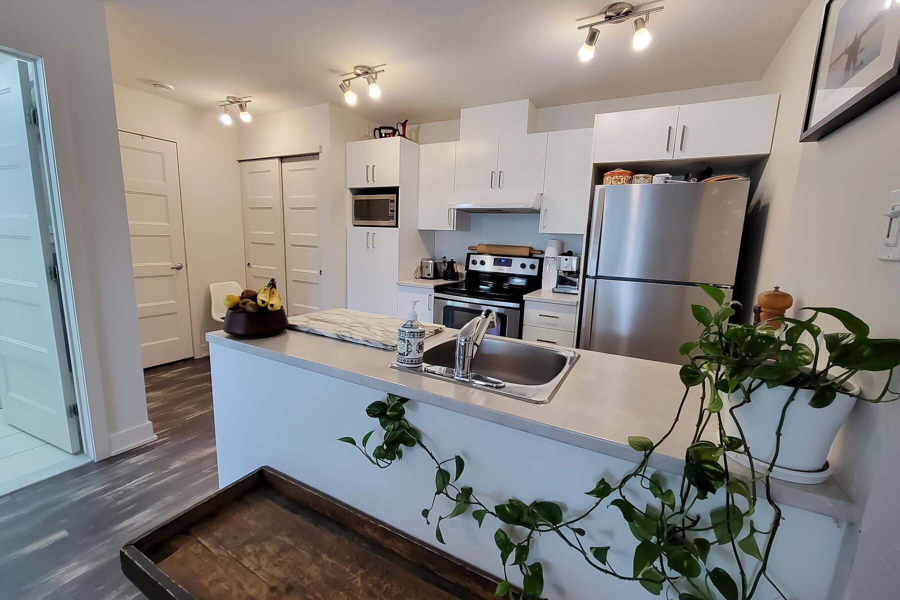 Available July 1st: Modern 3½ condo in Ville-Marie's vibrant Village. Includes 1 large bedroom, fully equipped kitchen with stainless steel appliances (fridge, oven, dishwasher, hood, microwave), bright living room with AC, in-unit washer/dryer, private balcony, and optional indoor parking. Steps from La Fontaine Park, restaurants, shops, and metro. Elevator, air exchanger, security cameras. Hot water included. Unfurnished. No pets (1 cat allowed). References & credit check required.