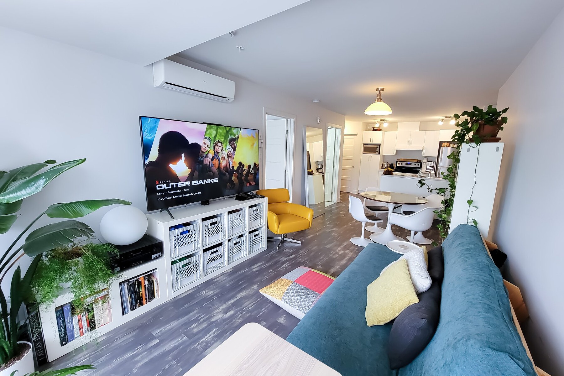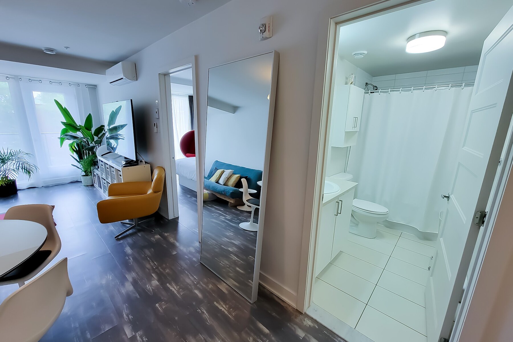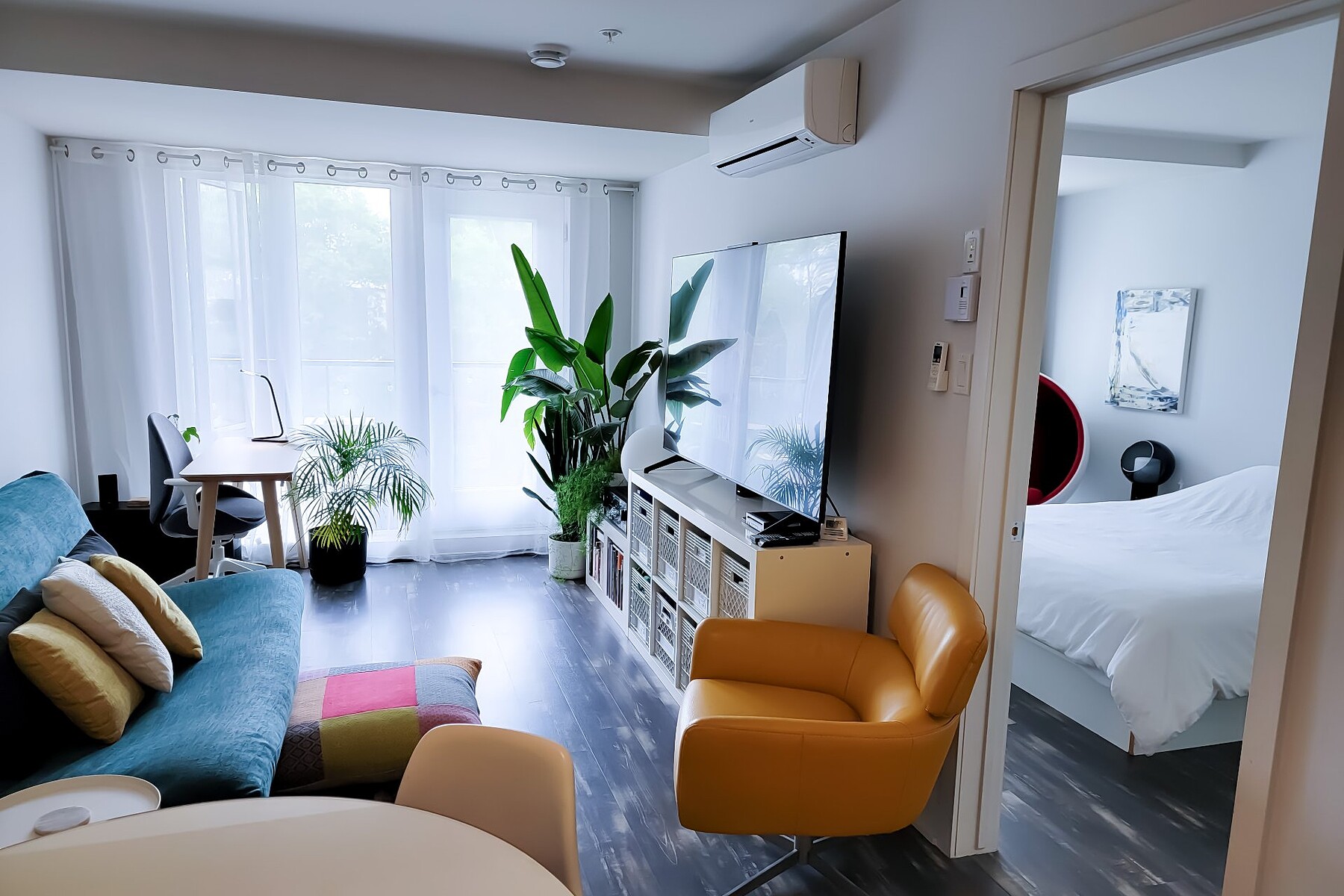 Available July 1st: Modern 3½ condo in Ville-Marie's vibrant Village. Includes 1 large bedroom, fully equipped kitchen with stainless steel appliances (fridge, oven, dishwasher, hood, microwave), bright living room with AC, in-unit washer/dryer, private balcony, and optional indoor parking. Steps from La Fontaine Park, restaurants, shops, and metro. Elevator, air exchanger, security cameras. Hot water included. Unfurnished. No pets (1 cat allowed). References & credit check required.
