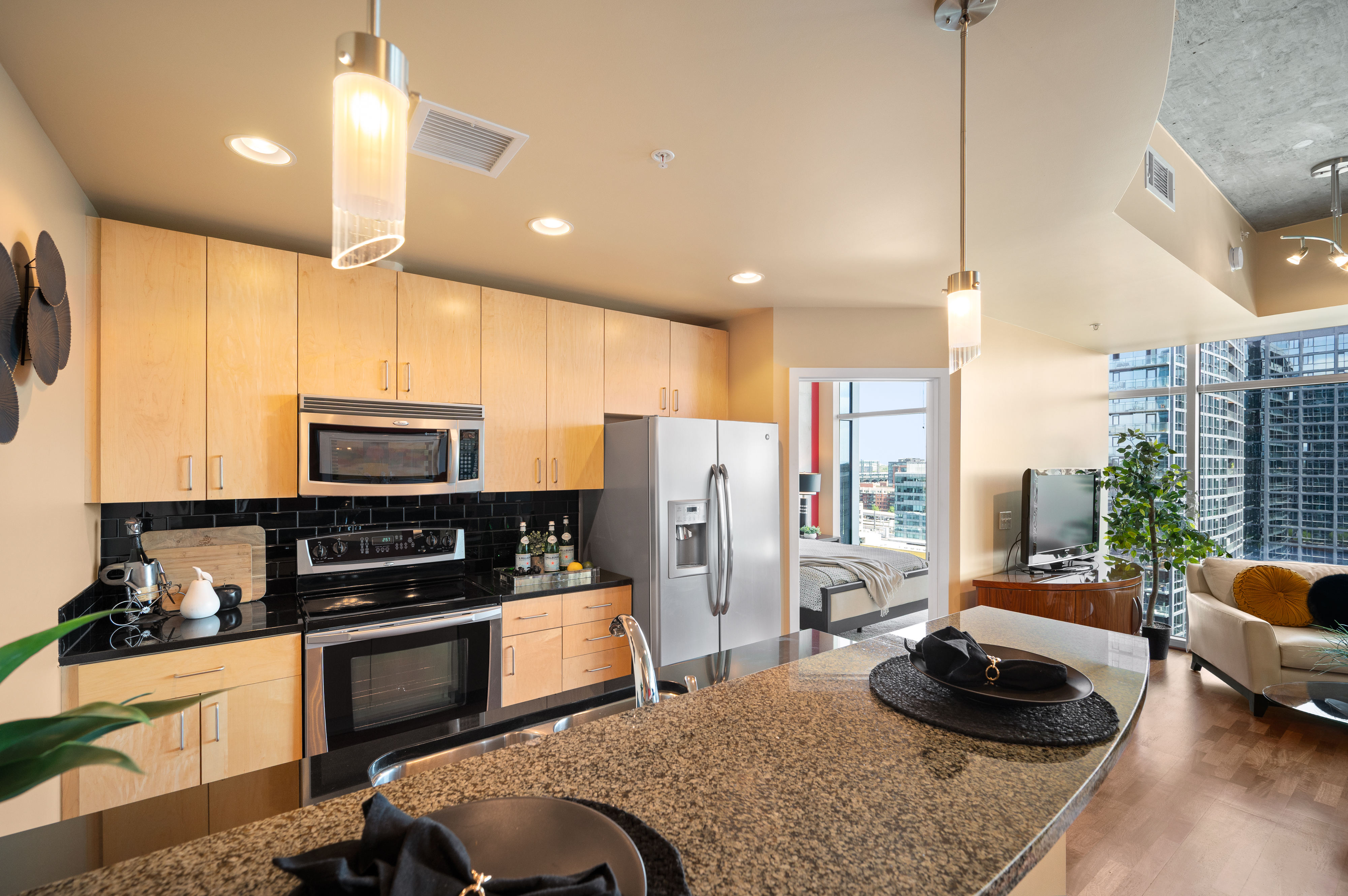 Positioned within the Glass House in Riverfront Park, this two-bedroom, two-bath residence offers thoughtful design and exceptional condition. Lightly lived in and meticulously maintained, it presents a turn-key opportunity in one of Denver’s most connected neighborhoods. Spanning 1,308 square feet, the efficient layout separates the bedrooms with an expansive living area. Floor-to-ceiling windows and 10-foot ceilings bring in abundant natural light and frame city views. The kitchen features maple cabinetry, granite countertops, stainless steel appliances, and wood flooring throughout the main living spaces. The primary suite includes mountain views, a walk-in closet, and a rare five-piece bath. Additional highlights include two parking spaces—one just off the lobby—and two adjacent storage units with the option to combine. Residents enjoy full-service amenities including 24-hour front desk, pool, outdoor grills, club room, and access to the Riverfront Athletic Club—all within walking distance to dining, shopping, trails, and entertainment.