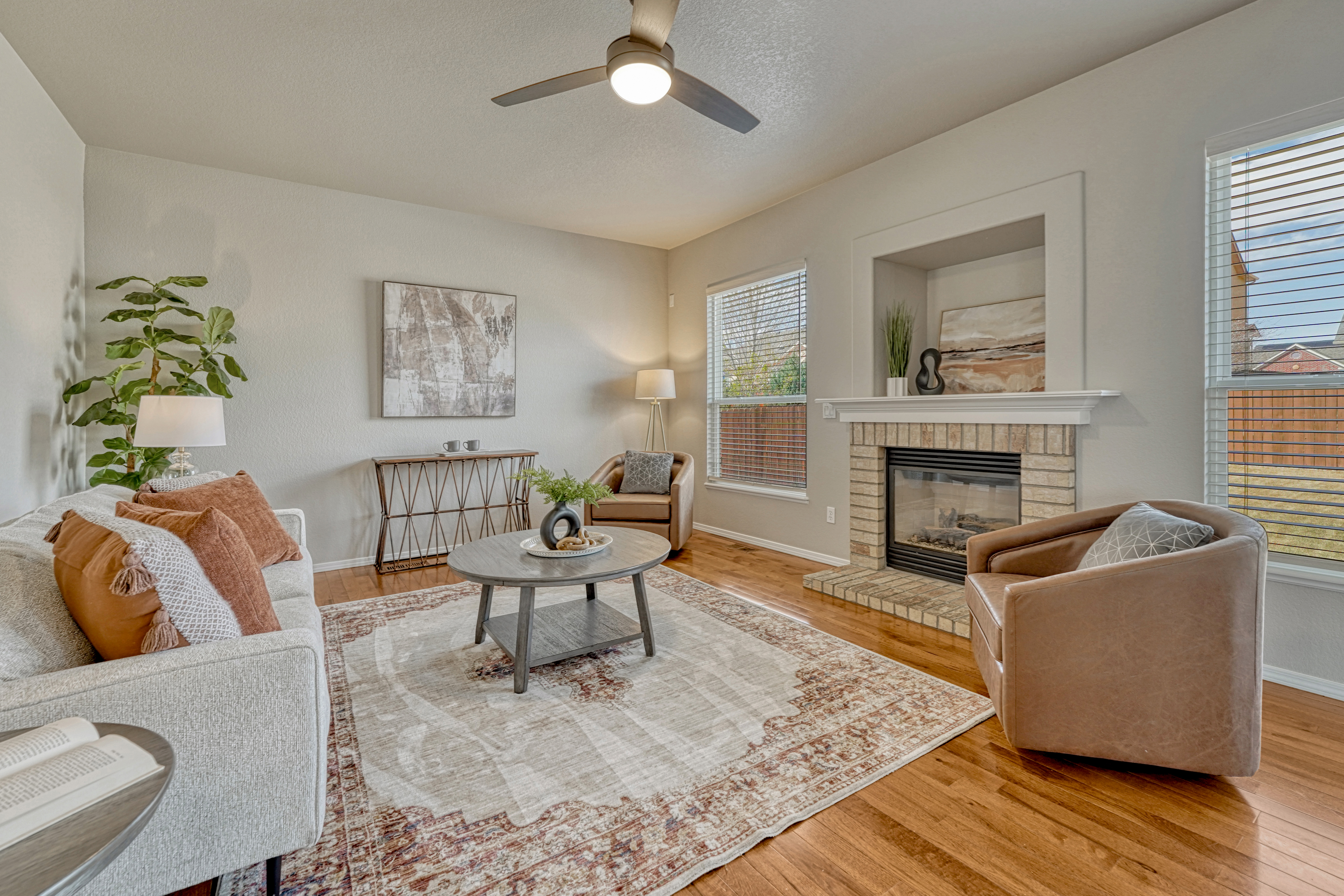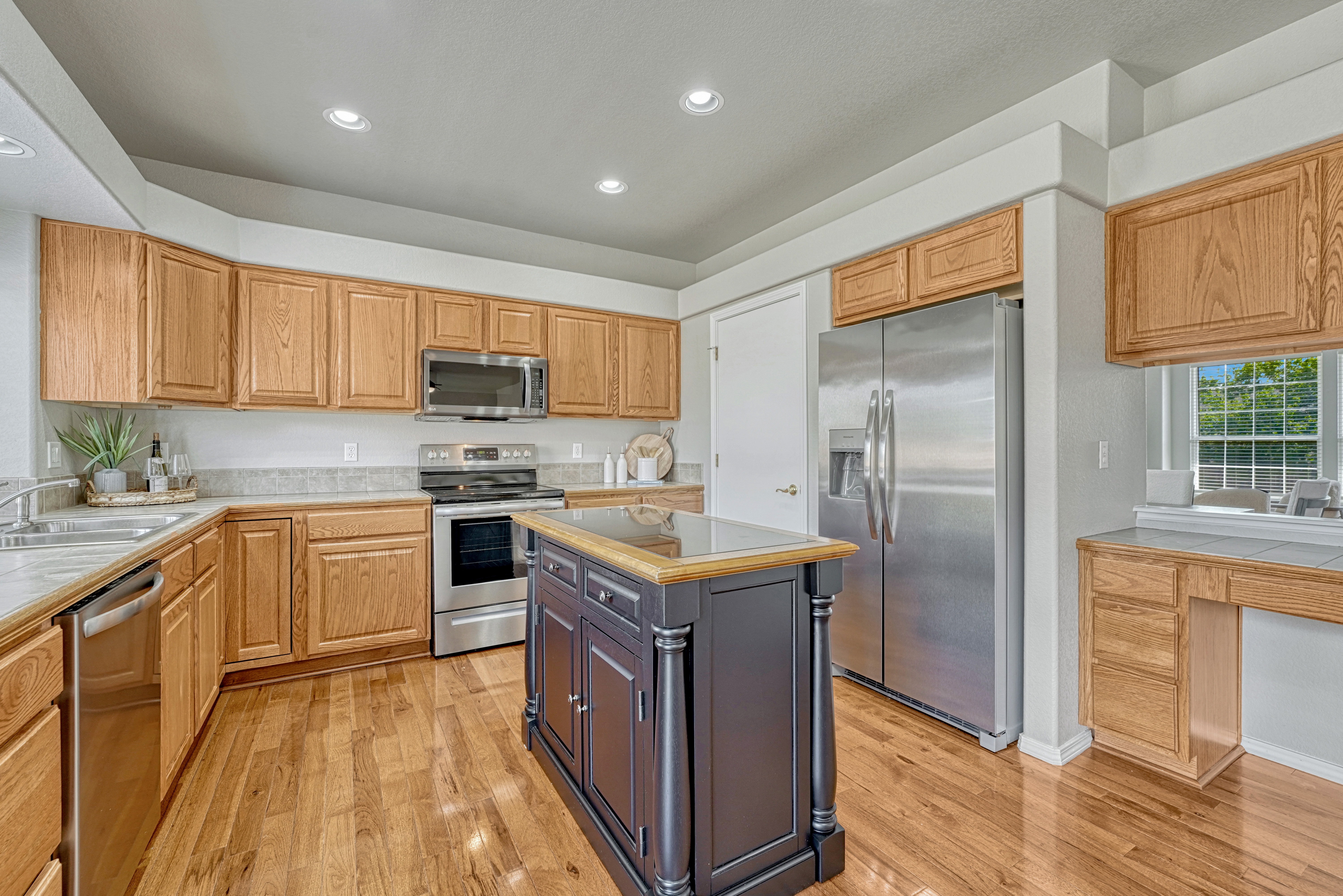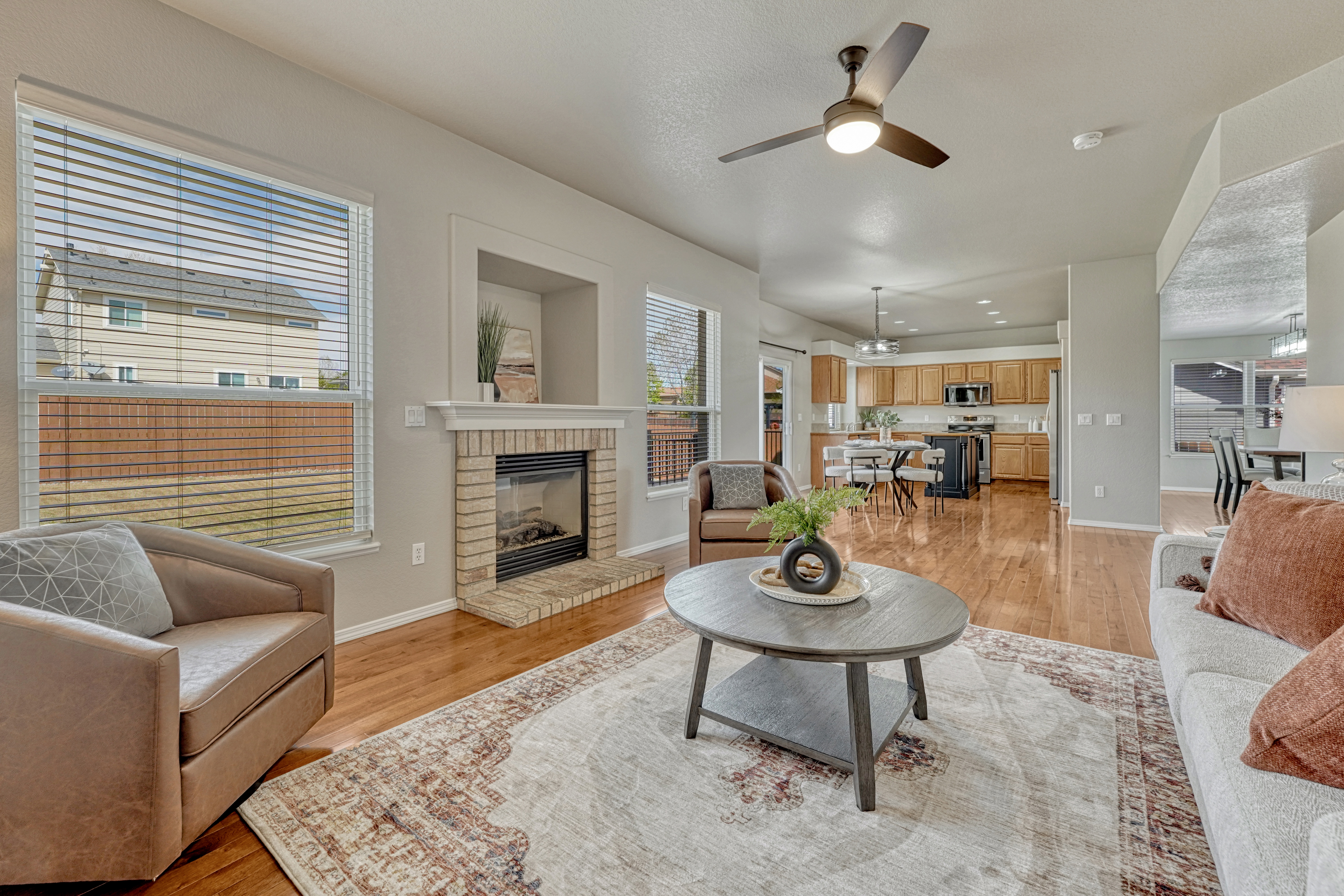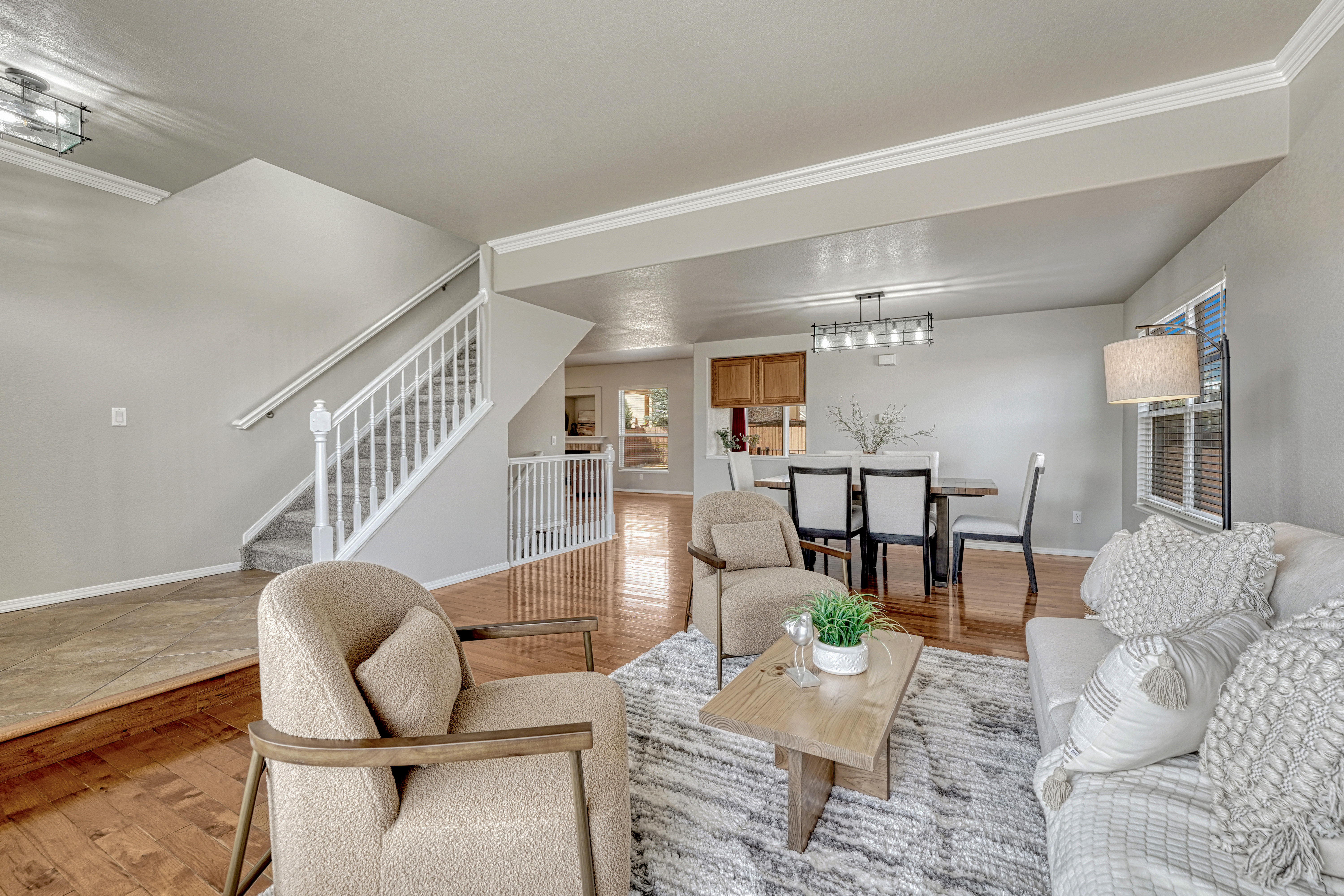 This move in ready home reflects thoughtful upgrades throughout. With five bedrooms, three and a half bathrooms, and a two car garage, the location offers convenient access to parks, schools, shopping, and both Peterson and Schriever Space Force Bases. Natural light fills the main level, highlighting hardwood floors, fresh interior paint, and updated fixtures with no carpet on the main. The kitchen features a newly added island, stainless steel appliances installed in 2023, and cabinetry that flows into the dining and living areas, creating a layout that works well for everyday living and gatherings. Upstairs offers newer carpet, three spacious bedrooms, and a private primary suite designed for comfort. The basement offers a large, ready for anything recreation space with a large bedroom and full bathroom. Outdoor living extends to a Trex deck added in 2024, overlooking a fenced yard with refreshed landscaping. A Class IV shingle roof installed in 2023 adds lasting durability.