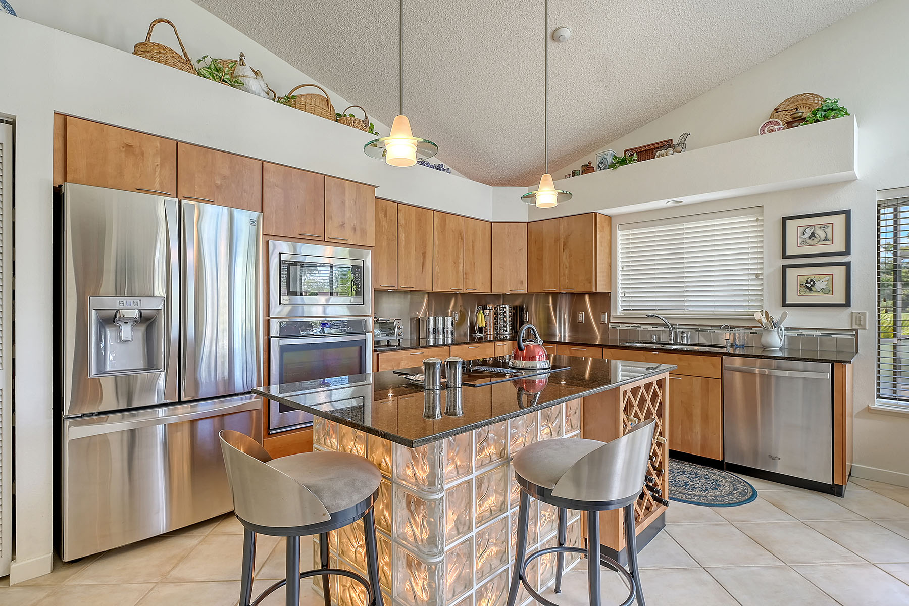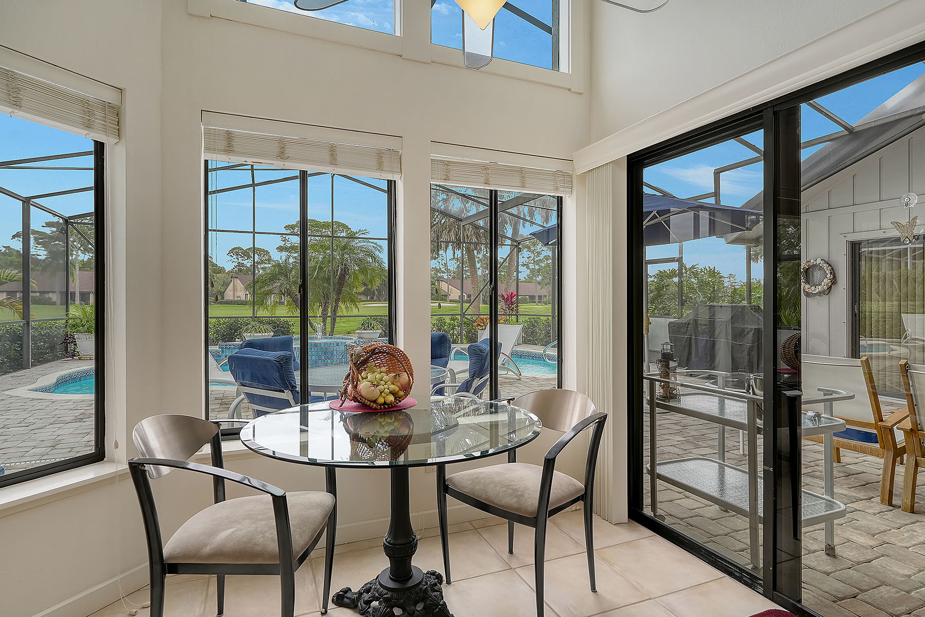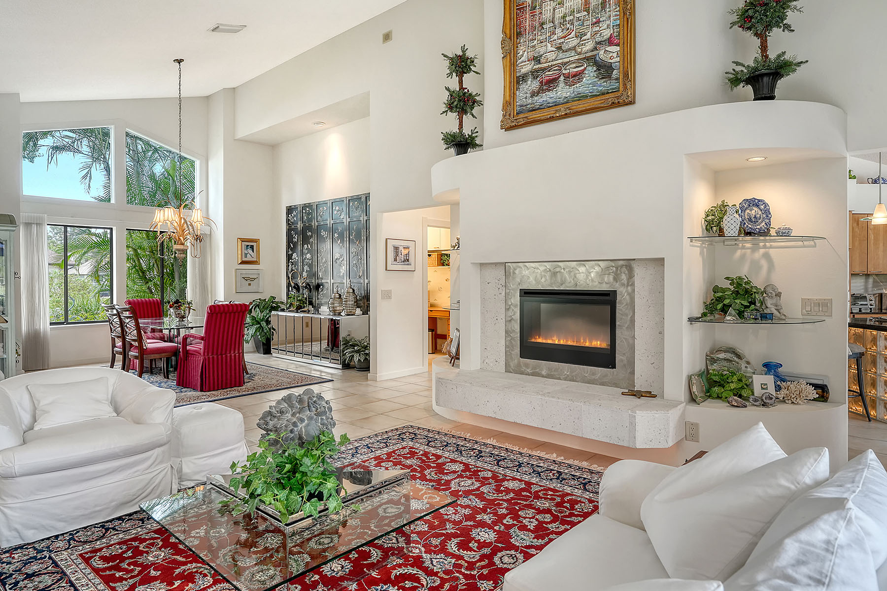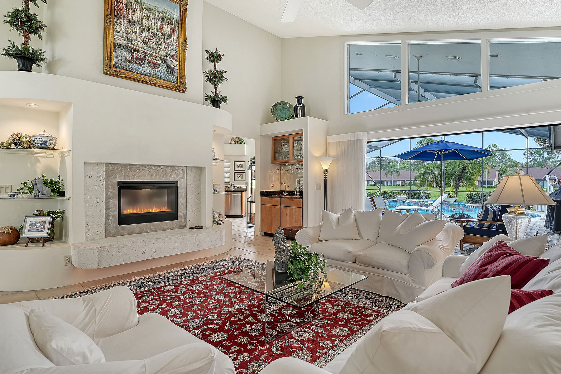Tucked within the private enclave of Misty Oaks in Palm Air, this Don Traurig home with unique double entrance doors is a beautiful architectural creation. Set on a third of an acre with sweeping views of the 5th fairway on the redesigned lakes course of Palm Aire Country Club, this 2,656-square-foot, three-bedroom, two-bath with office/den home blends modern sophistication with serene, Florida resort-style living. This stunning home embodies Florida elegance, defined by earthy hues, layered textures and refined finishes. The thoughtful design is evident from the moment you arrive, beginning with the unique double entrance doors, 16-inch porcelain tile flooring throughout, and the 15-foot vaulted ceilings. The light-filled great room is anchored by a stunning contemporary fireplace and features sliding glass doors topped with transom windows, seamlessly connecting the indoors to the outdoors. Extra-large windows with upper transom windows in the dining area add to the room's sleek, sophisticated design. Across the room, the stylish custom wet bar with mounted shelving and wine glass rack are ideal for effortless entertaining. The kitchen is a showstopper with granite countertops, solid maple cabinets and stainless steel backsplashes, stainless steel appliances, a large pantry, custom kitchen island with down draft cooktop, hidden storage, wine rack, back-lit glass block design and plenty of windows looking over the pool and fairway. The kitchen dining area features sliding doors for full integration with the lanai and pool area. The primary suite is a luxurious private retreat, complete with walk-in closet, 12-foot lighted wall closet with storage above, and a separate office with contemporary desk and cabinetry. The custom built and a spa-inspired bath with travertine marble tile, granite countertops, solid maple cabinets, a frameless shower door and a sunken whirlpool tub is a relaxing oasis. Each of the two guest bedrooms includes large walk-in closets, offering privacy and comfort for family or guests. The beautifully designed second bath includes stunning custom marble countertop, vessel sink, with designer mirror. Go outside to your private resort, an expansive screened lanai featuring covered and open-air seating and dining areas, a freeform heated pool with waterfalls and fountain. A separate inground heated spa that seats six, all set against the tranquil backdrop of the 5th fairway. Additional highlights include a spacious laundry room with custom cabinetry, an oversized two-car garage with golf cart bay, new roof and skylights 2022, clear Lexan Hurricane panels for all windows, Hunter Douglas Luminettes window treatments, stereo ceiling speakers in great room, primary bedroom and lanai, extensive attic storage, built-in storage in garage, and an air-conditioned workroom. In Palm Aire Community, Misty Oaks is a residential subdivision of single-family homes in the southeast corner of Palm Aire, with two lakes and the 5th, 6th and 7th fairways of the Palm Aire Country Club's Lake Course forming most of the perimeter. Palm Aire Country Club is a full-service country club that is collectively owned by its members and offers a wide variety of membership opportunities. As a member, you have an equity stake in the club and can enjoy year-round golf, tennis, pickleball, padel, water aerobics, and various social activities. Membership is not required. Come and enjoy paradise.
