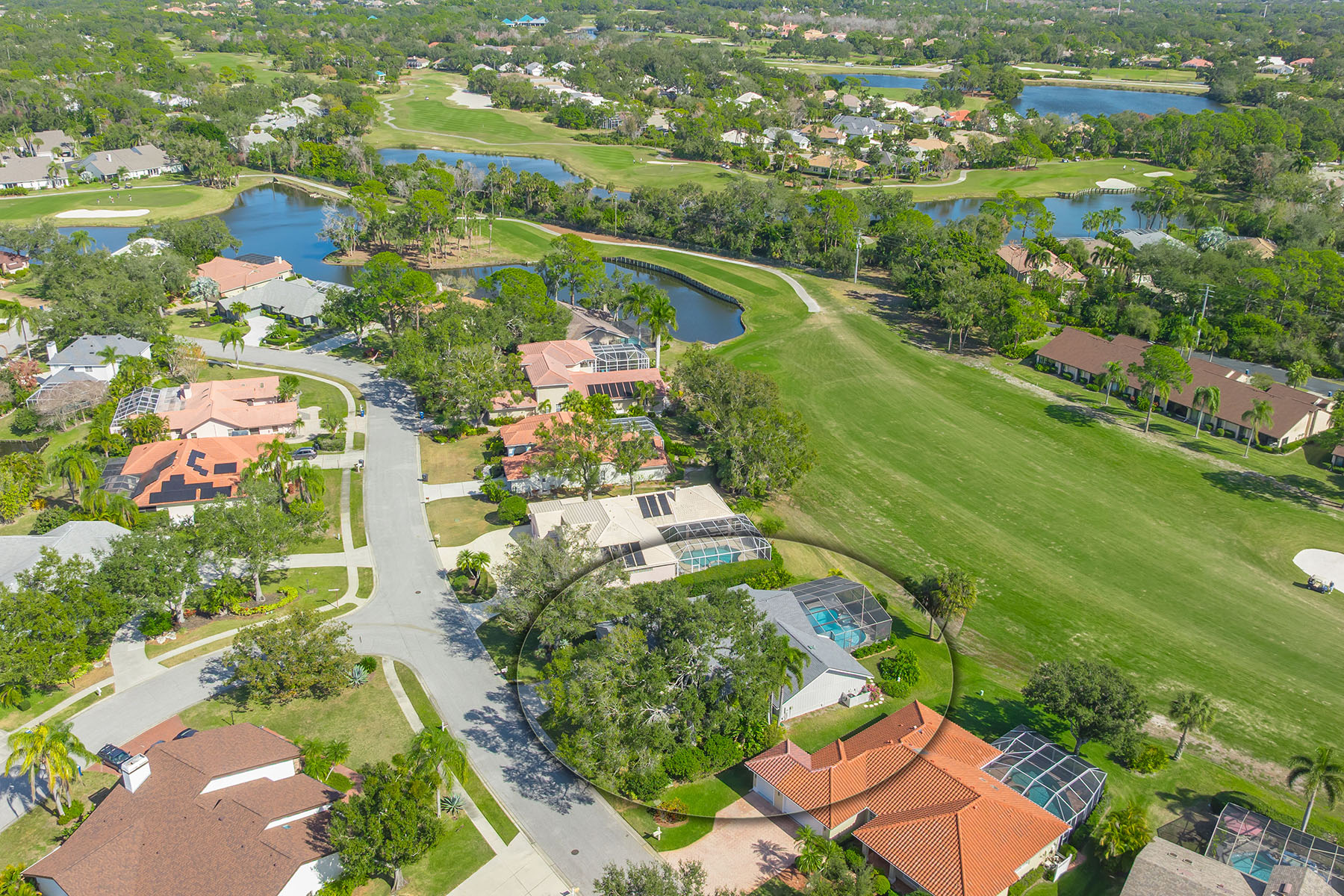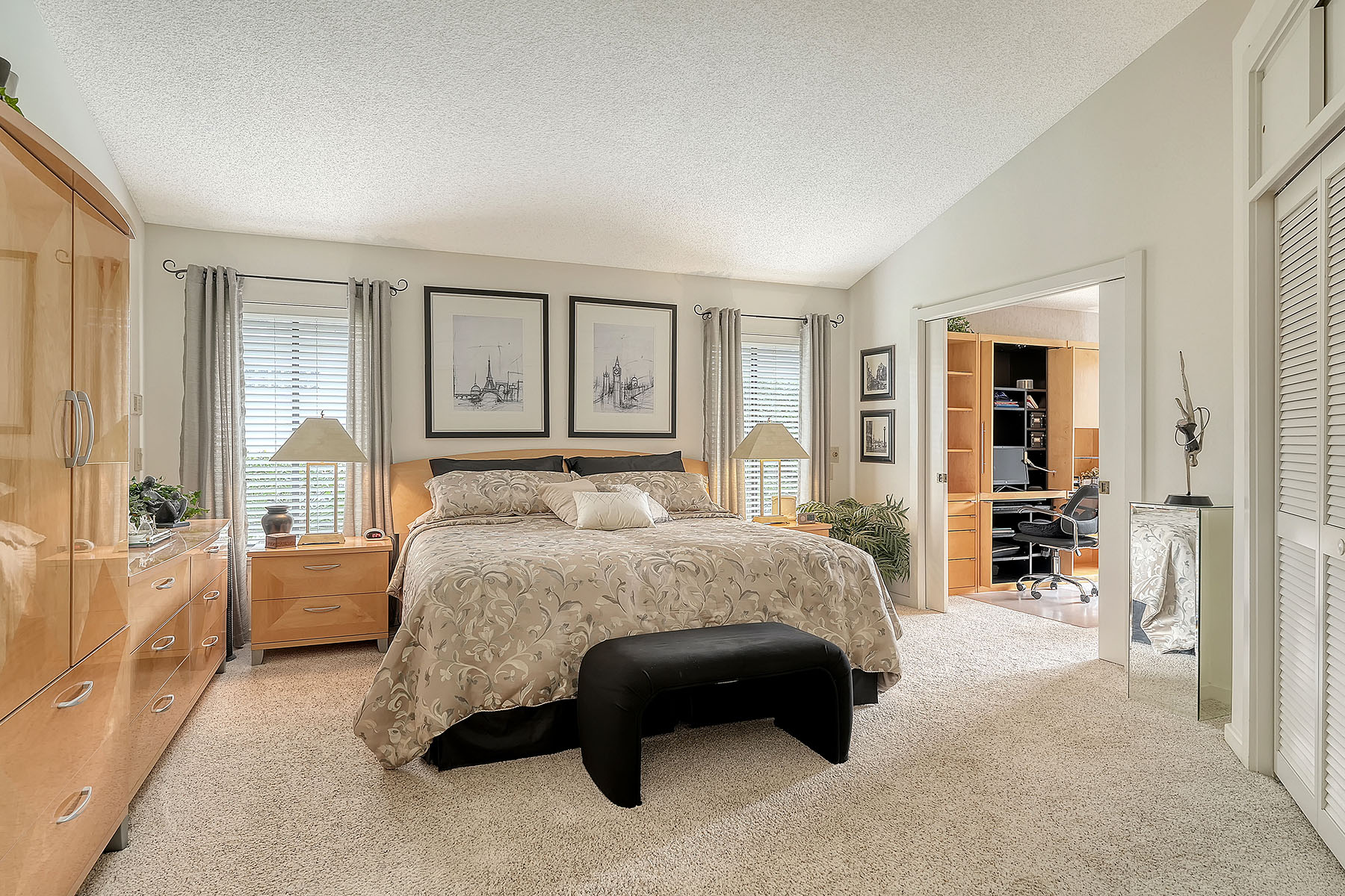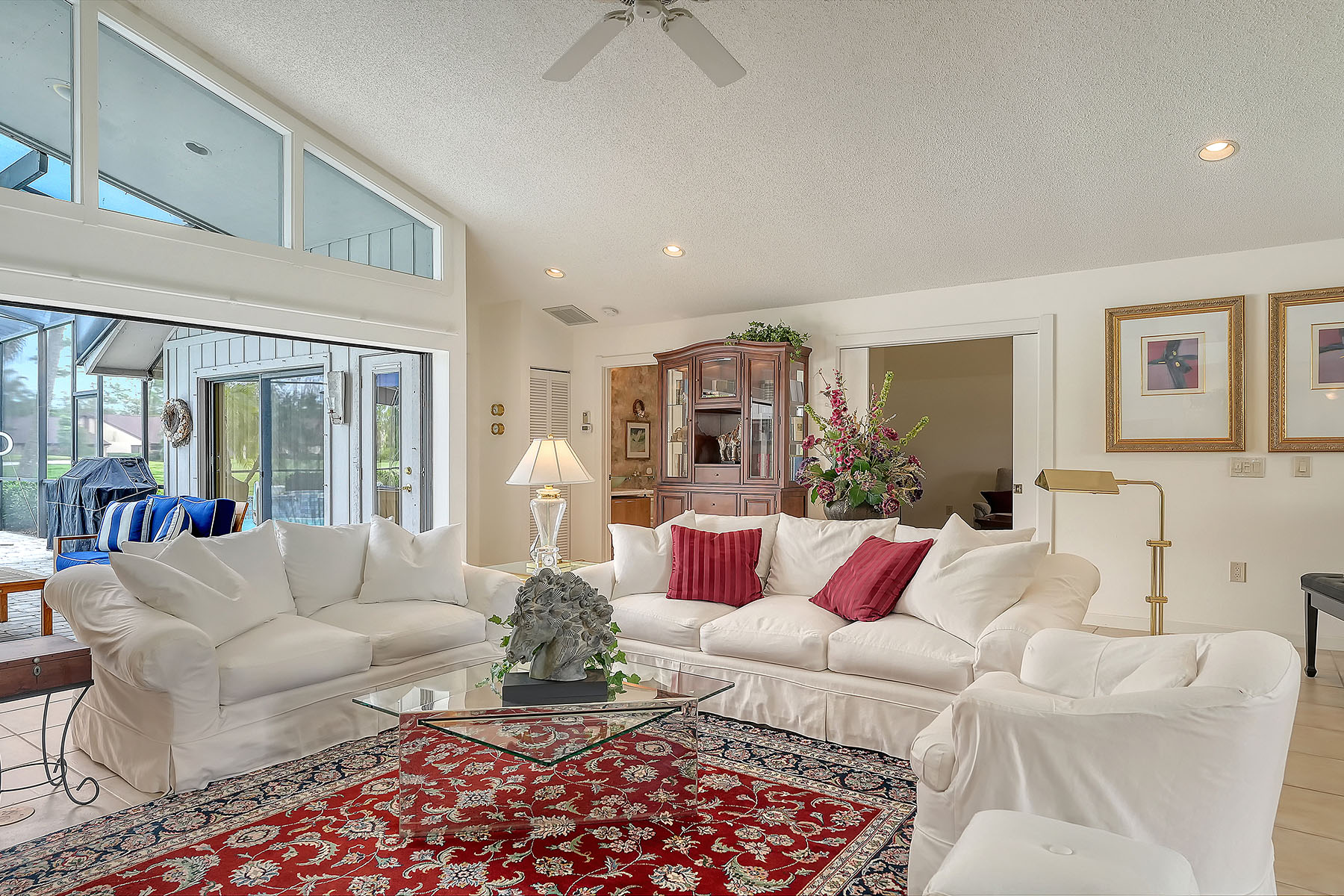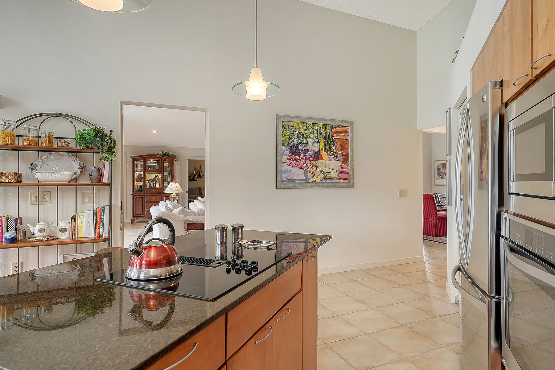 Tucked within the private enclave of Misty Oaks in Palm Air, this Don Traurig home with unique double entrance doors is a beautiful architectural creation. Set on a third of an acre with sweeping views of the 5th fairway on the redesigned lakes course of Palm Aire Country Club, this 2,656-square-foot, three-bedroom, two-bath with office/den home blends modern sophistication with serene, Florida resort-style living. This stunning home embodies Florida elegance, defined by earthy hues, layered textures and refined finishes. The thoughtful design is evident from the moment you arrive, beginning with the unique double entrance doors, 16-inch porcelain tile flooring throughout, and the 15-foot vaulted ceilings. The light-filled great room is anchored by a stunning contemporary fireplace and features sliding glass doors topped with transom windows, seamlessly connecting the indoors to the outdoors. Extra-large windows with upper transom windows in the dining area add to the room's sleek, sophisticated design. Across the room, the stylish custom wet bar with mounted shelving and wine glass rack are ideal for effortless entertaining. The kitchen is a showstopper with granite countertops, solid maple cabinets and stainless steel backsplashes, stainless steel appliances, a large pantry, custom kitchen island with down draft cooktop, hidden storage, wine rack, back-lit glass block design and plenty of windows looking over the pool and fairway. The kitchen dining area features sliding doors for full integration with the lanai and pool area. The primary suite is a luxurious private retreat, complete with walk-in closet, 12-foot lighted wall closet with storage above, and a separate office with contemporary desk and cabinetry. The custom built and a spa-inspired bath with travertine marble tile, granite countertops, solid maple cabinets, a frameless shower door and a sunken whirlpool tub is a relaxing oasis. Each of the two guest bedrooms includes large walk-in closets, offering privacy and comfort for family or guests. The beautifully designed second bath includes stunning custom marble countertop, vessel sink, with designer mirror. Go outside to your private resort, an expansive screened lanai featuring covered and open-air seating and dining areas, a freeform heated pool with waterfalls and fountain. A separate inground heated spa that seats six, all set against the tranquil backdrop of the 5th fairway. Additional highlights include a spacious laundry room with custom cabinetry, an oversized two-car garage with golf cart bay, new roof and skylights 2022, clear Lexan Hurricane panels for all windows, Hunter Douglas Luminettes window treatments, stereo ceiling speakers in great room, primary bedroom and lanai, extensive attic storage, built-in storage in garage, and an air-conditioned workroom. In Palm Aire Community, Misty Oaks is a residential subdivision of single-family homes in the southeast corner of Palm Aire, with two lakes and the 5th, 6th and 7th fairways of the Palm Aire Country Club's Lake Course forming most of the perimeter. Palm Aire Country Club is a full-service country club that is collectively owned by its members and offers a wide variety of membership opportunities. As a member, you have an equity stake in the club and can enjoy year-round golf, tennis, pickleball, padel, water aerobics, and various social activities. Membership is not required. Come and enjoy paradise.