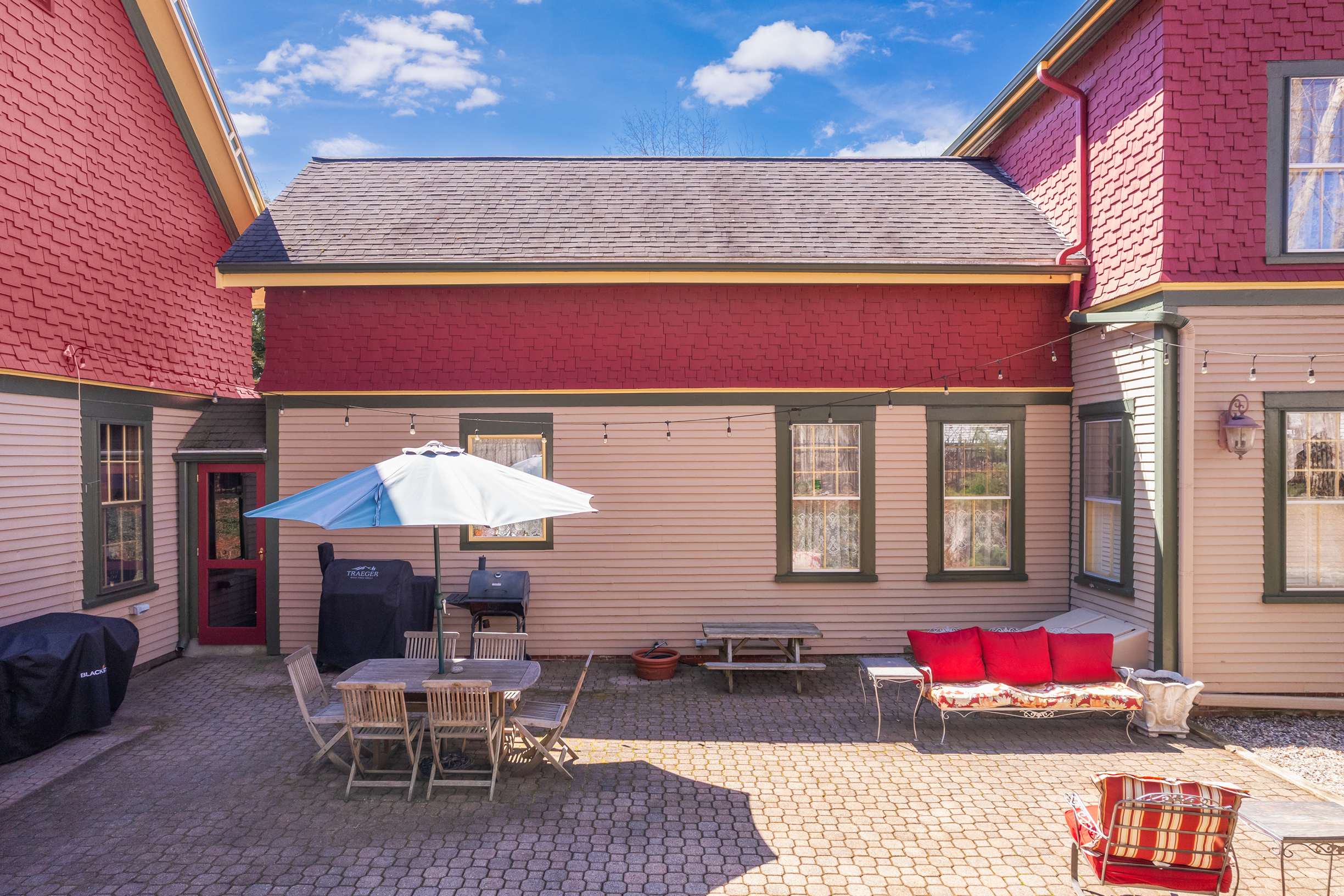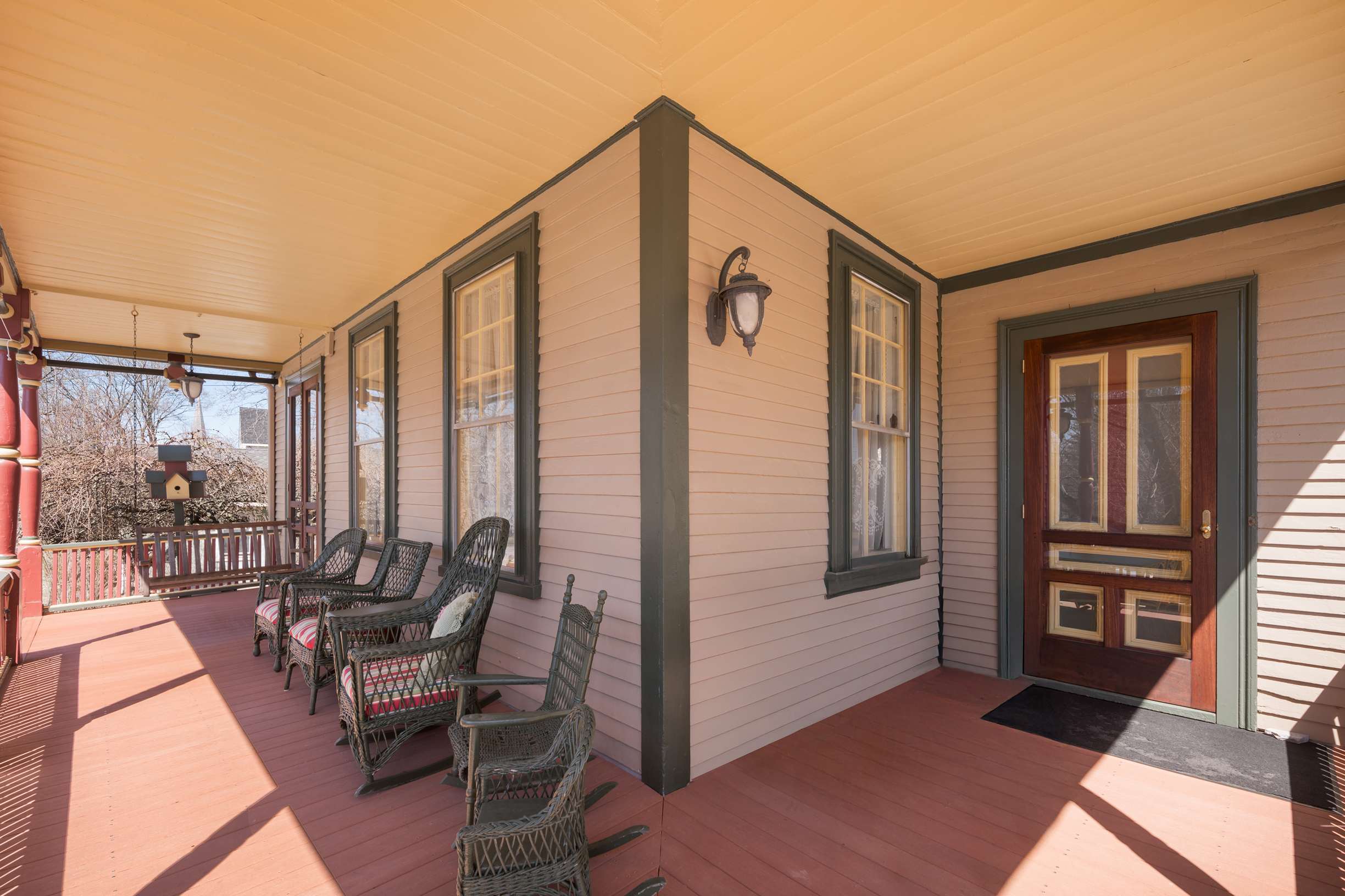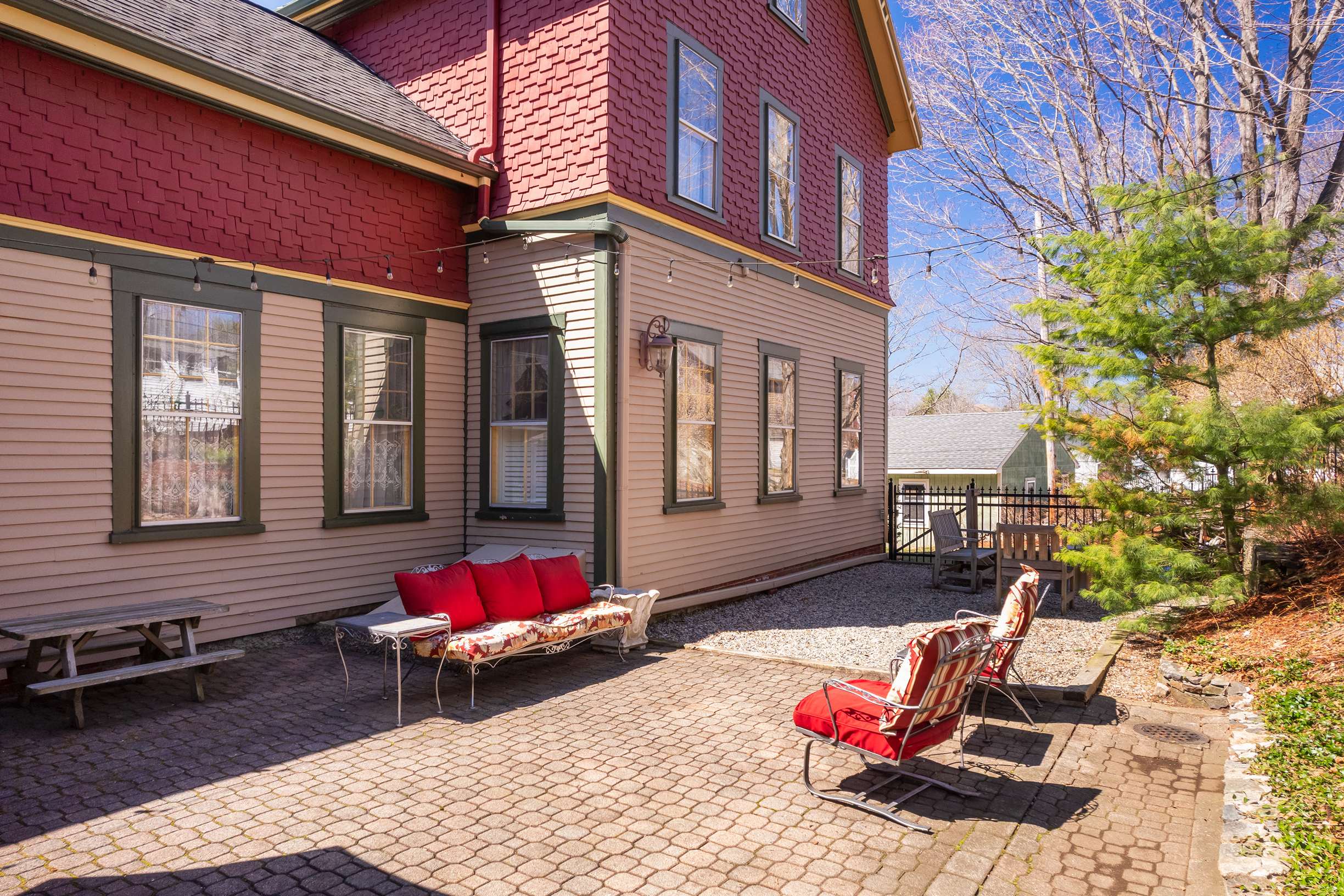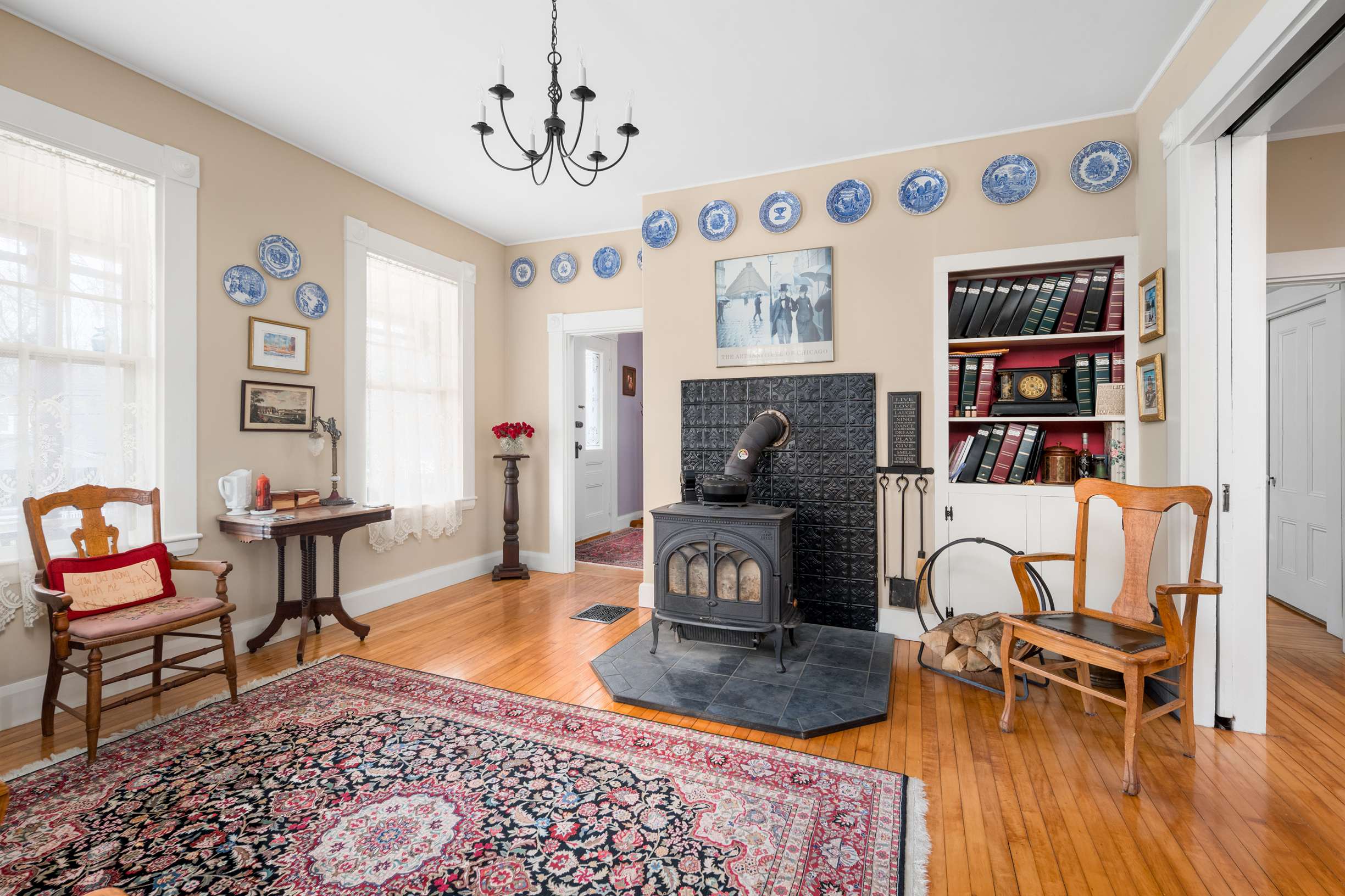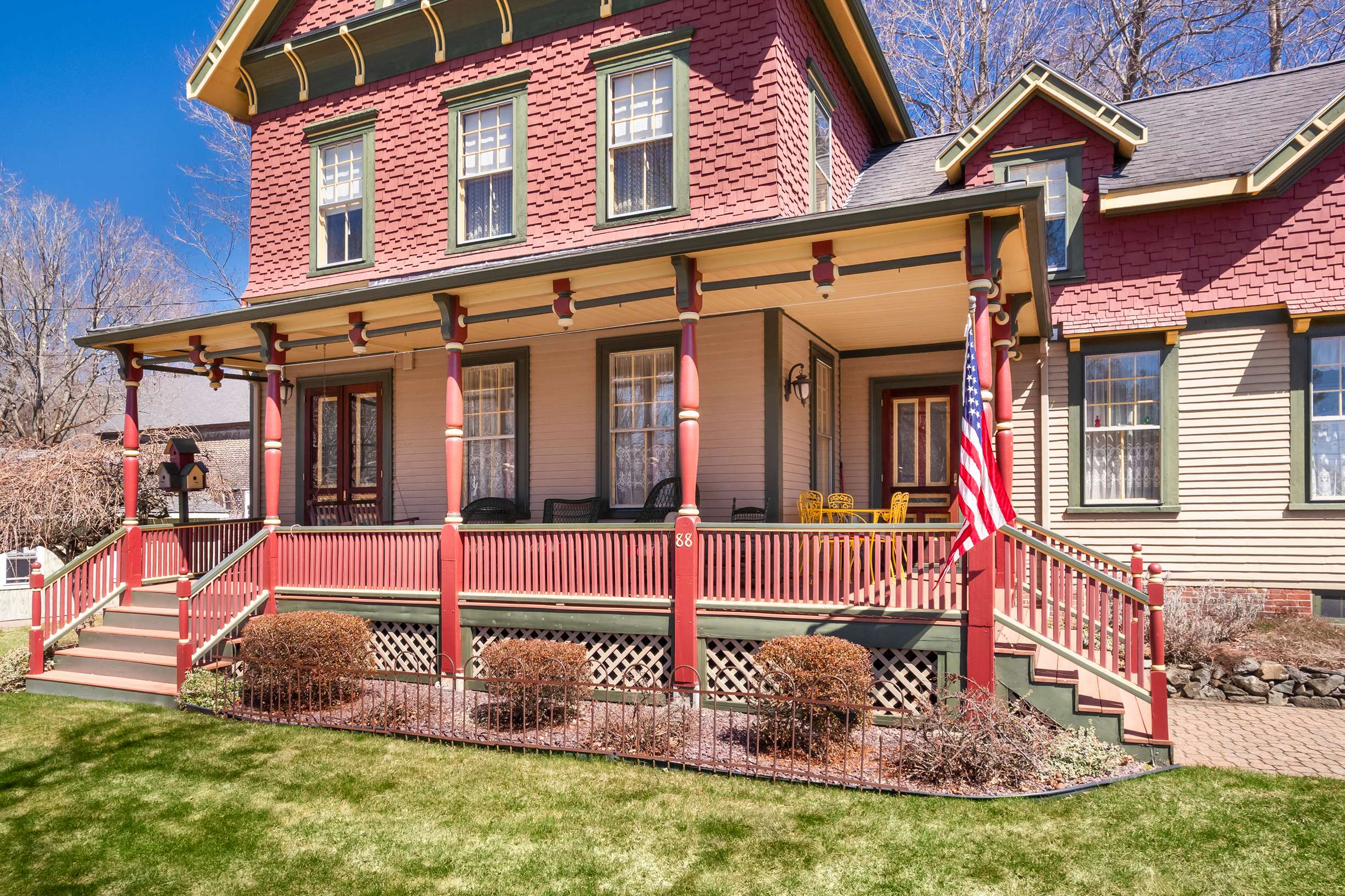Nestled in the heart of York Village sits one of its most architecturally distinct homes. Built in 1880, this 3-bedroom, 4-bath residence with an attached 2-bedroom, 1-bath apartment seamlessly blends historic charm with modern conveniences. The inviting wraparound porch leads into the grand foyer, bespoke with a masterfully crafted wood staircase, an intricately detailed newel post, gleaming hardwood floors, period trim, plastered walls, soaring ceilings, and timeless grandeur. The main level features a living room with built-in cabinetry, tall windows, a cozy woodstove, and original pocket doors leading to the den, a formal dining room, laundry/bath, and a sunny eat-in kitchen that flows out to the private backyard oasis. Host large gatherings in the fenced-in yard, replete with a custom paver patio, intricate stone walls, lushly landscaped grounds, blueberry bushes, a pea-stone fire pit area, and a custom Reeds Ferry shed. The second floor consists of a primary bedroom, two guest rooms flanking a shared flex room, and an elegantly updated bath with custom cabinetry, marble floors, and Tuscan brass fixtures. The third-floor family room features a Jotul gas stove, kitchenette with fine cabinetry, farmhouse sink, refrigerator, cooktop, and built-in peninsula seating, plus a built-in office area with an elliptical window that frames the tree-top views. There is enough room to host overflow guests in this space with access to a full bath with a clawfoot tub. The home benefits from a newly updated heating system offering central air. The heated, attached 2-car garage features ample storage and a bath. Plenty of space for guests in the brick-paver driveway. The 2-bedroom apartment is ideal for a live-in nanny/caregiver, separate studio, or income generation. An exciting opportunity to own an exquisite property with undeniable charm in a prime York Village location within walking distance of schools, hospital, library, golf, beaches, restaurants, and charming shops.