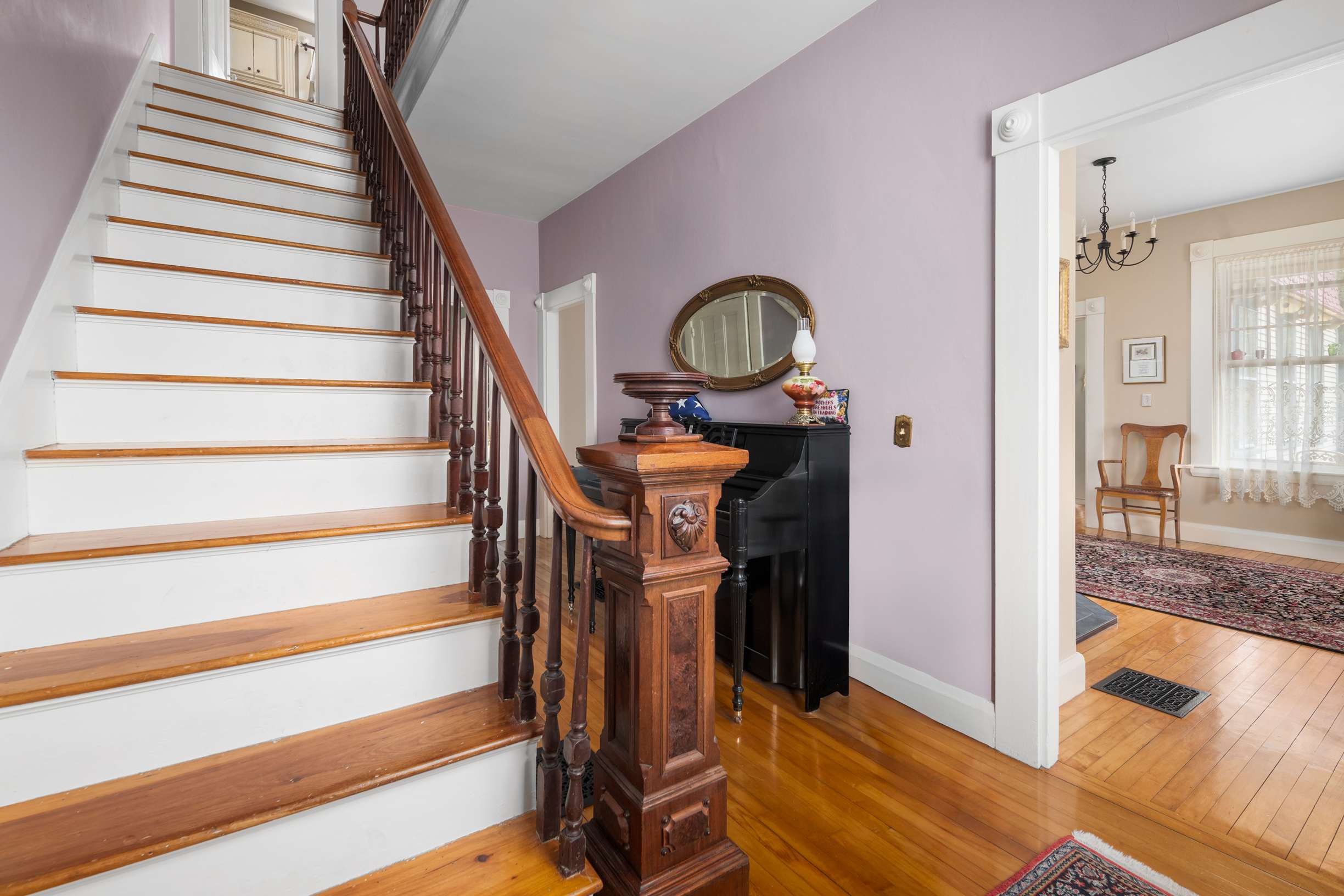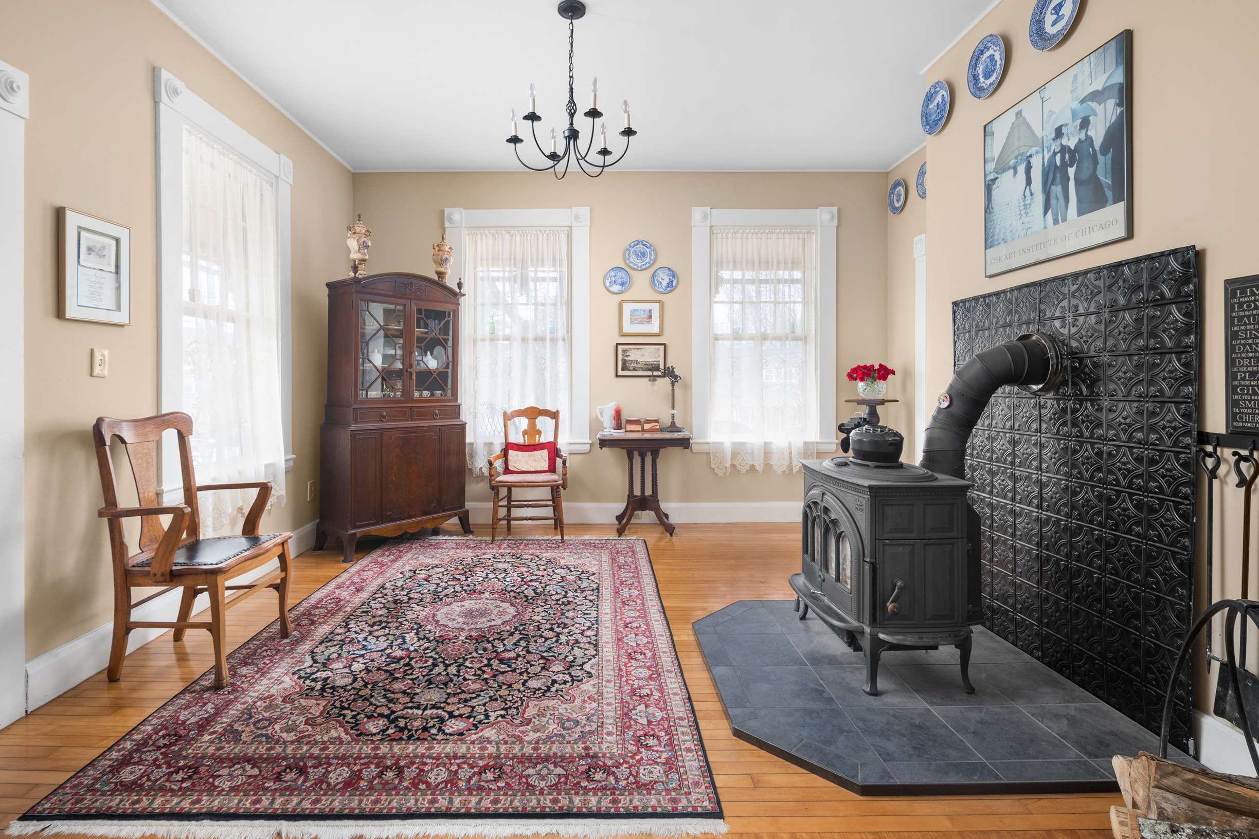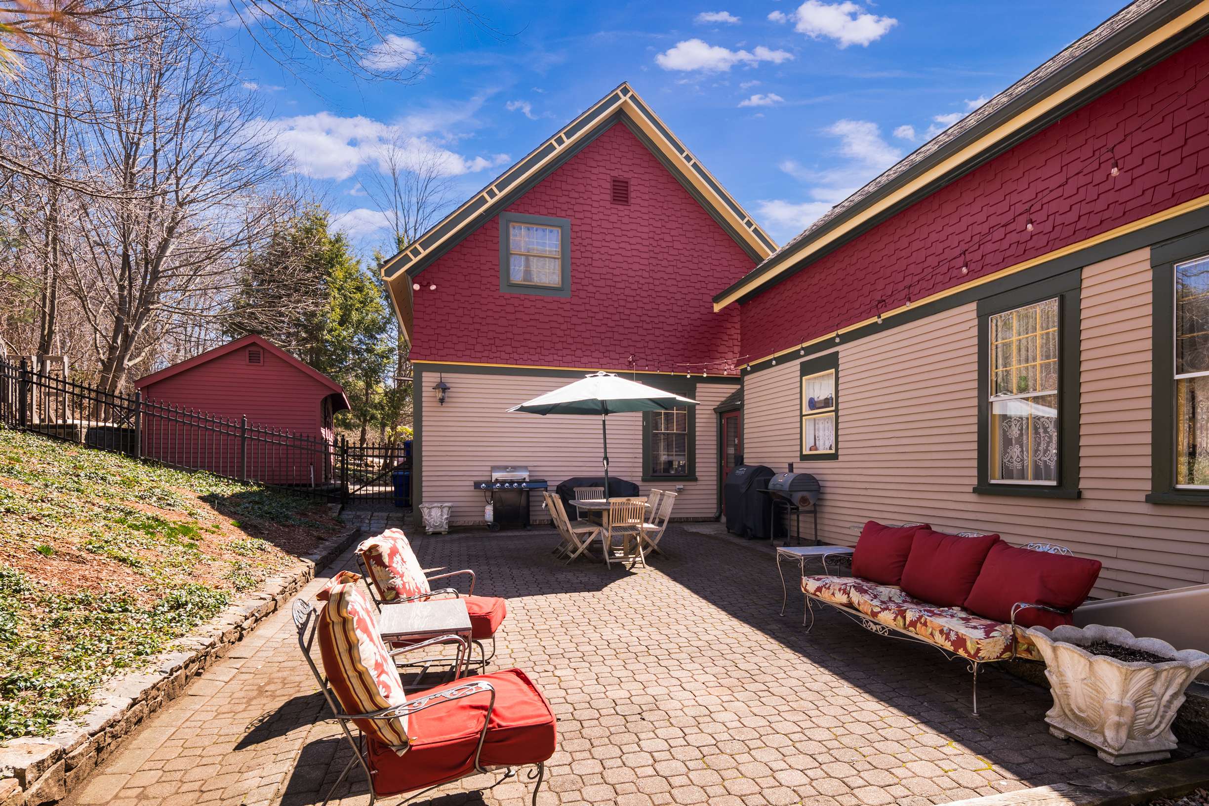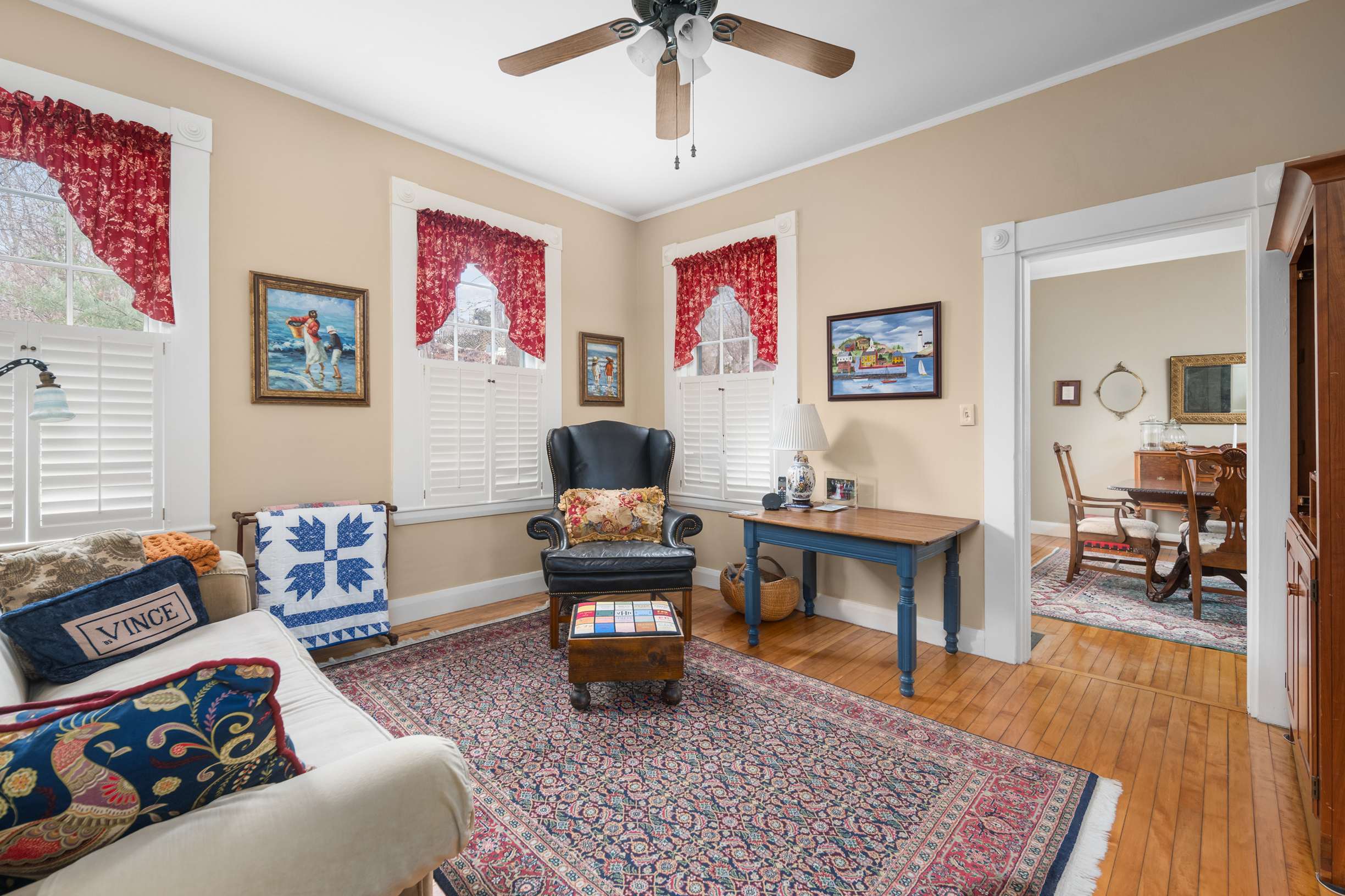 Nestled in the heart of York Village sits one of its most architecturally distinct homes. Built in 1880, this 3-bedroom, 4-bath residence with an attached 2-bedroom, 1-bath apartment seamlessly blends historic charm with modern conveniences. The inviting wraparound porch leads into the grand foyer, bespoke with a masterfully crafted wood staircase, an intricately detailed newel post, gleaming hardwood floors, period trim, plastered walls, soaring ceilings, and timeless grandeur. The main level features a living room with built-in cabinetry, tall windows, a cozy woodstove, and original pocket doors leading to the den, a formal dining room, laundry/bath, and a sunny eat-in kitchen that flows out to the private backyard oasis. Host large gatherings in the fenced-in yard, replete with a custom paver patio, intricate stone walls, lushly landscaped grounds, blueberry bushes, a pea-stone fire pit area, and a custom Reeds Ferry shed. The second floor consists of a primary bedroom, two guest rooms flanking a shared flex room, and an elegantly updated bath with custom cabinetry, marble floors, and Tuscan brass fixtures. The third-floor family room features a Jotul gas stove, kitchenette with fine cabinetry, farmhouse sink, refrigerator, cooktop, and built-in peninsula seating, plus a built-in office area with an elliptical window that frames the tree-top views. There is enough room to host overflow guests in this space with access to a full bath with a clawfoot tub. The home benefits from a newly updated heating system offering central air. The heated, attached 2-car garage features ample storage and a bath. Plenty of space for guests in the brick-paver driveway. The 2-bedroom apartment is ideal for a live-in nanny/caregiver, separate studio, or income generation. An exciting opportunity to own an exquisite property with undeniable charm in a prime York Village location within walking distance of schools, hospital, library, golf, beaches, restaurants, and charming shops.