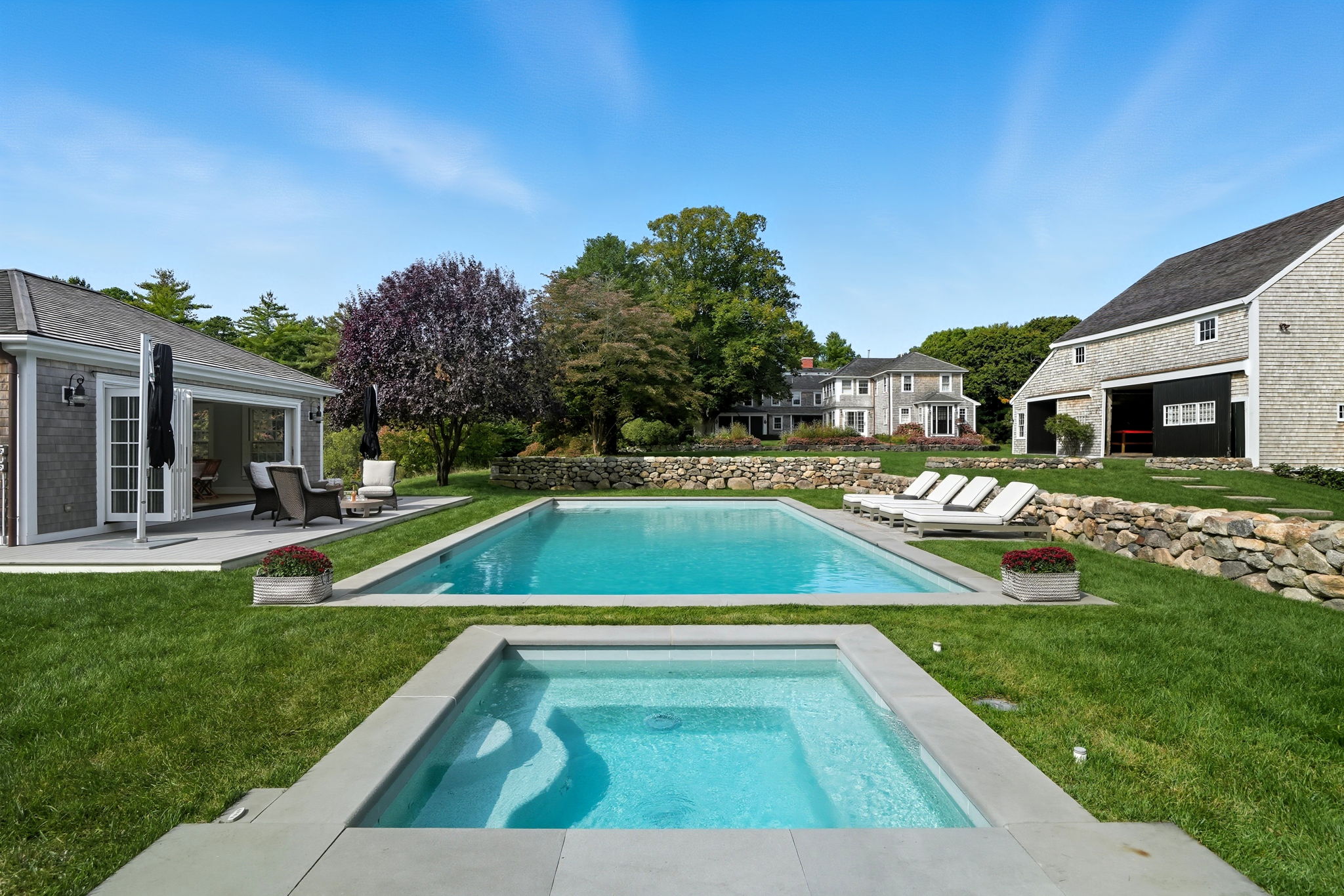 In the heart of Duxbury, just moments from Shipyard Beach and Duxbury Bay, this rare 16.8-acre estate offers an exceptional combination of privacy, scale, and coastal proximity seldom found in this market.Set amid rolling fields, two tranquil ponds, and a network of established stone walls, the property unfolds as a secluded retreat where natural beauty defines the experience yet the shoreline remains just moments away.The five-bedroom, five full & two half bath residence reflects timeless design, featuring wide pine floors, custom millwork, and expansive walls of glass that frame the landscape and fill the home with natural light. The interiors are both refined and inviting, designed to live as comfortably as they impress.A two-story barn creates a striking focal point for entertaining, overlooking the in-ground pool and private pool house. Throughout the grounds, hand-laid stone walls reminiscent of classic European estates lend a sense of heritage and permanence.