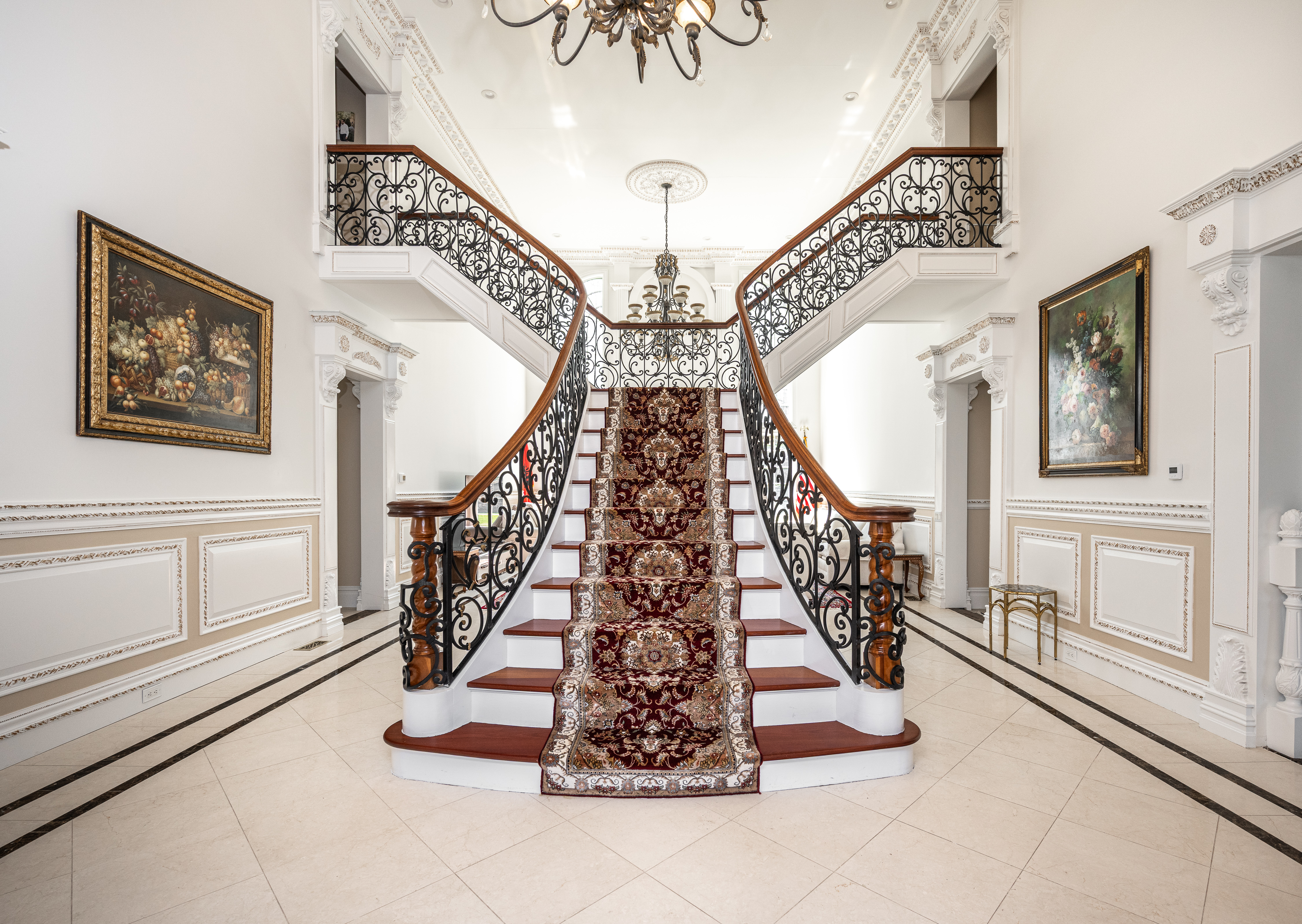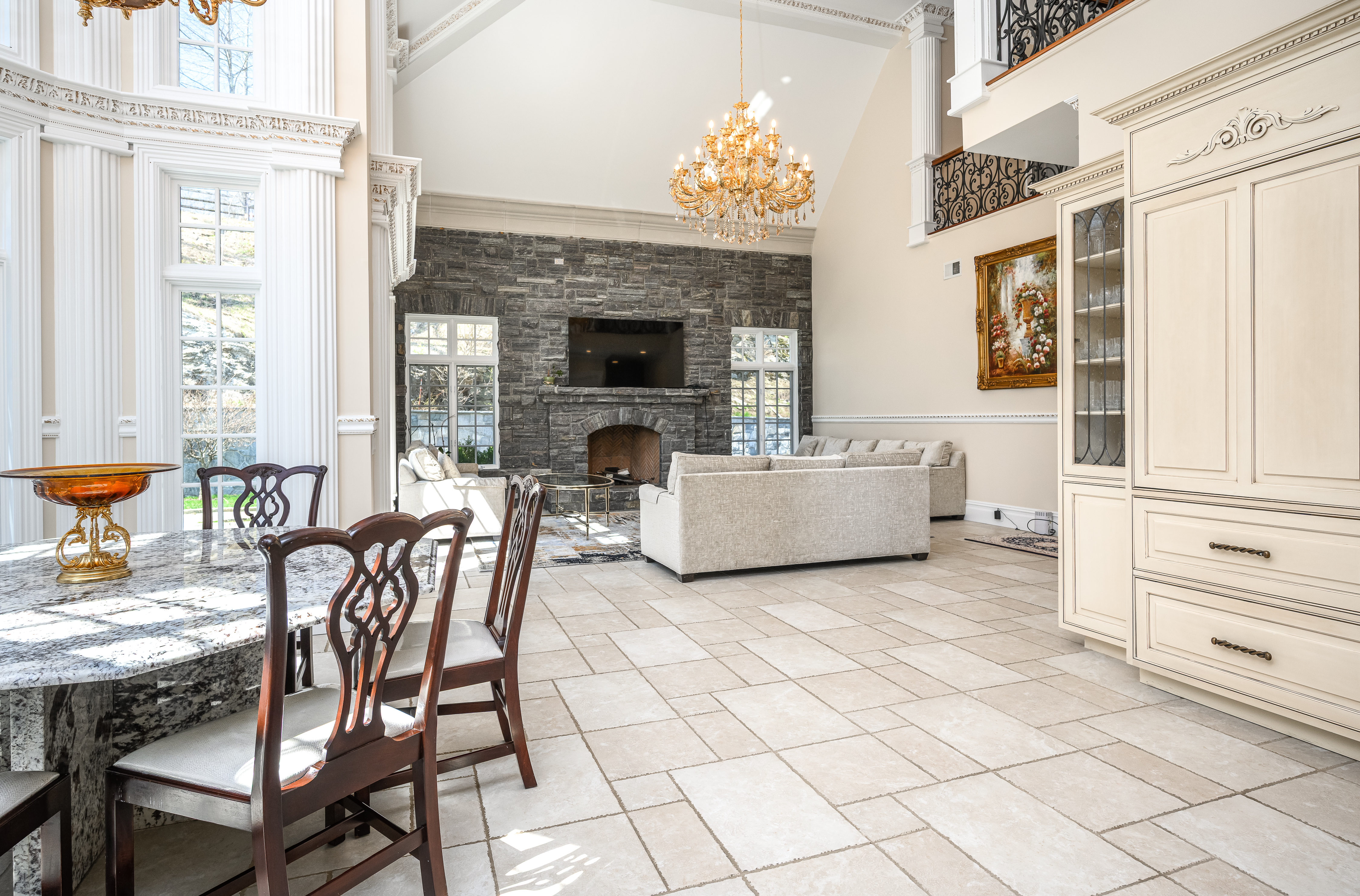 A dramatic entry introduces the home's impressive interior, highlighted by a striking double floating staircase and a sun-filled, two-story living room with radiant heated floors. The thoughtfully designed open layout seamlessly connects formal and informal spaces, offering both elegance and comfort. At the heart of the home, the chef's kitchen flows effortlessly into inviting gathering areas centered around a timeless stone fireplace, with French doors leading out to an expansive stone patio complete with its own outdoor fireplace.