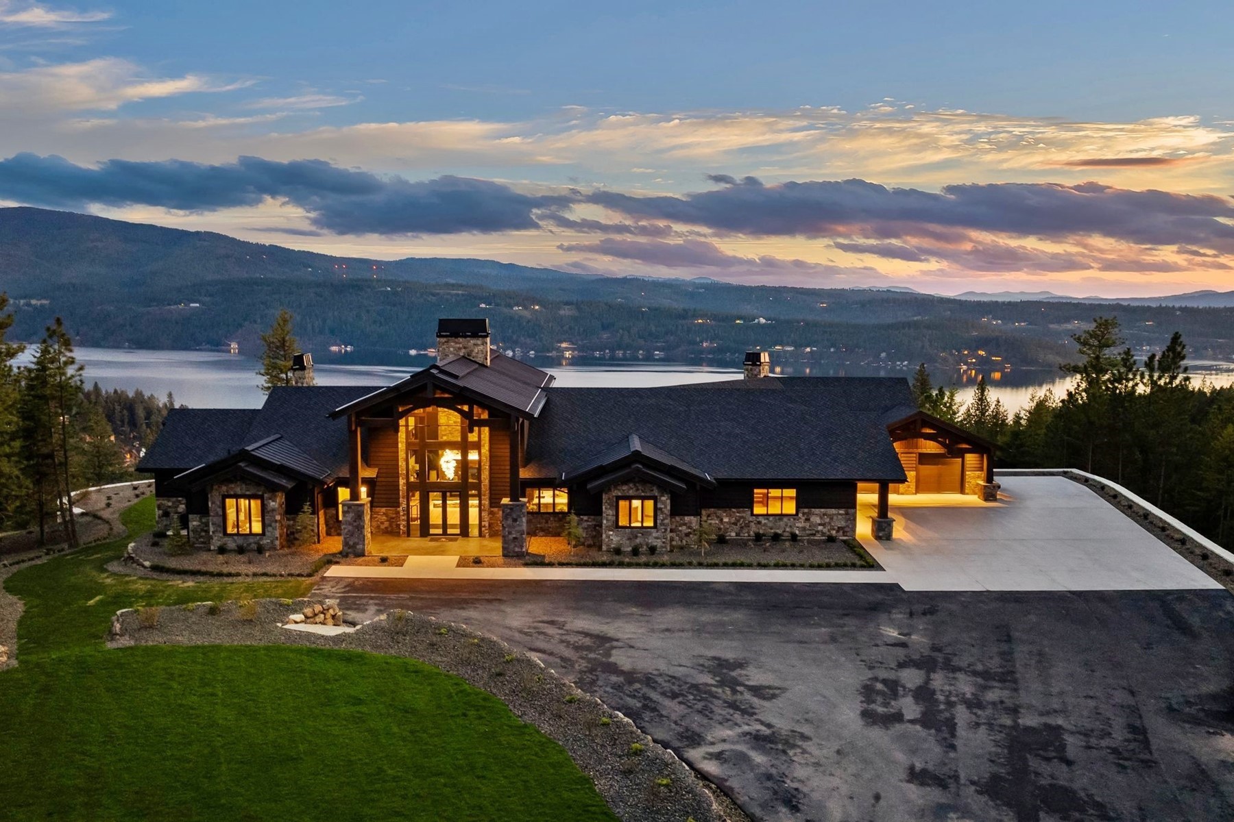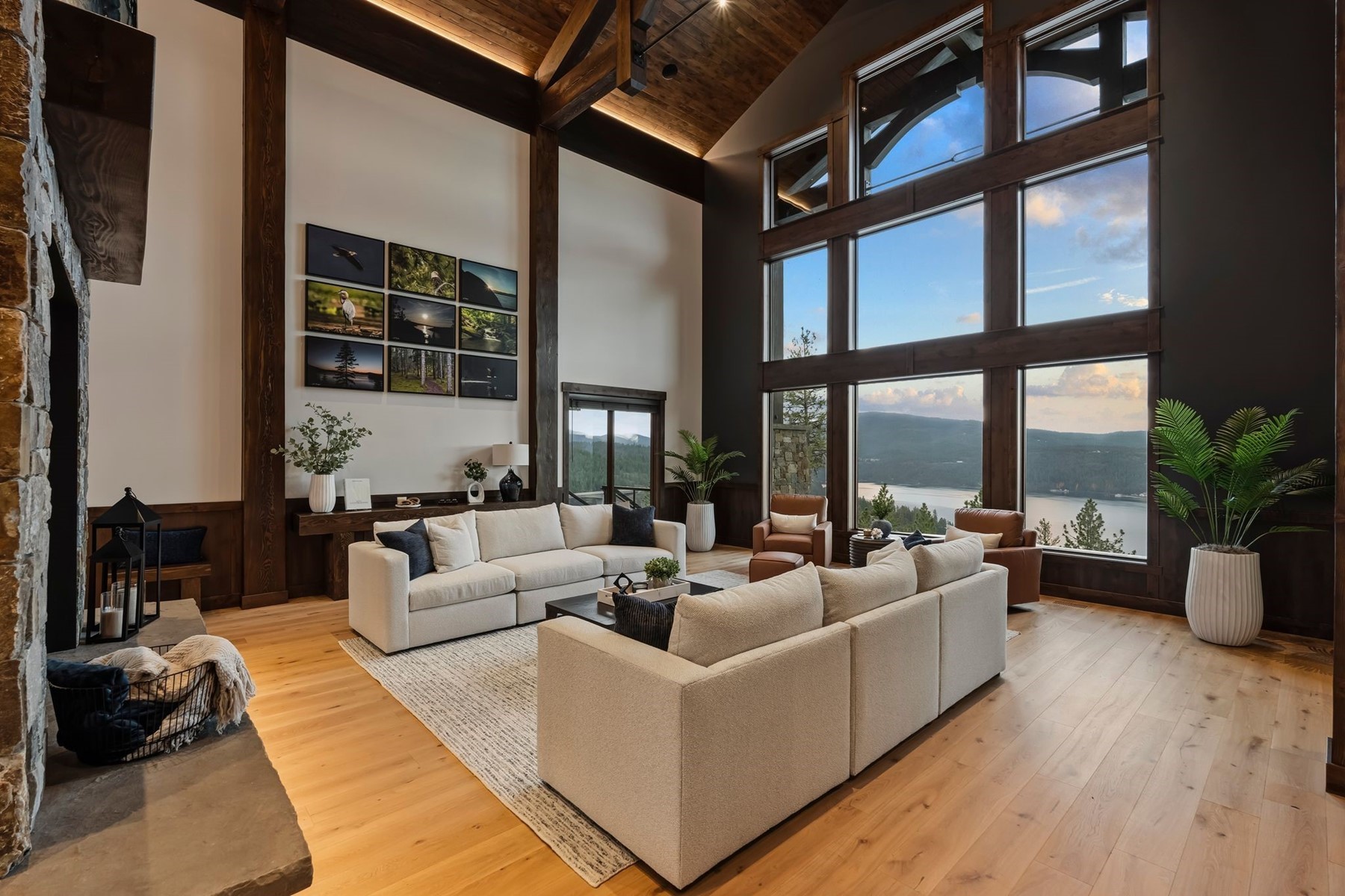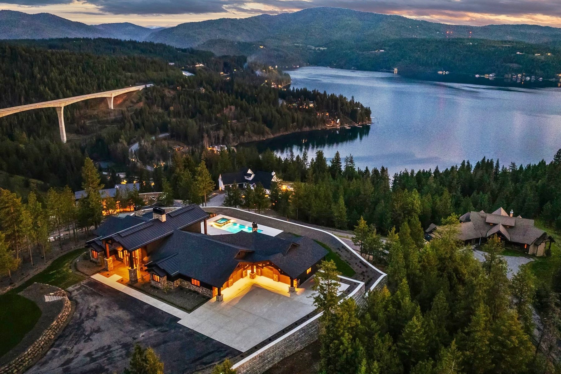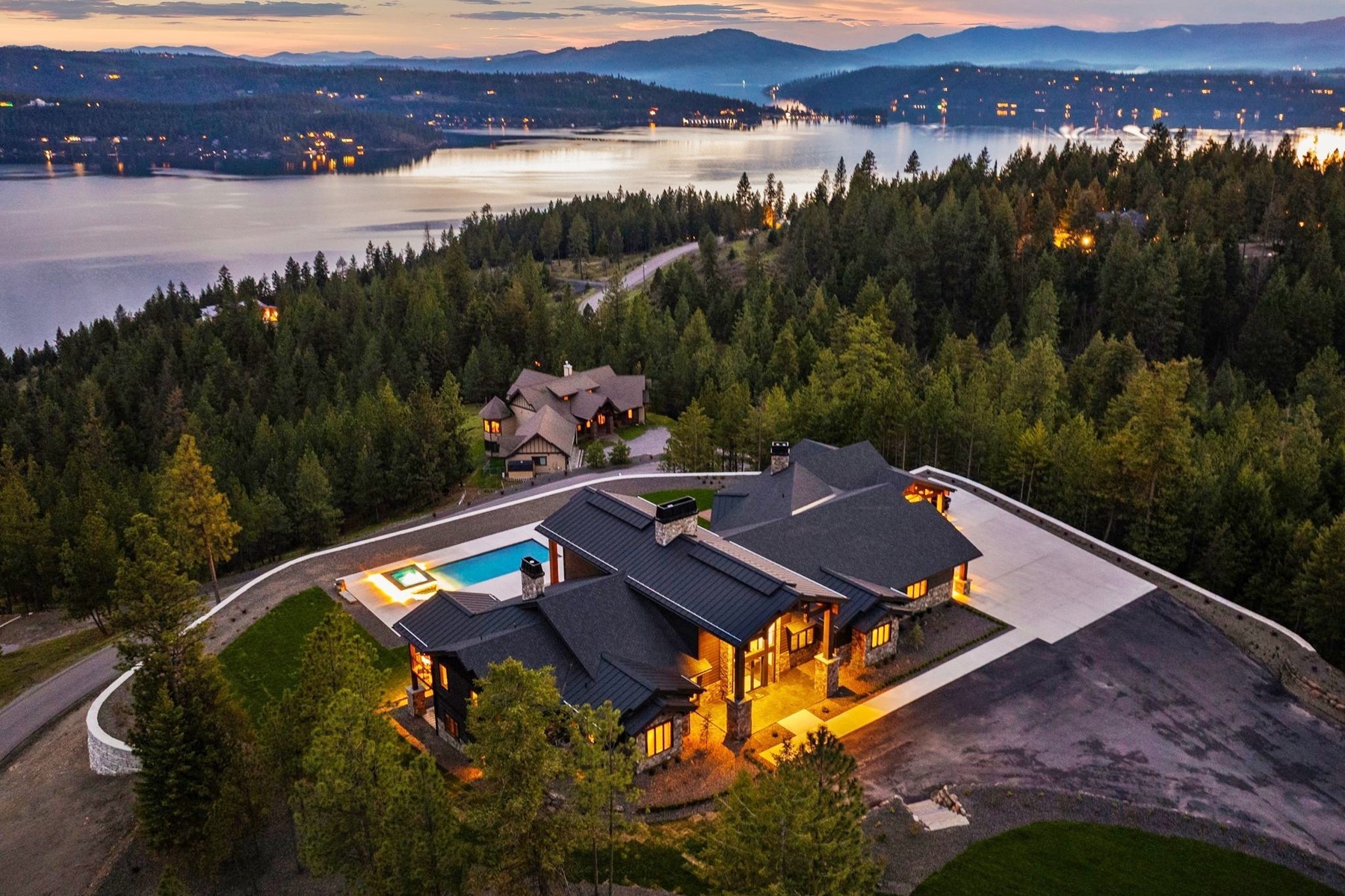 Arriving through a private gated hillside enclave just east of Coeur d'Alene, Idaho-Talis is a newly completed legacy estate where privacy, craftsmanship, and panoramic beauty meet at an extraordinary level. This 11,000-square-foot residence was personally designed and built by its creator as the culmination of a lifetime devoted to building exceptionally well. Set on 3.77 acres with no visible neighbors, the property offers a rare sense of seclusion only minutes from the amenities of town. Inside, the defining first impression is unforgettable: stepping through the front door, your eye is drawn through a dramatic 60-inch two-way fireplace to the lake and mountains beyond. Towering 26-foot ceilings are framed by monumental hand-hewn Douglas Fir beams, custom milled and crafted with traditional mortise-and-tenon joinery. Walls of windows flood the interiors with natural light while framing the surrounding landscape like living art. The home's mountain lodge architecture is timelessly suited to North Idaho, pairing grandeur with warmth. European white oak floors, Spanish limestone tile, handcrafted timber trusses, and substantial stonework across the estate create a palette of natural sophistication. The chef's kitchen is both elegant and innovative, featuring bespoke cabinetry, expansive stone surfaces, and PITT Cooking burners seamlessly integrated into the countertop. Designed equally for everyday comfort and elevated entertaining, the residence includes six bedrooms, five-and-a-half baths, beautiful office spaces, theater room, fitness areas, guest accommodations, and a remarkable 3,500-bottle wine room. Outdoors, resort-style amenities include a heated saltwater pool and spa, outdoor kitchen, firepit, manicured lawn, expansive terraces, and a large four-car garage. Further enhancing the lifestyle offering, the property includes an arrangement for a boat slip on Lake Coeur d'Alene, allowing effortless access to one of the region's most coveted recreational assets. Built without compromise and impossible to replicate, Talis is more than a home--it is a generational North Idaho estate of enduring quality and rare presence