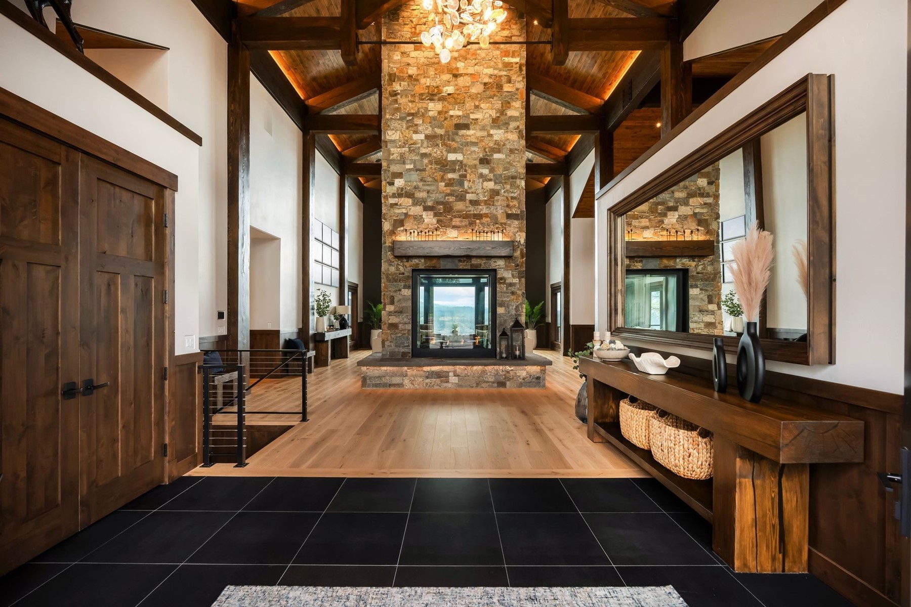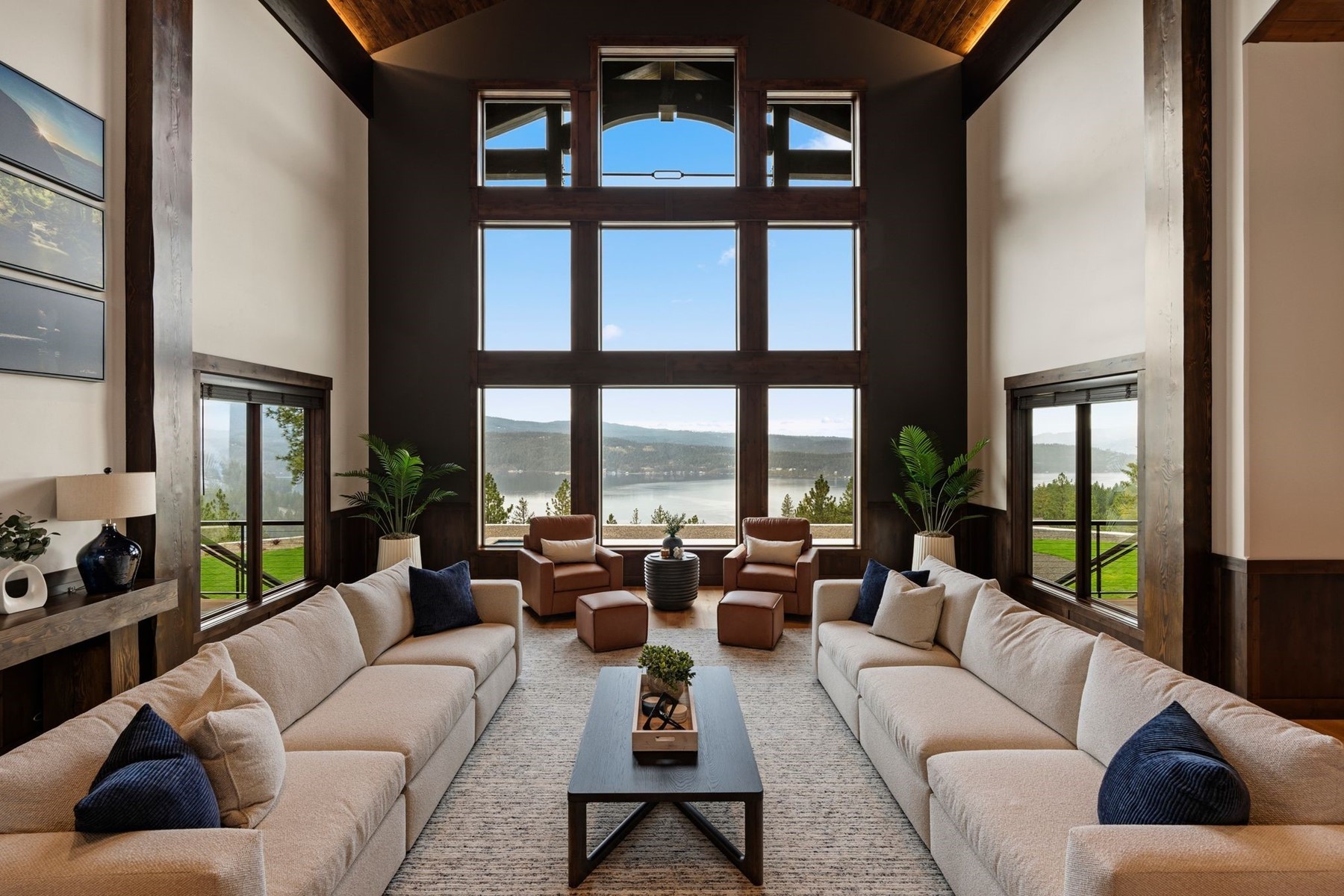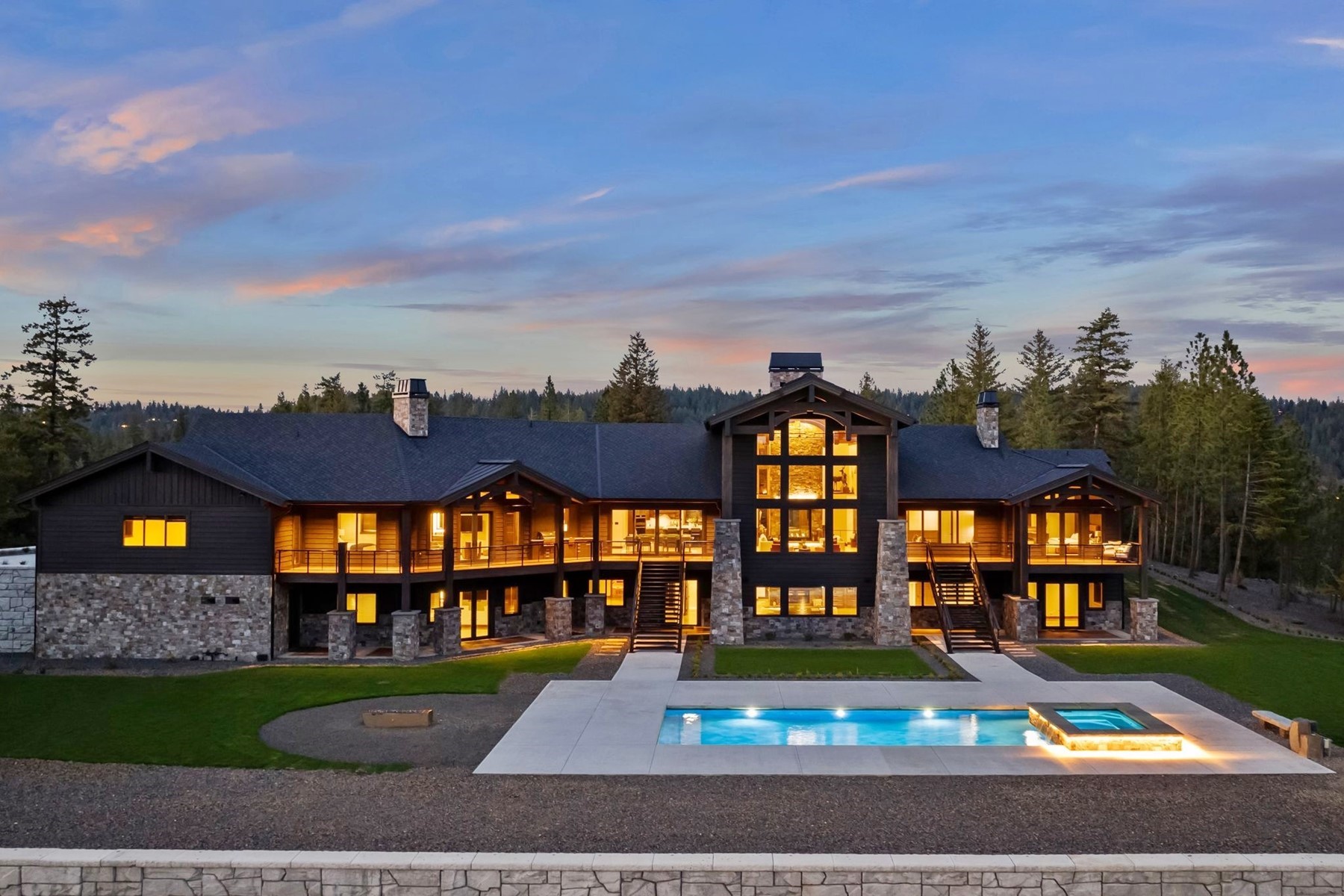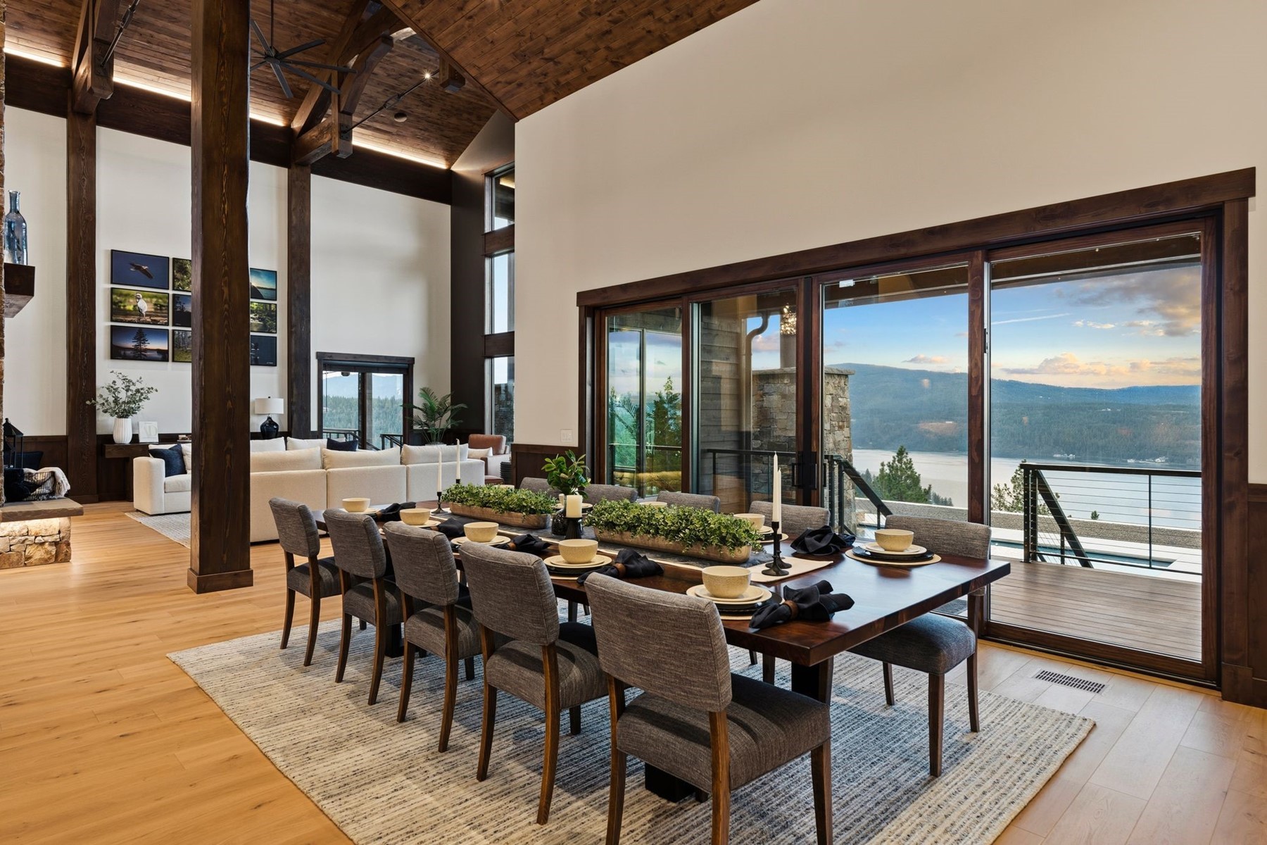 Arriving through a private gated hillside enclave just east of Coeur d'Alene, Idaho-Talis is a newly completed legacy estate where privacy, craftsmanship, and panoramic beauty meet at an extraordinary level. This 11,000-square-foot residence was personally designed and built by its creator as the culmination of a lifetime devoted to building exceptionally well. Set on 3.77 acres with no visible neighbors, the property offers a rare sense of seclusion only minutes from the amenities of town. Inside, the defining first impression is unforgettable: stepping through the front door, your eye is drawn through a dramatic 60-inch two-way fireplace to the lake and mountains beyond. Towering 26-foot ceilings are framed by monumental hand-hewn Douglas Fir beams, custom milled and crafted with traditional mortise-and-tenon joinery. Walls of windows flood the interiors with natural light while framing the surrounding landscape like living art. The home's mountain lodge architecture is timelessly suited to North Idaho, pairing grandeur with warmth. European white oak floors, Spanish limestone tile, handcrafted timber trusses, and substantial stonework across the estate create a palette of natural sophistication. The chef's kitchen is both elegant and innovative, featuring bespoke cabinetry, expansive stone surfaces, and PITT Cooking burners seamlessly integrated into the countertop. Designed equally for everyday comfort and elevated entertaining, the residence includes six bedrooms, five-and-a-half baths, beautiful office spaces, theater room, fitness areas, guest accommodations, and a remarkable 3,500-bottle wine room. Outdoors, resort-style amenities include a heated saltwater pool and spa, outdoor kitchen, firepit, manicured lawn, expansive terraces, and a large four-car garage. Further enhancing the lifestyle offering, the property includes an arrangement for a boat slip on Lake Coeur d'Alene, allowing effortless access to one of the region's most coveted recreational assets. Built without compromise and impossible to replicate, Talis is more than a home--it is a generational North Idaho estate of enduring quality and rare presence