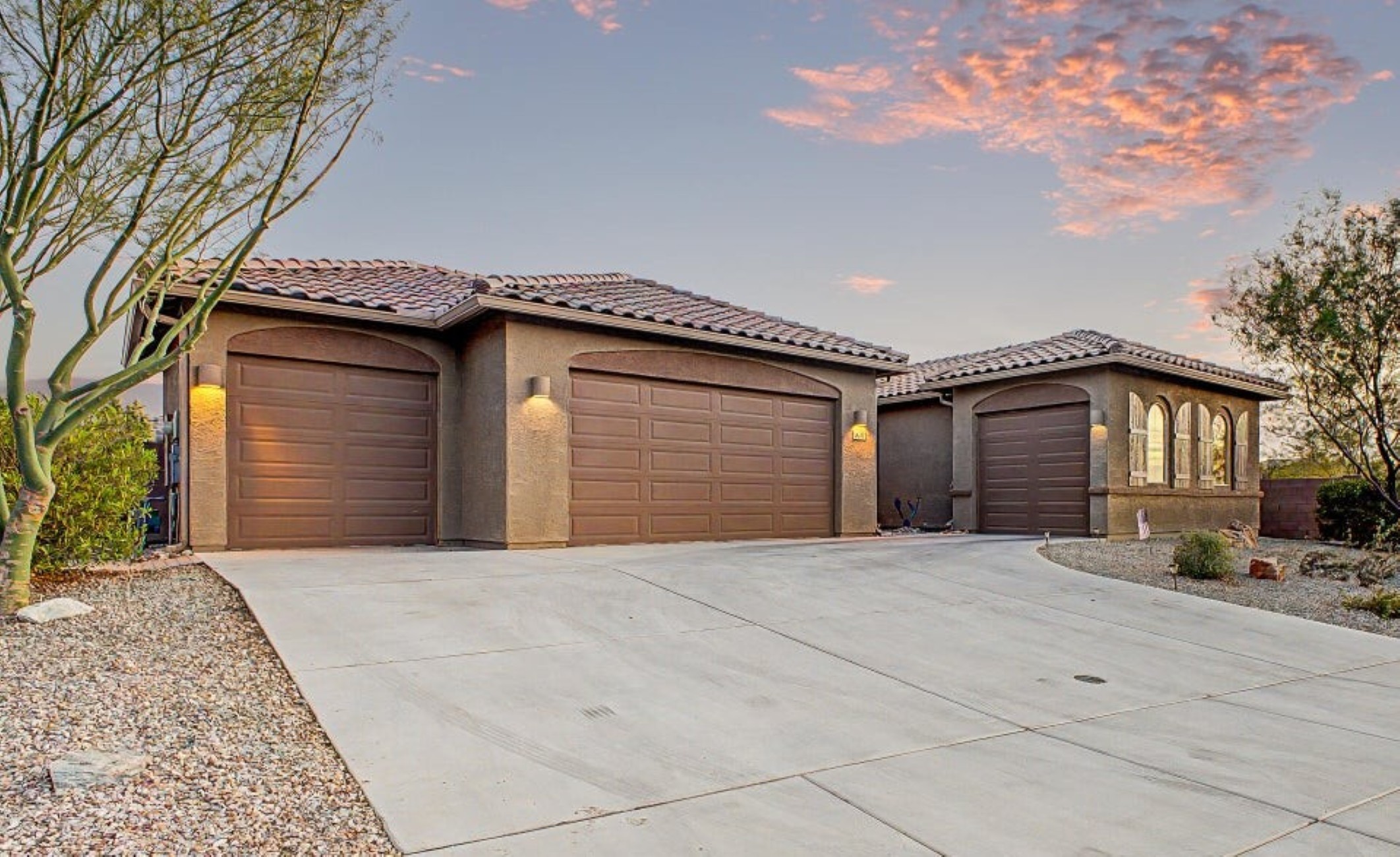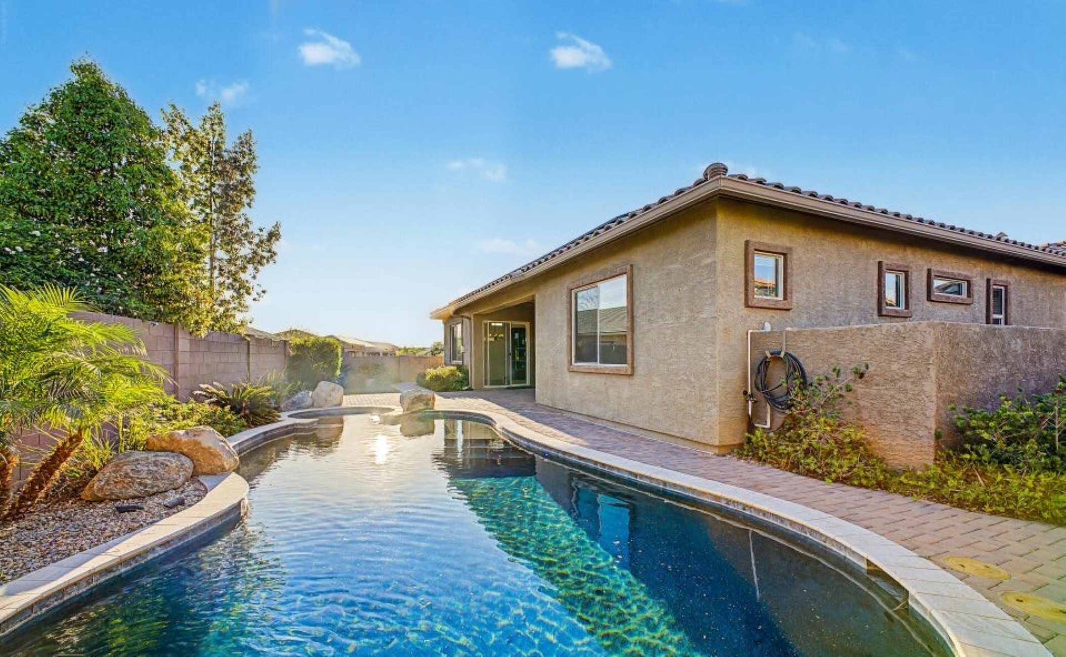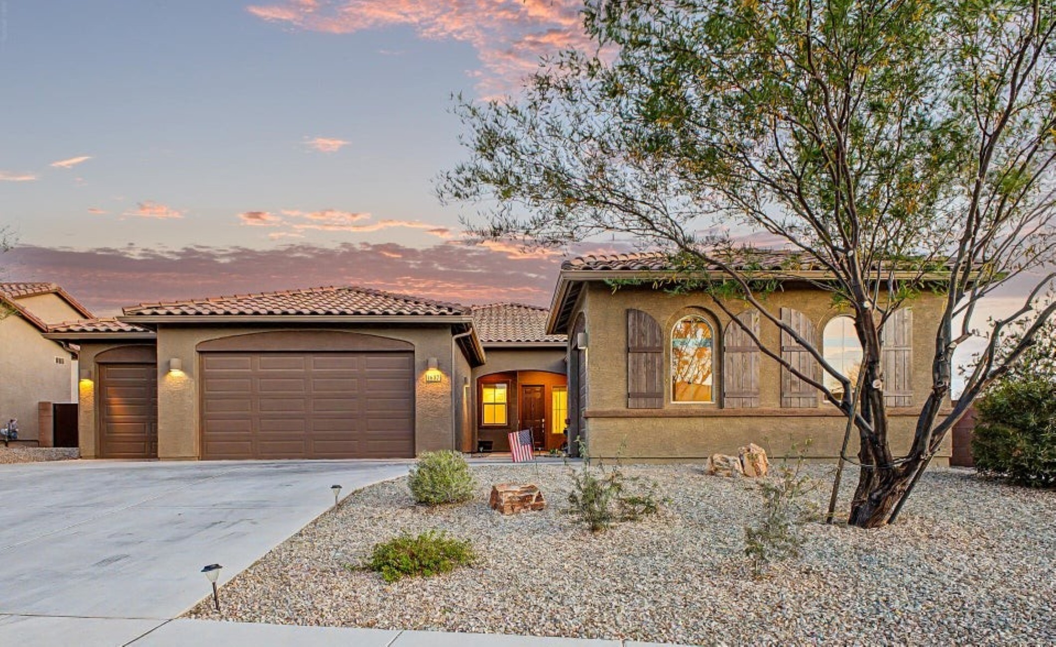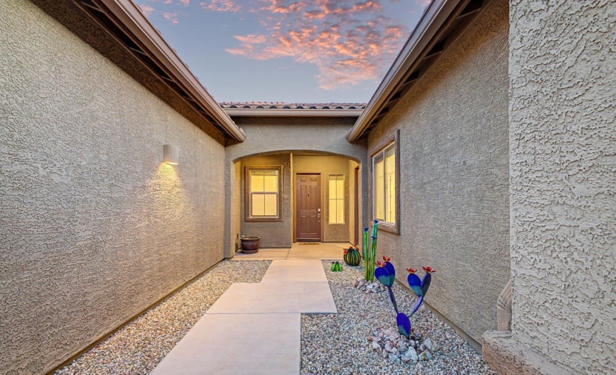 Beautiful 2,594 SF home Built in 2021 with attached casita which includes 1 Bed/1Bath, 1-car garage, kitchenette, great room & private patio-ideal for guests or multigenerational living. Main home offers 3 bedrooms/2 full baths, spacious primary suite with patio access, walk-in closet, double vanity & custom tiled shower. Open kitchen features double ovens, stainless appliances, walk-in pantry & abundant counter space, flowing into the great room with backyard views. Resort-style backyard w/ PebbleTec pool, spa & waterfall surrounded by mature landscaping, paver patios, irrigated garden beds & citrus trees. Owned solar, rain gutters with cistern rain barrel & added privacy with no neighbors to the west--plus beautiful sunset and Catalina Mountain views.