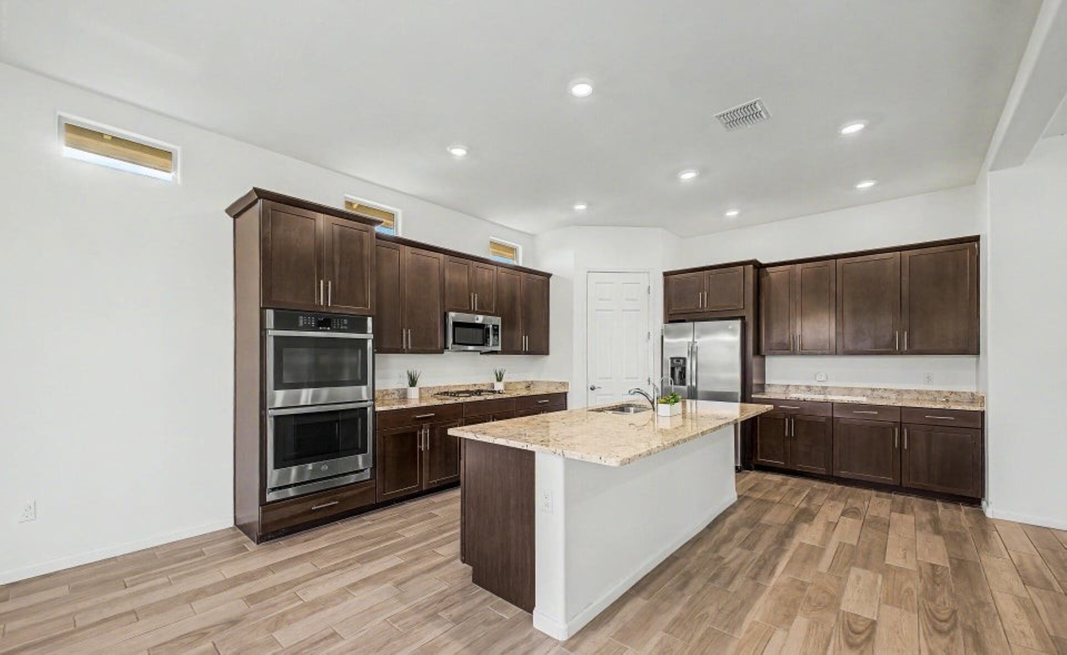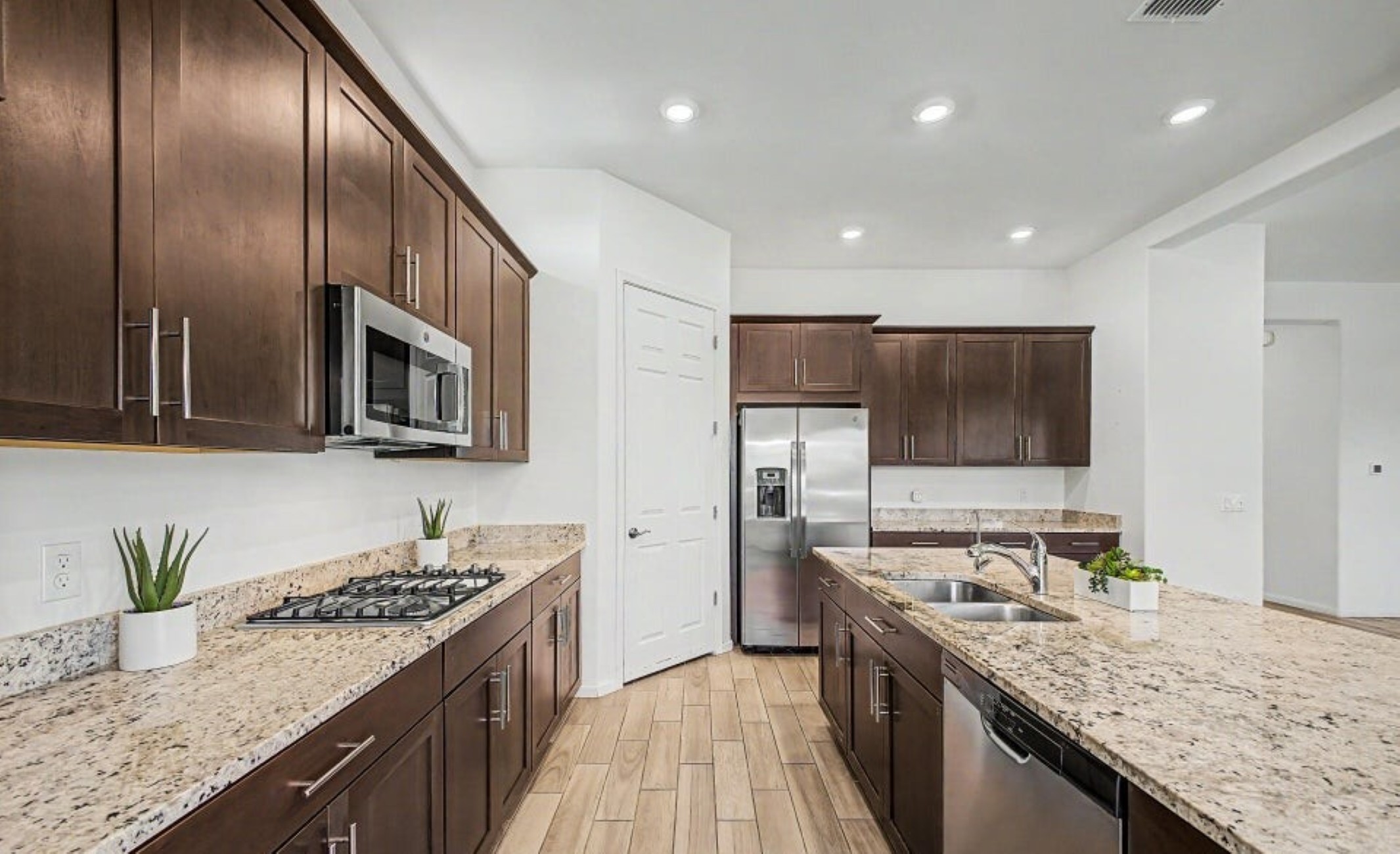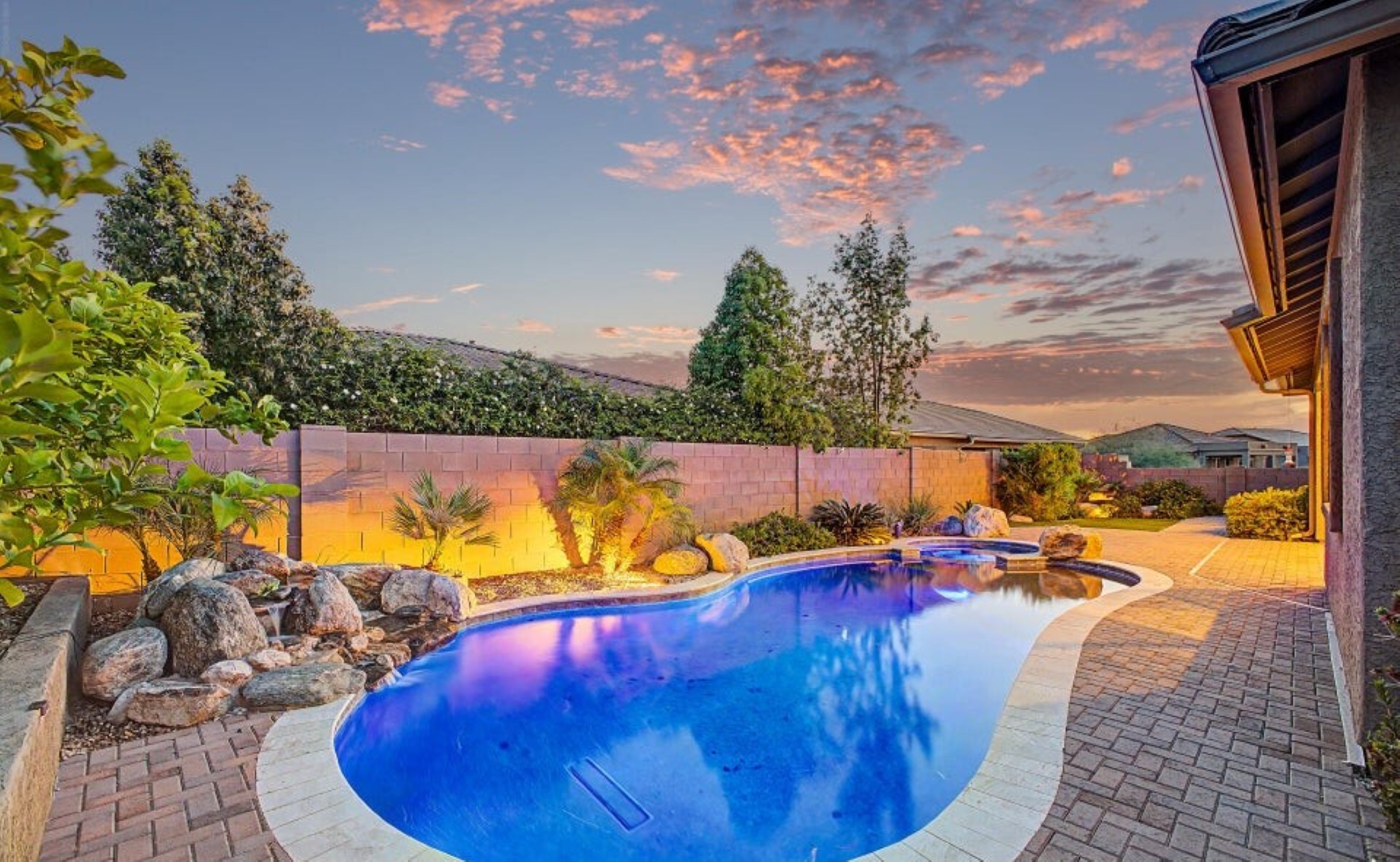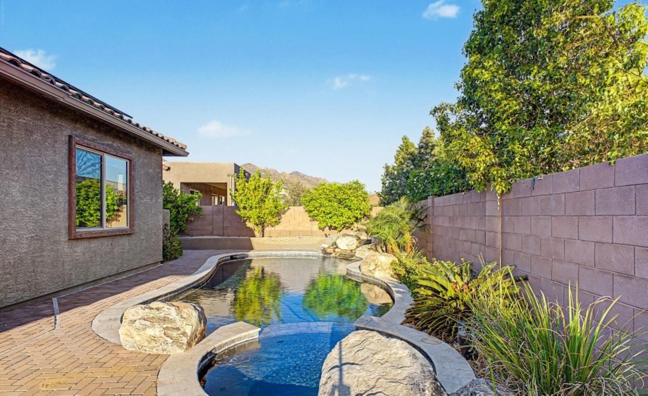 Beautiful 2,594 SF home Built in 2021 with attached casita which includes 1 Bed/1Bath, 1-car garage, kitchenette, great room & private patio-ideal for guests or multigenerational living. Main home offers 3 bedrooms/2 full baths, spacious primary suite with patio access, walk-in closet, double vanity & custom tiled shower. Open kitchen features double ovens, stainless appliances, walk-in pantry & abundant counter space, flowing into the great room with backyard views. Resort-style backyard w/ PebbleTec pool, spa & waterfall surrounded by mature landscaping, paver patios, irrigated garden beds & citrus trees. Owned solar, rain gutters with cistern rain barrel & added privacy with no neighbors to the west--plus beautiful sunset and Catalina Mountain views.