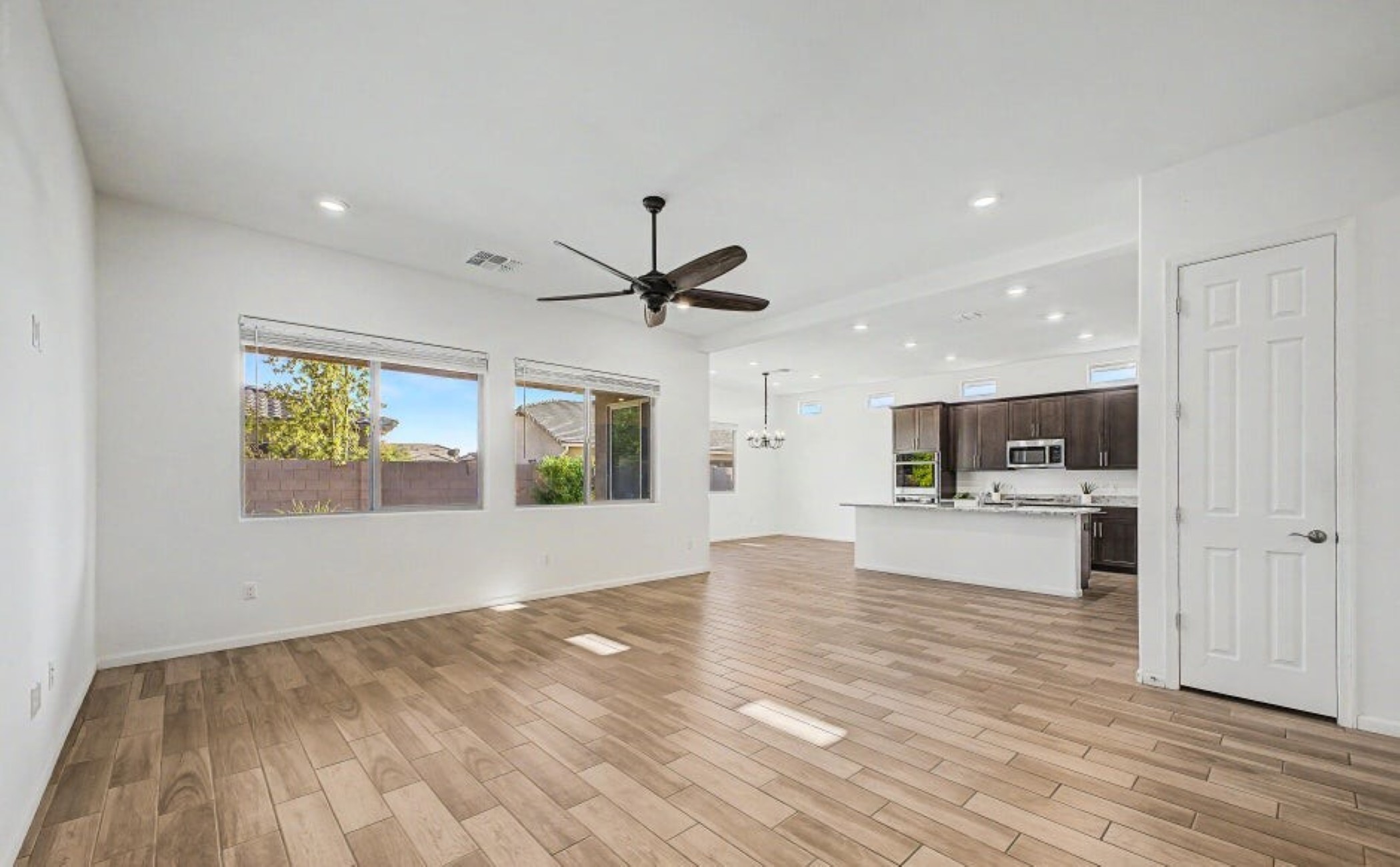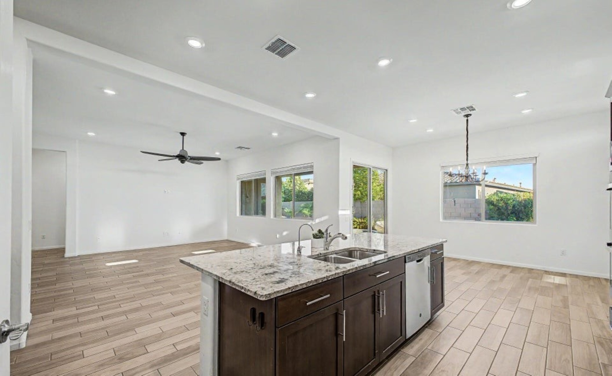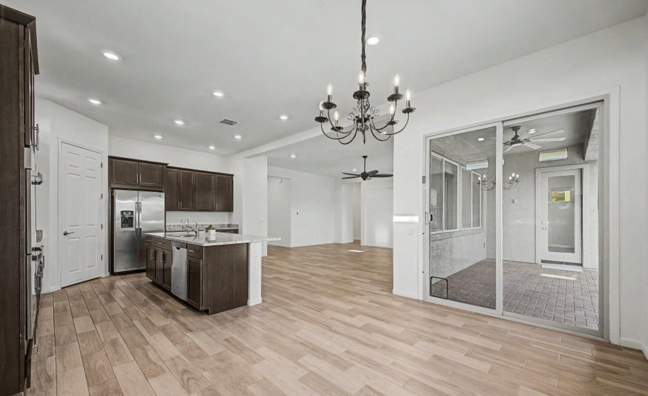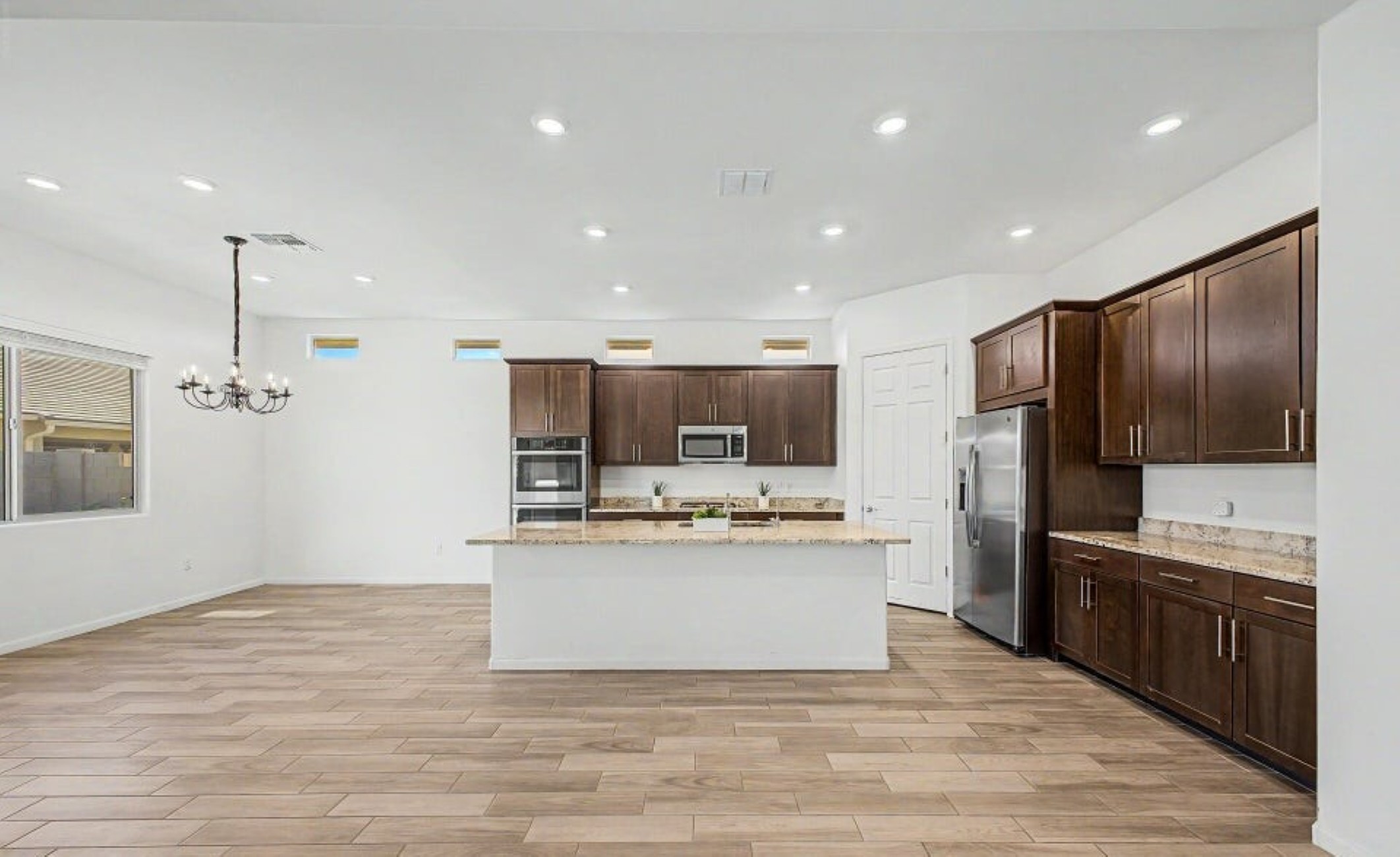 Beautiful 2,594 SF home Built in 2021 with attached casita which includes 1 Bed/1Bath, 1-car garage, kitchenette, great room & private patio-ideal for guests or multigenerational living. Main home offers 3 bedrooms/2 full baths, spacious primary suite with patio access, walk-in closet, double vanity & custom tiled shower. Open kitchen features double ovens, stainless appliances, walk-in pantry & abundant counter space, flowing into the great room with backyard views. Resort-style backyard w/ PebbleTec pool, spa & waterfall surrounded by mature landscaping, paver patios, irrigated garden beds & citrus trees. Owned solar, rain gutters with cistern rain barrel & added privacy with no neighbors to the west--plus beautiful sunset and Catalina Mountain views.