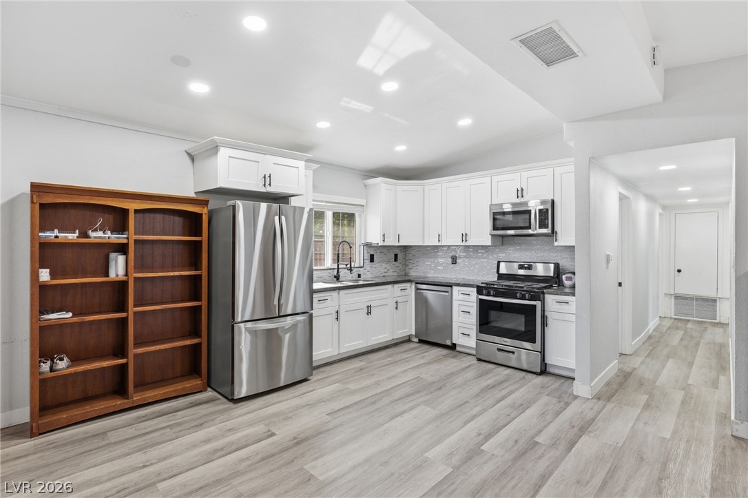 This exceptional single-story home has been completely renovated with a modern, sleek interior throughout. The open-concept living room has two ceiling fans and flows seamlessly into the dining area and beautifully updated kitchen. The kitchen has custom cabinetry, granite countertops, a stylish designer backsplash, recessed lighting, and stainless steel appliances, including a gas range, microwave, and dishwasher. Both bathrooms have been fully remodeled with marble countertops, new vanities, and upgraded tub/shower combinations with rain shower heads, creating a spa-like feel. Neutral wood-look laminate flooring runs throughout the home, offering a clean and cohesive design. Situated on a spacious 0.17 acre corner lot, the property provides a blank canvas with endless potential to create your ideal outdoor space. Conveniently located with easy access to the freeway, Las Vegas Strip, and Medical District, this home combines modern living with incredible opportunity.