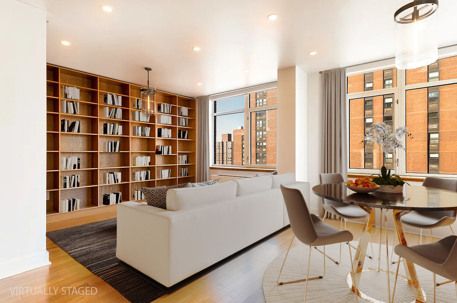 The expansive living and entertaining area flows seamlessly into a gracious dining space, highlighted by custom built-in shelving and gleaming hardwood floors throughout.