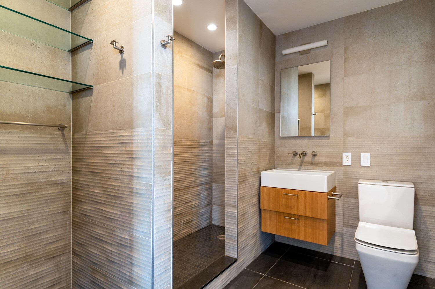 Each of the three bedrooms offers beautiful north and east city and river vistas. The primary suite is a true retreat, complete with a built-in work area, an oversized windowed walk-in closet, and a spa-inspired bathroom clad in ceramic stone.