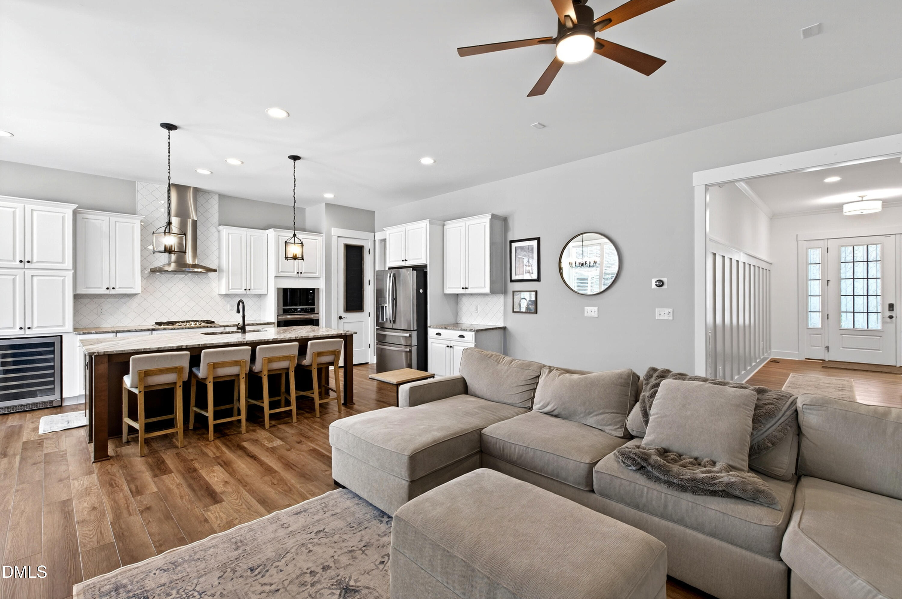 Beautifully maintained 5-bedroom, 3-bath home in the highly desirable 12 Oaks golf course community in Holly Springs, offering a great balance of thoughtful upgrades and functional space. Inside, you'll find 10-foot ceilings on the first floor, 9-foot ceilings upstairs, and 8-foot solid core doors, along with large windows that bring in plenty of natural light. The layout includes a first-floor primary suite with a custom walk-in closet, plus an upstairs office addition that provides flexible space for work or hobbies. Recent upgrades include a whole-home water filtration system and air purifiers in both HVAC units. The kitchen features custom cabinetry, new appliances, and a built-in wine fridge, opening to comfortable living spaces that work well for everyday living or entertaining. Out back, the private yard is fully fenced and features a large stamped concrete patio with a fireplace, along with a screened porch. Conveniently located with easy access to 540, Cary, Apex, and RTP, this home offers both convenience and a strong sense of community in one of the area's most sought-after neighborhoods.