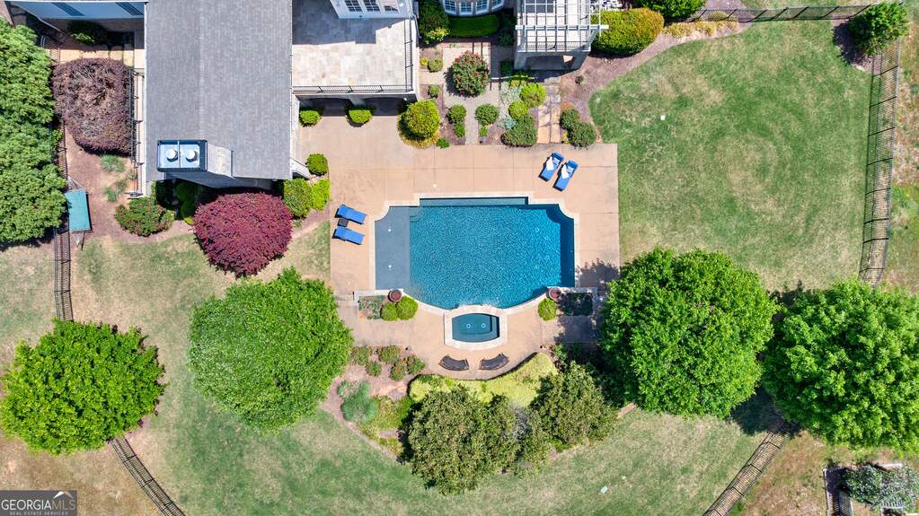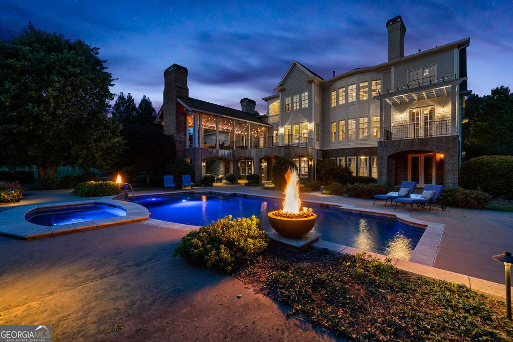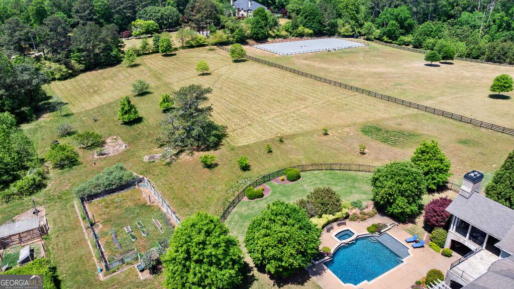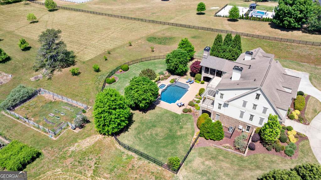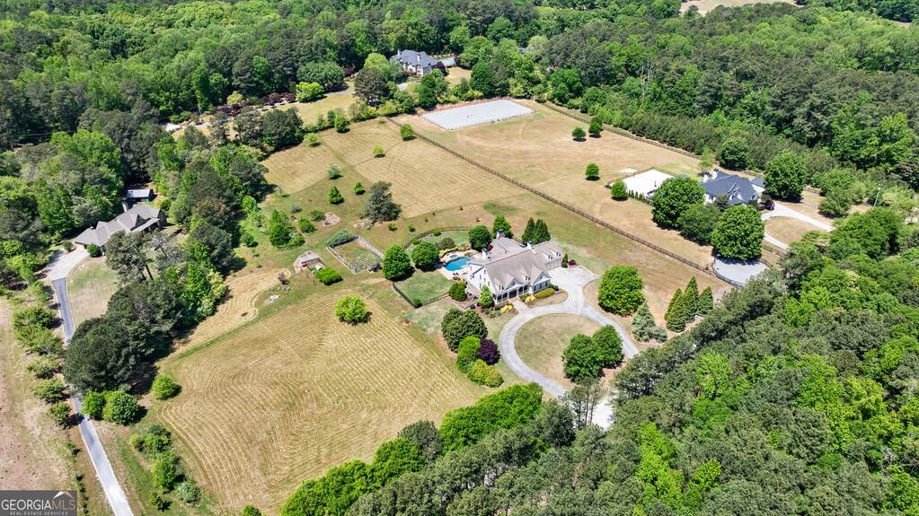 Set on five acres, this amazing custom estate is designed for elevated everyday living and unforgettable entertaining! This property checks every box with a gunite pebbletech pool & spa, three floors of living space includes: 7 bedrooms, 5 full baths, 2 half baths, 6 fireplaces, 3 laundry rooms, library, keeping room, theater room, billiard room, full bar and lounge! The perfect blend of luxury and function both inside and out. The main level features a two-story double door front entry to the grand staircase, hardwood floors, coffered ceilings, and a beautiful, well-appointed kitchen anchored by an oversized granite island with seating and built-in wine rack. Multiple gathering spaces including a keeping room offers functionality and sophistication with custom bookcases and a stone fireplace, and the main living room boasts floor-to-soaring ceiling windows with its own fireplace. The main level is complete with a library or dedicated office space, formal dining room with butler's pantry, and tiled mudroom with open shelving pantry, standalone deep freezer and standalone refrigerator, custom drop zone, and direct access to all 4 car garages. The bedroom on main offers flexibility with a full bath, custom closet, and a private balcony. Beautiful hardwood flooring continues upstairs to the primary suite - a true retreat with a spacious sitting area, fireplace, private balcony overlooking the pool, whirlpool bath, separate tiled shower, dual vanities, and custom his & her closets with granite dresser and peninsula. Three generously sized secondary bedrooms, laundry room with storage, private loft area, and a rear staircase enhance comfort and flow to complete the upstairs. The finished terrace level is designed to impress, featuring a full theater room, lounge, billiards area, half bath, and a phenomenal custom granite bar complete with sink, dishwasher, dual mini refrigerators, ice machine, and a three-tap kegerator. Two terrace level bedrooms with a full bath, have direct pool access via french doors. Enjoy your private luxury resort with a backyard thoughtfully designed for year-round enjoyment featuring a two-story 20' porch with a wood-burning fireplace patio and a separate covered and beamed deck with gas fireplace offering deep shade and no shortage of space to entertain. Layered outdoor experiences from the massive gunite pool with tanning ledge, hot tub, and waterfall features to the kitchen herb garden, charming brick archways and sitting areas, meticulous landscaping, and serene pastoral views from every angle. A generous 4 car garage with a oversized storage area provides an accommodating space for everyone's vehicle and tools. This expansive 5 acre lot has no HOA and is a rare offering of privacy, scale, and lifestyle that stands alone!