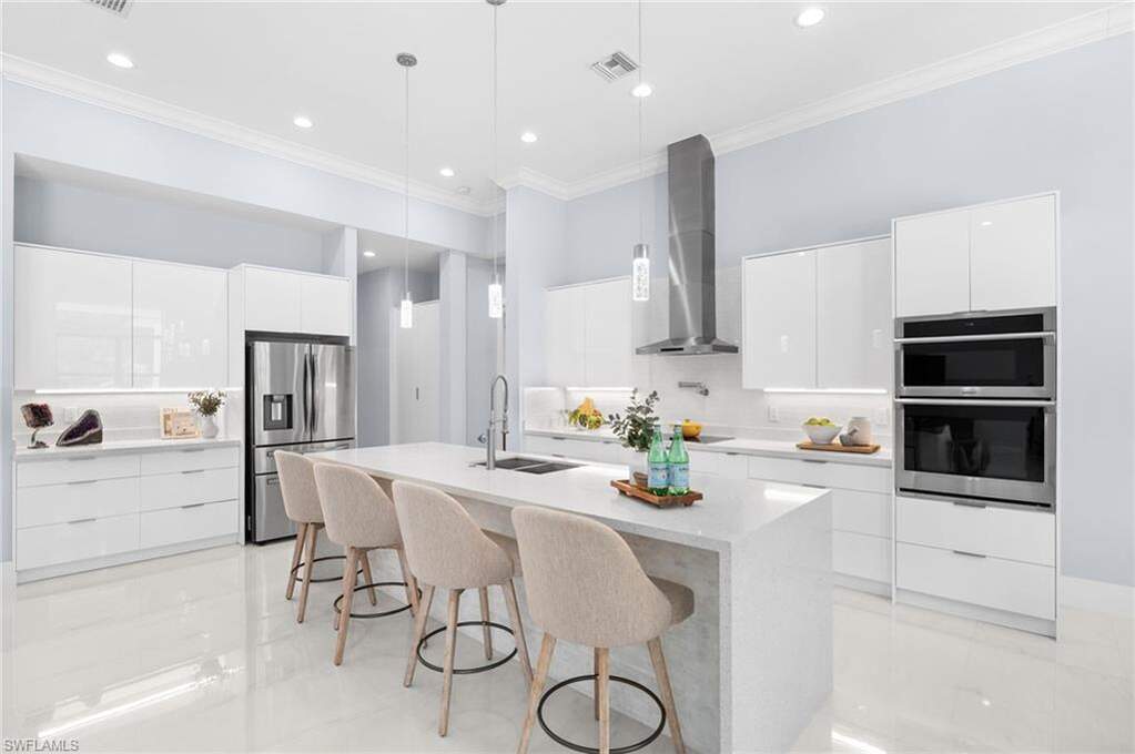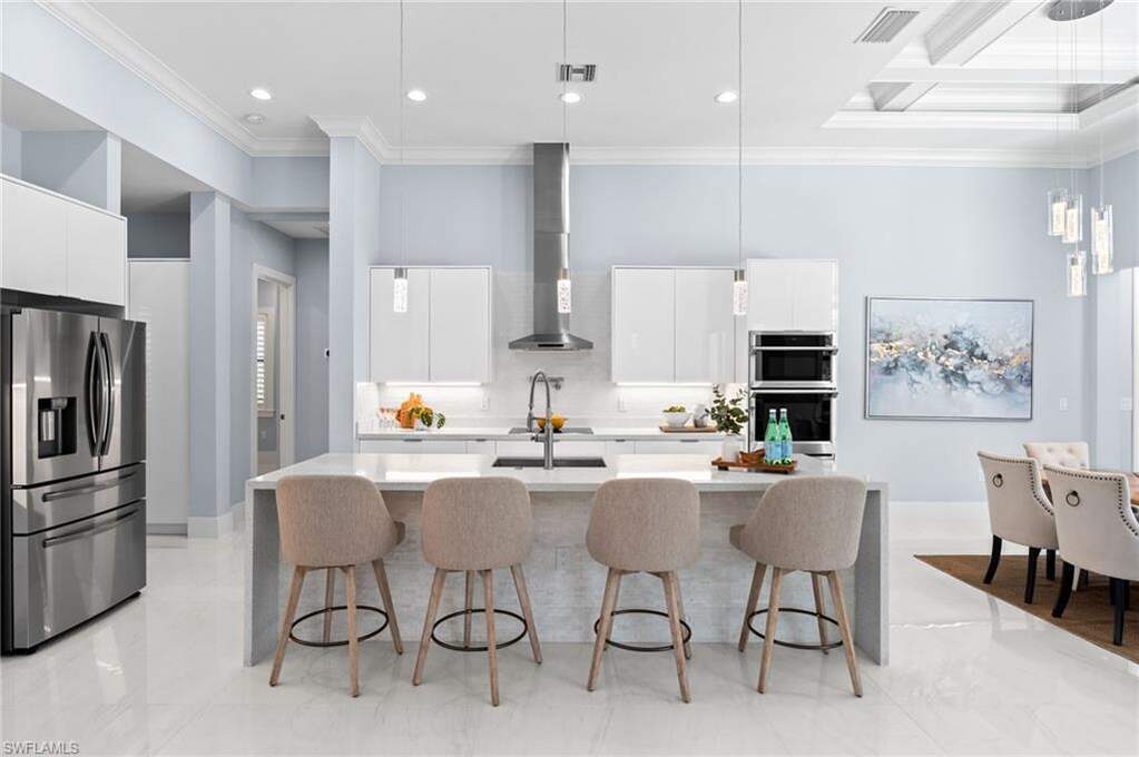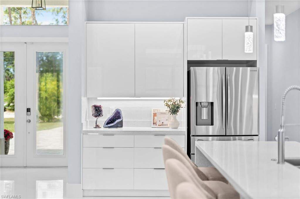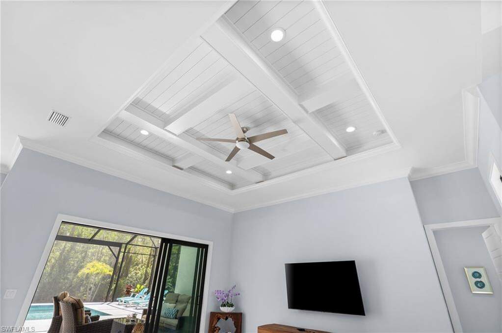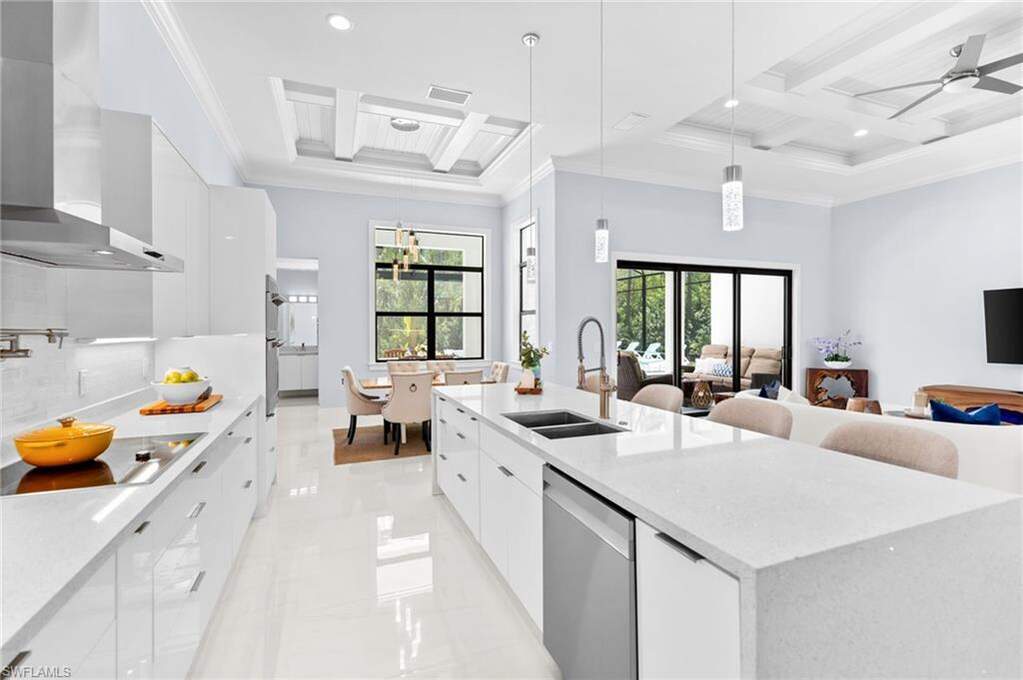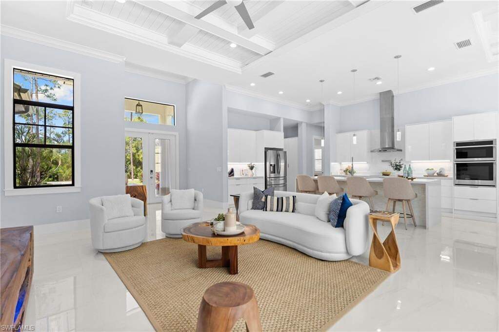 STUNNING 2020 CUSTOM-BUILT LUXURY POOL ESTATE SET ON A SPRAWLING 1.25-ACRE LOT IN BONITA SPRINGS' COVETED "SAN CARLOS ESTATES!" Enjoy SERENE WOOD VIEWS, exceptional privacy, and a true sense of nature. This contemporary residence showcases an impressive OPEN FLOOR PLAN with 2,304 square feet under air, offering 4 bedrooms, 3 bathrooms, a METAL ROOF, HURRICANE IMPACT WINDOWS & SLIDERS, GENERATOR, 500-GALLON BURIED PROPANE TANK (connected to generator), and a WHOLE-HOUSE WATER FILTRATION SYSTEM. Thoughtfully designed, the home features tile flooring throughout and SOARING 12 - 14 FT. CEILINGS accented with wood paneling and coffered detailing. The CHEF'S KITCHEN is beautifully appointed with WATERFALL QUARTZ COUNTERS, WHITE CABINETRY, a breakfast bar, and an inviting dining area overlooking the pool & outdoors-perfect for entertaining. Expansive sliding glass doors open to your PRIVATE RESORT-STYLE OUTDOOR OASIS, complete with a NEW (2022) HEATED SALTWATER POOL AND SPA WITH WATER FEATURES, an OVERSIZED ITALIAN MARBLE POOL DECK, outdoor shower, and a NEW PICTURE SCREEN ENCLOSURE capturing unobstructed NATURE VIEWS. The luxurious primary suite offers direct lanai access, dual walk-in closets, and a spa-like bath with dual floating vanities, a soaking tub, and a spacious glass-enclosed shower with multiple showerheads. Positioned well off the road, this property is enhanced by a new 240-foot paver driveway (2024), elegant exterior and landscape lighting, and a separate storage shed. Residents of San Carlos Estates enjoy unparalleled space, privacy & nature with the best dining/shopping amenities just down the street. No HOA fees or rental restrictions! Peaceful living in a central location with easy access to US-41, Imperial Pkwy & I-75. 2 mins to the Promenade shopping/dining, less than 5 mins to Coconut Point, 15 mins to world-class beaches & 20 mins to RSW International Airport.
