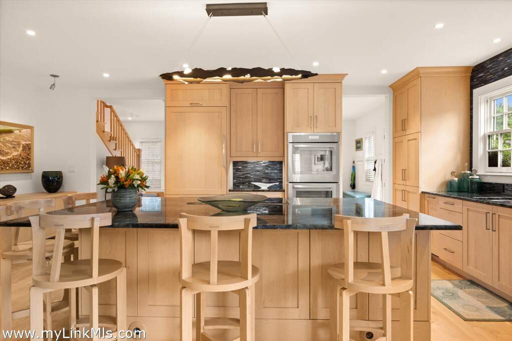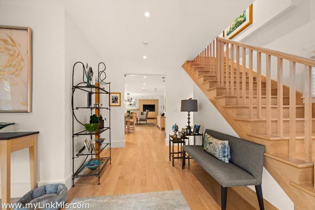 This Greek Revival style home blends timeless architecture with a bright, modern open floor plan, all presented in impeccable condition. A welcoming front foyer leads into a beautifully appointed kitchen featuring high-end appliances, a large center island, and seamless flow into the dining and living areas. The living room is anchored by a fireplace and filled with natural light throughout. French doors open to a covered porch with a striking stone fireplace, overlooking a meticulously landscaped backyard with multiple patios-perfect for outdoor entertaining. Upstairs, the second floor offers a spacious primary suite complete with a private sundeck, along with two additional ensuite bedrooms and laundry room. The finished lower level adds exceptional versatility, featuring two additional bedrooms, comfortable sitting area with TV and a generously sized laundry space. A detached barn at the rear of the property includes a full basement and bathroom, as well as a large deck-ideal for a variety of uses. Additional highlights include two outdoor showers and parking for up to four cars. All of this is set on a quiet street just blocks from the vibrant downtown Historic District.