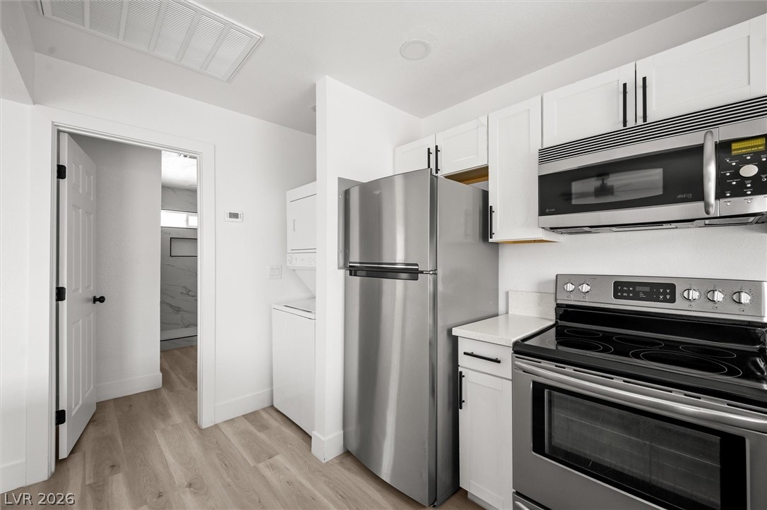 Welcome home to this beautifully remodeled 1-bedroom unit in a turnkey fourplex, where modern design meets everyday convenience. Step inside to an open-concept layout featuring stylish laminate flooring, recessed lighting, and a bright, contemporary feel throughout. The upgraded kitchen is designed to impress with white shaker cabinets, quartz countertops, and stainless steel appliances - including a refrigerator, range, microwave, and in-unit stacked washer & dryer for added convenience.. The bathrooms have been thoughtfully updated with a sleek vanity and tiled shower, giving it a clean, modern finish. Enjoy peace of mind knowing the entire property has been upgraded with a new roof, windows, doors, and driveway, and a freshly painted exterior with crisp white walls and bold black trim for a sharp, modern look. This unit is Appx 400 Sq ft