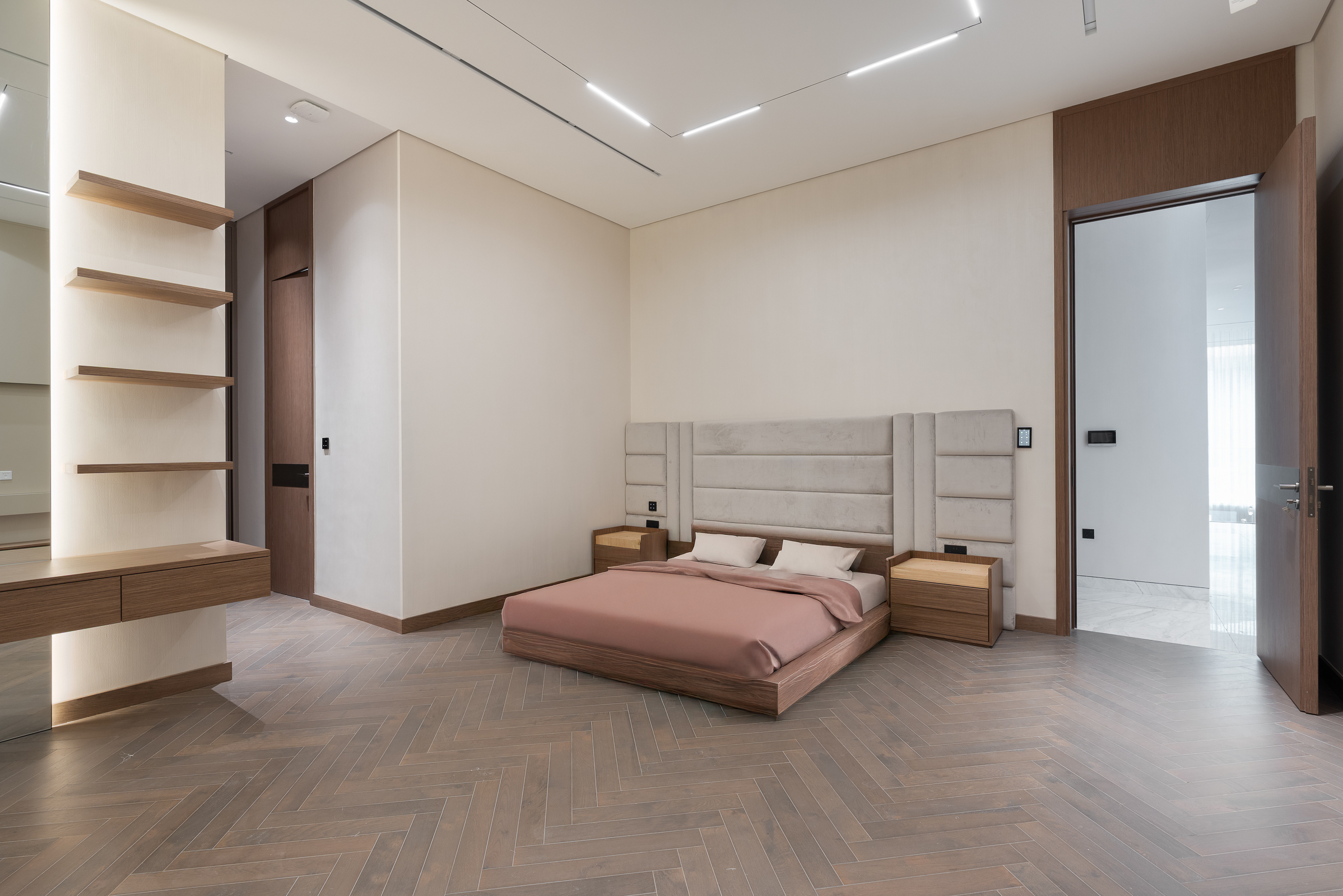 Overlooking the informal living space below, an upper lounge area adds a sense of connection across levels. Every bedroom is accentuated by elegant herringbone flooring and a private en-suite, while the master suite is further elevated by a walk-in wardrobe and a his-and-hers bathroom with a steam room.