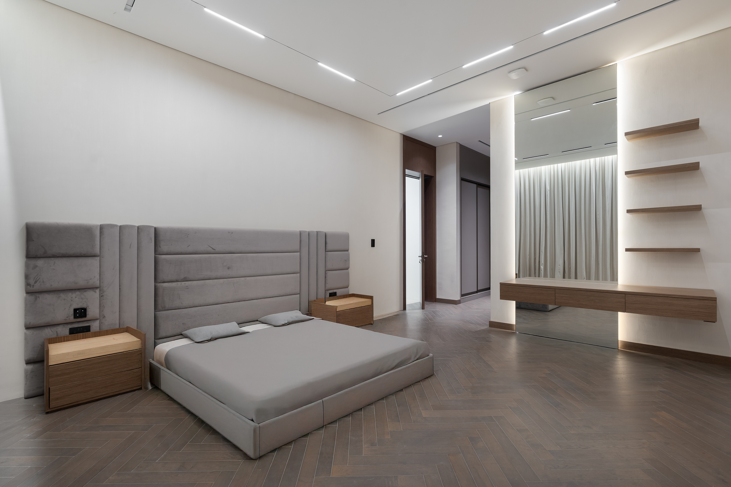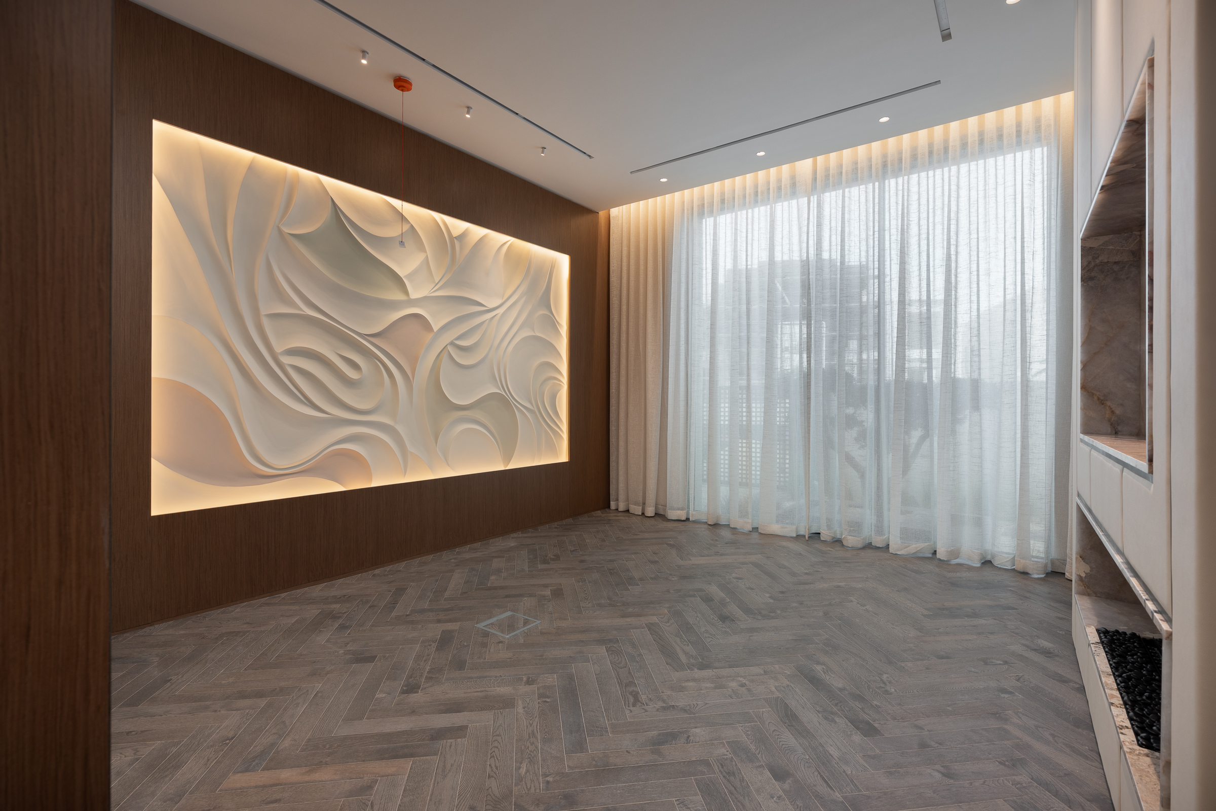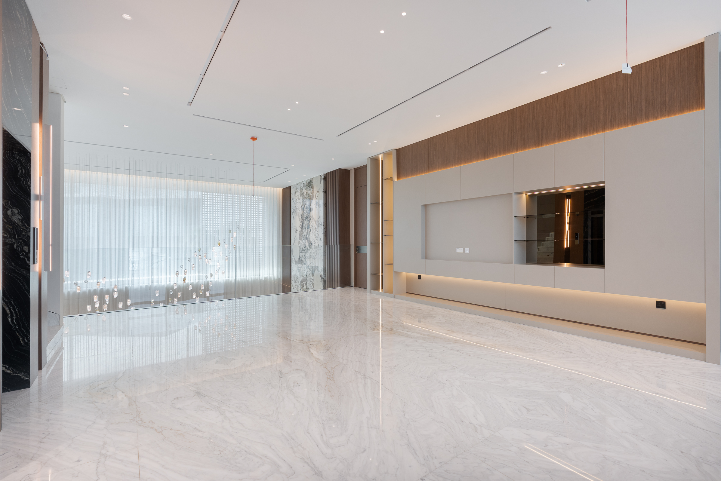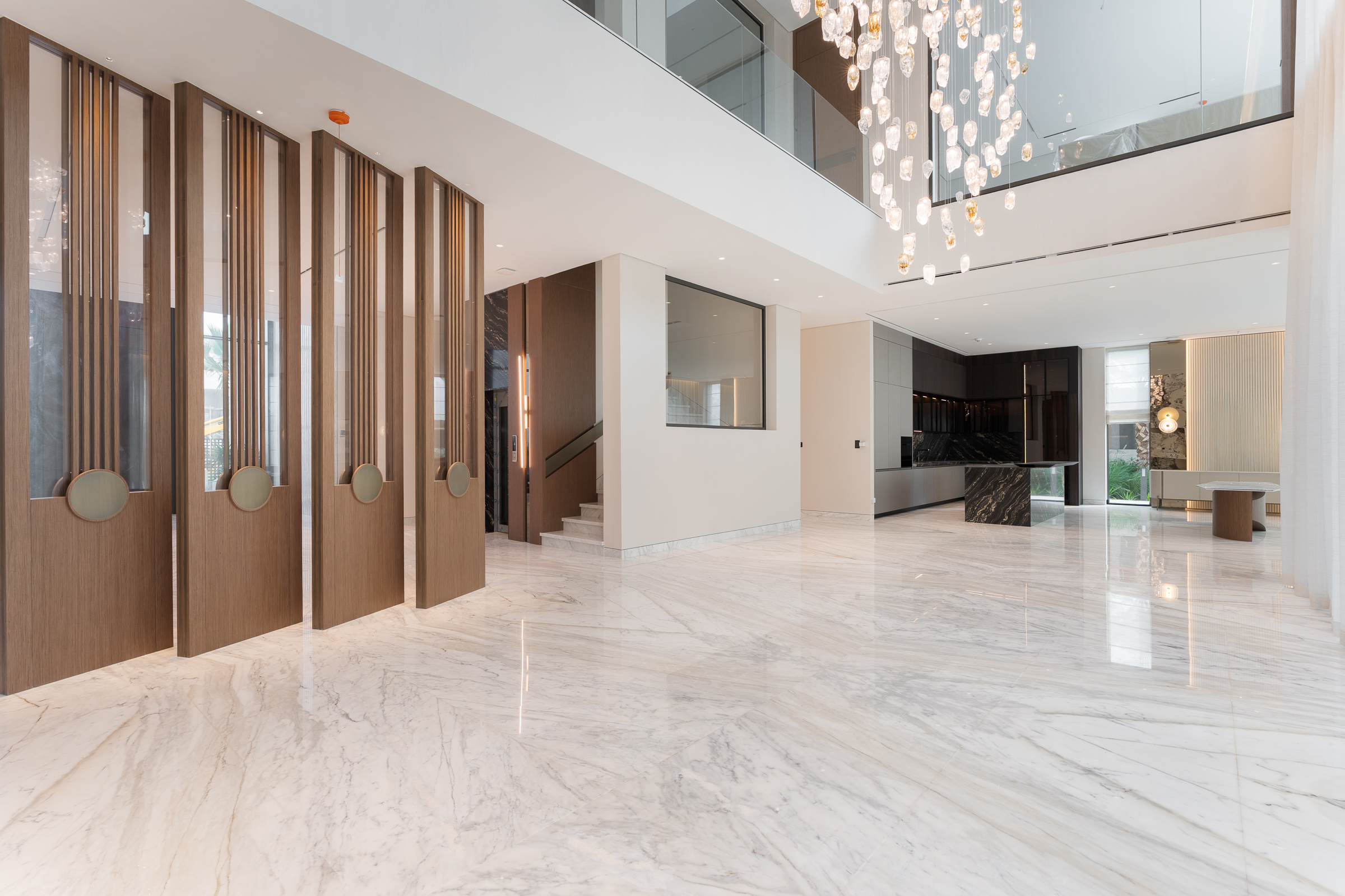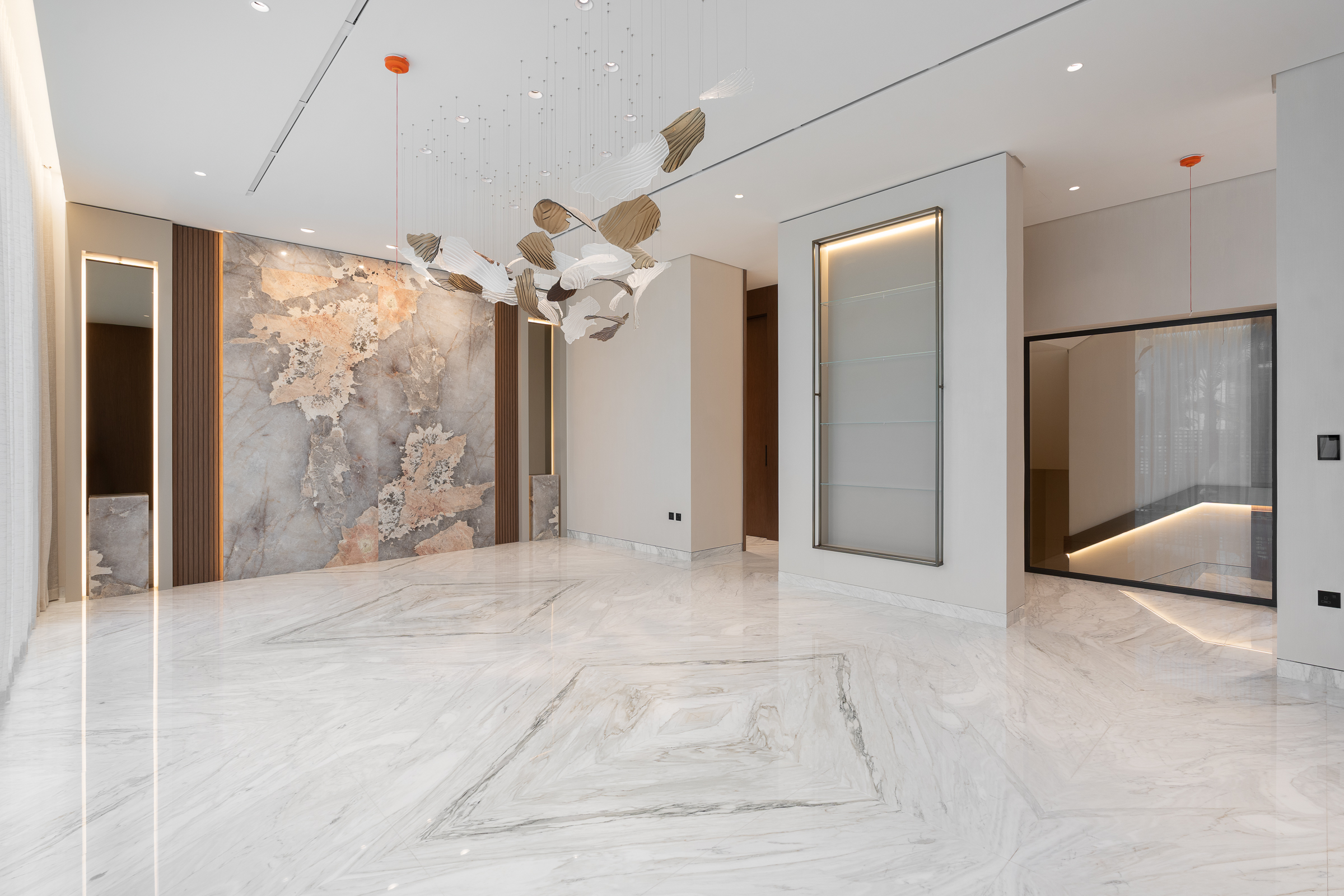 A sweeping open-plan living area sets the tone upon entry, its double-height ceilings and floor-to-ceiling windows illuminating the approach. Pivot doors divide a formal reception from a relaxed informal living space, with a beautifully designed front kitchen — complete with an island breakfast counter — lying alongside a fully equipped chef's kitchen.