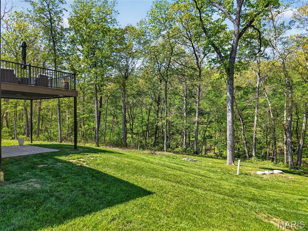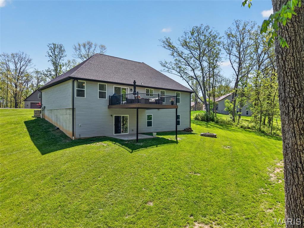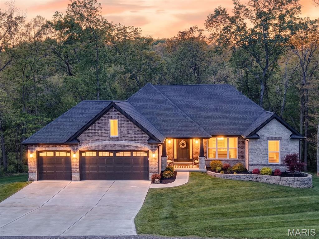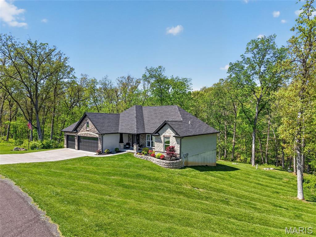 Tucked away on 3 private acres of tranquil, peaceful land in the desirable Bluffs At Eagle Fork community, this custom-built home offers a rare opportunity with the perfect blend of luxury, comfort, and seamless indoor-outdoor living. Thoughtfully designed and loaded with high-end updates, every detail has been crafted to elevate everyday living. As you arrive, you'll notice the meticulous care and detail of this home. From the upscale landscaping and retaining wall, to the gorgeous yard featuring an irrigation system with buried downspouts. Step inside to an open floor plan highlighted by soaring vaulted ceilings and luxury vinyl plank flooring that flows throughout the entire home, creating a cohesive and modern feel. The heart of the home is the chef's kitchen, featuring sleek quartz countertops, stainless steel appliances, microwave drawer, hooded vent, and an expansive island - perfect for cooking, entertaining, and gathering. Designed with the sought after split floor plan, the private primary suite is set apart from the rest of the home and features a spa-like bathroom with an oversized zero entry walk-in shower. Two additional bedrooms are located on the opposite side of the home, offering comfort and privacy for family or guests. The living space extends effortlessly outdoors, where you'll find a private setting with the impressive new composite deck supported by steel beams, complete with aluminum railing and ambient underlighting. The cozy firepit creates an inviting space to enjoy the serene surroundings. This lot is ideal for relaxing evenings or hosting guests. The walk-out basement adds additional versatility and easy access to the beautifully maintained exterior. Additional upgrades include a whole-house water filtration system, security cameras, water softener and so much more, ensuring convenience and peace of mind. This exceptional property combines modern luxury with natural beauty - offering a private retreat you'll be proud to call home. It's time you LOVE WHERE YOU LIVE.