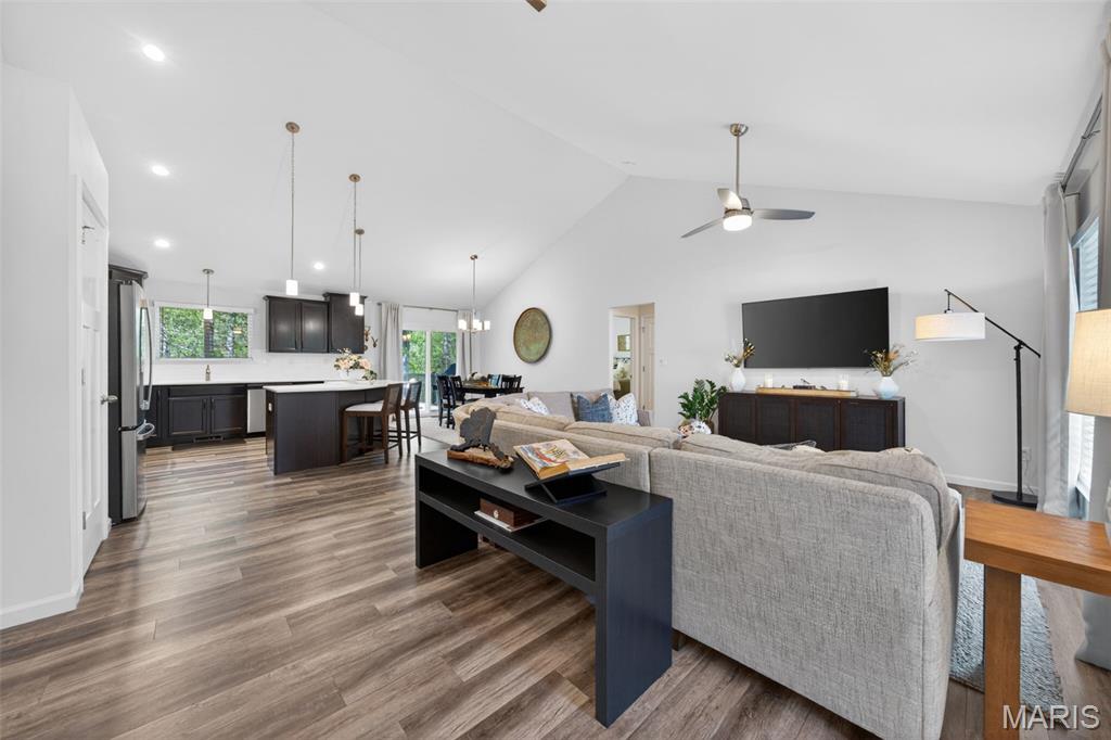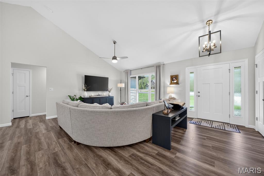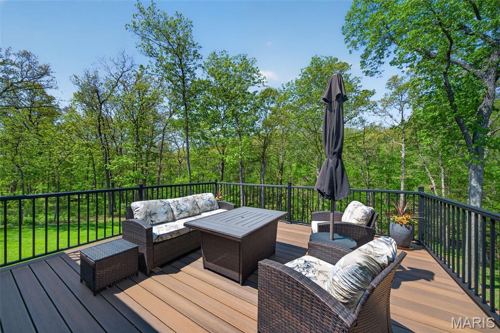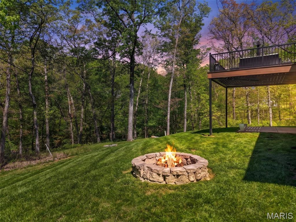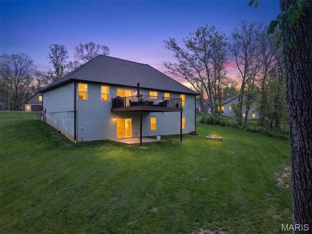 Tucked away on 3 private acres of tranquil, peaceful land in the desirable Bluffs At Eagle Fork community, this custom-built home offers a rare opportunity with the perfect blend of luxury, comfort, and seamless indoor-outdoor living. Thoughtfully designed and loaded with high-end updates, every detail has been crafted to elevate everyday living. As you arrive, you'll notice the meticulous care and detail of this home. From the upscale landscaping and retaining wall, to the gorgeous yard featuring an irrigation system with buried downspouts. Step inside to an open floor plan highlighted by soaring vaulted ceilings and luxury vinyl plank flooring that flows throughout the entire home, creating a cohesive and modern feel. The heart of the home is the chef's kitchen, featuring sleek quartz countertops, stainless steel appliances, microwave drawer, hooded vent, and an expansive island - perfect for cooking, entertaining, and gathering. Designed with the sought after split floor plan, the private primary suite is set apart from the rest of the home and features a spa-like bathroom with an oversized zero entry walk-in shower. Two additional bedrooms are located on the opposite side of the home, offering comfort and privacy for family or guests. The living space extends effortlessly outdoors, where you'll find a private setting with the impressive new composite deck supported by steel beams, complete with aluminum railing and ambient underlighting. The cozy firepit creates an inviting space to enjoy the serene surroundings. This lot is ideal for relaxing evenings or hosting guests. The walk-out basement adds additional versatility and easy access to the beautifully maintained exterior. Additional upgrades include a whole-house water filtration system, security cameras, water softener and so much more, ensuring convenience and peace of mind. This exceptional property combines modern luxury with natural beauty - offering a private retreat you'll be proud to call home. It's time you LOVE WHERE YOU LIVE.