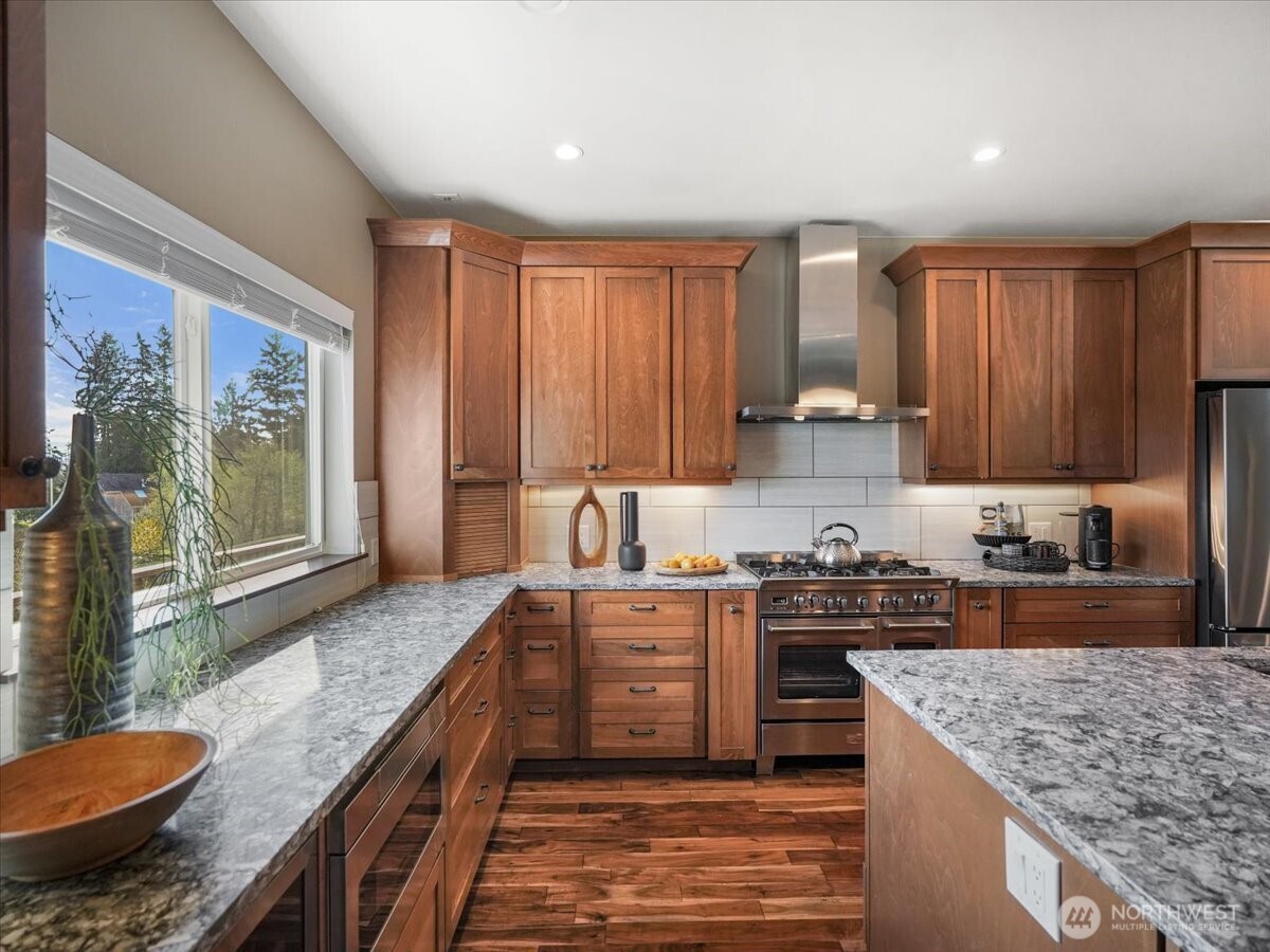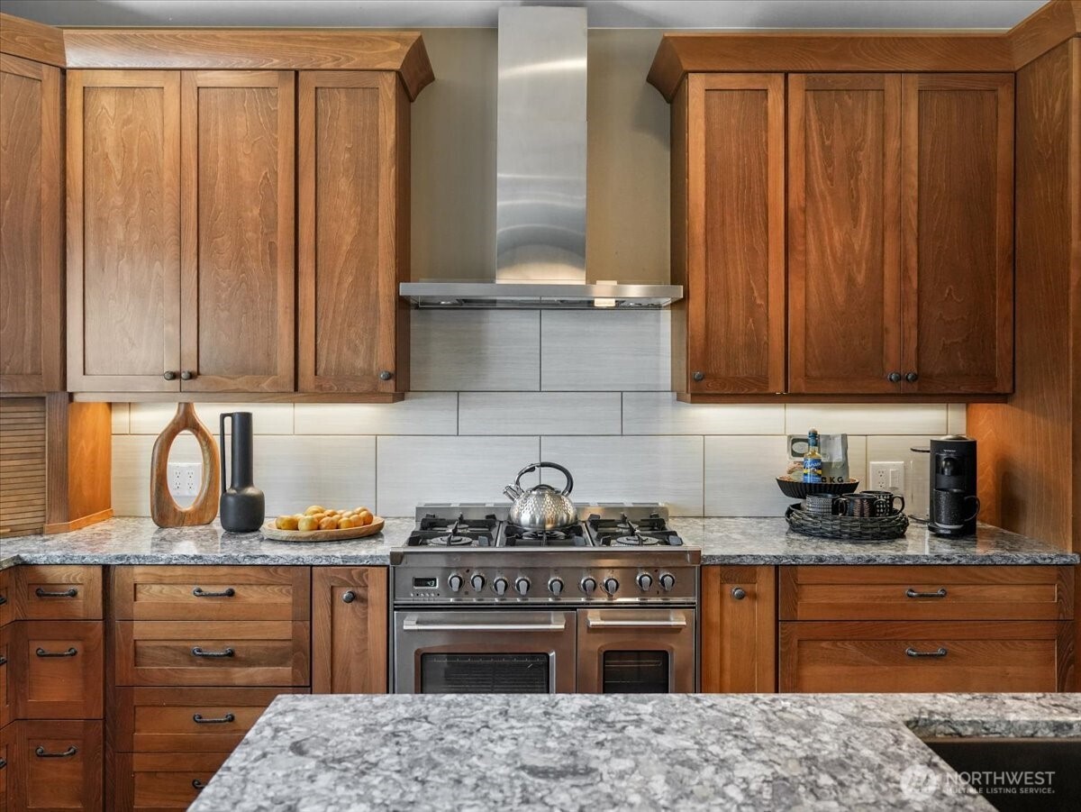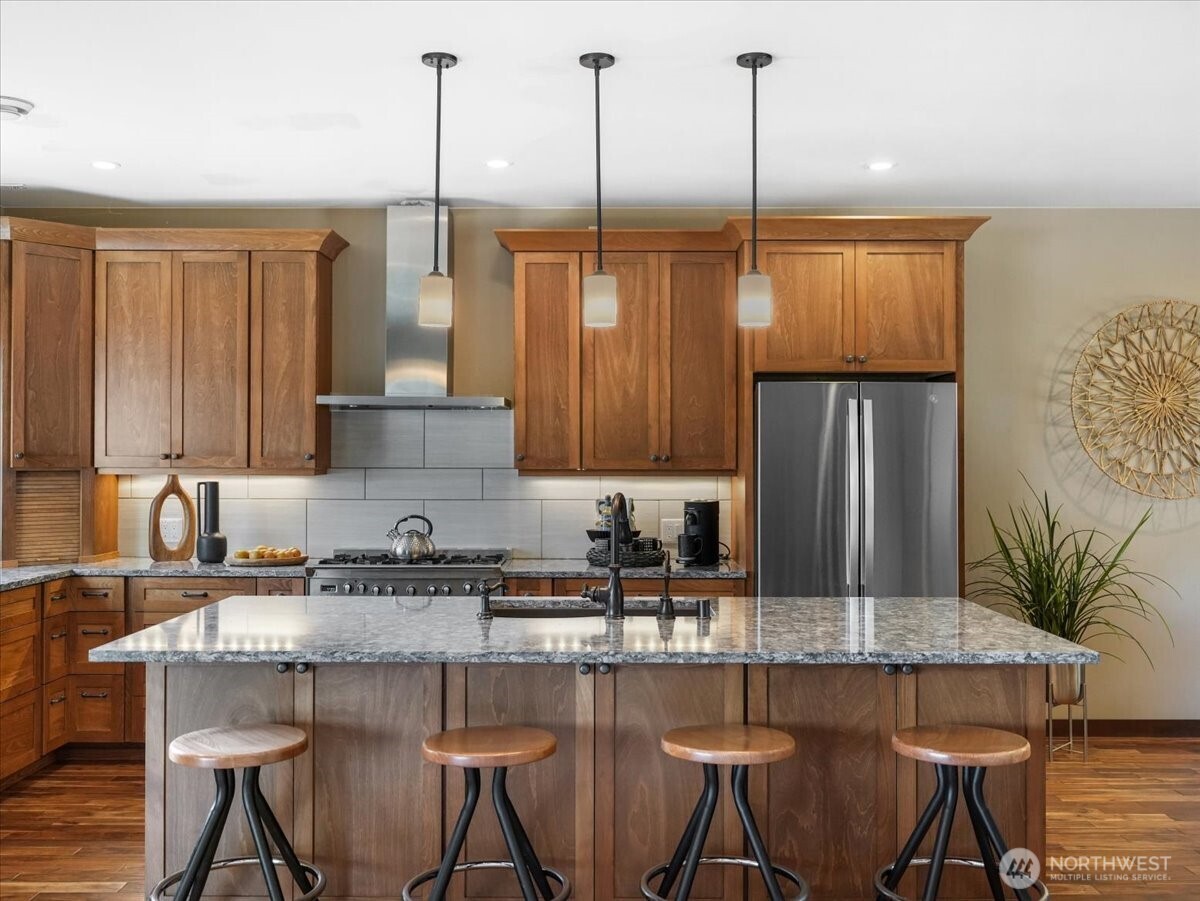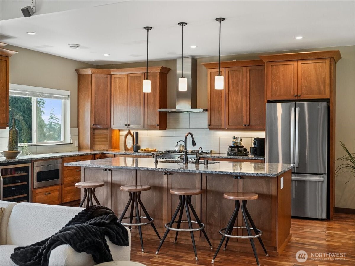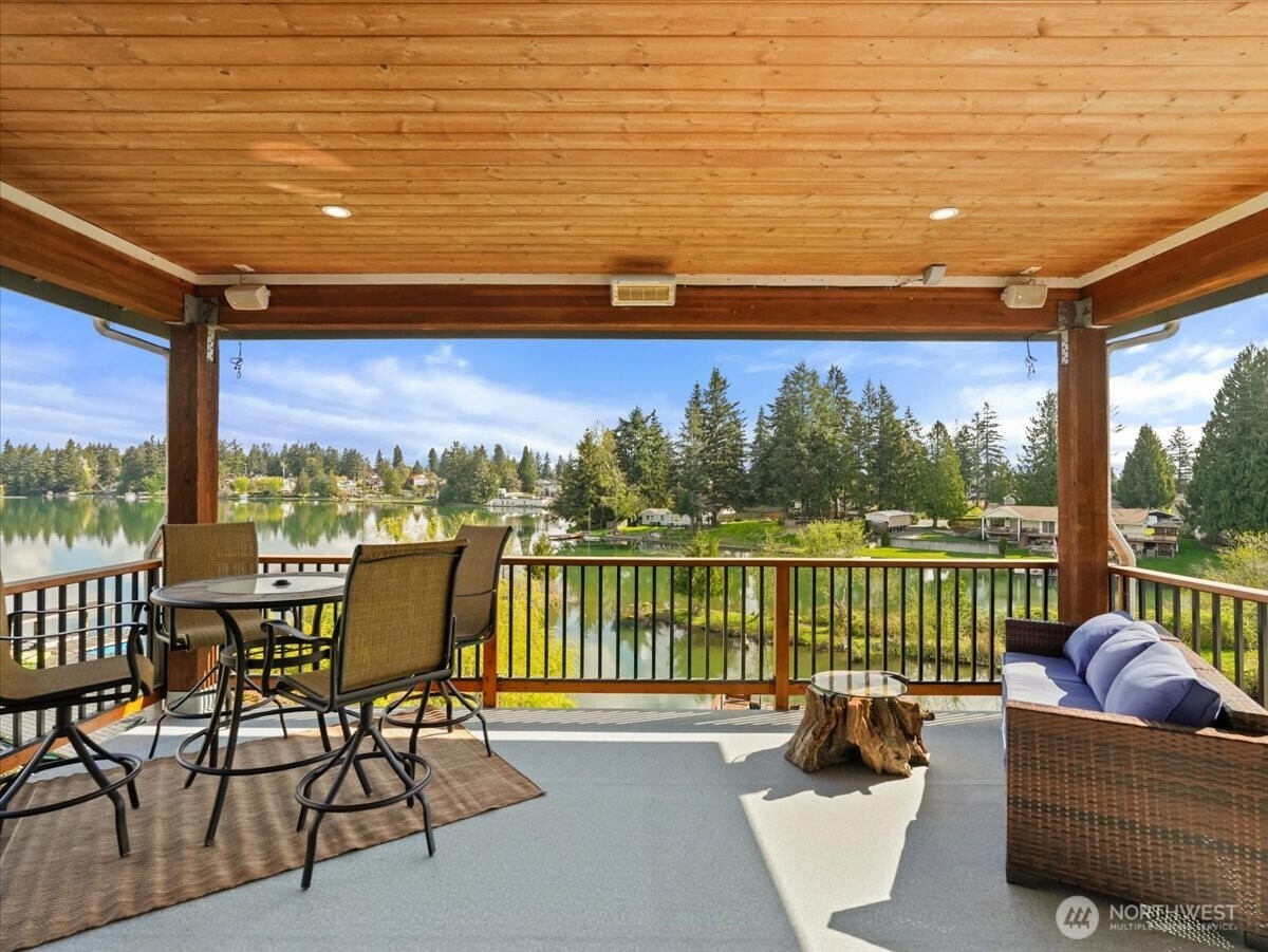 Stunning Lake Tapps waterfront retreat boasting an impressive 350 feet of prime waterfront. Beautifully designed home offers 3 bedrooms, 2.5 baths, a den or optional 4TH bedroom combining comfort, elegance, & breathtaking views. Main-level primary suite is a true sanctuary, featuring access to the upper deck, spa-inspired 5-pc bath, heated floors, large walk-in shower, dual shower, rain heads & refined finishes throughout. Main level showcases rich Acacia hardwood flooring & an inviting, open concept layout. Spacious kitchen is a chef's dream w/ abundant cabinetry, quartz counters, great for everyday living and entertaining. Dramatic floor to ceiling stacked stone gas fireplace anchors the main living space adding warmth & sophistication. Year-round outdoor living w/ expansive upper & lower covered decks enhanced by surround sound throughout. Beautifully landscaped grounds lead to a lakeside cabana w/ water, electricity ideal for entertaining. Lower level designed for relaxation & entertaining featuring stacked stone gas fireplace, built-in sauna. hot tub for private retreat experience. Waterfront amenities 2 private docks, private boat launch, Sea-Doo dock & space for a pontoon boat, this is a true boaters dream. Oversized garage w/ sink adds convenience & functionality. Attached ADU offers a full kitchen, 1 bedroom, bath, full size W/D perfect for potential rental income. This is a rare opportunity to own your own unique piece of Lake Tapps waterfront living!
