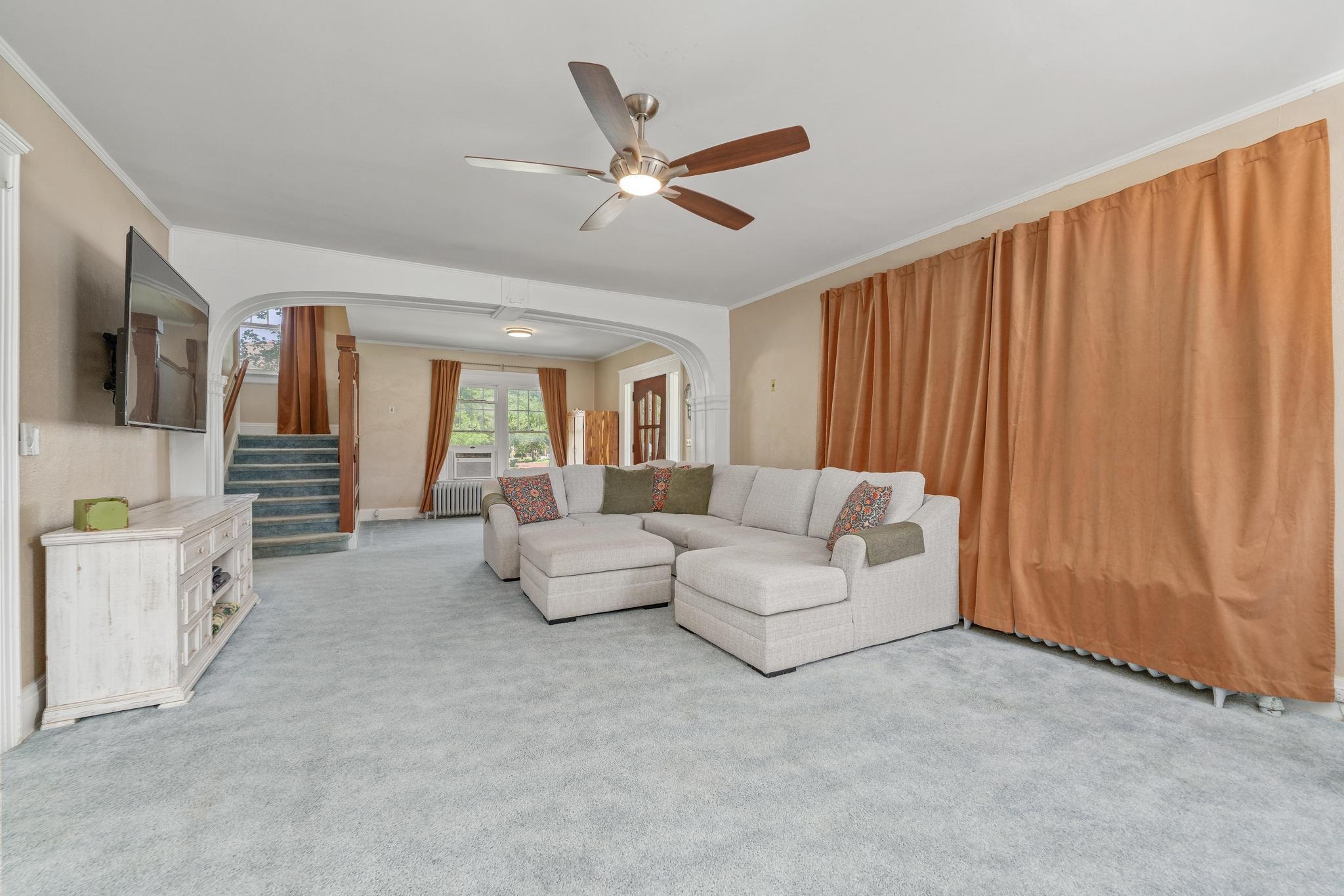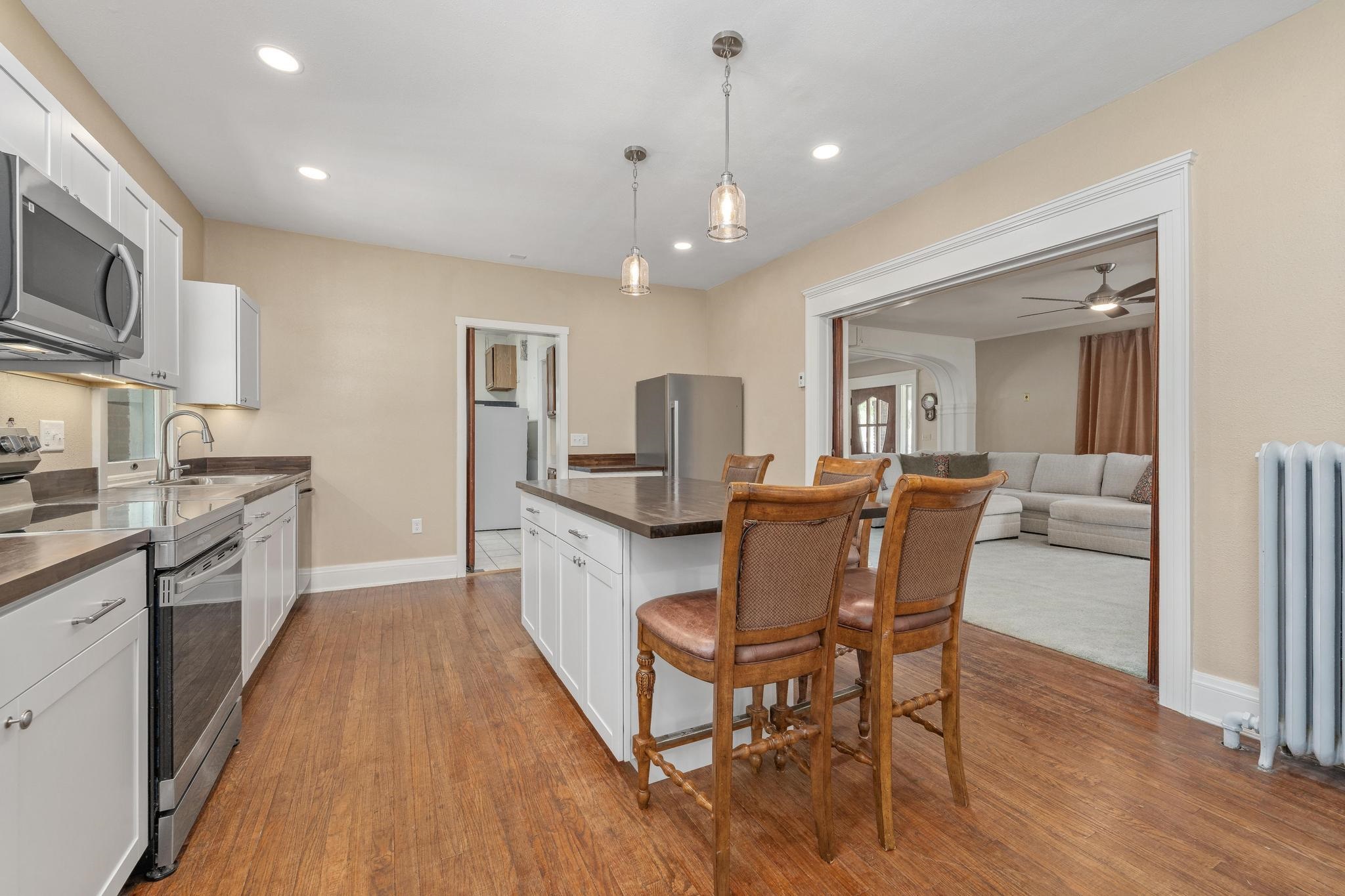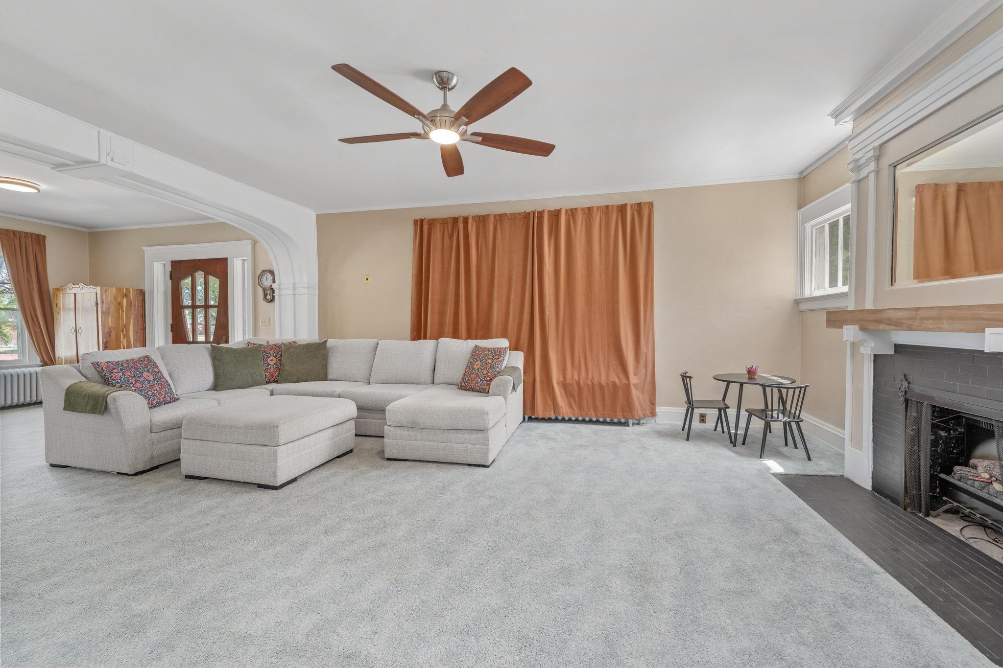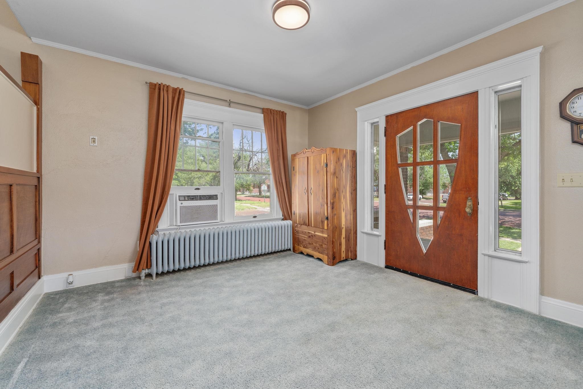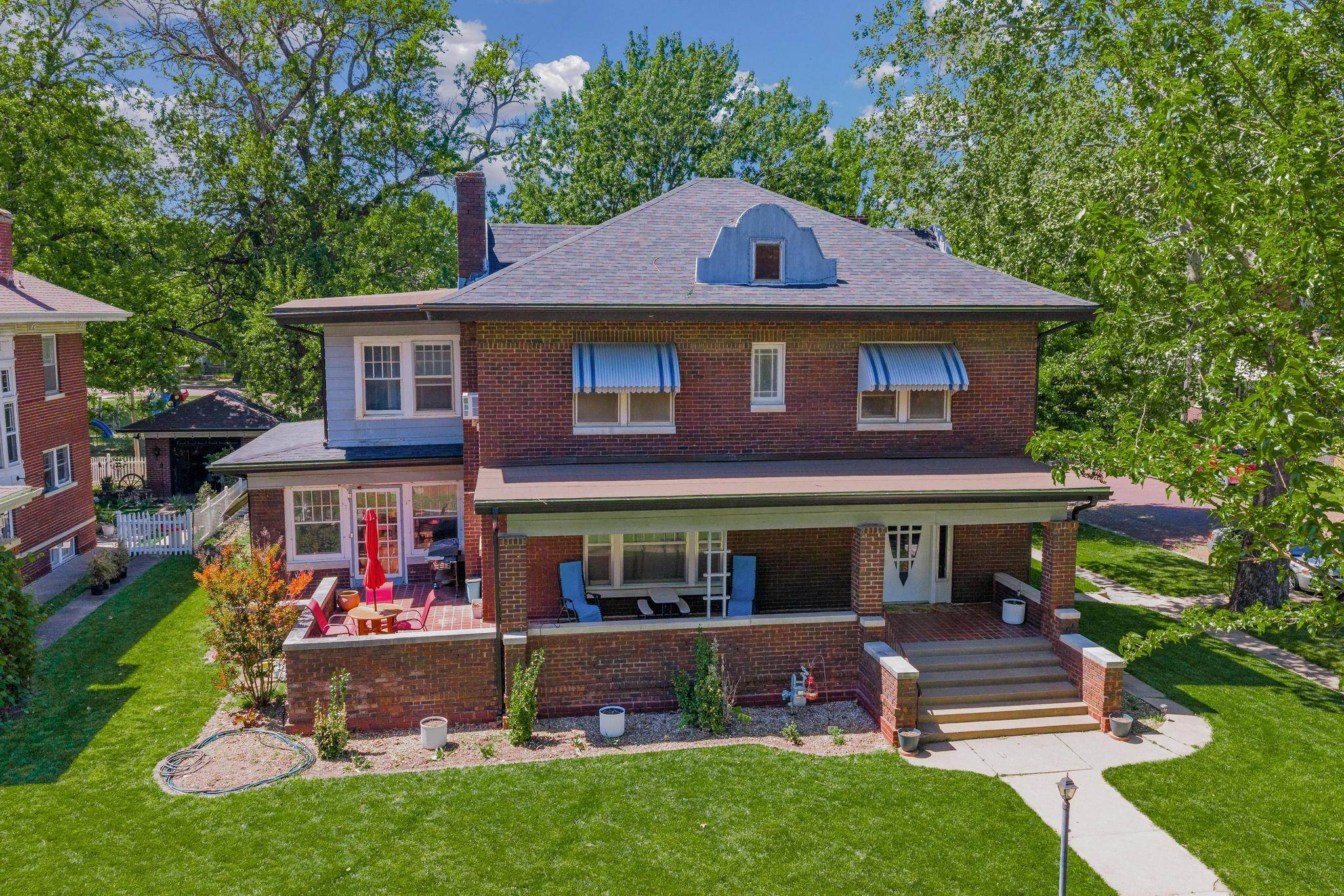Welcome home where character, space, and thoughtful updates come together to create something truly special. From the moment you arrive, the wraparound front porch with its distinctive Spanish tile invites you to slow down and enjoy everything from morning coffee to evening gatherings in a setting full of charm and curb appeal. Inside, the grand entry welcomes you with an original wood staircase and a one-of-a-kind solid wood front door featuring detailed glasswork. The foyer opens into a spacious living room highlighted by an arched beam and decorative fireplace, creating a warm and inviting place to gather. Pocket doors lead to a beautifully updated kitchen that blends modern convenience with timeless style. A large center island with seating and storage anchors the space, complemented by generous countertops and brand-new stainless-steel appliances that remain with the home. Just beyond, a cozy sunroom offers flexible space for entertaining, relaxing, or quiet moments, with the option to close it off or step directly onto the front porch. The main floor continues to impress with a reimagined layout that includes a functional laundry area with ample cabinetry and workspace, along with a centrally located half bath for guests. Fresh paint throughout much of the home and an abundance of windows create a light and bright atmosphere in every room. Upstairs, the bedrooms provide comfortable living spaces along with a full bathroom and an oversized bonus room filled with natural light, ideal for additional living space, a home office, or recreation area. The well-insulated attic offers even more potential for future expansion, creative use, or storage. The basement includes a family or rec room, additional storage space, and the option for a secondary laundry area. This home is equipped with a boiler heating system known for its efficiency and even heat, a new boiler was installed in 2022. It also includes a whole-house attic fan. A reverse osmosis system and water softener are included, as well as all televisions and mounts for added convenience. Outside, the fenced backyard provides an enclosed space to enjoy, with a path leading to an oversized two-car detached garage. Situated on a corner lot across from Roosevelt Elementary and near the heart of town, this property offers both location and lifestyle. With its blend of original character, modern updates, and flexible living spaces, this is a home where you can settle in and truly make it your own.
